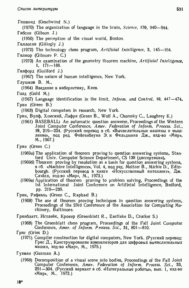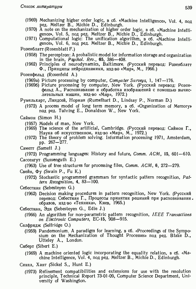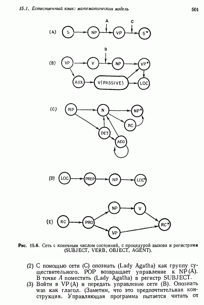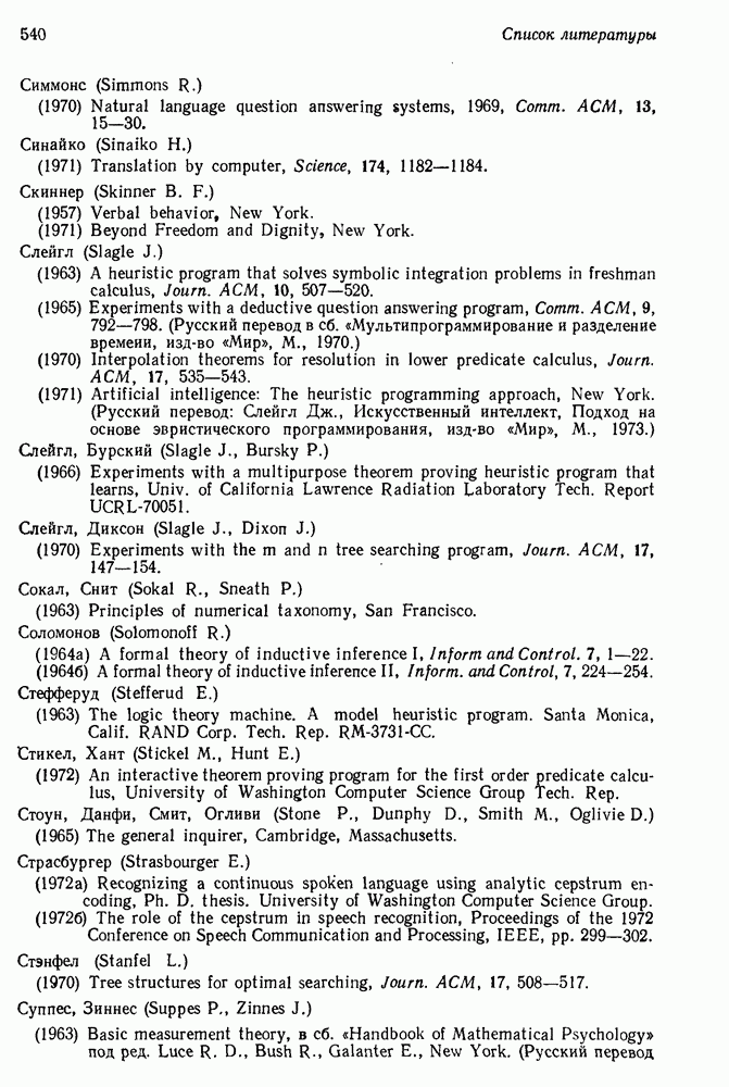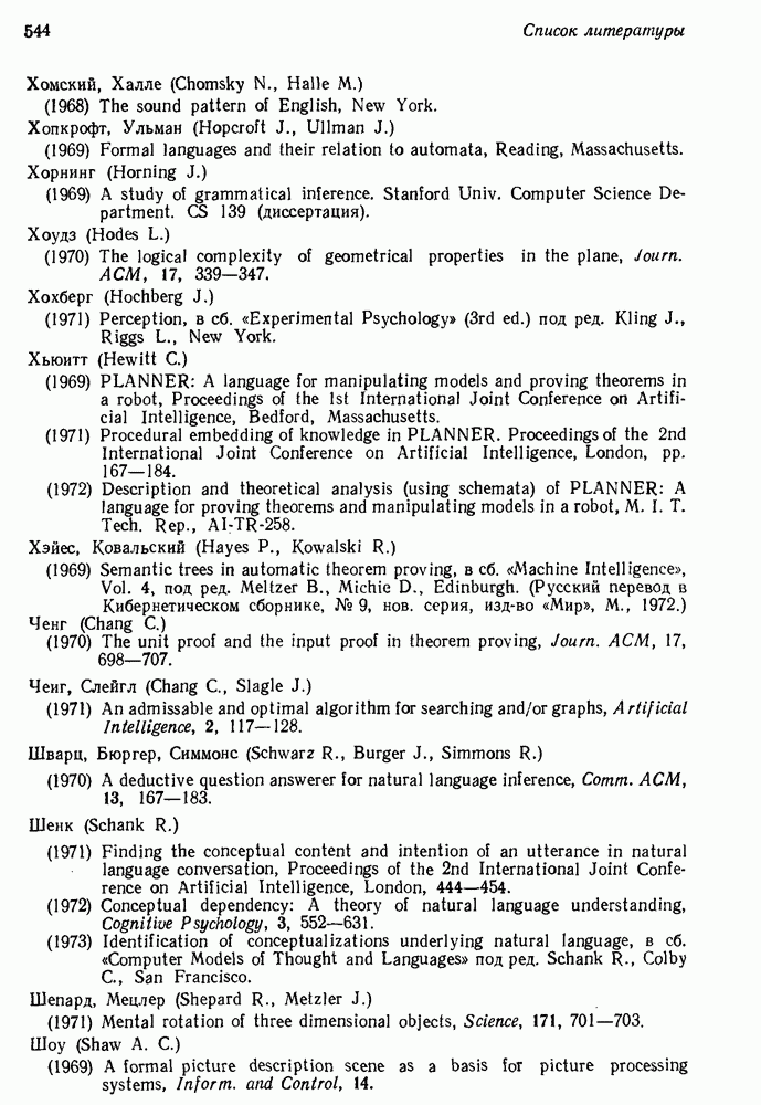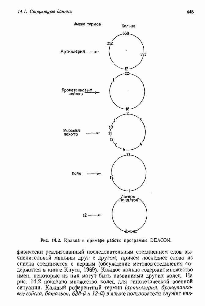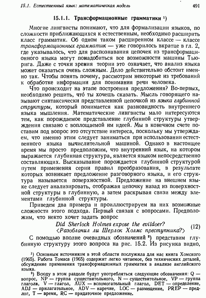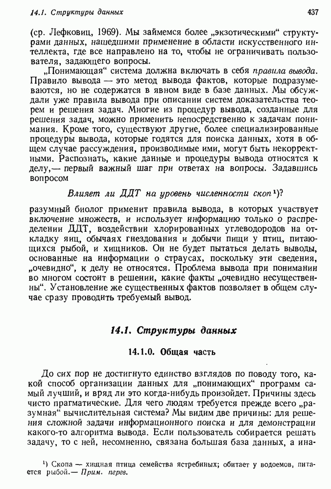 14.2. Дедуктивный вывод в информационном поиске14.2.0. Существующие методыПрограммы, обладающие способностью понимания, должны уметь отвечать на запросы, определяя, какой смысл заключен в той или иной базе данных и что она содержит. Для этого программа должна осуществлять вывод одних фактов из других. Как подразумевается в слове „выводить", соответствующие необходимые процедуры имеют самое непосредственное отношение к доказательству теоремы. Существуют, однако, важные различия между доказательством теорем и выводом при информационном поиске. Алгоритм вывода фактов должен быть корректным. Кажется, нет реальной ситуации, где были бы приемлемы ложные ответы. С другой стороны, полнота, т. е. способность ответить на любой вопрос, допускающий ответ, не является непременным условием. Как мы видели при обсуждении доказательства теорем, полнота часто достигается очень дорогой ценой. В наиболее реальных вопросно-ответных ситуациях большинство вопросов относится к одному и тому же типу, и лишь немногие — к другим. Цель конструктора такой системы — максимизировать полезность системы для пользователя, так что иногда было бы целесообразно пожертвовать способностью вообще отвечать на одни вопросы, чтобы на другие вопросы можно было отвечать очень быстро. Как и следовало ожидать, при создании экспериментальных вопросно-ответных систем вывода такими сугубо практическими соображениями пренебрегали. Возможно, это было оправдано. Мы будем различать несколько типов сложности в процедурах вывода. На самом нижнем уровне программа может быть способной только к перераспределению имеющихся фактов для ответа на запрос. Это демонстрировалось при ответе системы DEACON на вопрос „Кто командир 638-го батальона?“, где ответ был получен подбором нужного сочетания вхождений в базу данных. В качестве побочного продукта процесса ответа на вопросы никакие новые данные не были получены. Более мощный способ — ввести специальные операции для вывода новых фактов. Здесь очень важны вопросы полноты, практичности и определения стратегии решения задач. Программа может содержать ограниченное множество операторов, таких, как импликация и включение множеств, выполнение которых не представляет труда, но которые обеспечивают лишь ограниченные возможности вывода. Другим крайним случаем была бы программа, содержащая полную систему вывода, как, например, резолюции, и рискующая тем, что на некоторые выводы будет тратиться очень много времени. Третий подход состоит в том, чтобы позволить пользователю определять свои собственные процедуры вывода. По существу, пользователь задает вопрос и затем сообщает системе, как найти ответ. Этот подход разделяют Слейгл (1965) в системе DEDUCOM, а также Достерт и Томпсон (1971). Он в принципе отдает все возможности машины в руки пользователя, но может также возложить на него бремя программистской работы. Наоборот, система информационного поиска может содержать заранее составленные подпрограммы дедуктивного вывода, но в то же время позволять пользователю выбирать при желании стратегию. 14.2.1. Системы, использующие неполный вывод14.2.1.1. РЕАГИРУЮЩАЯ БИБЛИОТЕКАНашим первым примером будет очень ограниченная система неполного вывода, которая предназначалась для эксперимента с возможностями некоторых грубых правил вывода (Хант и Куинлан, 