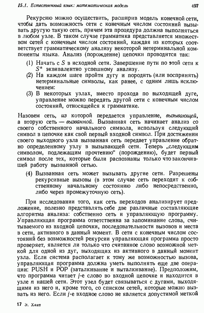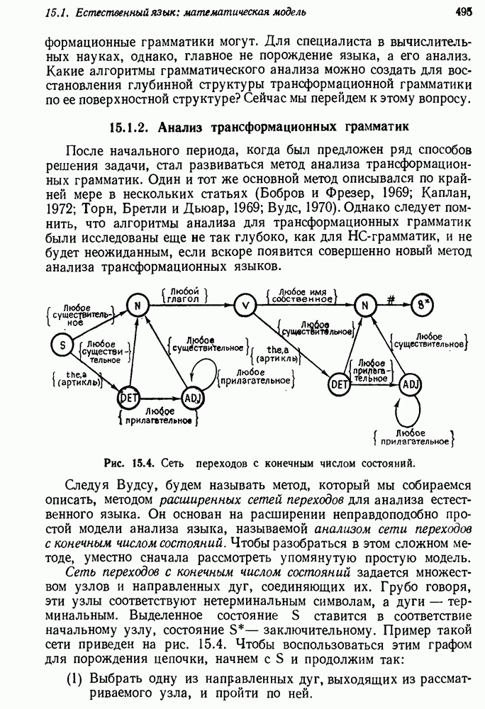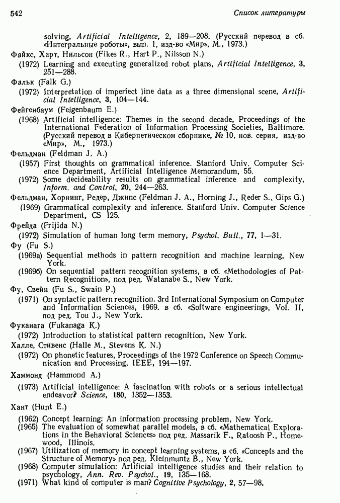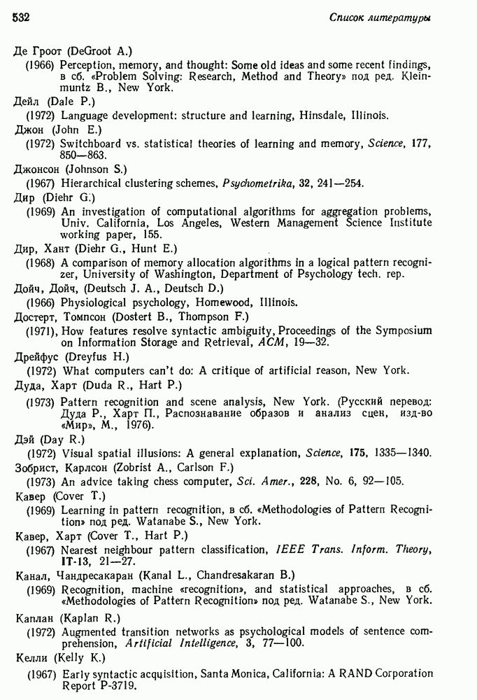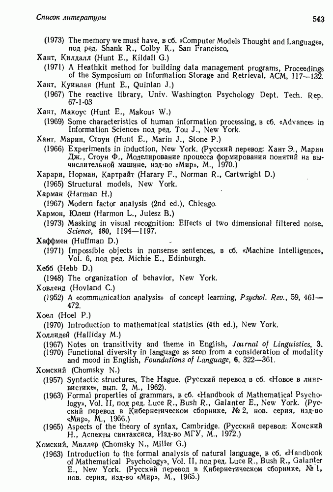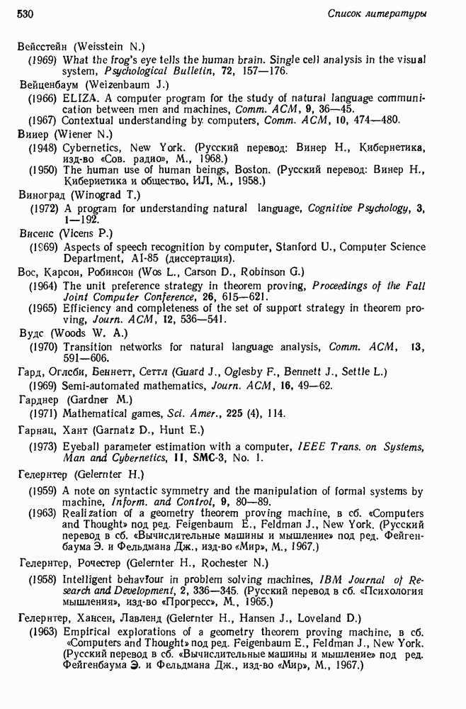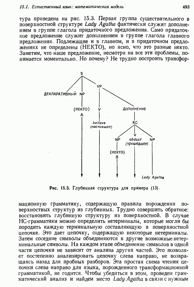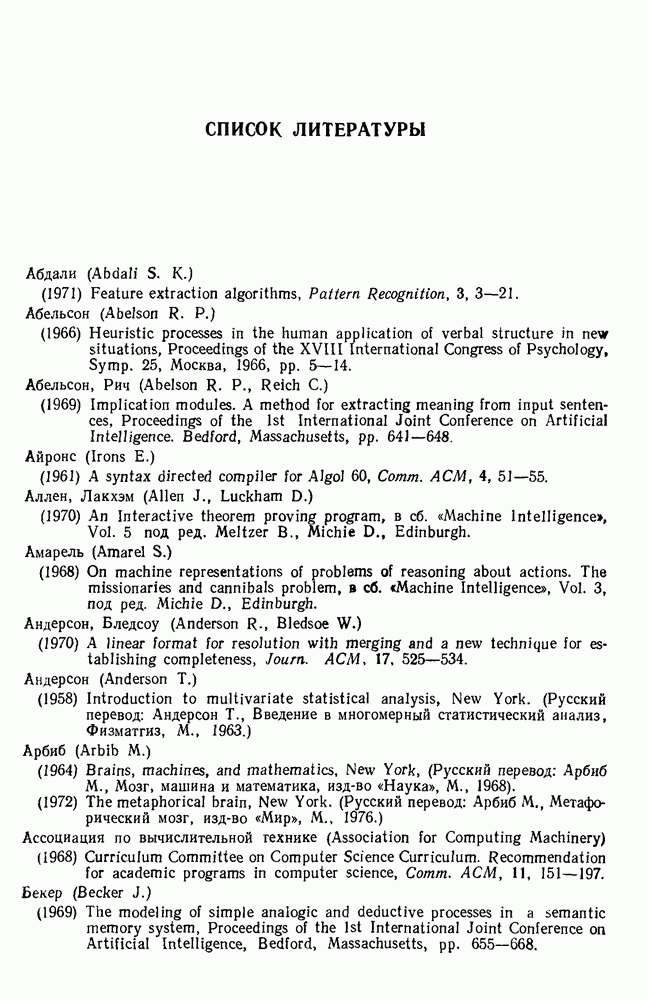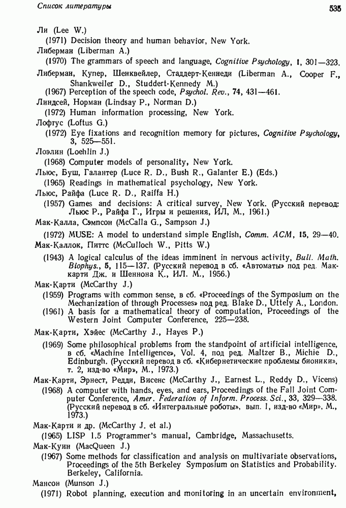 14.2. Дедуктивный вывод в информационном поиске14.2.0. Существующие методыПрограммы, обладающие способностью понимания, должны уметь отвечать на запросы, определяя, какой смысл заключен в той или иной базе данных и что она содержит. Для этого программа должна осуществлять вывод одних фактов из других. Как подразумевается в слове „выводить", соответствующие необходимые процедуры имеют самое непосредственное отношение к доказательству теоремы. Существуют, однако, важные различия между доказательством теорем и выводом при информационном поиске. Алгоритм вывода фактов должен быть корректным. Кажется, нет реальной ситуации, где были бы приемлемы ложные ответы. С другой стороны, полнота, т. е. способность ответить на любой вопрос, допускающий ответ, не является непременным условием. Как мы видели при обсуждении доказательства теорем, полнота часто достигается очень дорогой ценой. В наиболее реальных вопросно-ответных ситуациях большинство вопросов относится к одному и тому же типу, и лишь немногие — к другим. Цель конструктора такой системы — максимизировать полезность системы для пользователя, так что иногда было бы целесообразно пожертвовать способностью вообще отвечать на одни вопросы, чтобы на другие вопросы можно было отвечать очень быстро. Как и следовало ожидать, при создании экспериментальных вопросно-ответных систем вывода такими сугубо практическими соображениями пренебрегали. Возможно, это было оправдано. Мы будем различать несколько типов сложности в процедурах вывода. На самом нижнем уровне программа может быть способной только к перераспределению имеющихся фактов для ответа на запрос. Это демонстрировалось при ответе системы DEACON на вопрос „Кто командир 638-го батальона?“, где ответ был получен подбором нужного сочетания вхождений в базу данных. В качестве побочного продукта процесса ответа на вопросы никакие новые данные не были получены. Более мощный способ — ввести специальные операции для вывода новых фактов. Здесь очень важны вопросы полноты, практичности и определения стратегии решения задач. Программа может содержать ограниченное множество операторов, таких, как импликация и включение множеств, выполнение которых не представляет труда, но которые обеспечивают лишь ограниченные возможности вывода. Другим крайним случаем была бы программа, содержащая полную систему вывода, как, например, резолюции, и рискующая тем, что на некоторые выводы будет тратиться очень много времени. Третий подход состоит в том, чтобы позволить пользователю определять свои собственные процедуры вывода. По существу, пользователь задает вопрос и затем сообщает системе, как найти ответ. Этот подход разделяют Слейгл (1965) в системе DEDUCOM, а также Достерт и Томпсон (1971). Он в принципе отдает все возможности машины в руки пользователя, но может также возложить на него бремя программистской работы. Наоборот, система информационного поиска может содержать заранее составленные подпрограммы дедуктивного вывода, но в то же время позволять пользователю выбирать при желании стратегию. 14.2.1. Системы, использующие неполный вывод14.2.1.1. РЕАГИРУЮЩАЯ БИБЛИОТЕКАНашим первым примером будет очень ограниченная система неполного вывода, которая предназначалась для эксперимента с возможностями некоторых грубых правил вывода (Хант и Куинлан, 