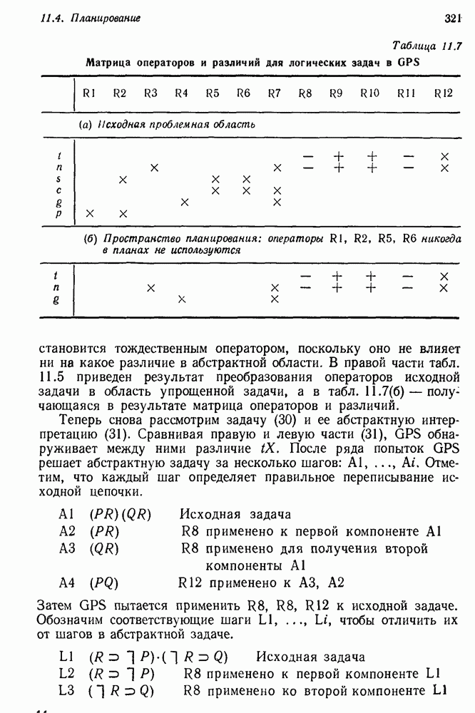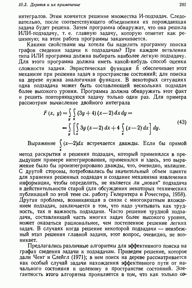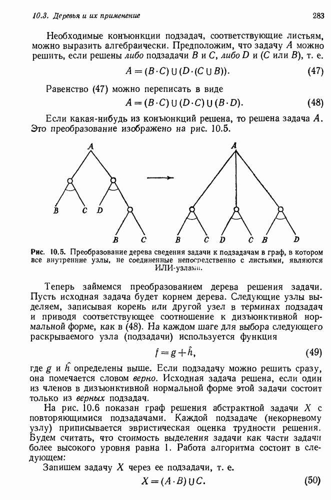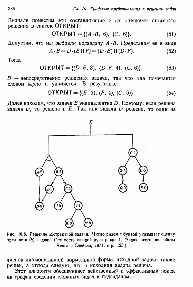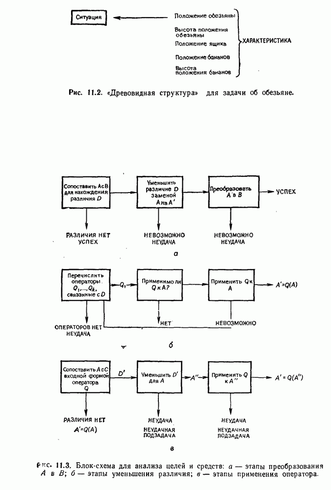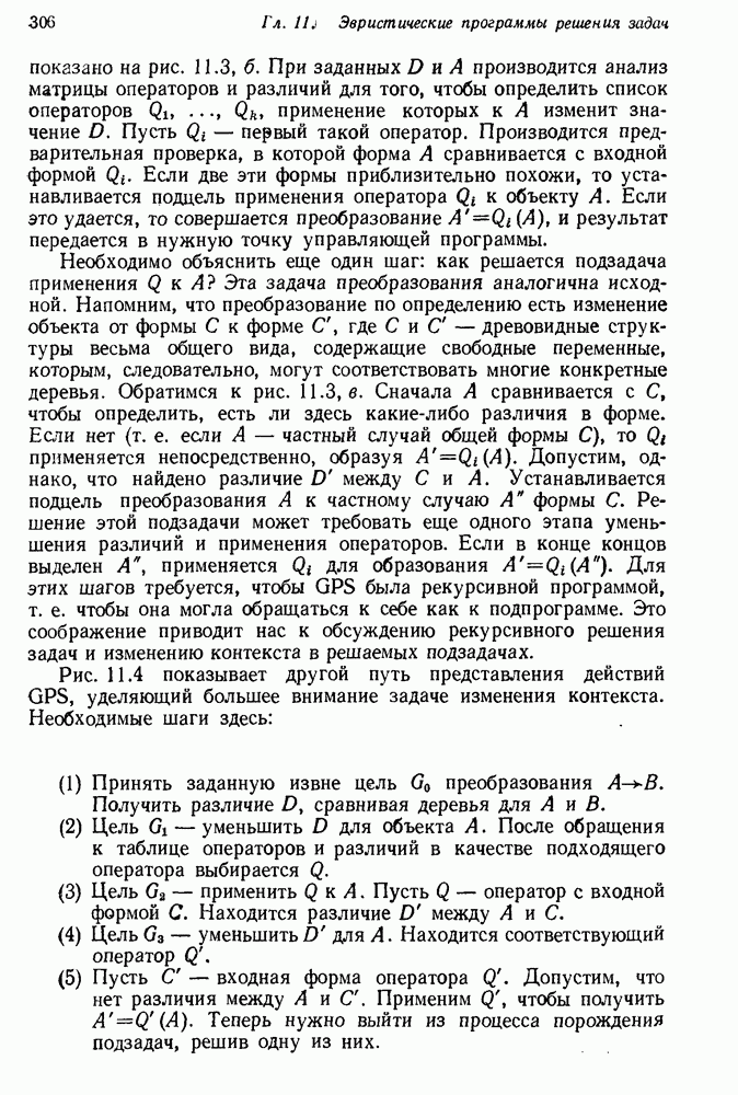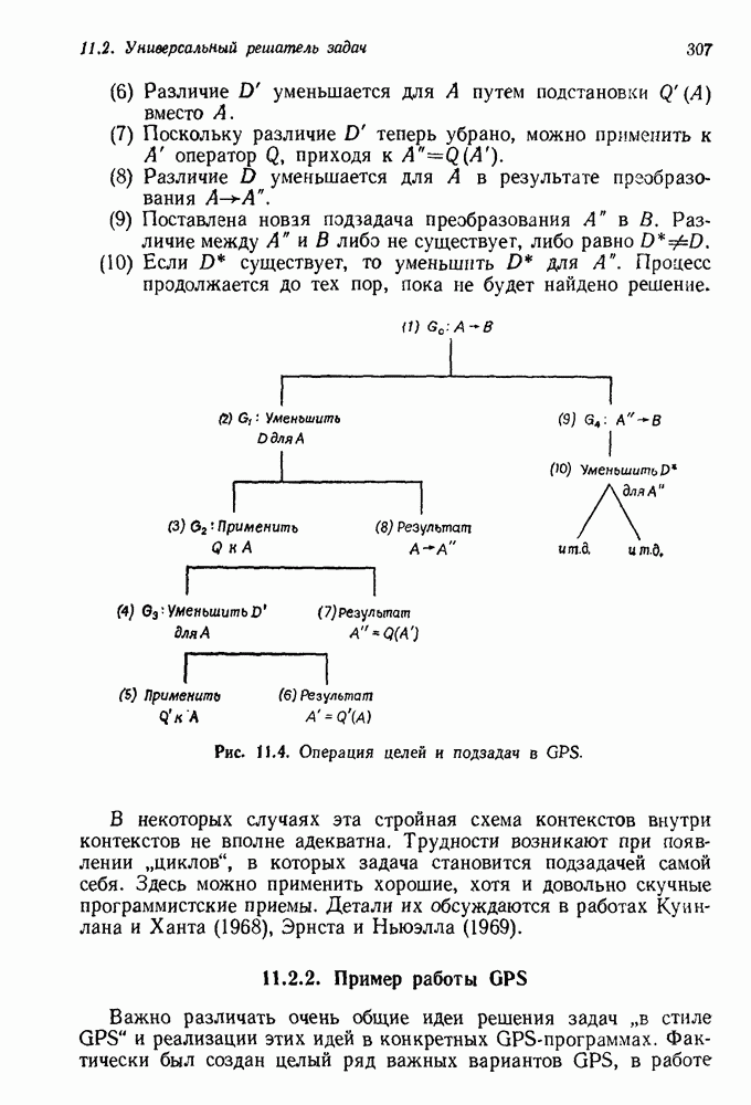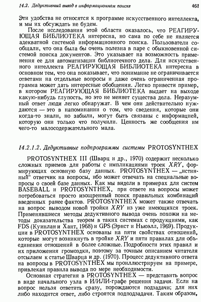 Если можно найти метафакт, в который можно преобразовать входной и имеющийся факты, то система фиксирует соответствие или несоответствие в зависимости от того, согласуются или нет знаки сравниваемых фактов. Иногда пользователи хотели пресечь все или некоторые направления поиска, которые могла породить РЕАГИРУЮЩАЯ БИБЛИОТЕКА. Такая возможность обеспечивалась множеством селективных команд, позволявших пользователю определять новые операнды или ограничивать сравнение несколькими операндами. Эти удобства не относятся к программе искусственного интеллекта, и мы их обсуждать не будем. После исследования этой области оказалось, что РЕАГИРУЮЩАЯ БИБЛИОТЕКА интересна, но сама по себе не является адекватной системой информационного поиска. Пользователи сообщали, что она была бы очень полезна в паре с обыкновенной системой поиска документов. Это указывает на возможность применения ее для автоматизации библиотечного дела. Для искусственного интеллекта РЕАГИРУЮЩАЯ БИБЛИОТЕКА интересна в основном тем, что она показывает, что понимание не ограничивается ответами на отдельные вопросы и даже очень ограниченная программа может дать интересные обобщения. Легко привести пример, в котором РЕАГИРУЮЩАЯ БИБЛИОТЕКА выдает на выходе какую-нибудь глупость, но это не меняет существа дела. Неразумный ответ люди легко обнаружат. В чем они действительно нуждаются — это в напоминании о том, что сведения, которые они когда-то знали, но забыли, могут быть связаны с информацией, которую они только что получили. Ценность же сообщения им чего-то малосодержательного мала. 14.2.1.2. Дедуктивные подпрограммы системы PROTOSYNTHEXPROTOSYNTHEX III (Шварц и др., 1970) содержит несколько сложных приемов для работы с импликациями троек Основная стратегия в PROTOSYNTHEX — представить вопрос в виде начального узла в И/ИЛИ-графе решения задачи. Если на вопрос нельзя ответить сразу, порождаются подзадачи; для них либо находится ответ, либо строятся подподзадачи. Таким образом, здесь непосредственно применимы алгоритмы раскрытия графов решения задач. Фактически PROTOSYNTHEX выбирает, какую очередную подзадачу раскрыть, и применяет для этого алгоритм, подобный алгоритму Multiple Слейгла и Бурского (1966). Вопросы и подвопросы можно считать условиями, которым должна удовлетворять тройка событий, если ее рассматривать как ответ на вопрос. На вопрос дан ответ, если в базе данных найдена подходящая тройка событий или ее можно вывести из имеющихся троек с помощью правил вывода.