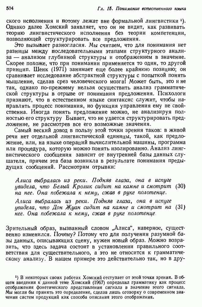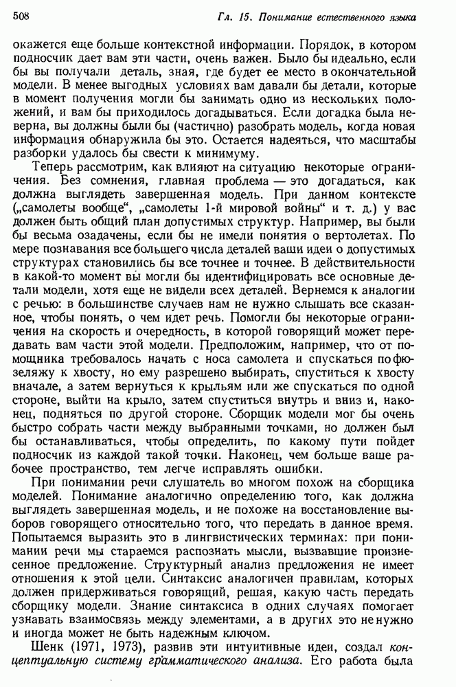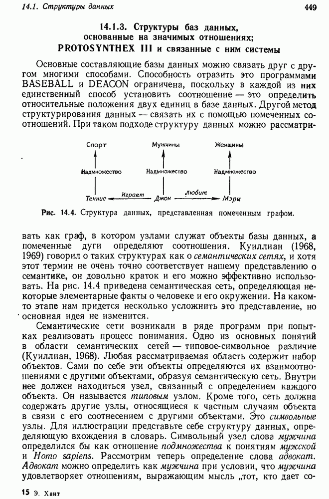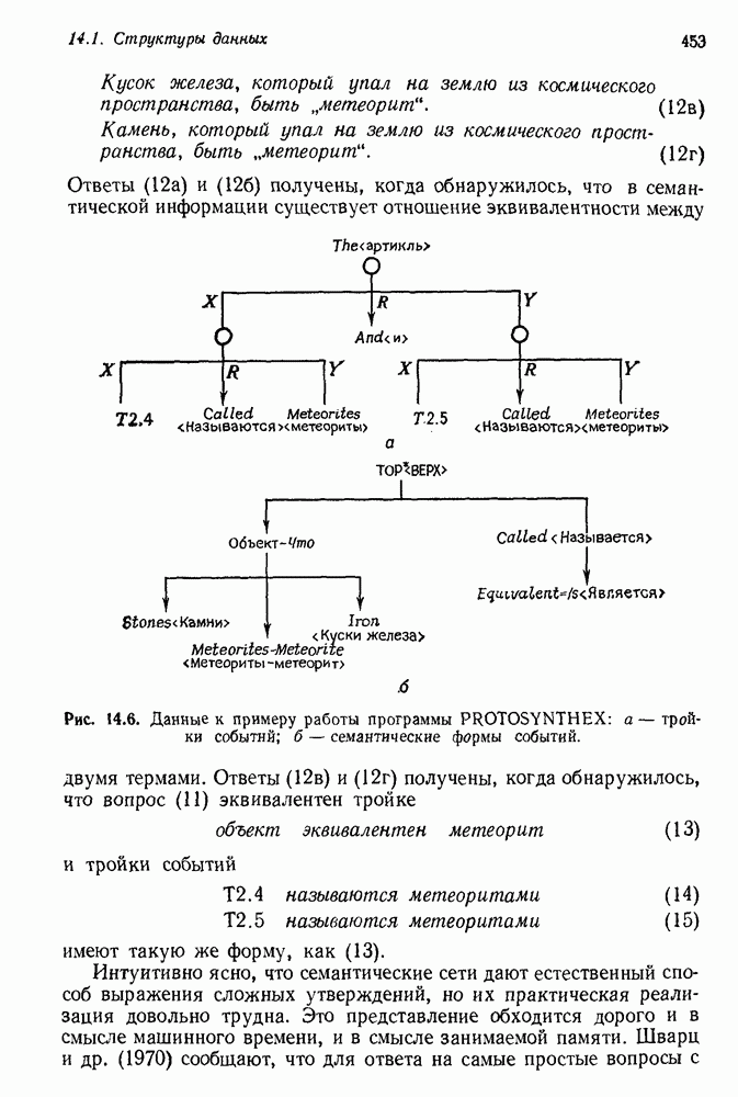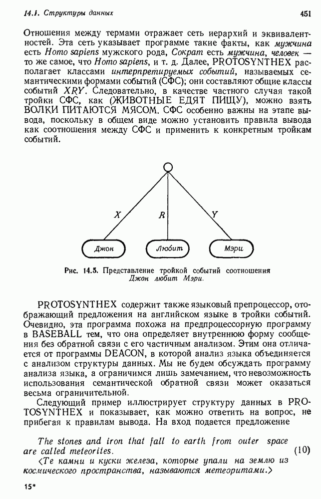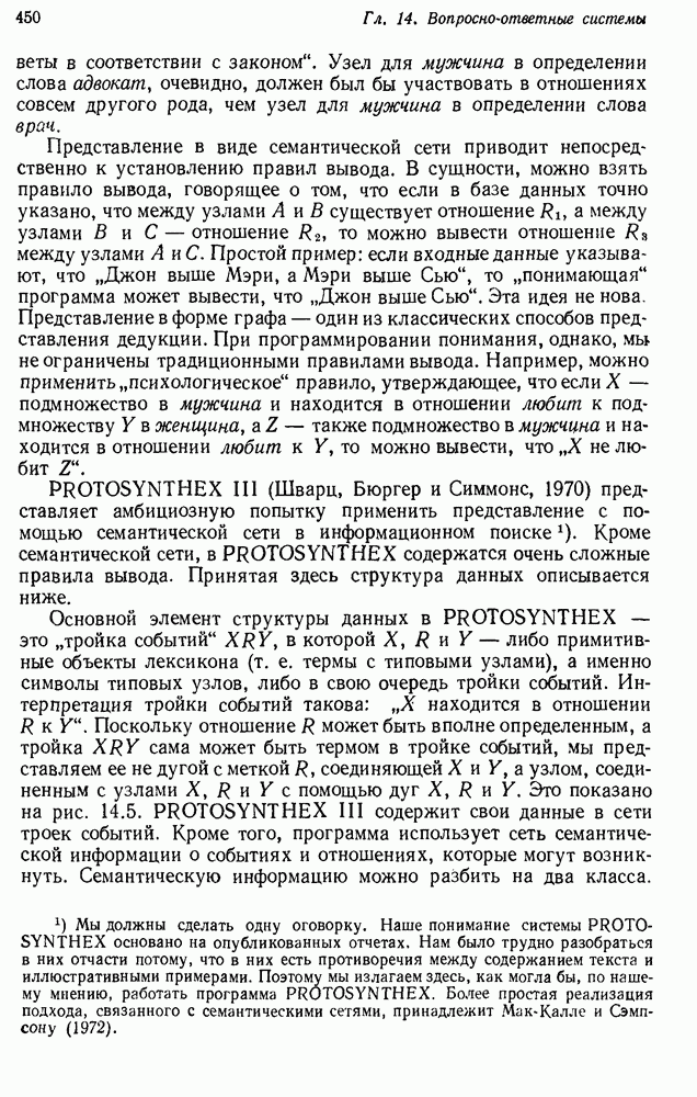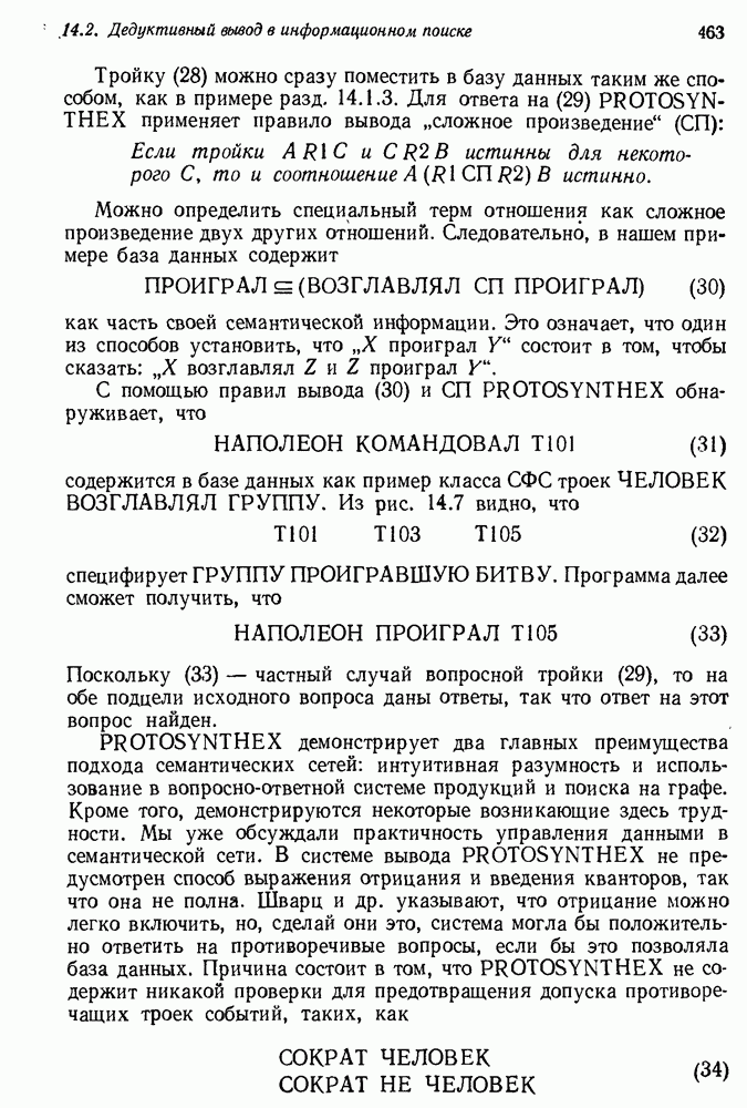 Поскольку (33) — частный случай вопросной тройки (29), то на обе подцели исходного вопроса даны ответы, так что ответ на этот вопрос найден. PROTOSYNTHEX демонстрирует два главных преимущества подхода семантических сетей: интуитивная разумность и использование в вопросно-ответной системе продукций и поиска на графе. Кроме того, демонстрируются некоторые возникающие здесь трудности. Мы уже обсуждали практичность управления данными в семантической сети. В системе вывода PROTOSYNTHEX не предусмотрен способ выражения отрицания и введения кванторов, так что она не полна. Шварц и др. указывают, что отрицание можно легко включить, но, сделай они это, система могла бы положительно ответить на противоречивые вопросы, если бы это позволяла база данных. Причина состоит в том, что PROTOSYNTHEX не содержит никакой проверки для предотвращения допуска противоречащих троек событий, таких, как