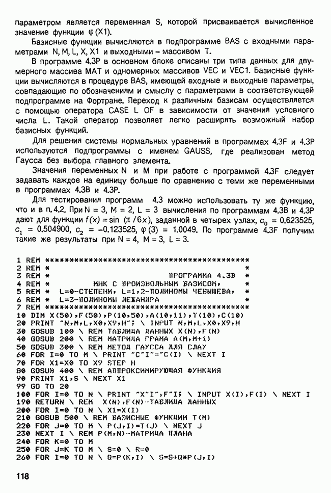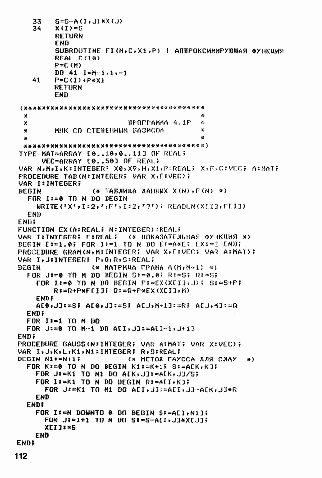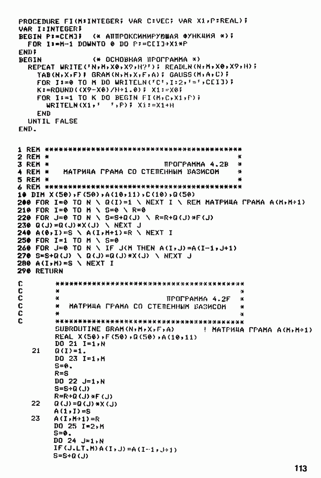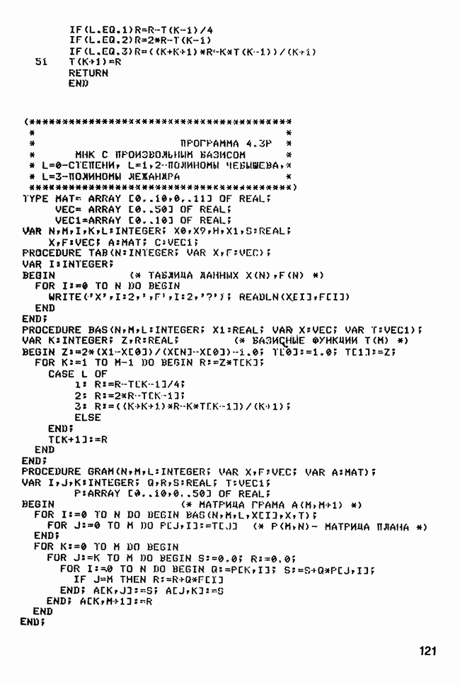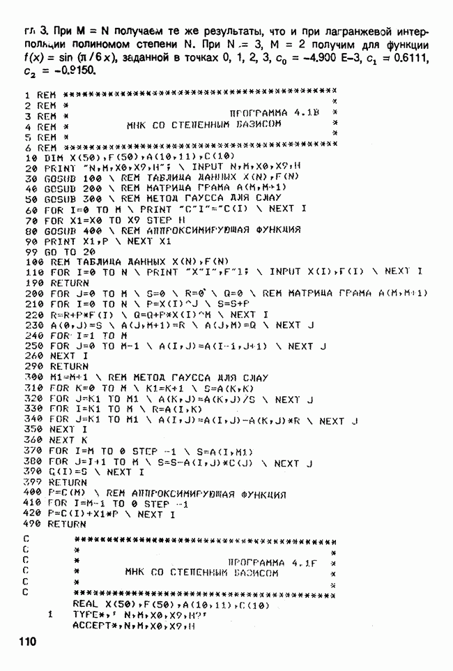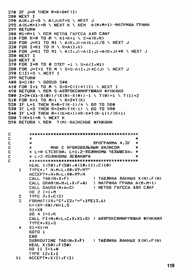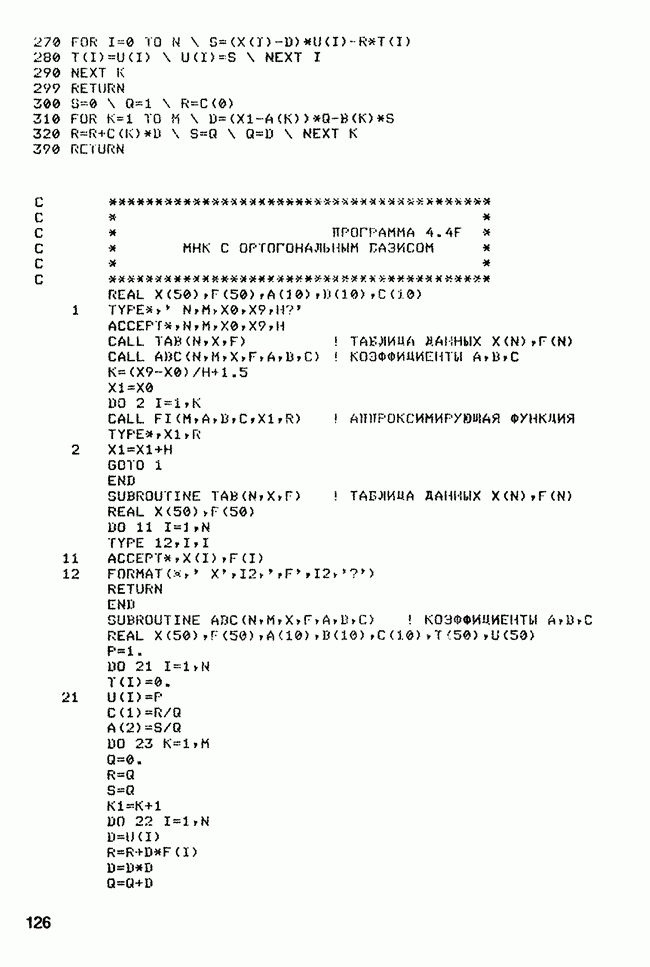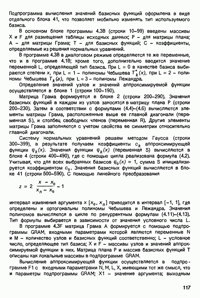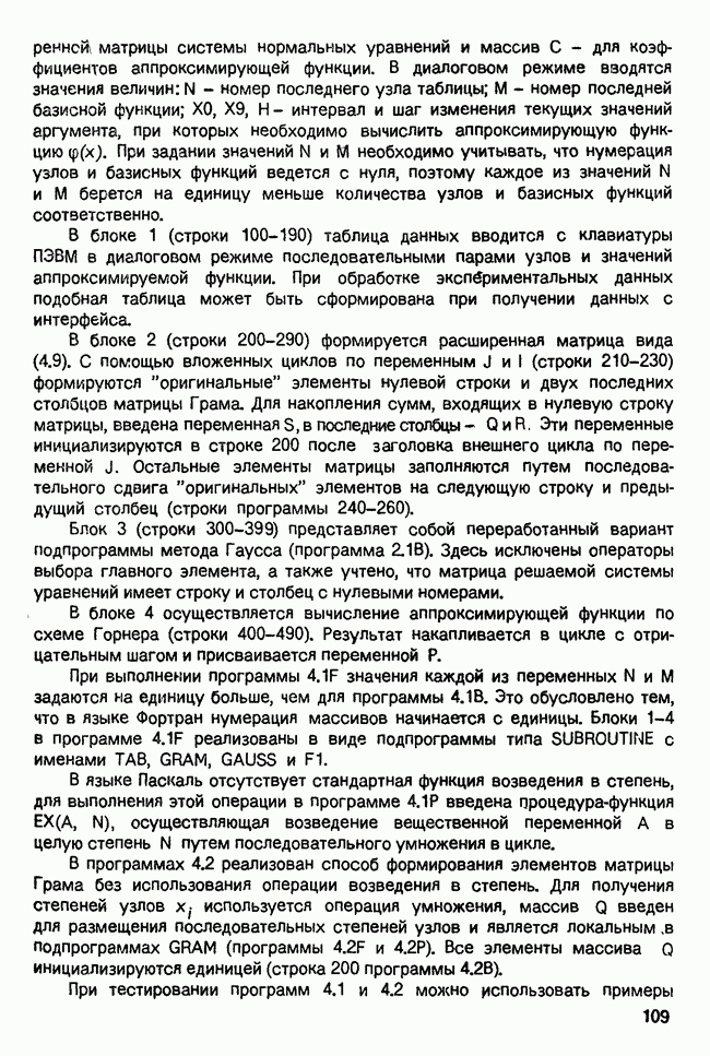 Рис. 4.3. Блок-схема программы обработки данных методом наименьших квадратов с ортогональным базисом В основном блоке программы В блоке 1 (строки 100-190) реализован ввод в диалоговом режиме узлов и значений аппроксимируемой функции. В блоке 2 (строки 200-299) в цикле (строка 200) инициализируются значения полиномов Чебышева младших степеней для каждого узла Причем, чтобы рекуррентную формулу (4.18) применить при Подпрограмма вычисления аппроксимирующей функции (4.20) при аргументе В программах Для тестирования программ 4.4 можно использовать пример (см. скан) (см. скан) (см. скан) (см. скан)