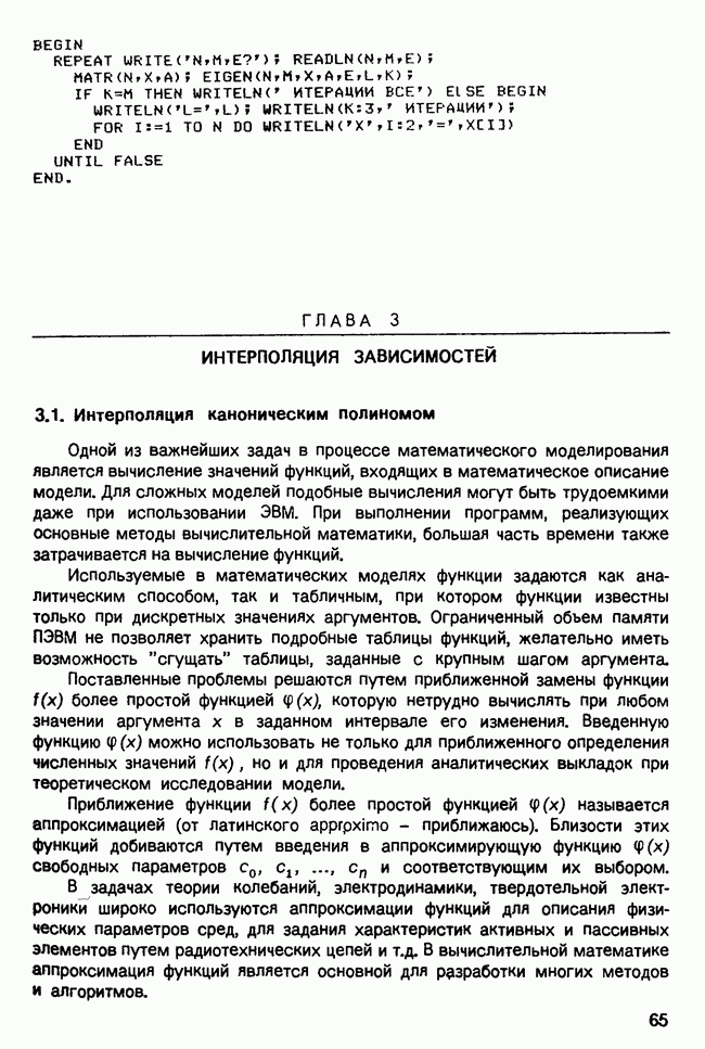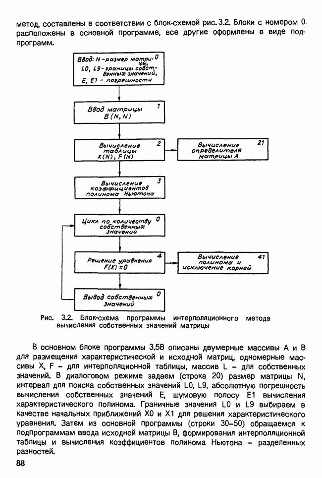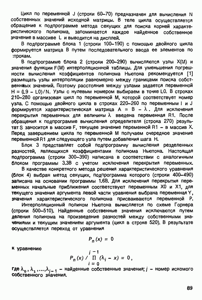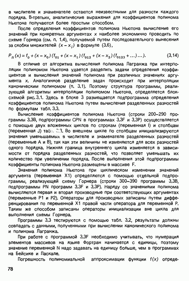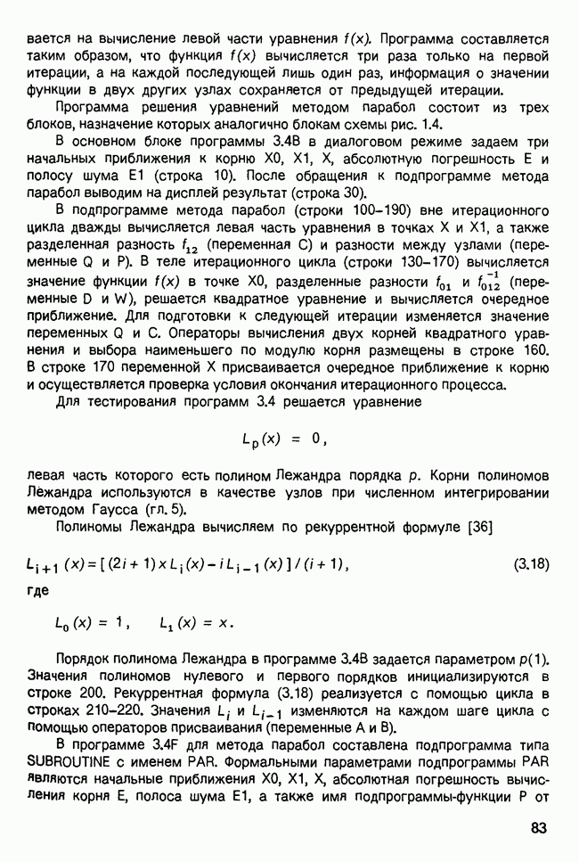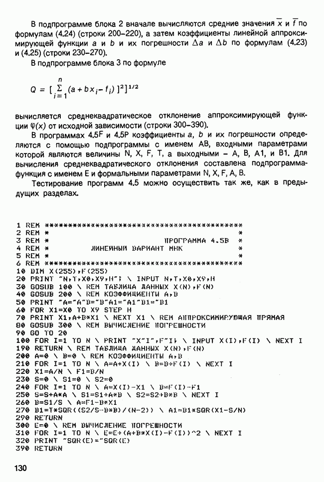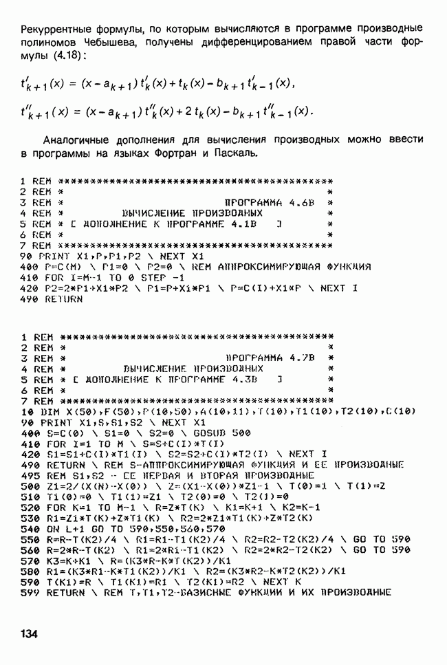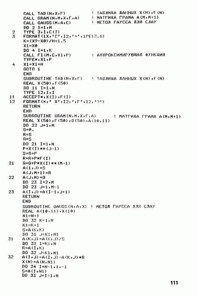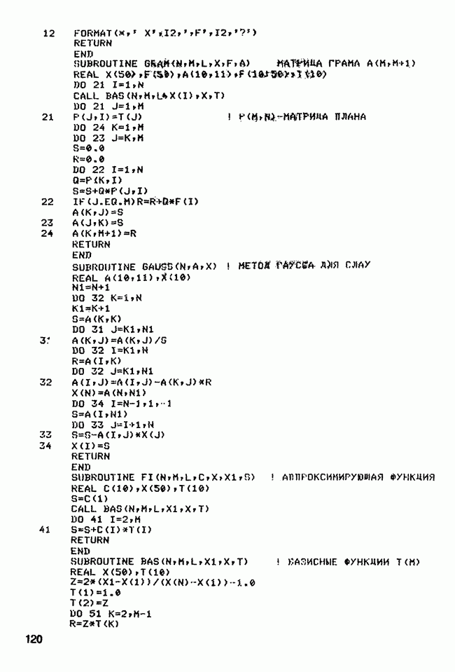 Рис. 4.3. Блок-схема программы обработки данных методом наименьших квадратов с ортогональным базисом В основном блоке программы В блоке 1 (строки 100-190) реализован ввод в диалоговом режиме узлов и значений аппроксимируемой функции. В блоке 2 (строки 200-299) в цикле (строка 200) инициализируются значения полиномов Чебышева младших степеней для каждого узла Причем, чтобы рекуррентную формулу (4.18) применить при Подпрограмма вычисления аппроксимирующей функции (4.20) при аргументе В программах Для тестирования программ 4.4 можно использовать пример (см. скан) (см. скан) (см. скан) (см. скан)