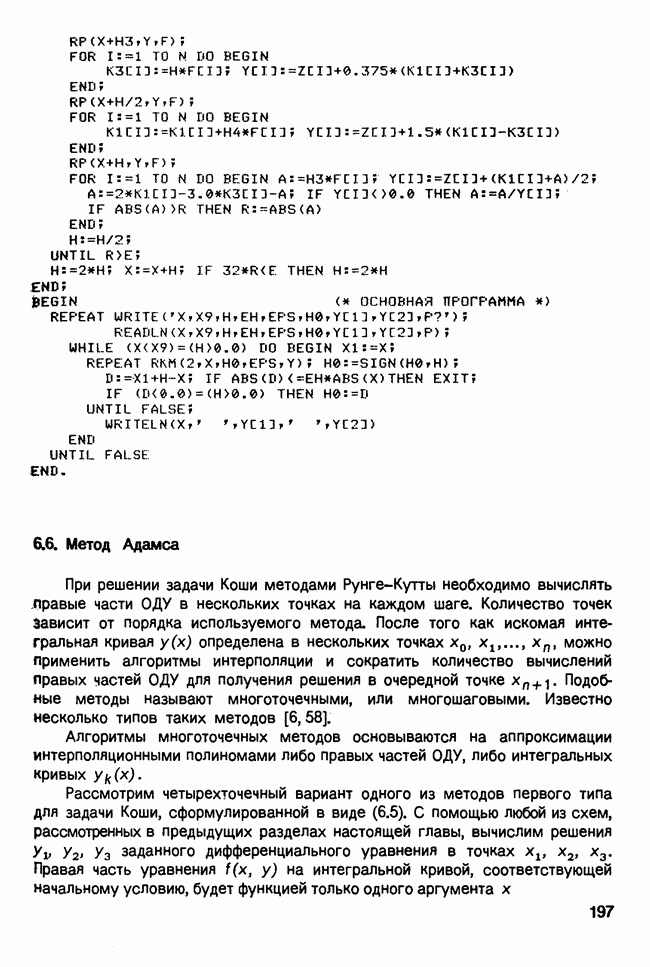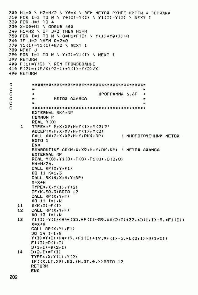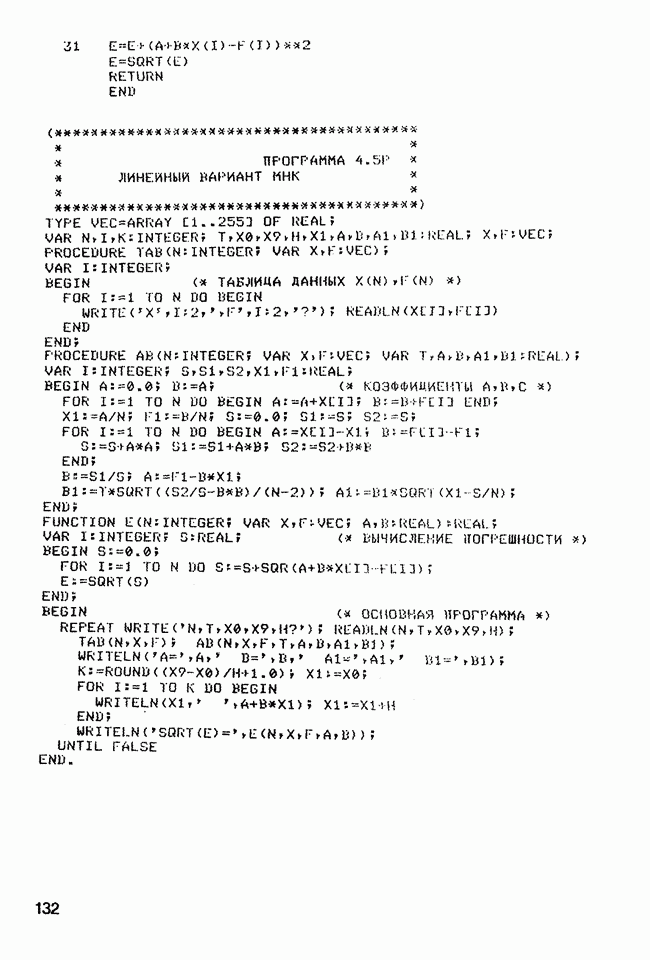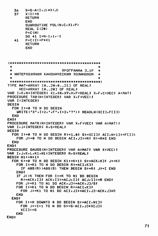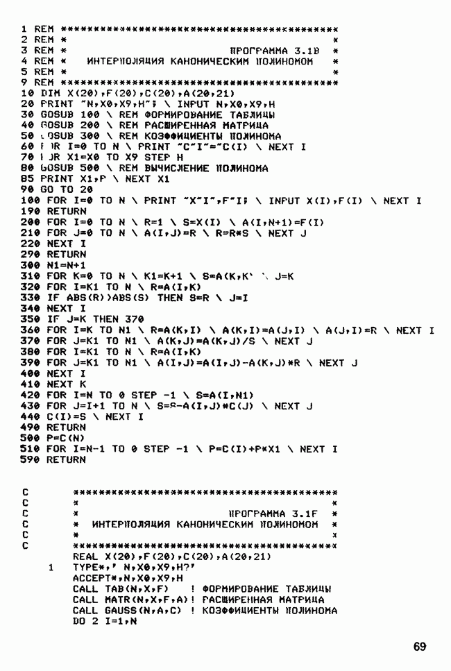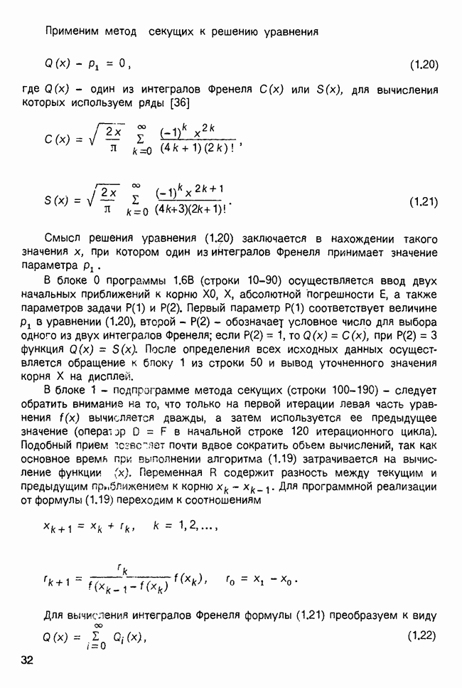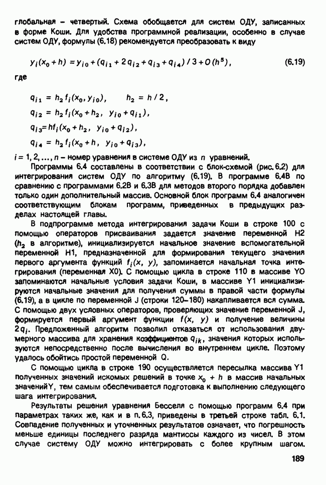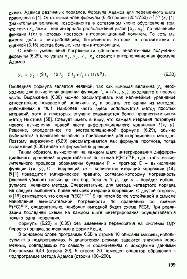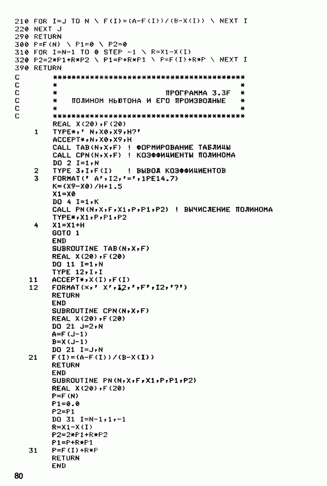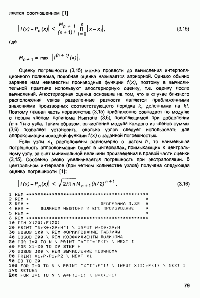 Рис. 4.3. Блок-схема программы обработки данных методом наименьших квадратов с ортогональным базисом В основном блоке программы В блоке 1 (строки 100-190) реализован ввод в диалоговом режиме узлов и значений аппроксимируемой функции. В блоке 2 (строки 200-299) в цикле (строка 200) инициализируются значения полиномов Чебышева младших степеней для каждого узла Причем, чтобы рекуррентную формулу (4.18) применить при Подпрограмма вычисления аппроксимирующей функции (4.20) при аргументе В программах Для тестирования программ 4.4 можно использовать пример (см. скан) (см. скан) (см. скан) (см. скан)