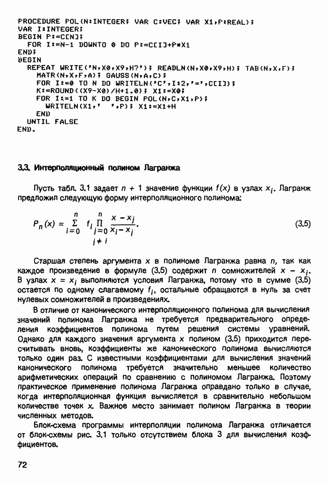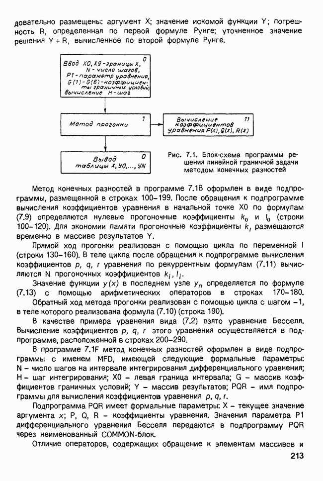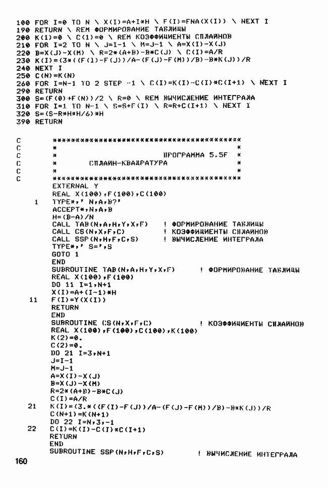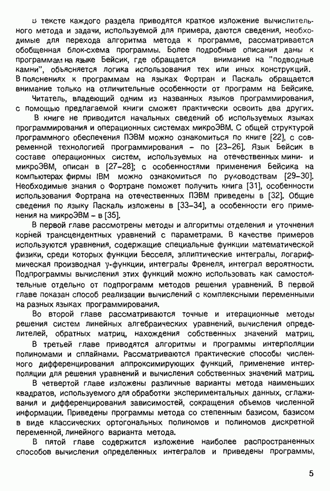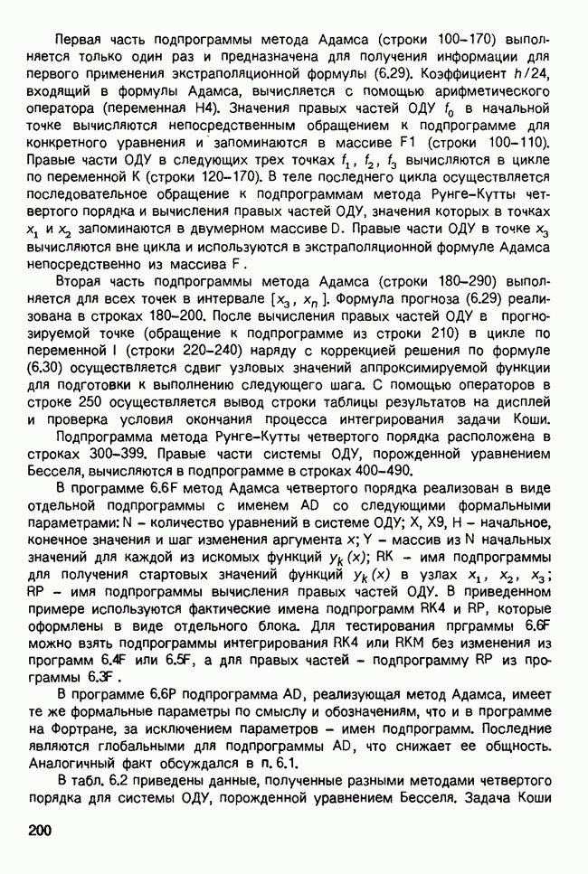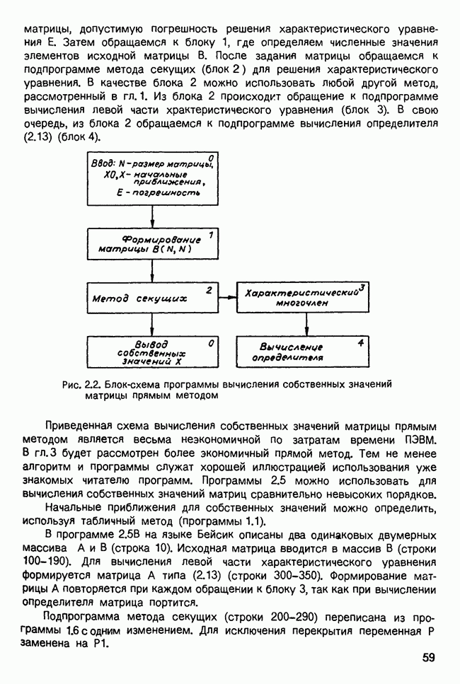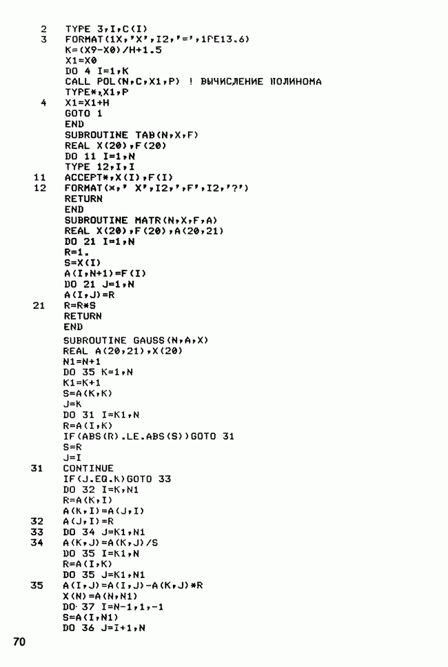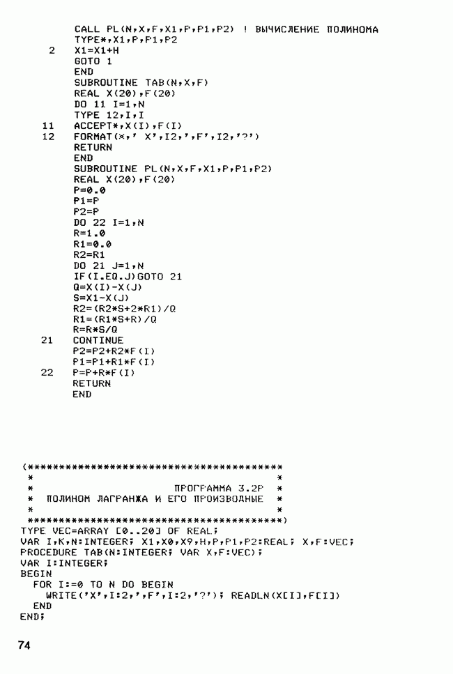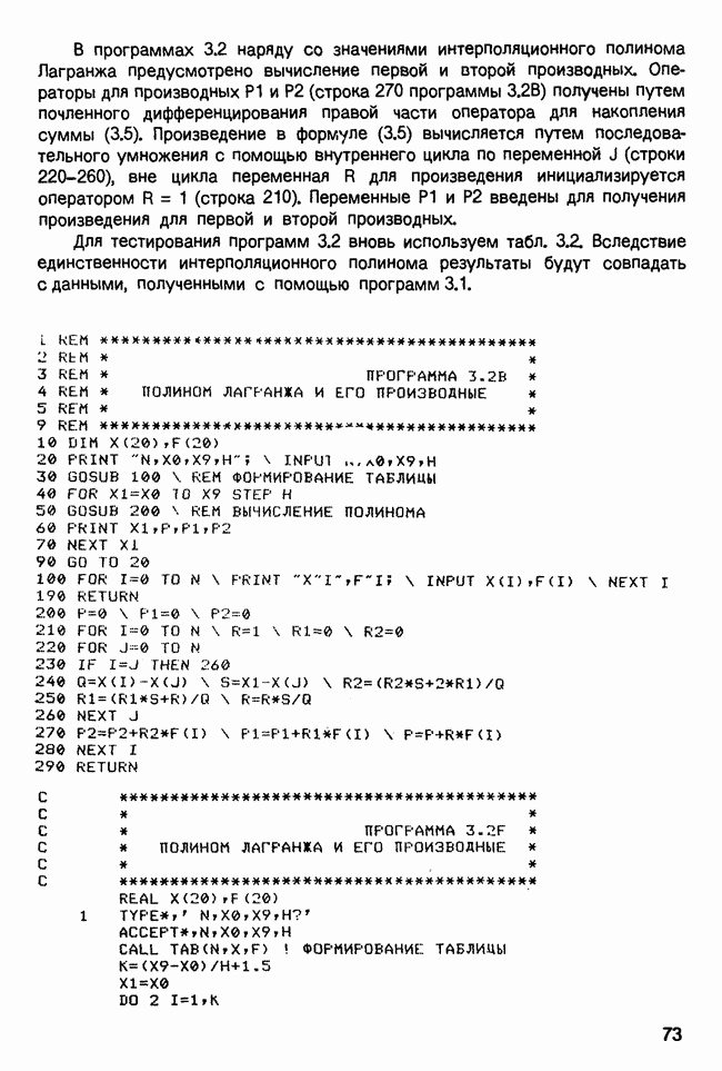 Рис. 4.3. Блок-схема программы обработки данных методом наименьших квадратов с ортогональным базисом В основном блоке программы В блоке 1 (строки 100-190) реализован ввод в диалоговом режиме узлов и значений аппроксимируемой функции. В блоке 2 (строки 200-299) в цикле (строка 200) инициализируются значения полиномов Чебышева младших степеней для каждого узла Причем, чтобы рекуррентную формулу (4.18) применить при Подпрограмма вычисления аппроксимирующей функции (4.20) при аргументе В программах Для тестирования программ 4.4 можно использовать пример (см. скан) (см. скан) (см. скан) (см. скан)