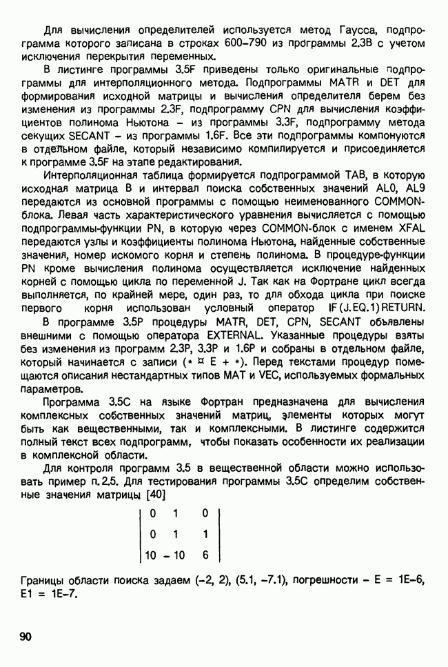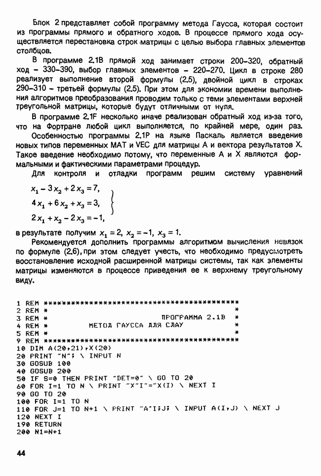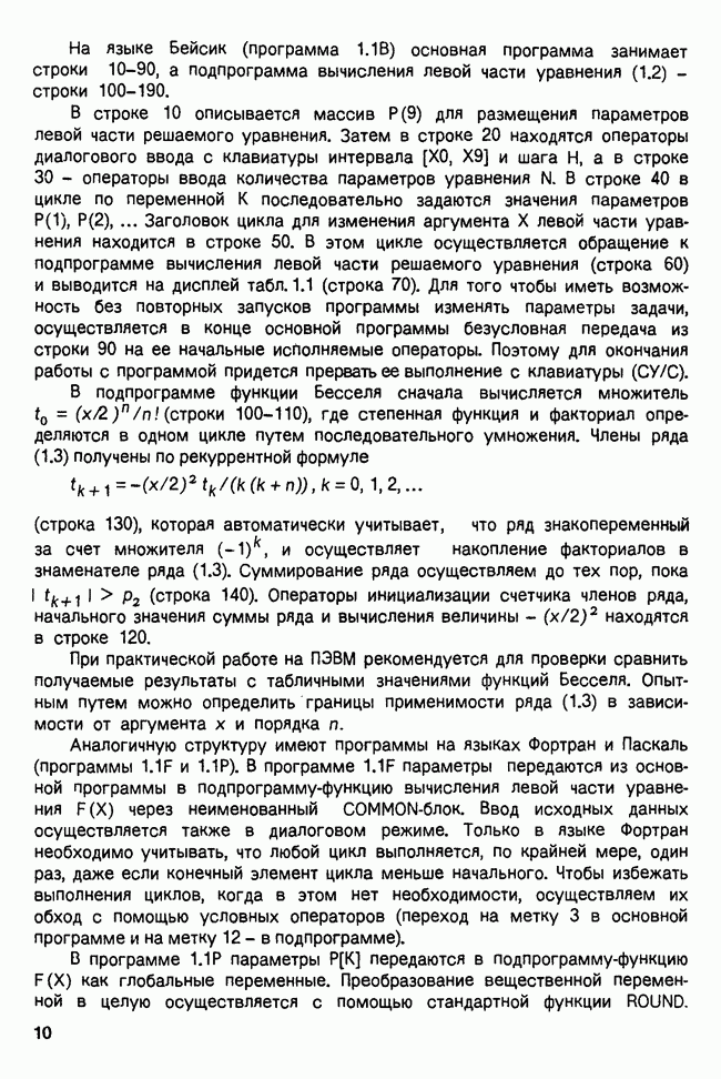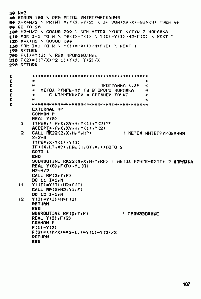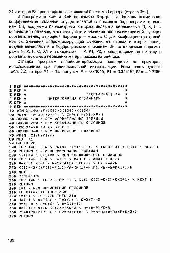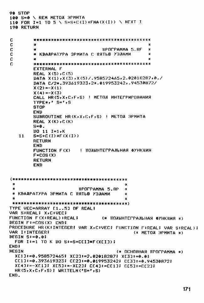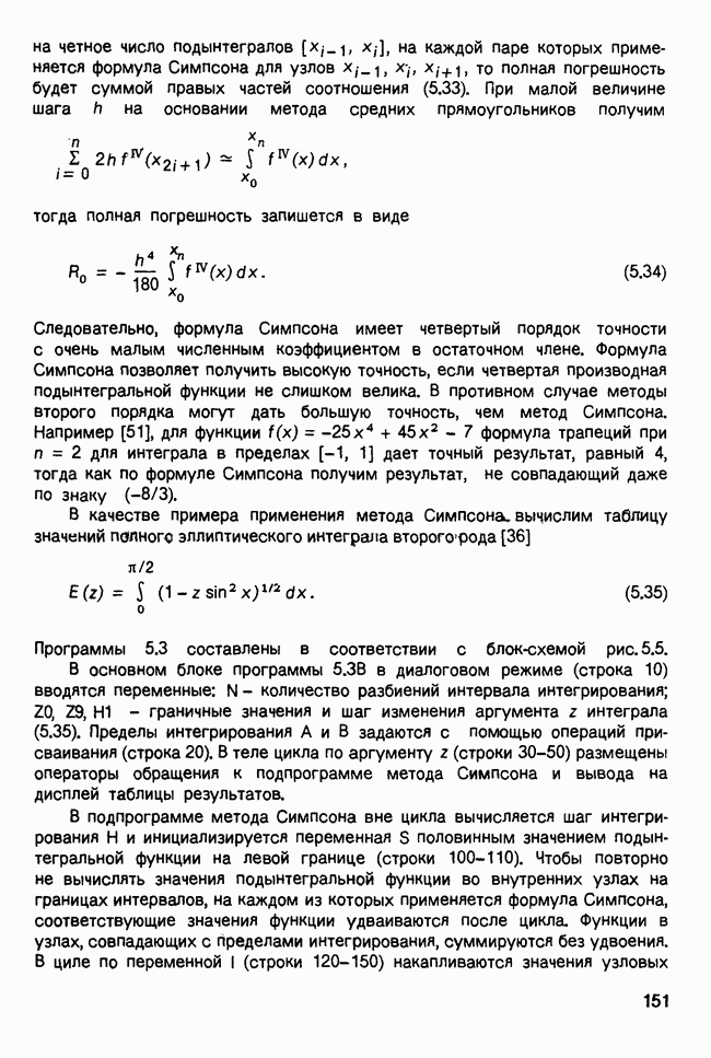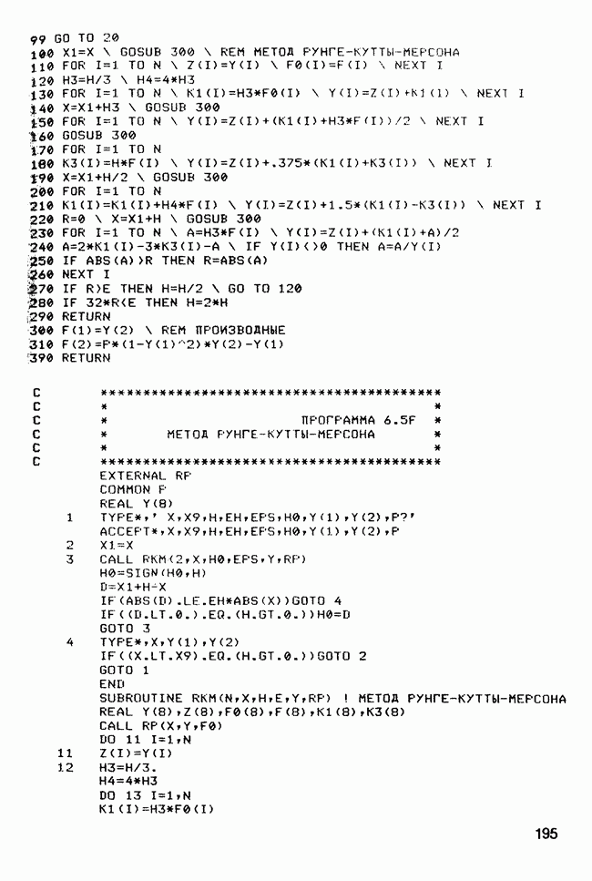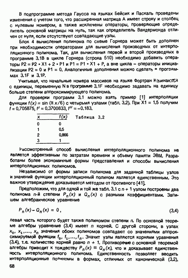 Рис. 4.3. Блок-схема программы обработки данных методом наименьших квадратов с ортогональным базисом В основном блоке программы В блоке 1 (строки 100-190) реализован ввод в диалоговом режиме узлов и значений аппроксимируемой функции. В блоке 2 (строки 200-299) в цикле (строка 200) инициализируются значения полиномов Чебышева младших степеней для каждого узла Причем, чтобы рекуррентную формулу (4.18) применить при Подпрограмма вычисления аппроксимирующей функции (4.20) при аргументе В программах Для тестирования программ 4.4 можно использовать пример (см. скан) (см. скан) (см. скан) (см. скан)