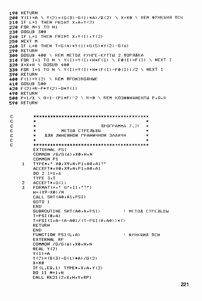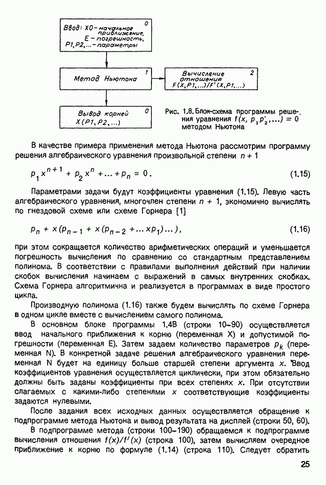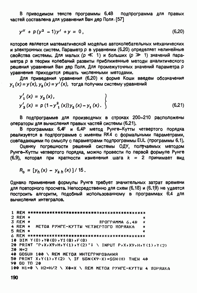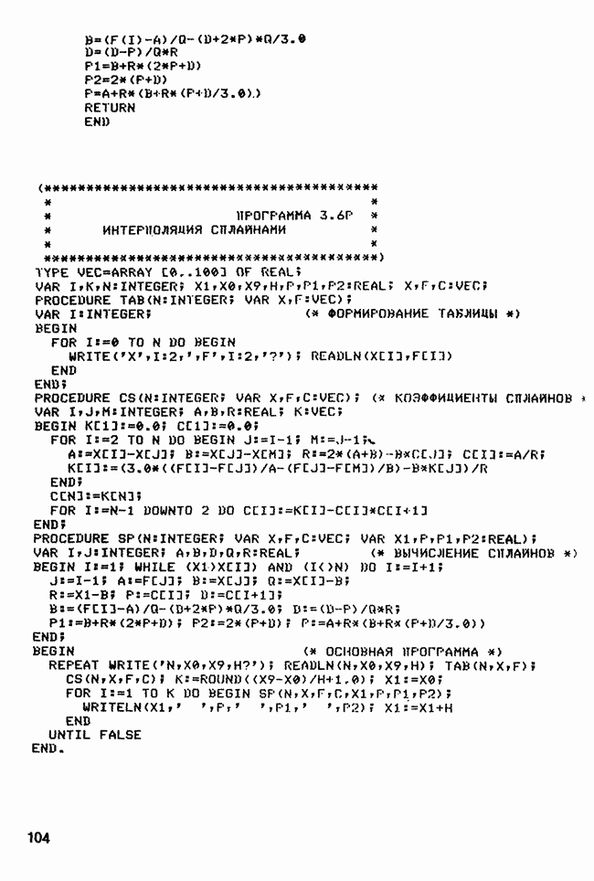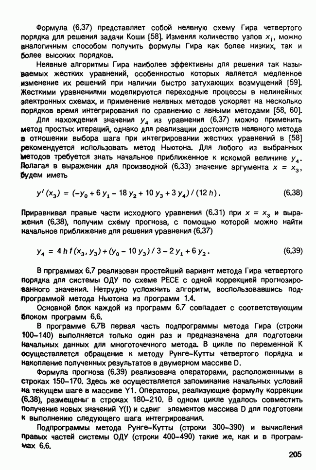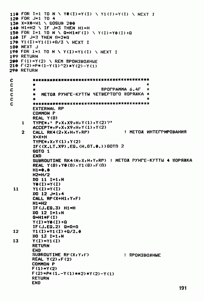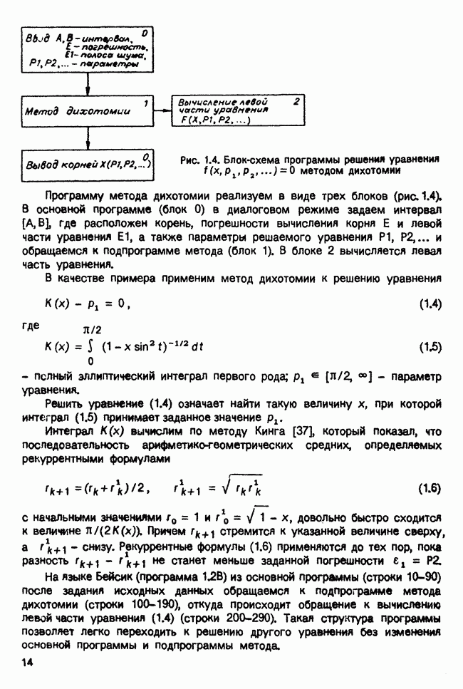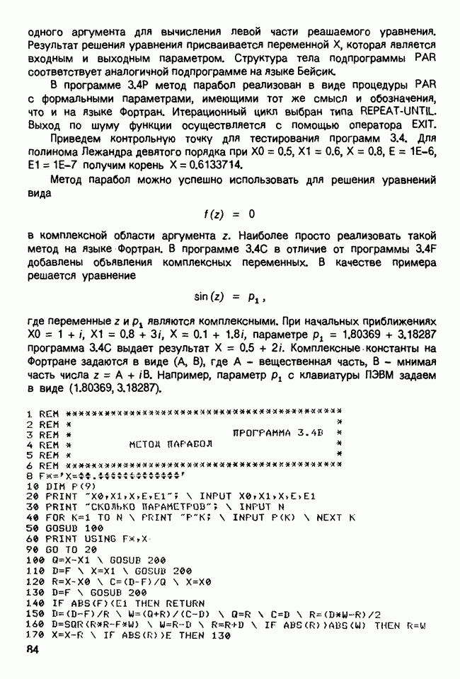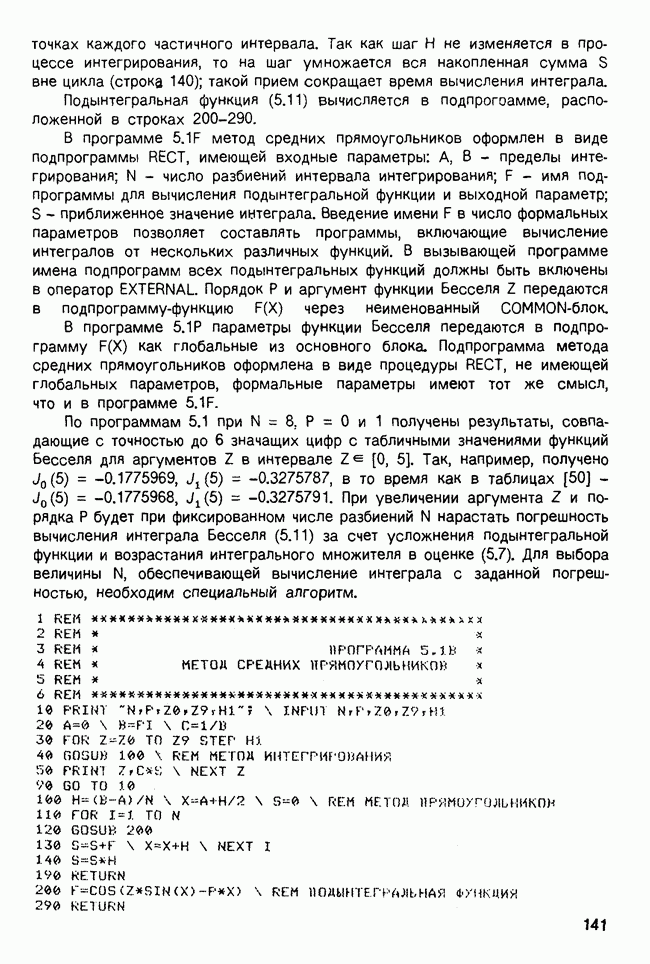 Рис. 4.3. Блок-схема программы обработки данных методом наименьших квадратов с ортогональным базисом В основном блоке программы В блоке 1 (строки 100-190) реализован ввод в диалоговом режиме узлов и значений аппроксимируемой функции. В блоке 2 (строки 200-299) в цикле (строка 200) инициализируются значения полиномов Чебышева младших степеней для каждого узла Причем, чтобы рекуррентную формулу (4.18) применить при Подпрограмма вычисления аппроксимирующей функции (4.20) при аргументе В программах Для тестирования программ 4.4 можно использовать пример (см. скан) (см. скан) (см. скан) (см. скан)