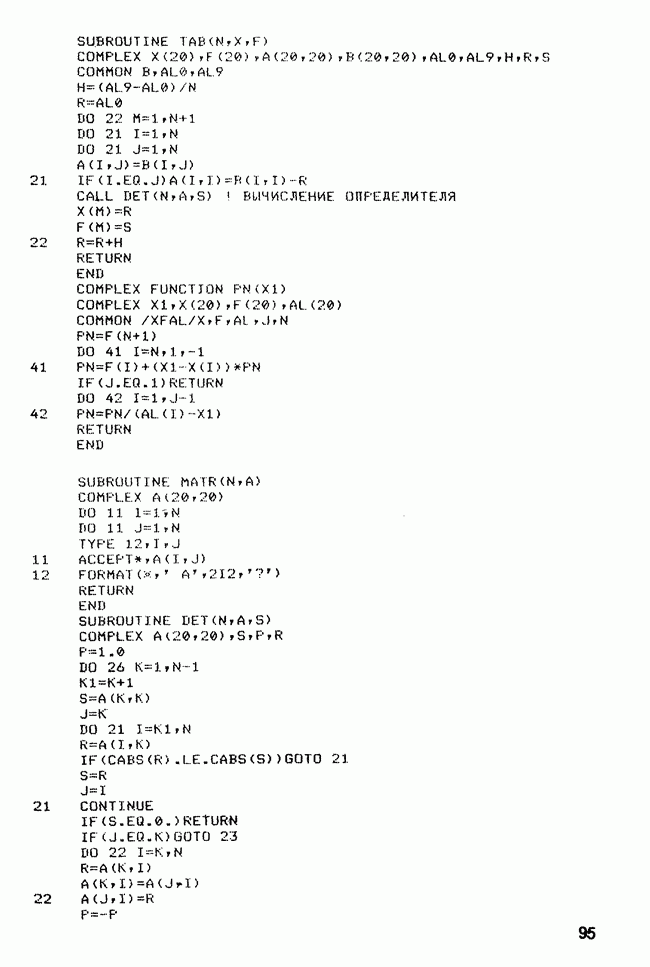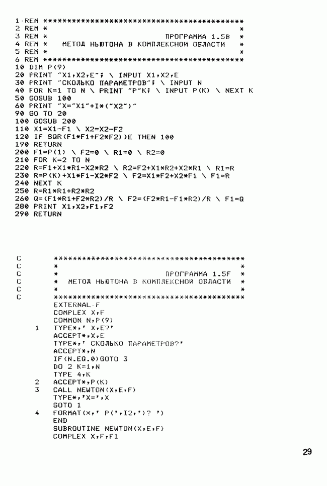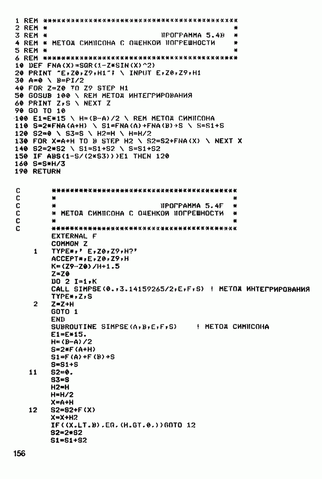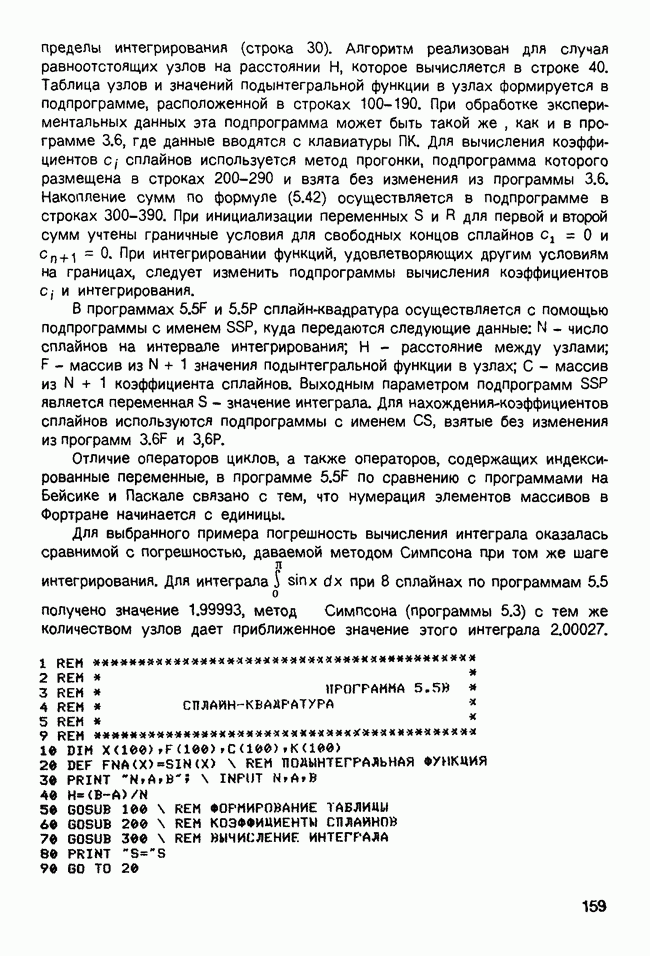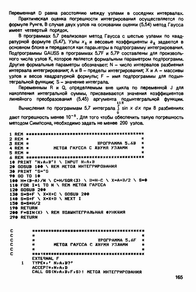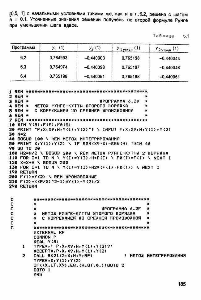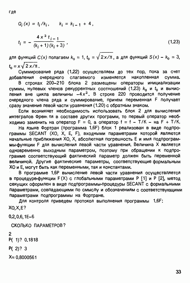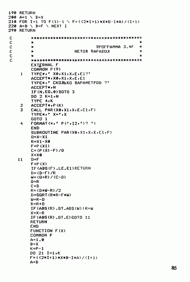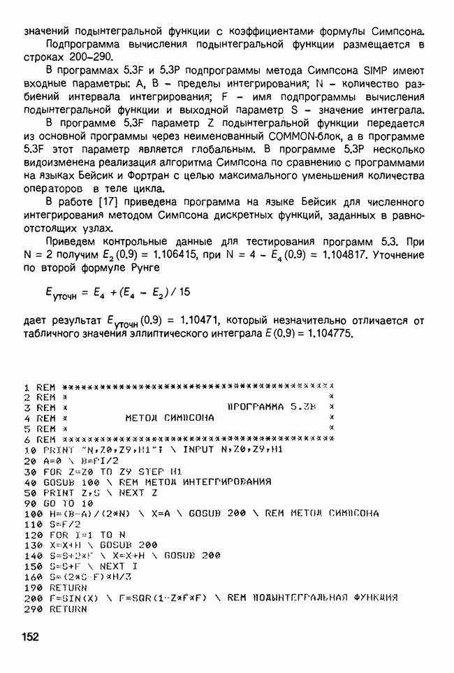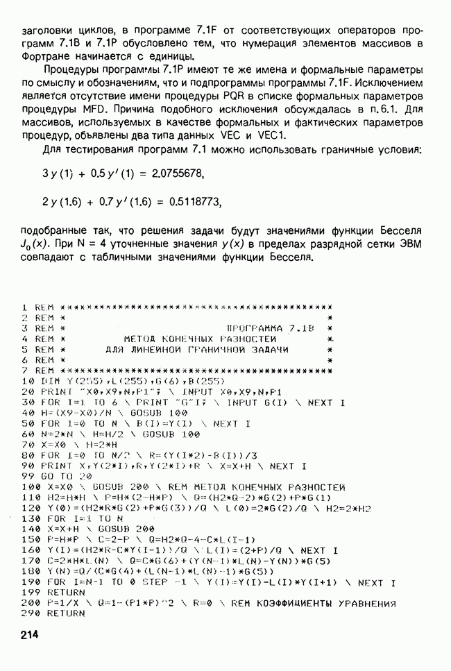 Рис. 4.3. Блок-схема программы обработки данных методом наименьших квадратов с ортогональным базисом В основном блоке программы В блоке 1 (строки 100-190) реализован ввод в диалоговом режиме узлов и значений аппроксимируемой функции. В блоке 2 (строки 200-299) в цикле (строка 200) инициализируются значения полиномов Чебышева младших степеней для каждого узла Причем, чтобы рекуррентную формулу (4.18) применить при Подпрограмма вычисления аппроксимирующей функции (4.20) при аргументе В программах Для тестирования программ 4.4 можно использовать пример (см. скан) (см. скан) (см. скан) (см. скан)