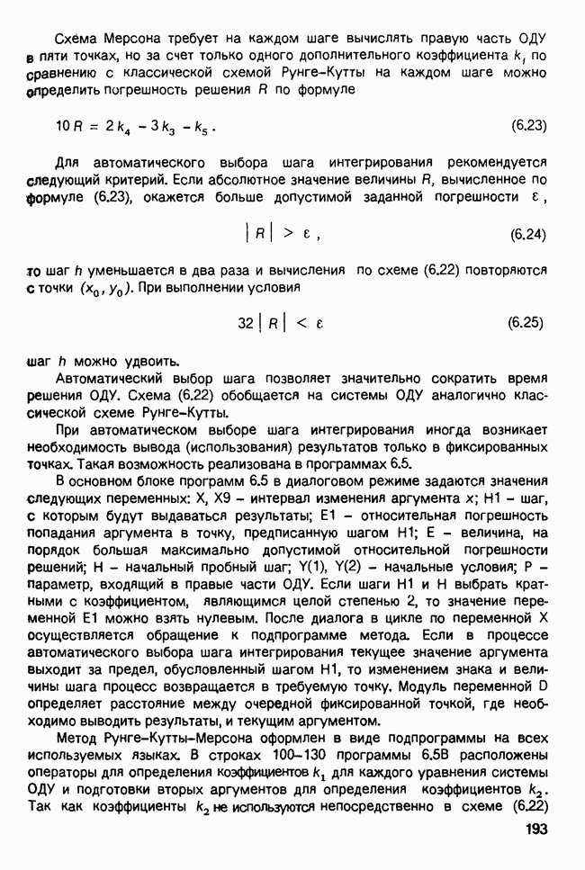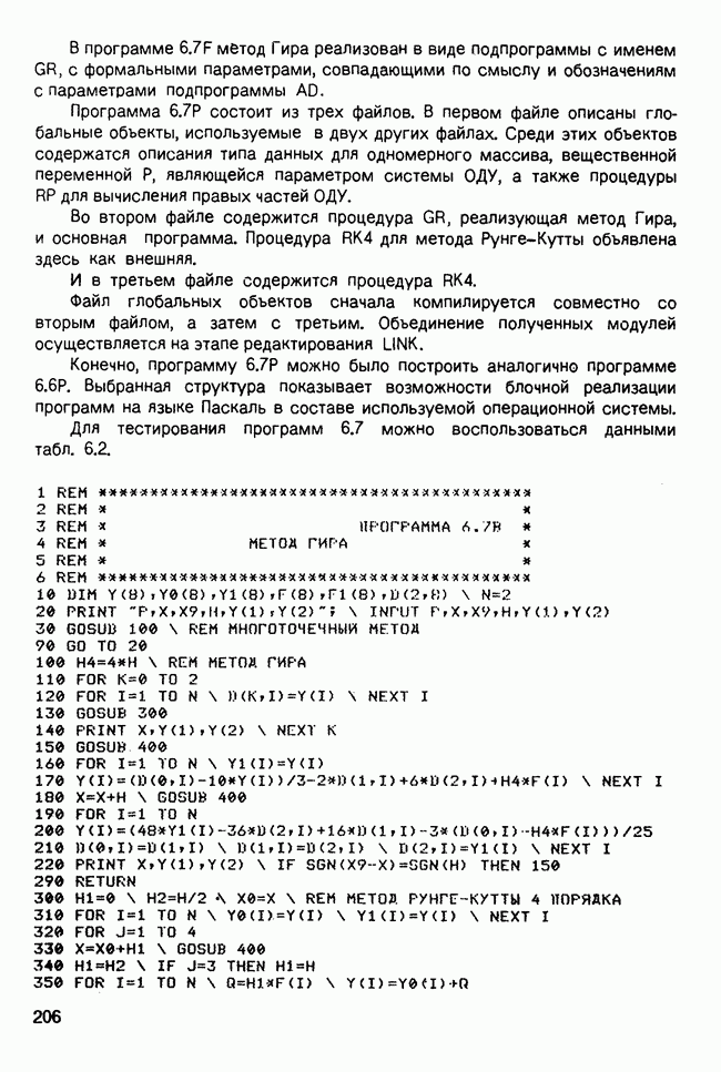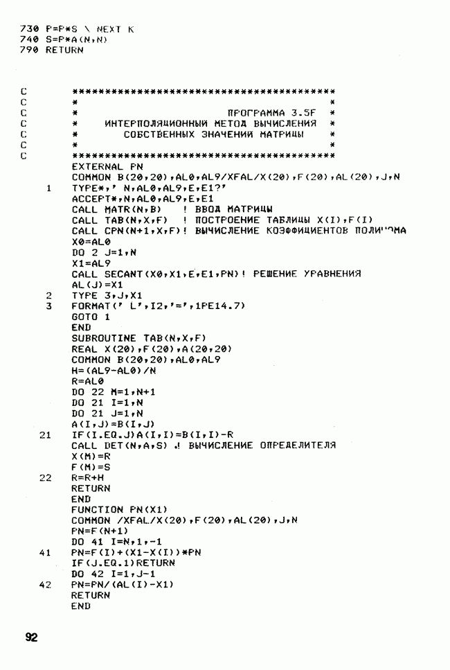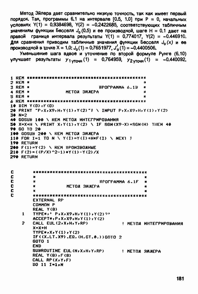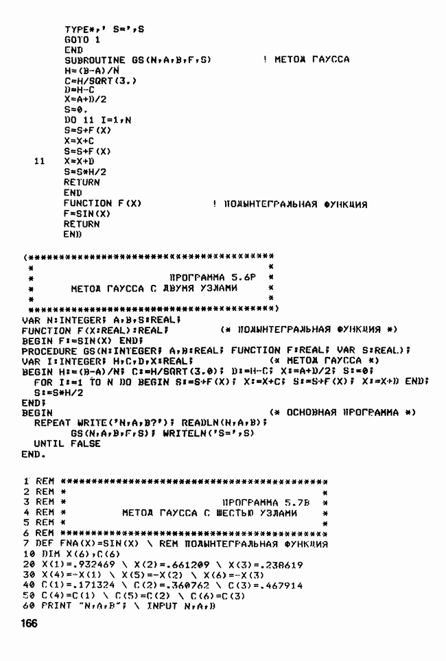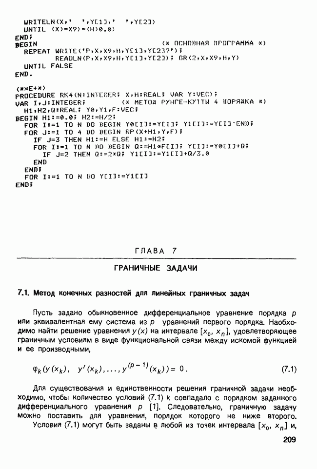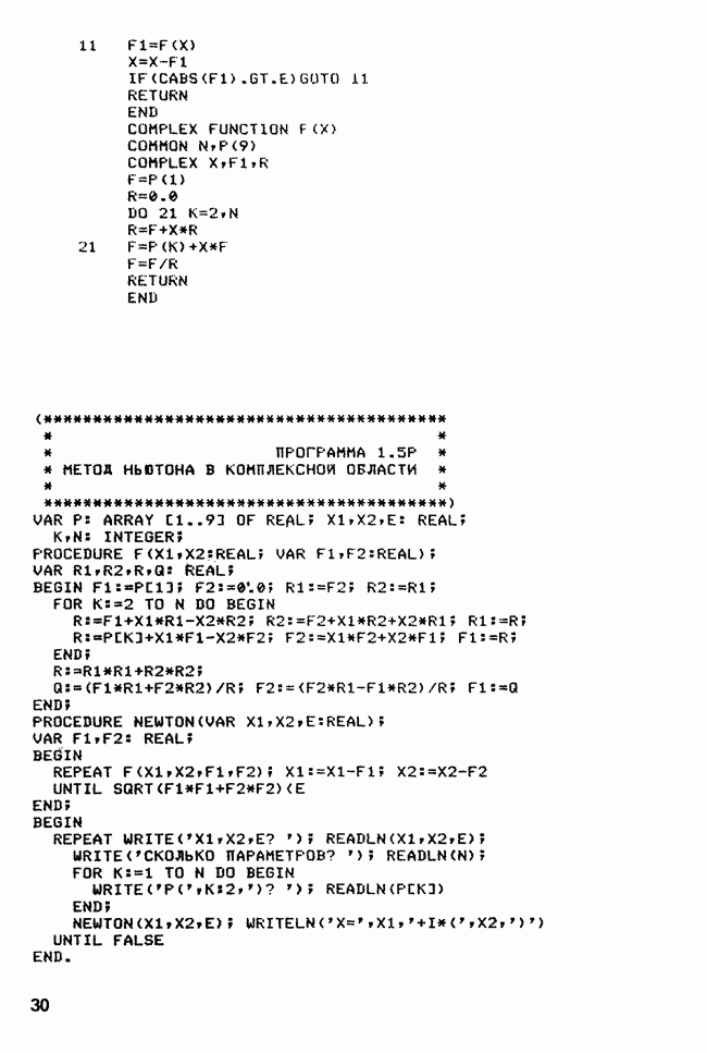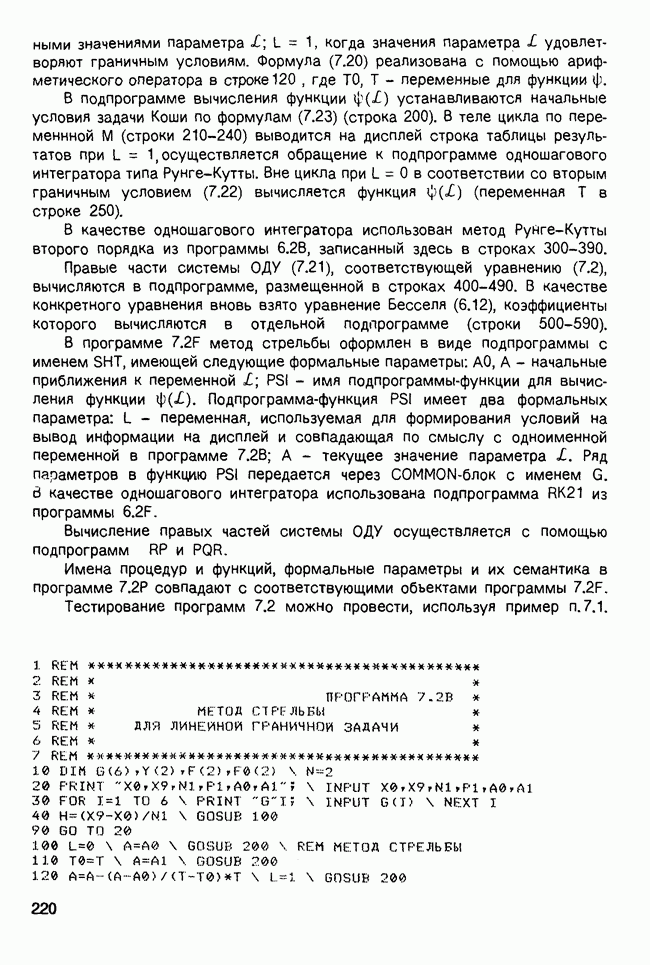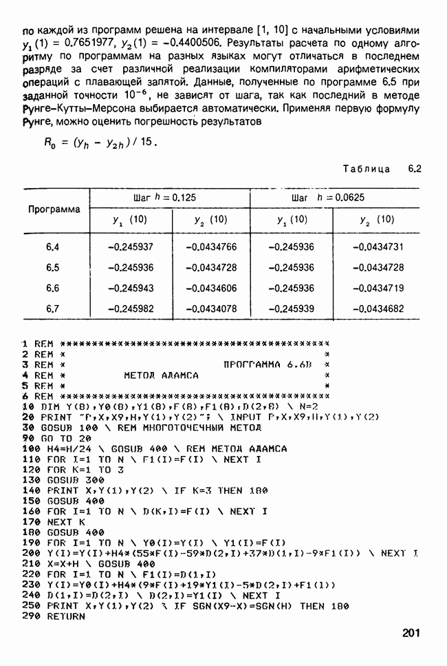 Рис. 4.3. Блок-схема программы обработки данных методом наименьших квадратов с ортогональным базисом В основном блоке программы В блоке 1 (строки 100-190) реализован ввод в диалоговом режиме узлов и значений аппроксимируемой функции. В блоке 2 (строки 200-299) в цикле (строка 200) инициализируются значения полиномов Чебышева младших степеней для каждого узла Причем, чтобы рекуррентную формулу (4.18) применить при Подпрограмма вычисления аппроксимирующей функции (4.20) при аргументе В программах Для тестирования программ 4.4 можно использовать пример (см. скан) (см. скан) (см. скан) (см. скан)
