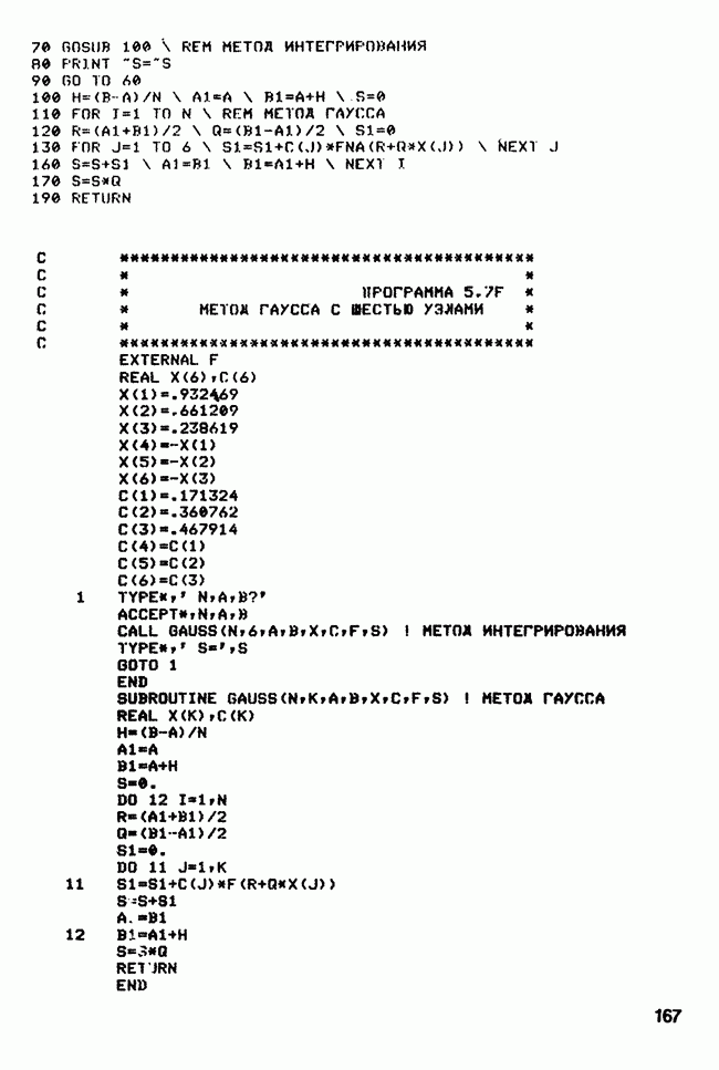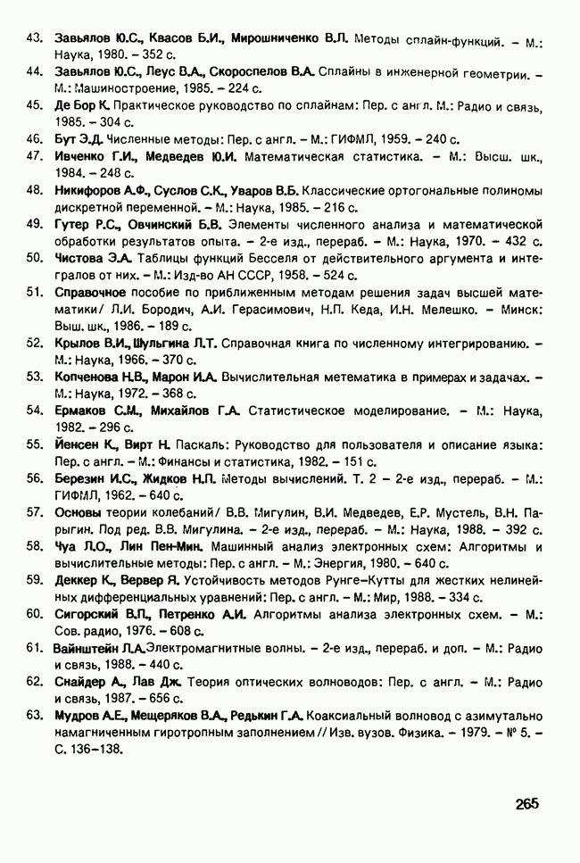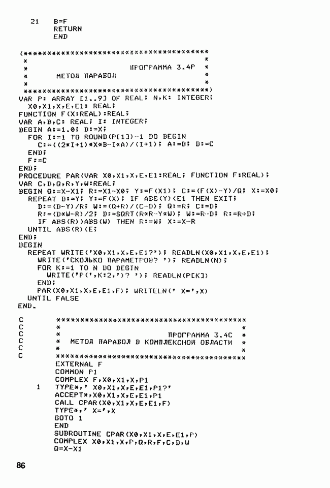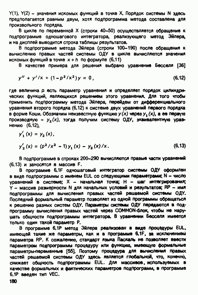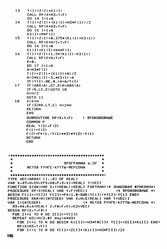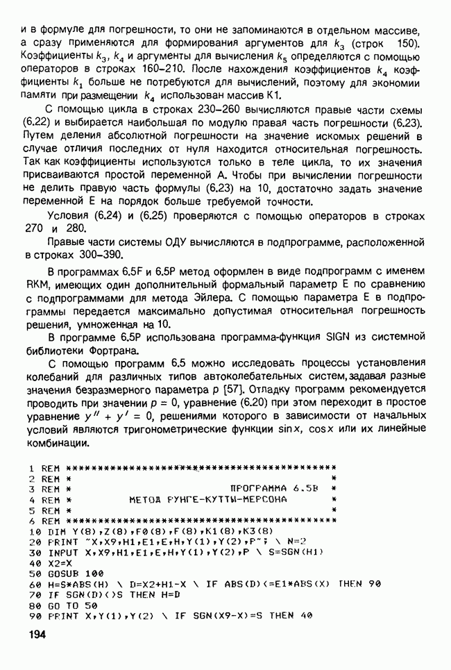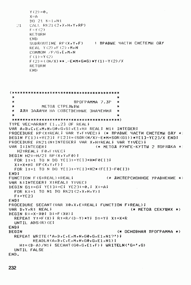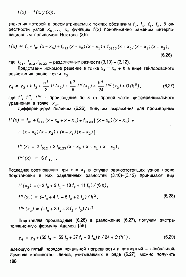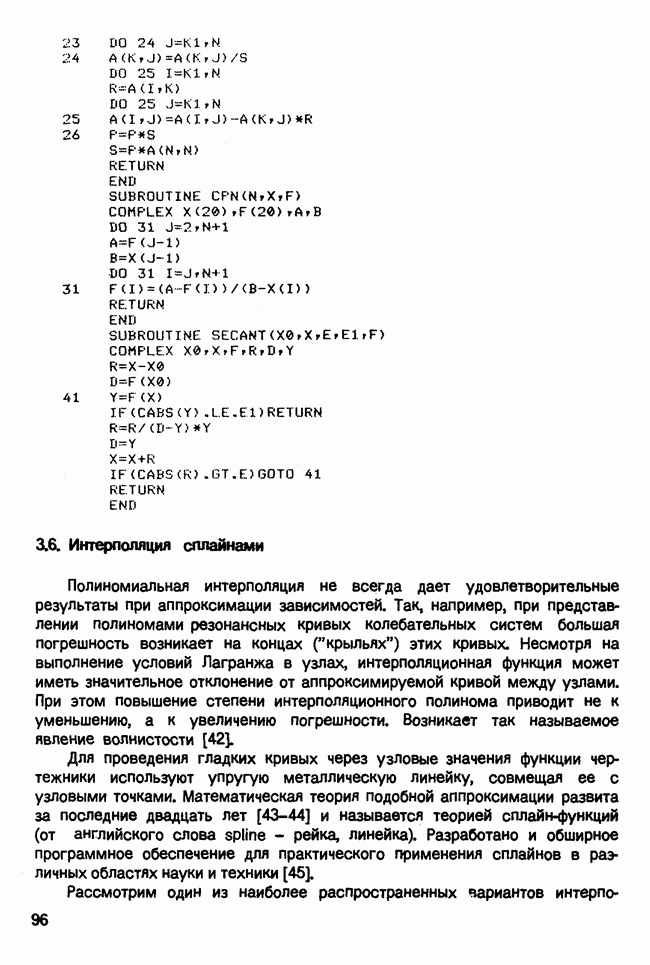 Рис. 4.3. Блок-схема программы обработки данных методом наименьших квадратов с ортогональным базисом В основном блоке программы В блоке 1 (строки 100-190) реализован ввод в диалоговом режиме узлов и значений аппроксимируемой функции. В блоке 2 (строки 200-299) в цикле (строка 200) инициализируются значения полиномов Чебышева младших степеней для каждого узла Причем, чтобы рекуррентную формулу (4.18) применить при Подпрограмма вычисления аппроксимирующей функции (4.20) при аргументе В программах Для тестирования программ 4.4 можно использовать пример (см. скан) (см. скан) (см. скан) (см. скан)