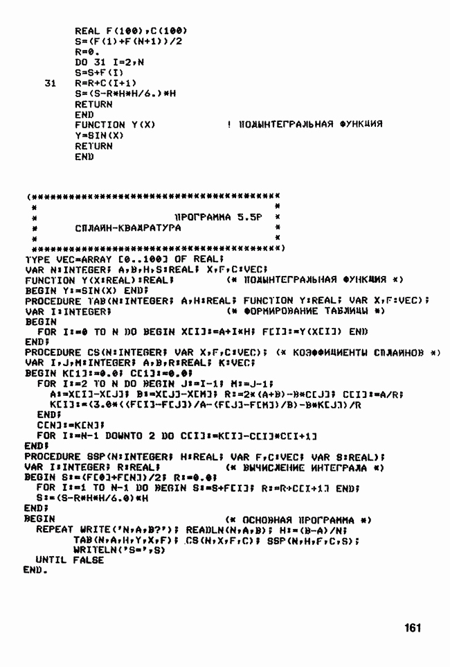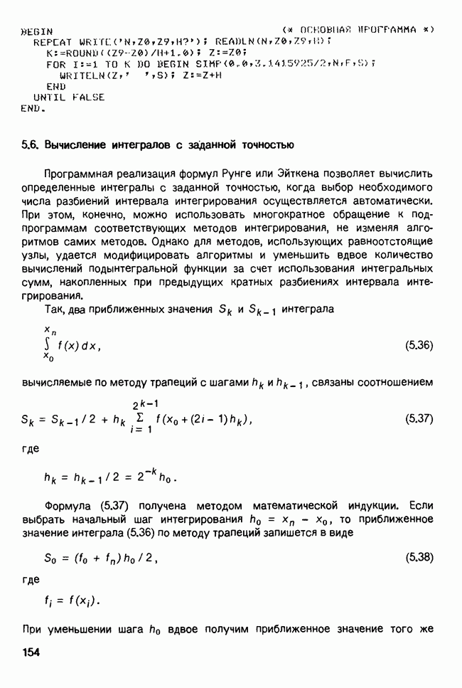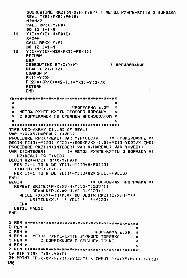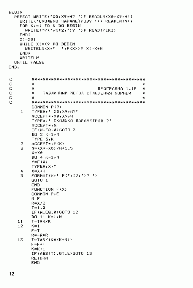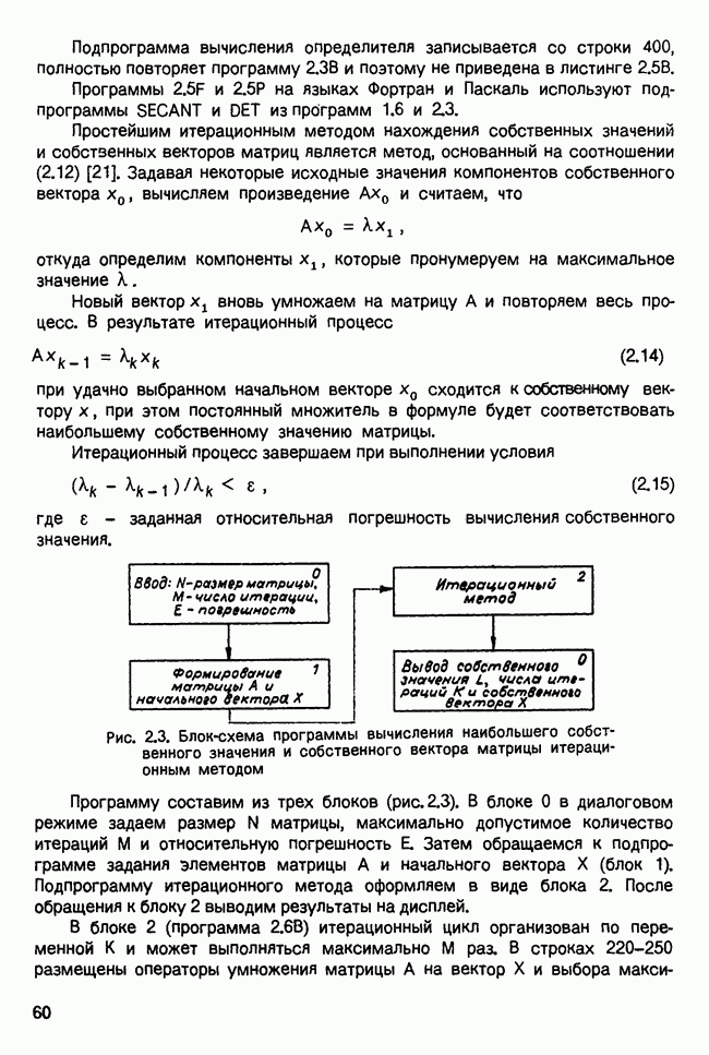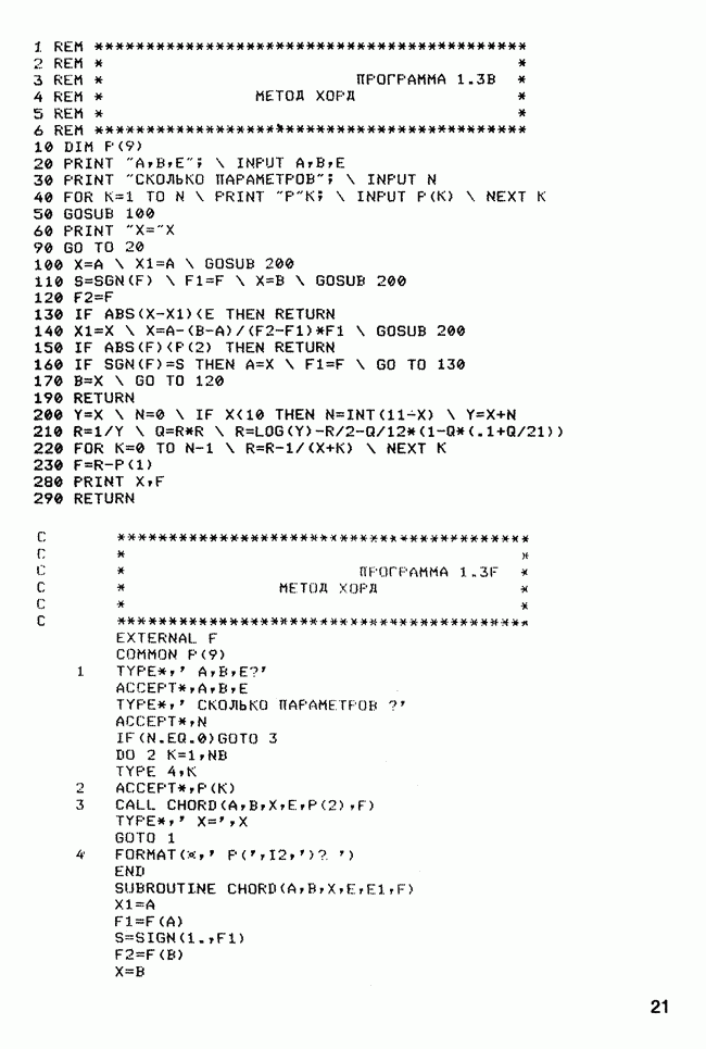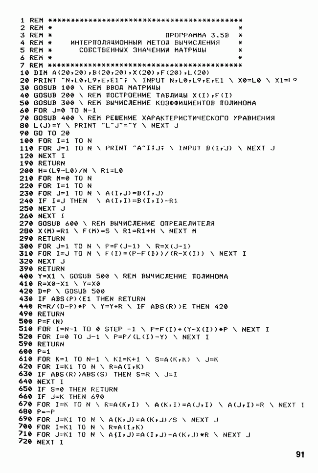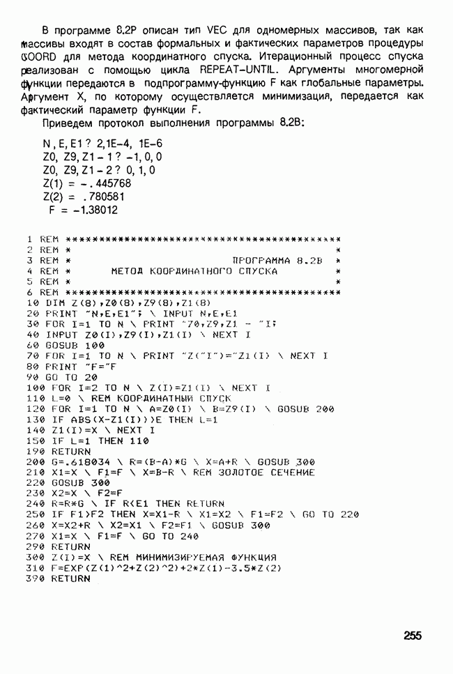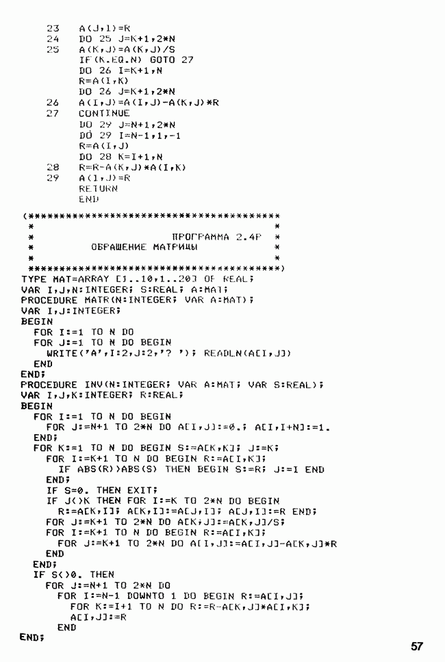 Рис. 4.3. Блок-схема программы обработки данных методом наименьших квадратов с ортогональным базисом В основном блоке программы В блоке 1 (строки 100-190) реализован ввод в диалоговом режиме узлов и значений аппроксимируемой функции. В блоке 2 (строки 200-299) в цикле (строка 200) инициализируются значения полиномов Чебышева младших степеней для каждого узла Причем, чтобы рекуррентную формулу (4.18) применить при Подпрограмма вычисления аппроксимирующей функции (4.20) при аргументе В программах Для тестирования программ 4.4 можно использовать пример (см. скан) (см. скан) (см. скан) (см. скан)