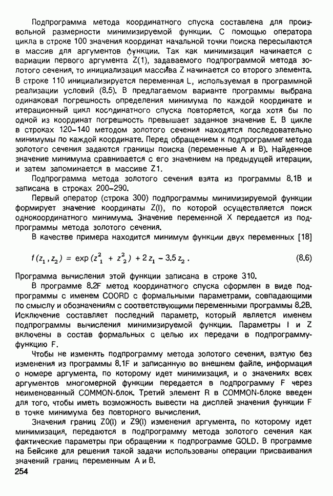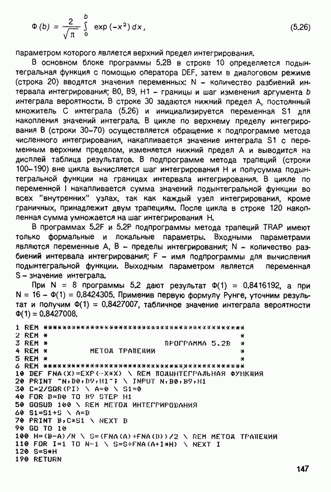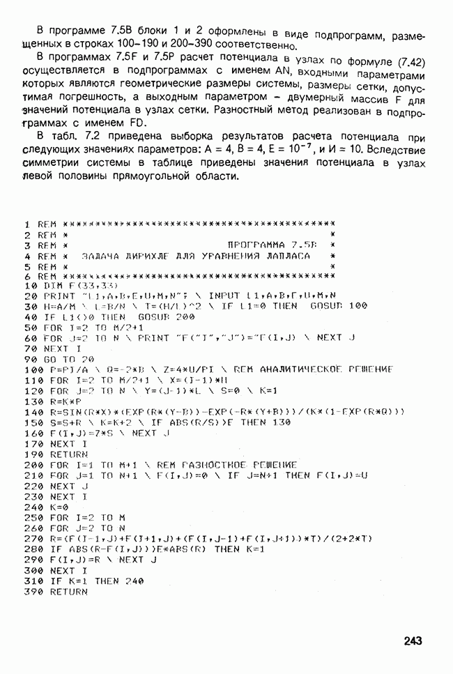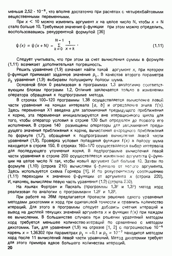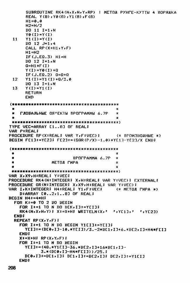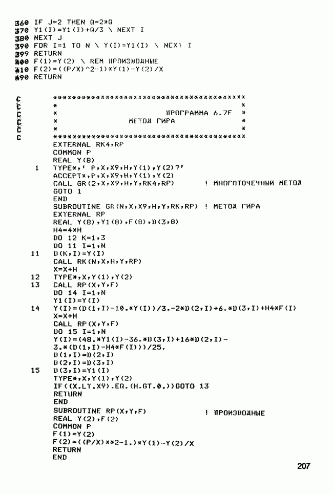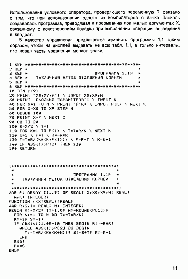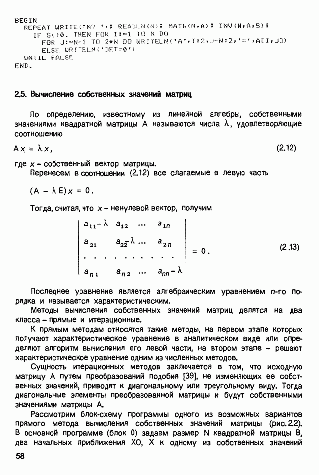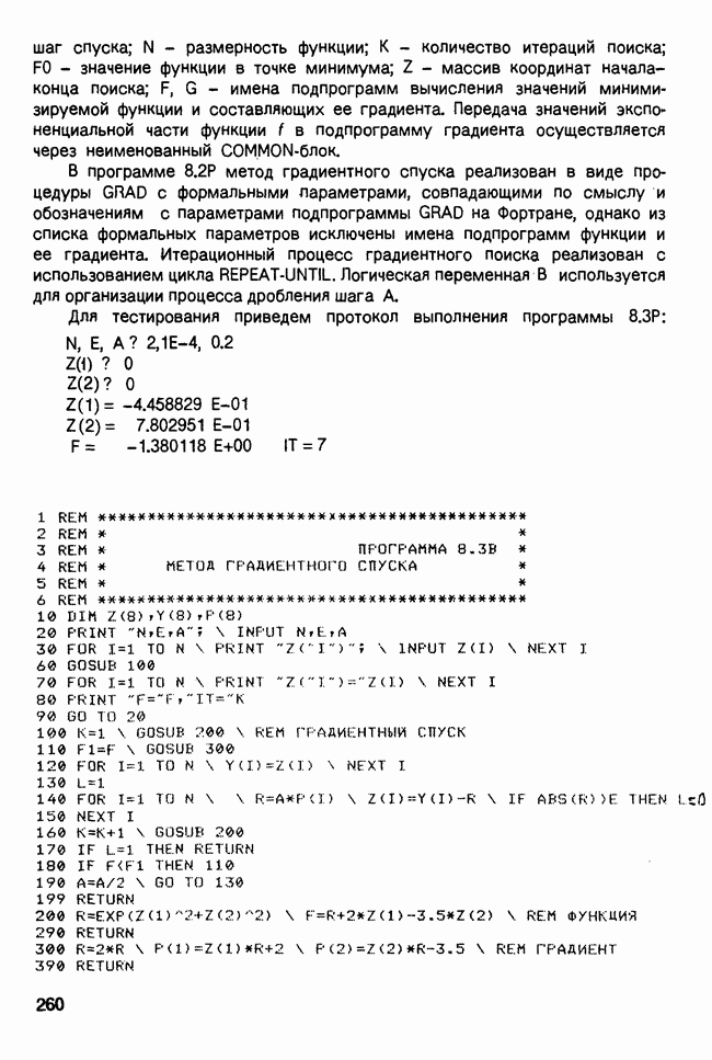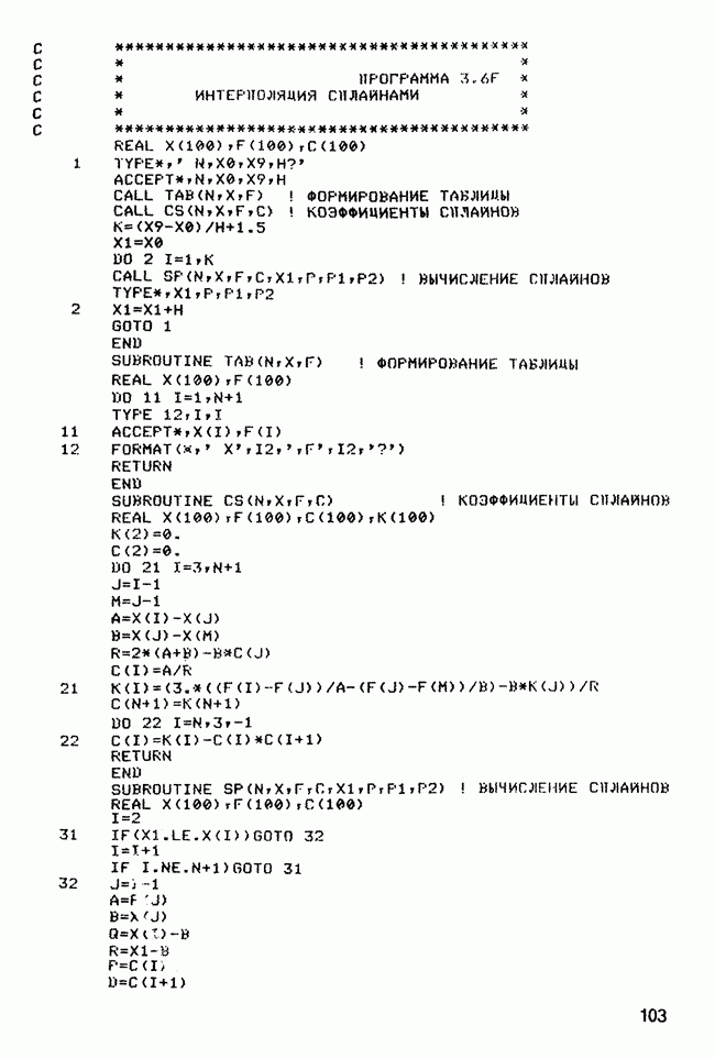 Рис. 4.3. Блок-схема программы обработки данных методом наименьших квадратов с ортогональным базисом В основном блоке программы В блоке 1 (строки 100-190) реализован ввод в диалоговом режиме узлов и значений аппроксимируемой функции. В блоке 2 (строки 200-299) в цикле (строка 200) инициализируются значения полиномов Чебышева младших степеней для каждого узла Причем, чтобы рекуррентную формулу (4.18) применить при Подпрограмма вычисления аппроксимирующей функции (4.20) при аргументе В программах Для тестирования программ 4.4 можно использовать пример (см. скан) (см. скан) (см. скан) (см. скан)