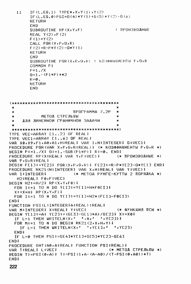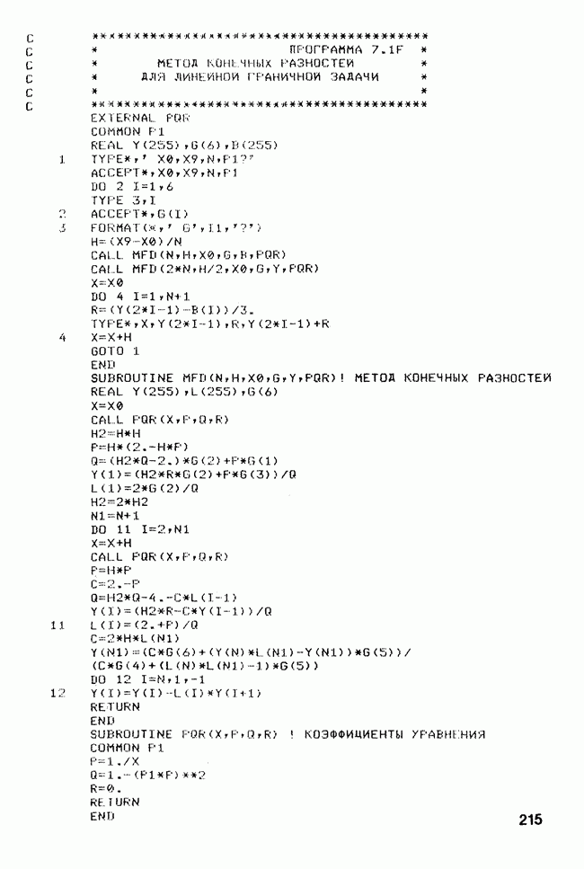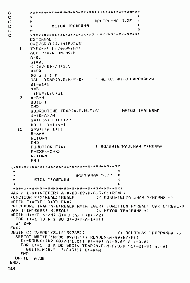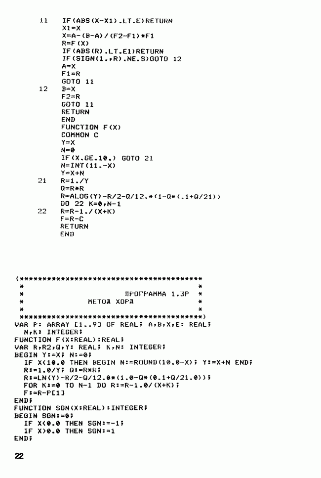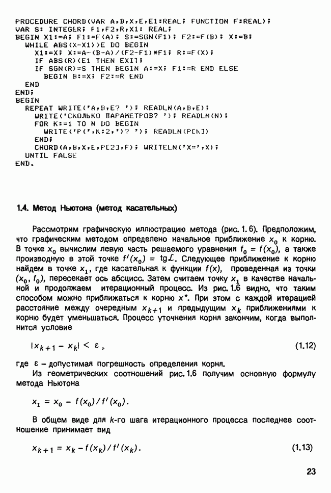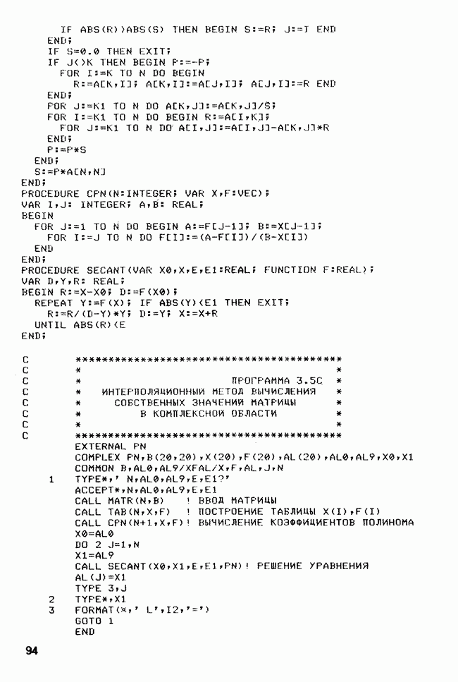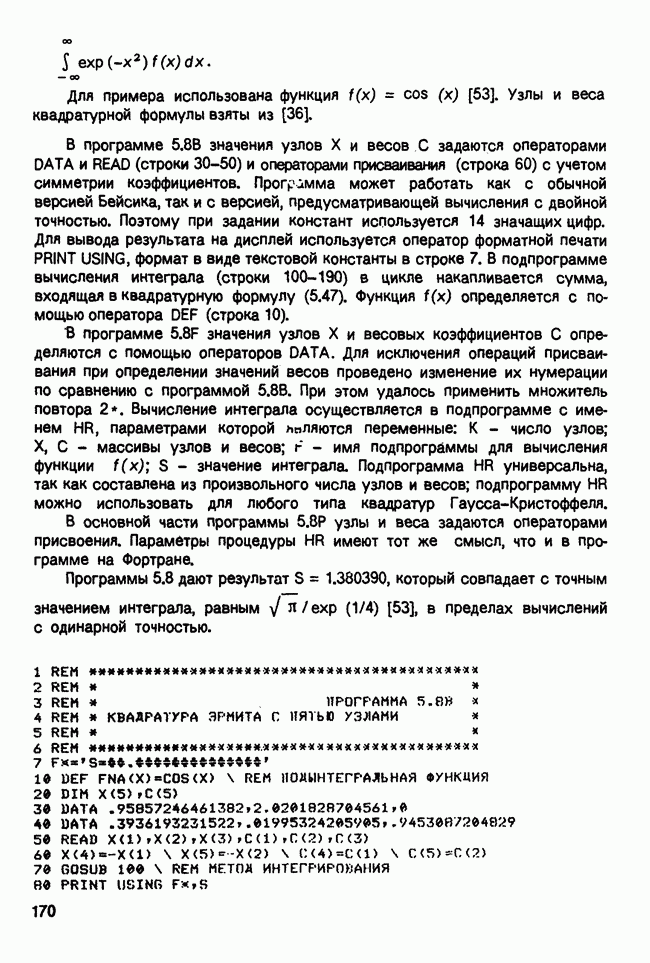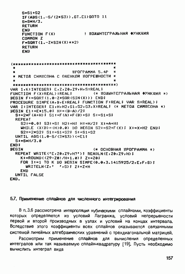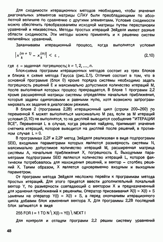 Рис. 4.3. Блок-схема программы обработки данных методом наименьших квадратов с ортогональным базисом В основном блоке программы В блоке 1 (строки 100-190) реализован ввод в диалоговом режиме узлов и значений аппроксимируемой функции. В блоке 2 (строки 200-299) в цикле (строка 200) инициализируются значения полиномов Чебышева младших степеней для каждого узла Причем, чтобы рекуррентную формулу (4.18) применить при Подпрограмма вычисления аппроксимирующей функции (4.20) при аргументе В программах Для тестирования программ 4.4 можно использовать пример (см. скан) (см. скан) (см. скан) (см. скан)