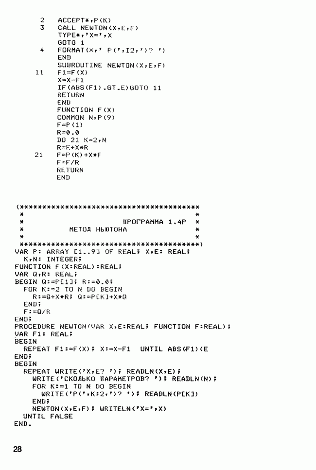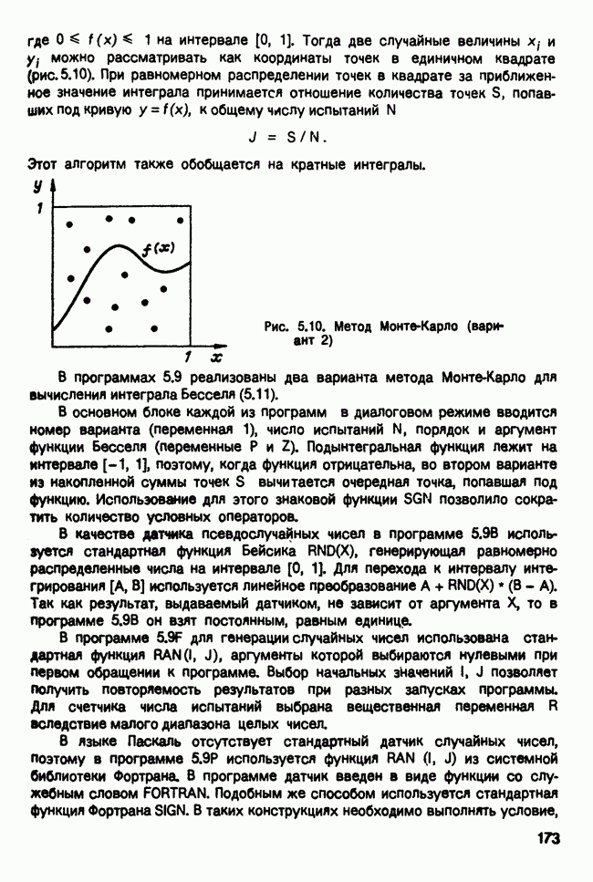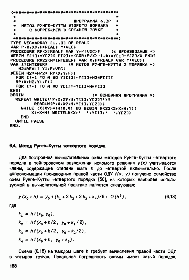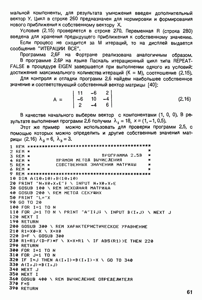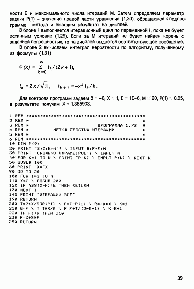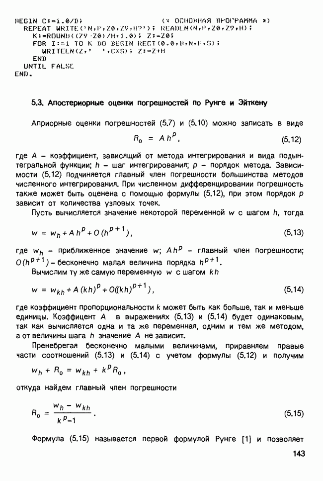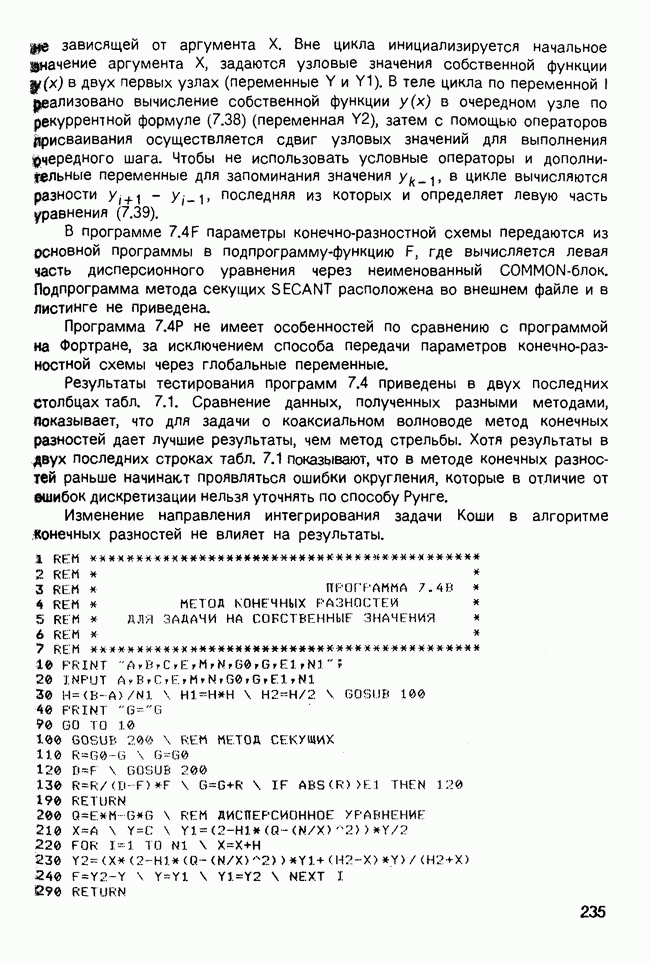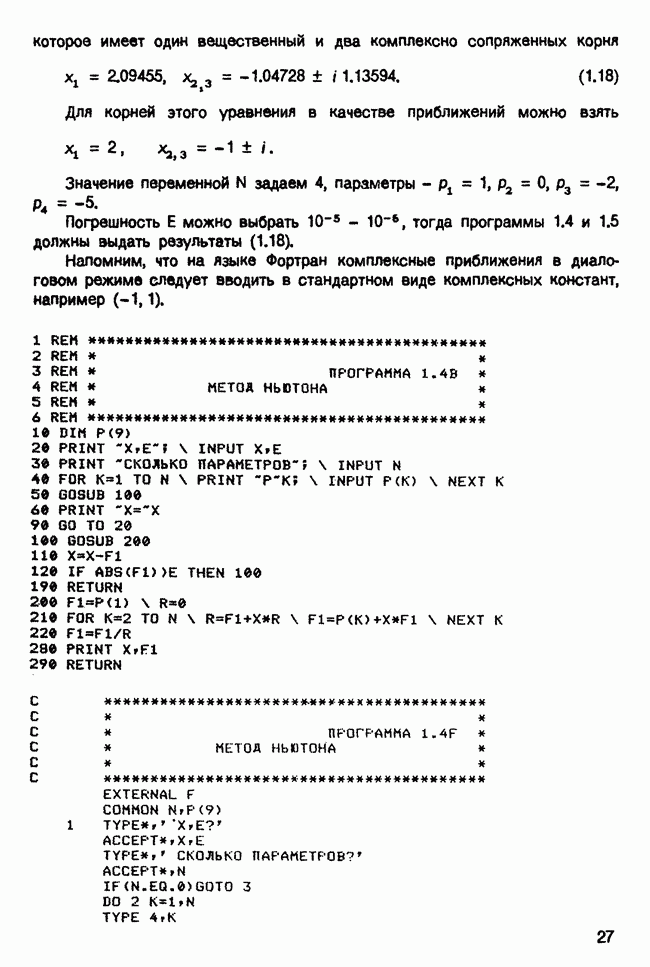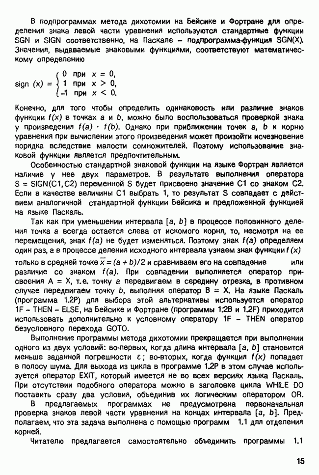 Рис. 4.3. Блок-схема программы обработки данных методом наименьших квадратов с ортогональным базисом В основном блоке программы В блоке 1 (строки 100-190) реализован ввод в диалоговом режиме узлов и значений аппроксимируемой функции. В блоке 2 (строки 200-299) в цикле (строка 200) инициализируются значения полиномов Чебышева младших степеней для каждого узла Причем, чтобы рекуррентную формулу (4.18) применить при Подпрограмма вычисления аппроксимирующей функции (4.20) при аргументе В программах Для тестирования программ 4.4 можно использовать пример (см. скан) (см. скан) (см. скан) (см. скан)