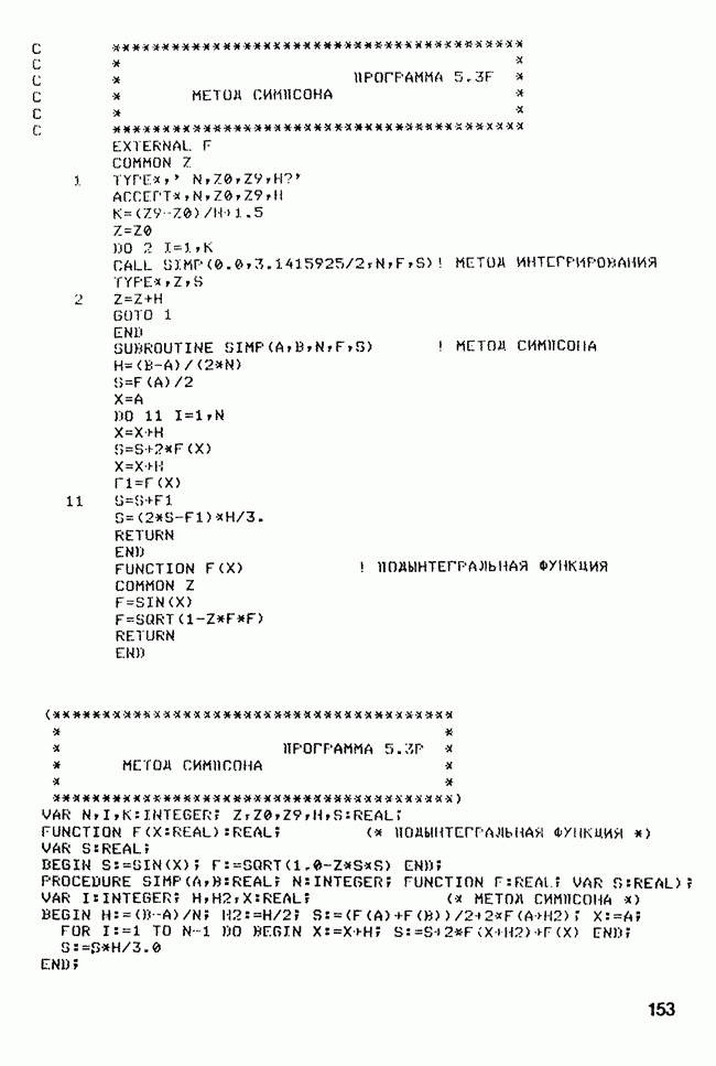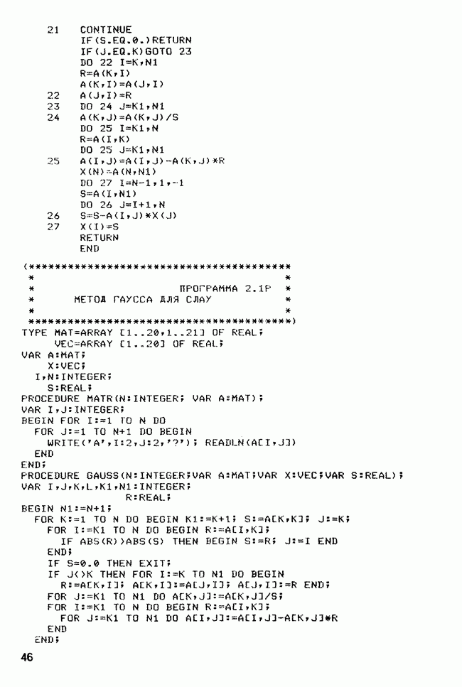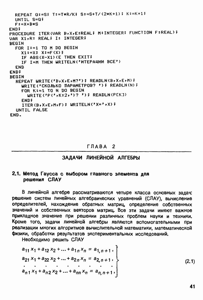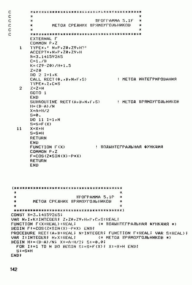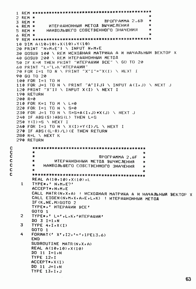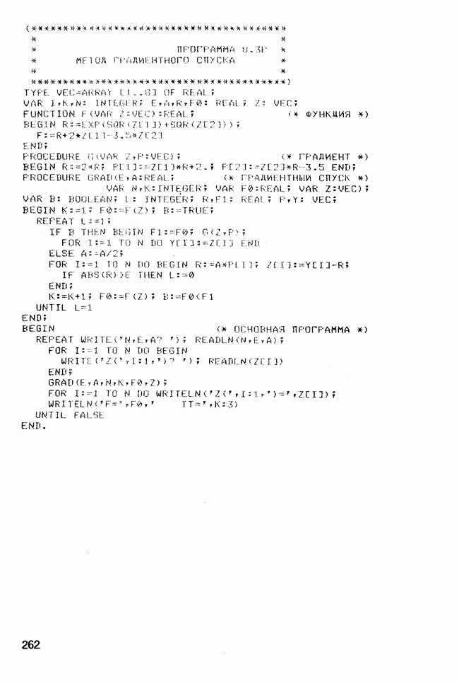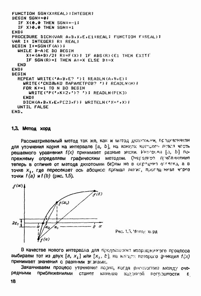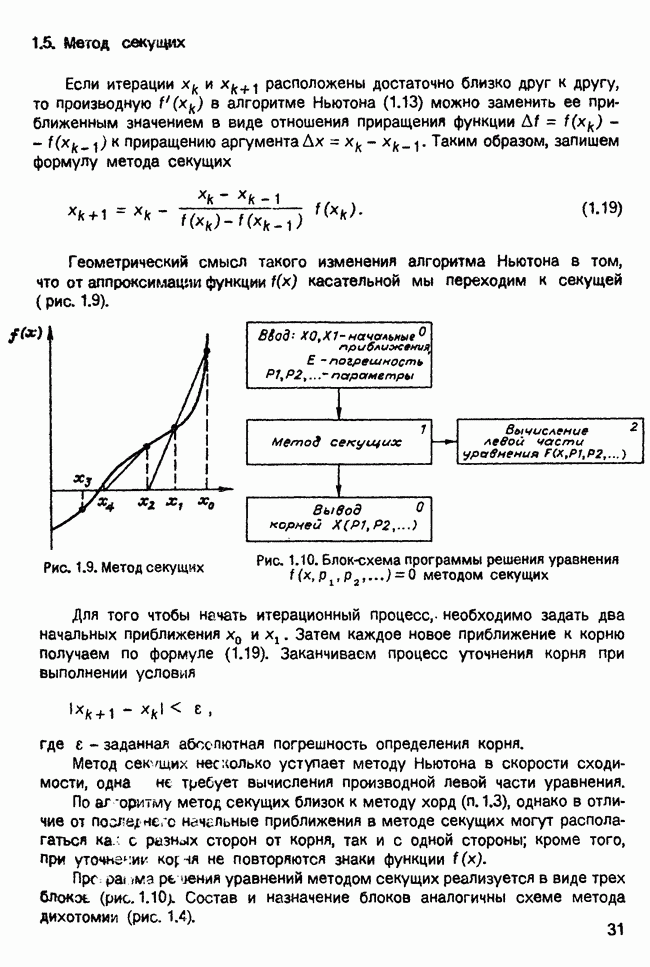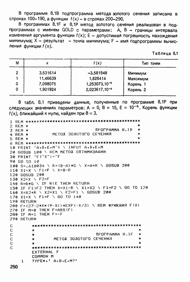Рис. 4.3. Блок-схема программы обработки данных методом наименьших квадратов с ортогональным базисом В основном блоке программы В блоке 1 (строки 100-190) реализован ввод в диалоговом режиме узлов и значений аппроксимируемой функции. В блоке 2 (строки 200-299) в цикле (строка 200) инициализируются значения полиномов Чебышева младших степеней для каждого узла Причем, чтобы рекуррентную формулу (4.18) применить при Подпрограмма вычисления аппроксимирующей функции (4.20) при аргументе В программах Для тестирования программ 4.4 можно использовать пример (см. скан) (см. скан) (см. скан) (см. скан)