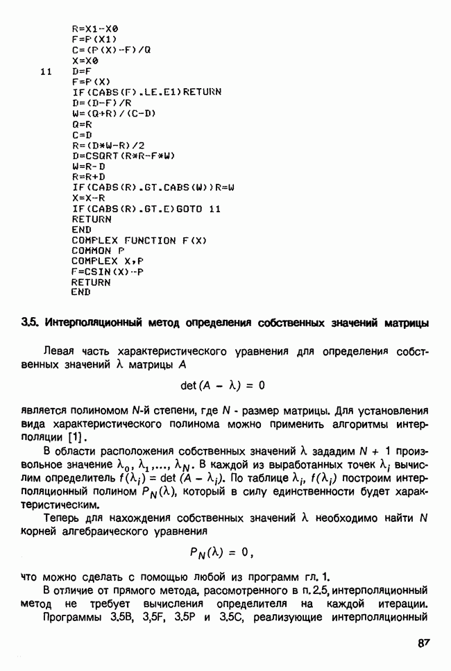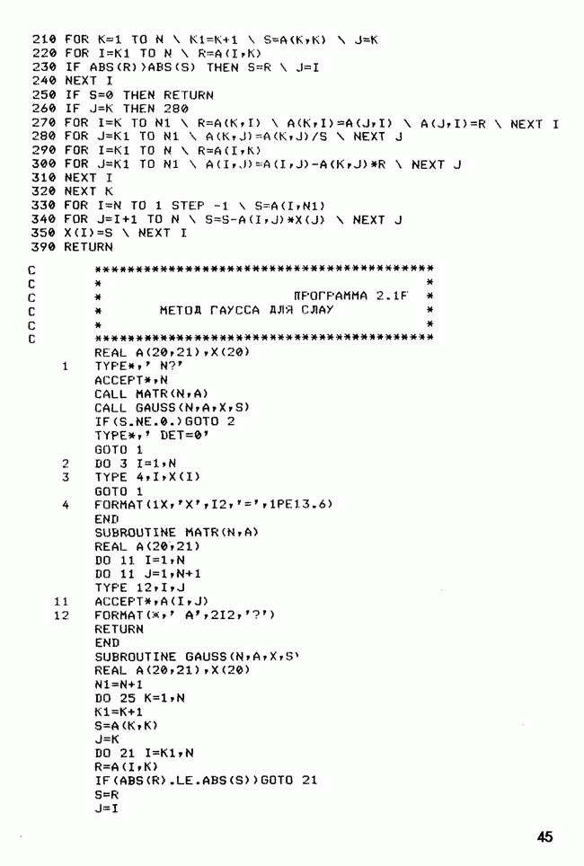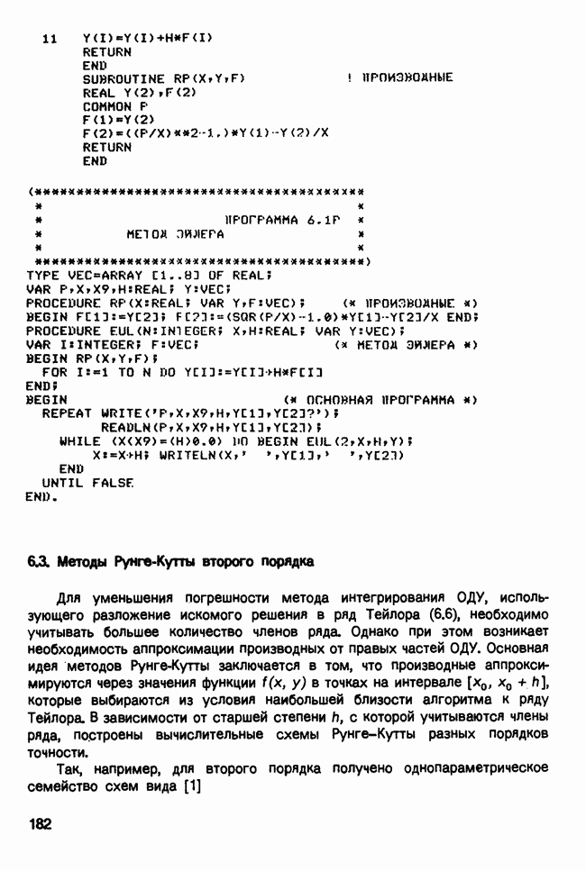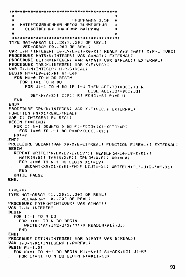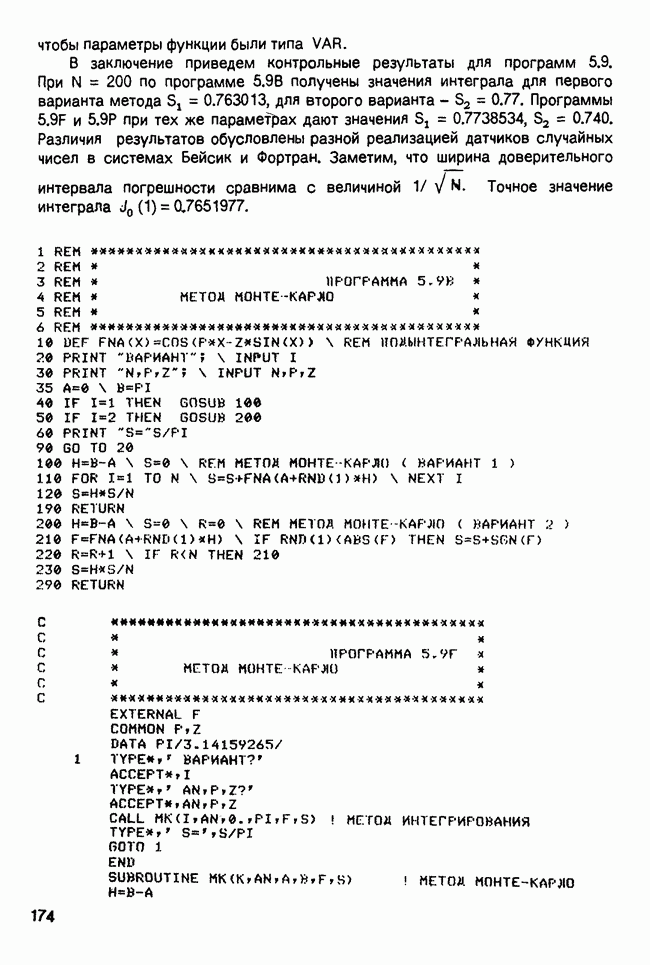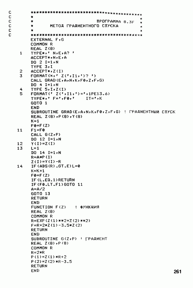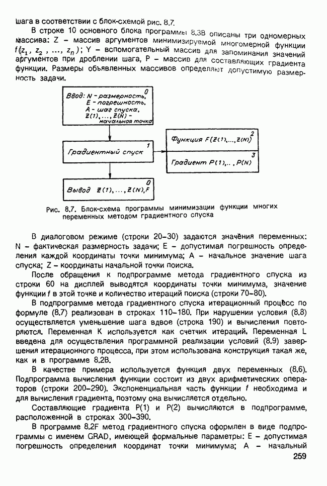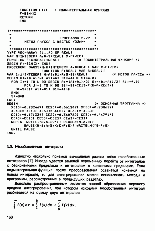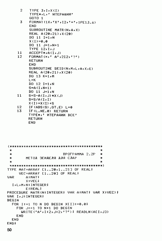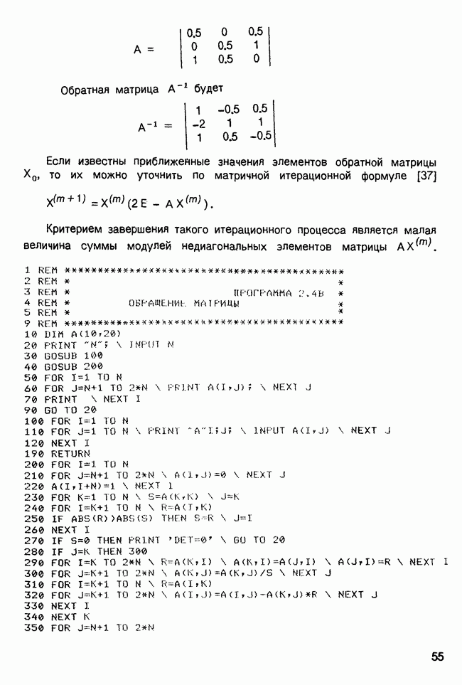 Рис. 4.3. Блок-схема программы обработки данных методом наименьших квадратов с ортогональным базисом В основном блоке программы В блоке 1 (строки 100-190) реализован ввод в диалоговом режиме узлов и значений аппроксимируемой функции. В блоке 2 (строки 200-299) в цикле (строка 200) инициализируются значения полиномов Чебышева младших степеней для каждого узла Причем, чтобы рекуррентную формулу (4.18) применить при Подпрограмма вычисления аппроксимирующей функции (4.20) при аргументе В программах Для тестирования программ 4.4 можно использовать пример (см. скан) (см. скан) (см. скан) (см. скан)