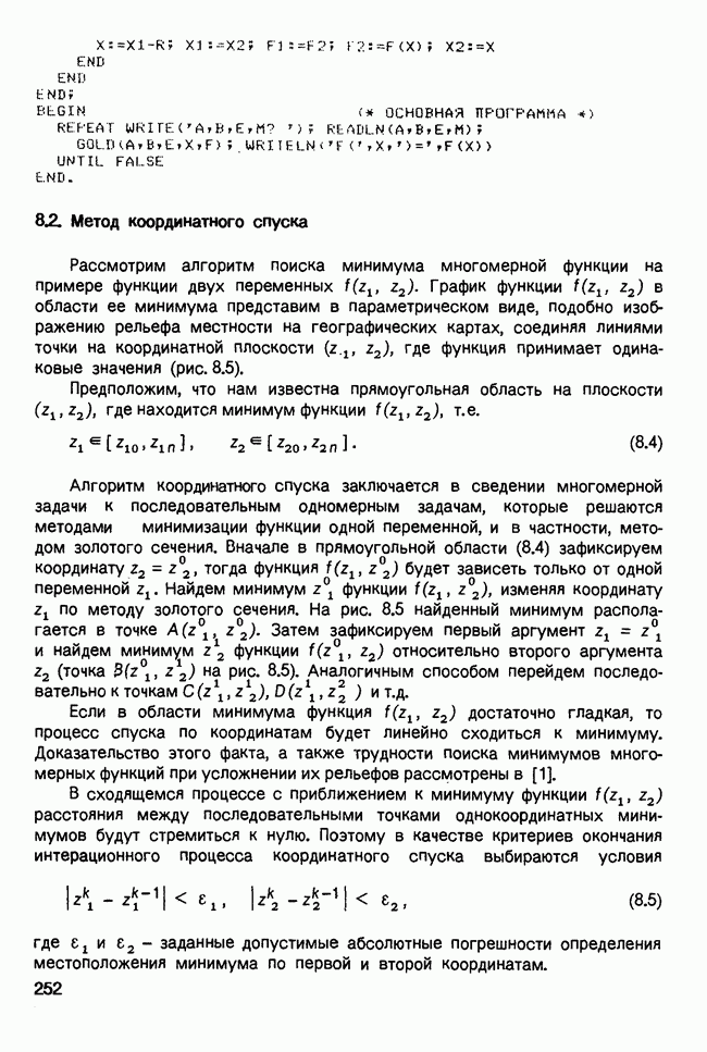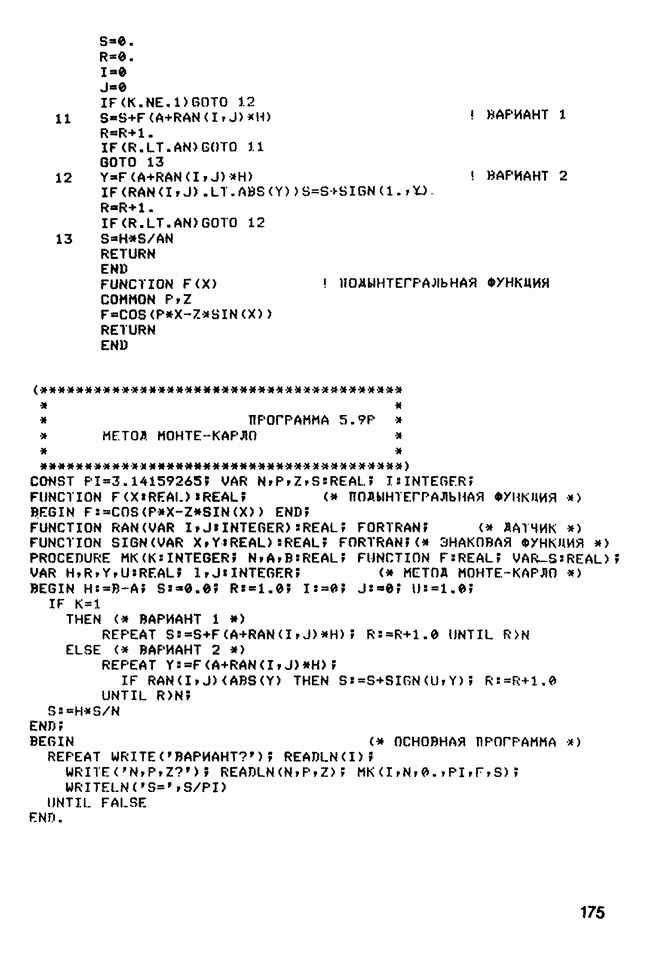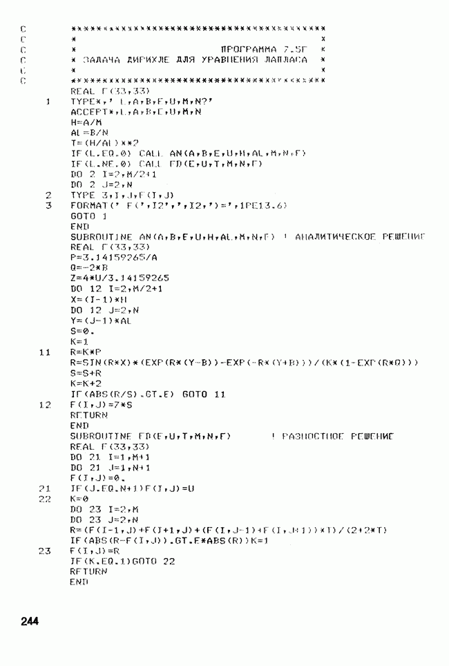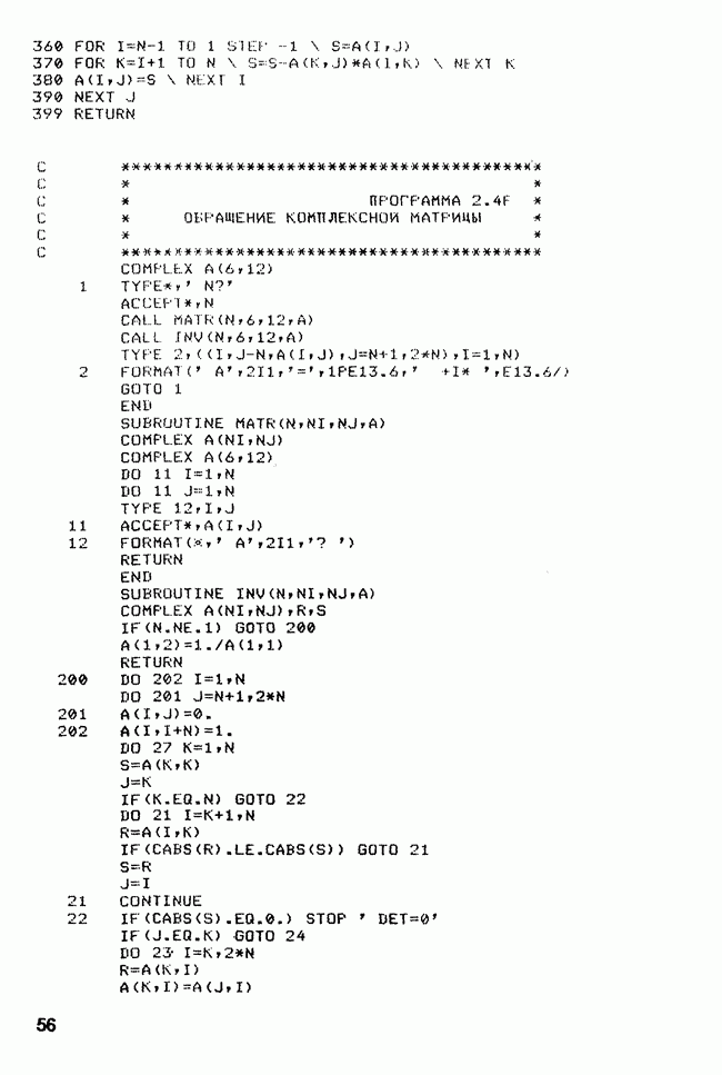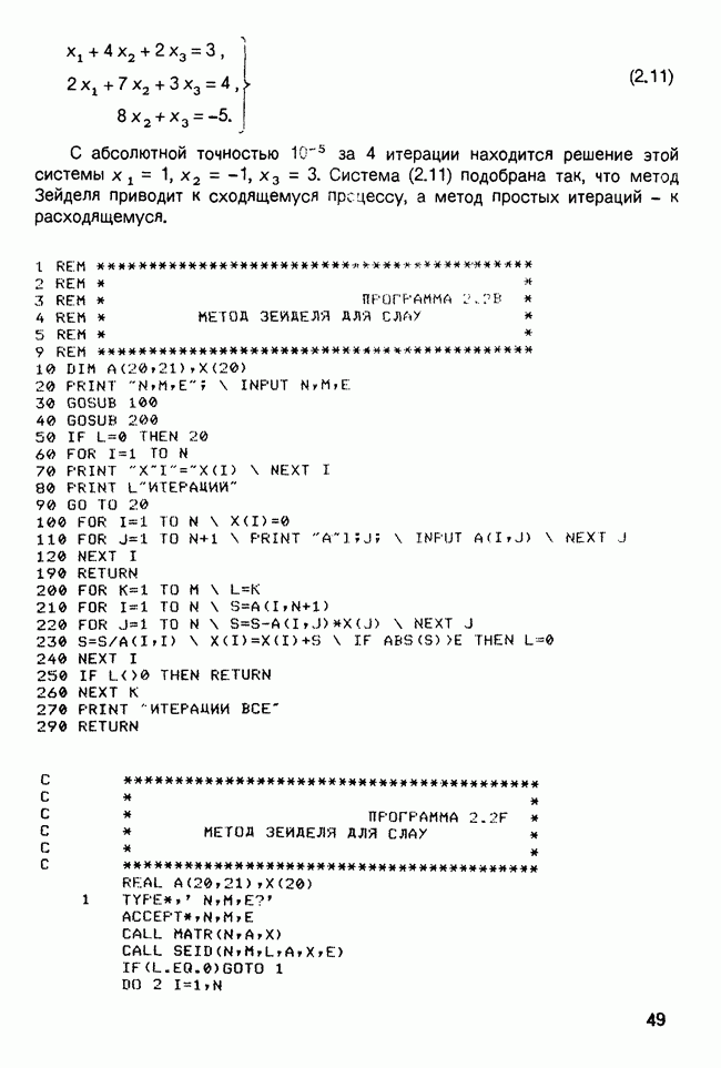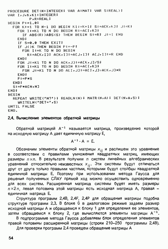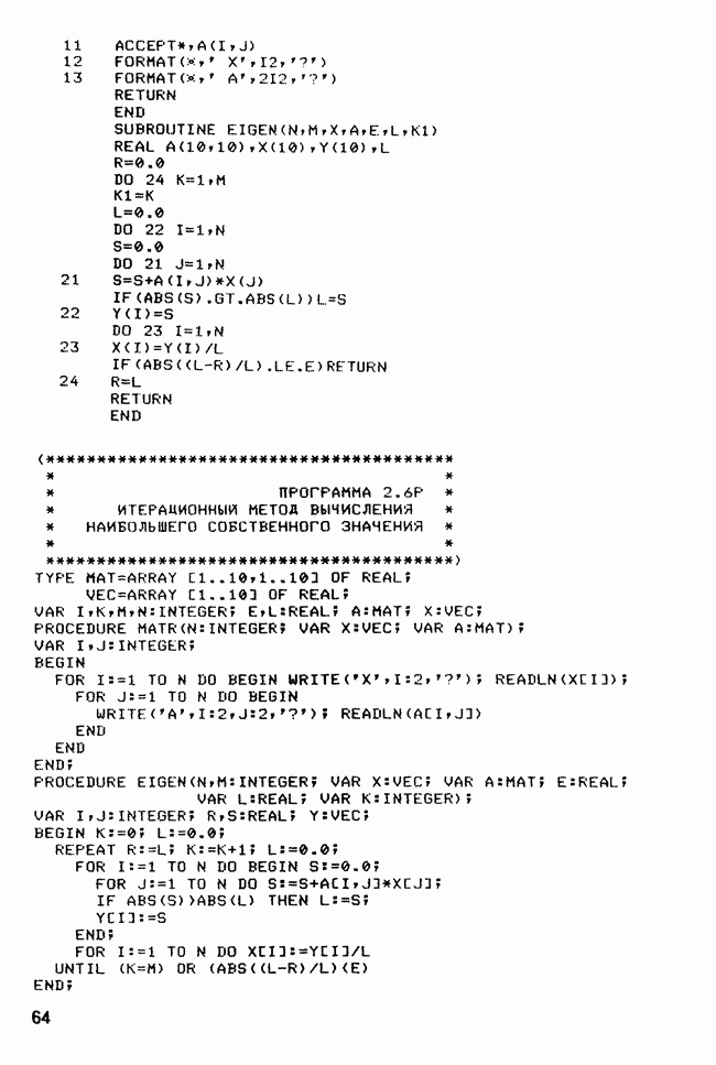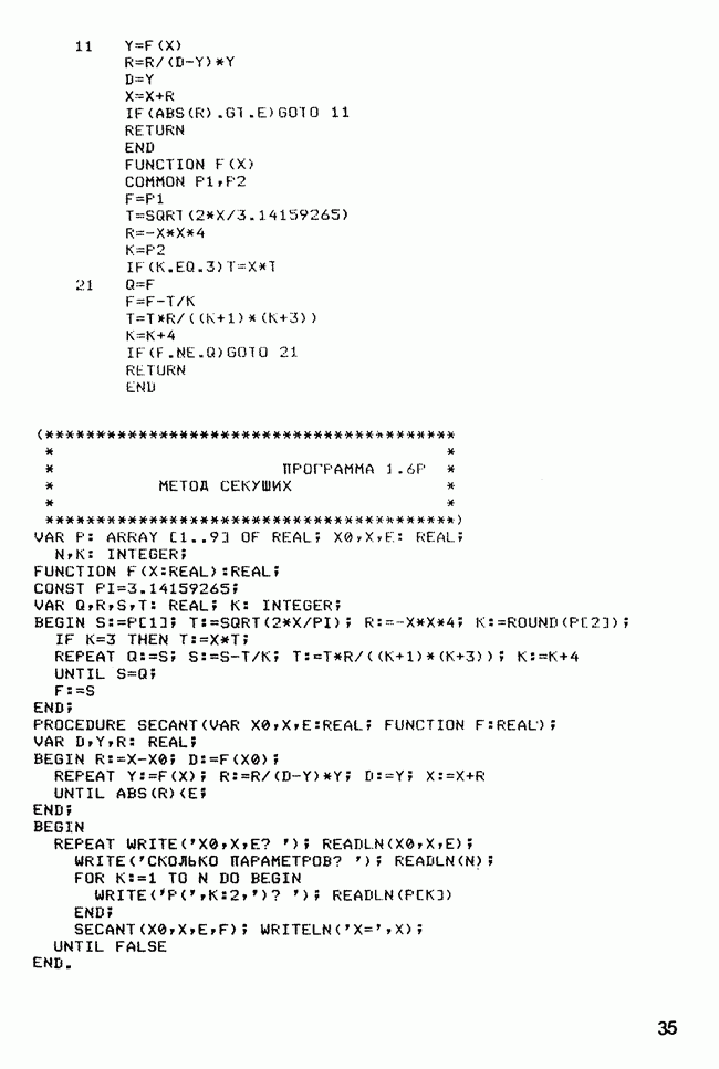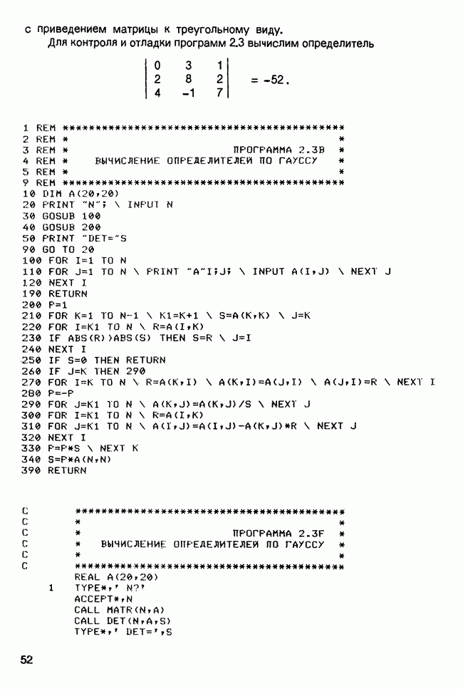 Рис. 4.3. Блок-схема программы обработки данных методом наименьших квадратов с ортогональным базисом В основном блоке программы В блоке 1 (строки 100-190) реализован ввод в диалоговом режиме узлов и значений аппроксимируемой функции. В блоке 2 (строки 200-299) в цикле (строка 200) инициализируются значения полиномов Чебышева младших степеней для каждого узла Причем, чтобы рекуррентную формулу (4.18) применить при Подпрограмма вычисления аппроксимирующей функции (4.20) при аргументе В программах Для тестирования программ 4.4 можно использовать пример (см. скан) (см. скан) (см. скан) (см. скан)