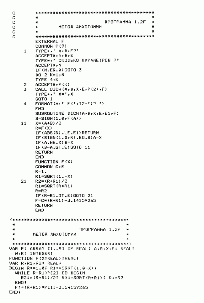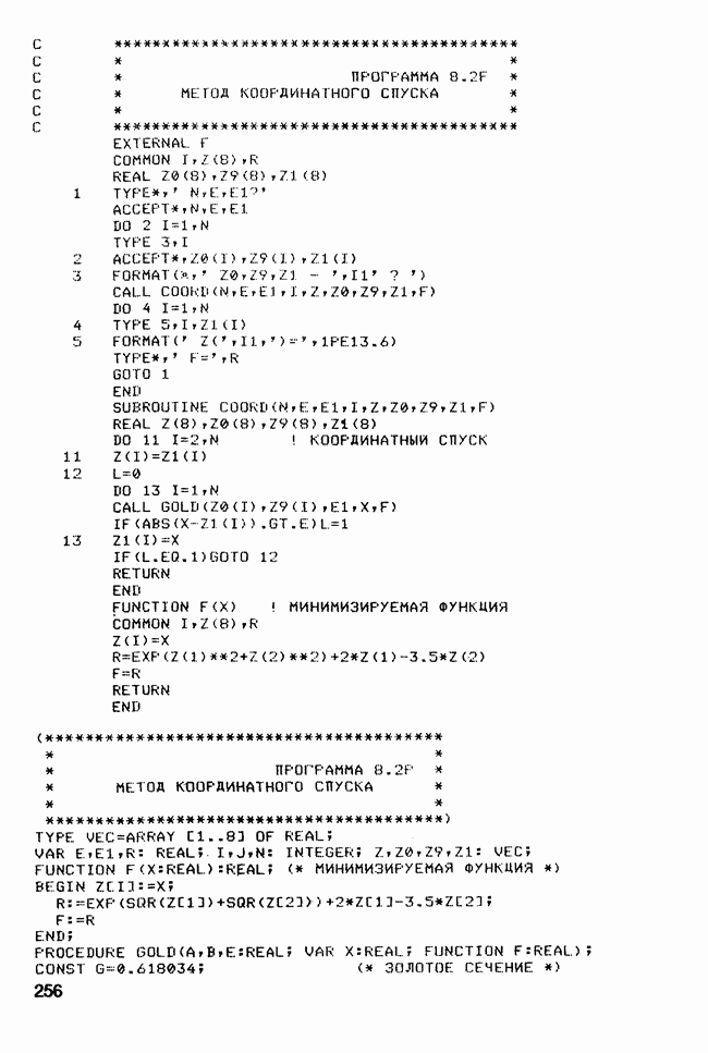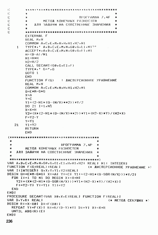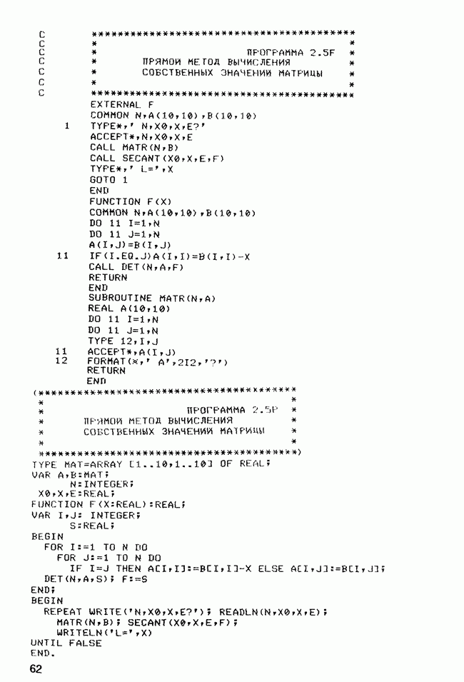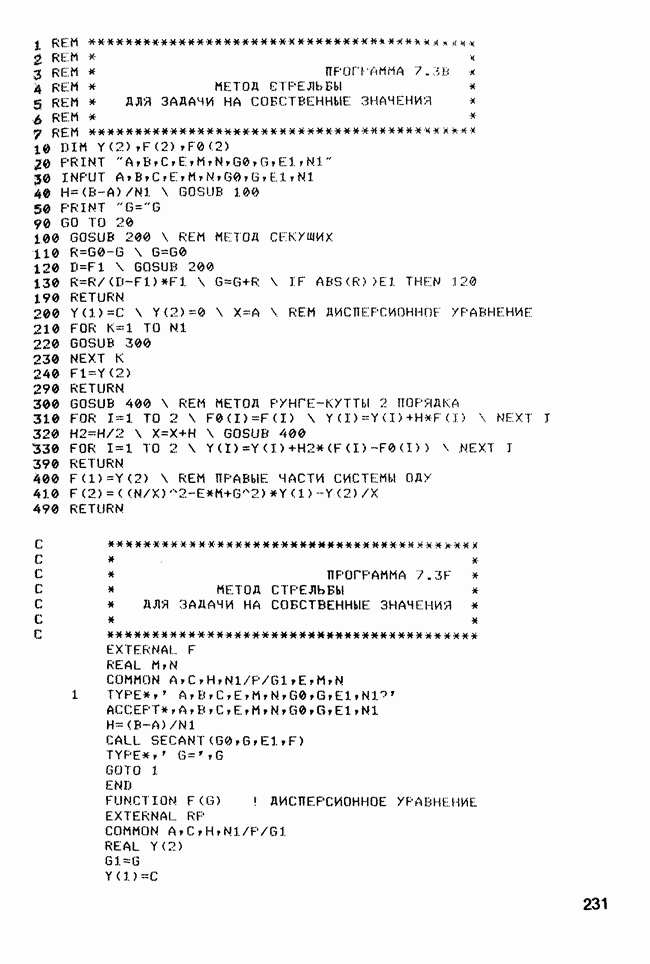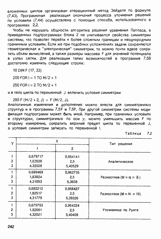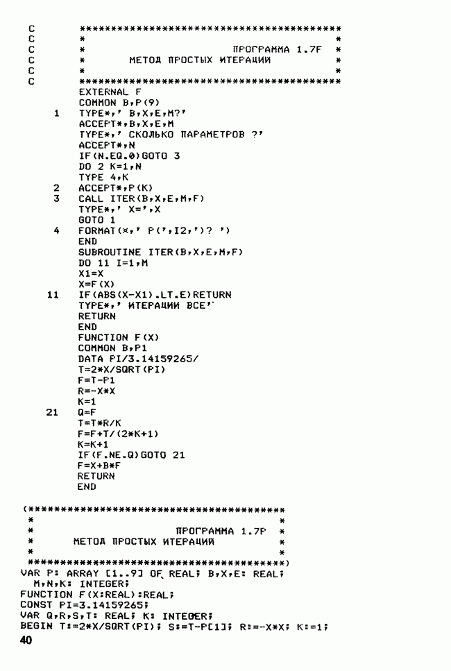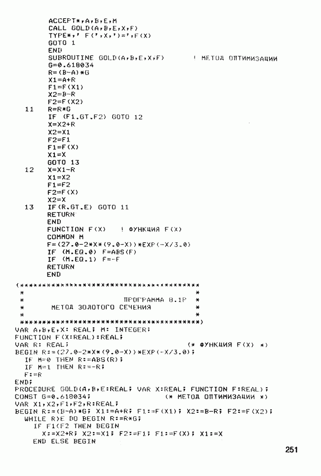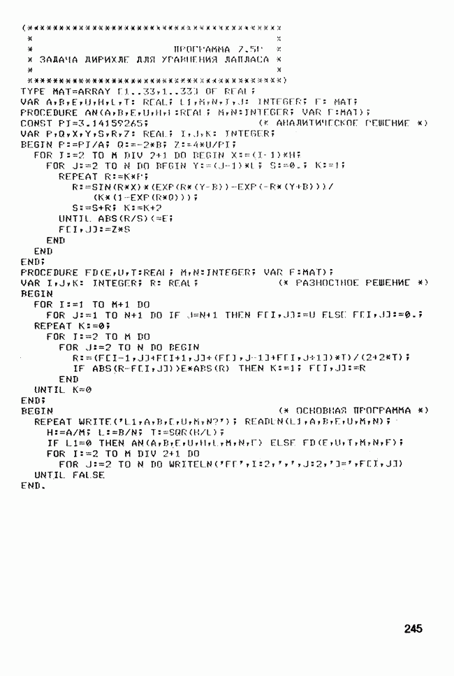 Рис. 4.3. Блок-схема программы обработки данных методом наименьших квадратов с ортогональным базисом В основном блоке программы В блоке 1 (строки 100-190) реализован ввод в диалоговом режиме узлов и значений аппроксимируемой функции. В блоке 2 (строки 200-299) в цикле (строка 200) инициализируются значения полиномов Чебышева младших степеней для каждого узла Причем, чтобы рекуррентную формулу (4.18) применить при Подпрограмма вычисления аппроксимирующей функции (4.20) при аргументе В программах Для тестирования программ 4.4 можно использовать пример (см. скан) (см. скан) (см. скан) (см. скан)