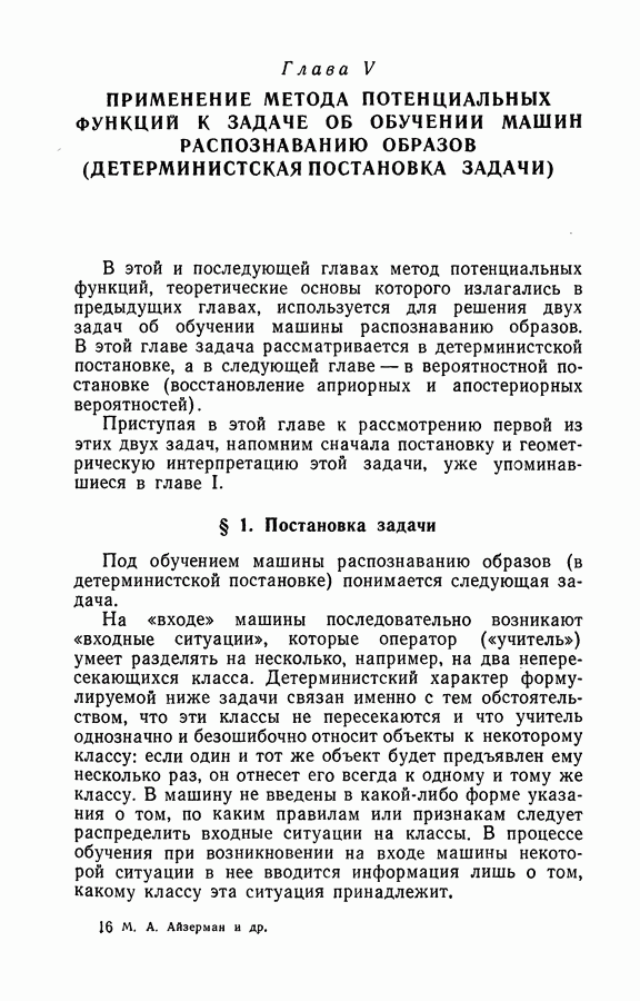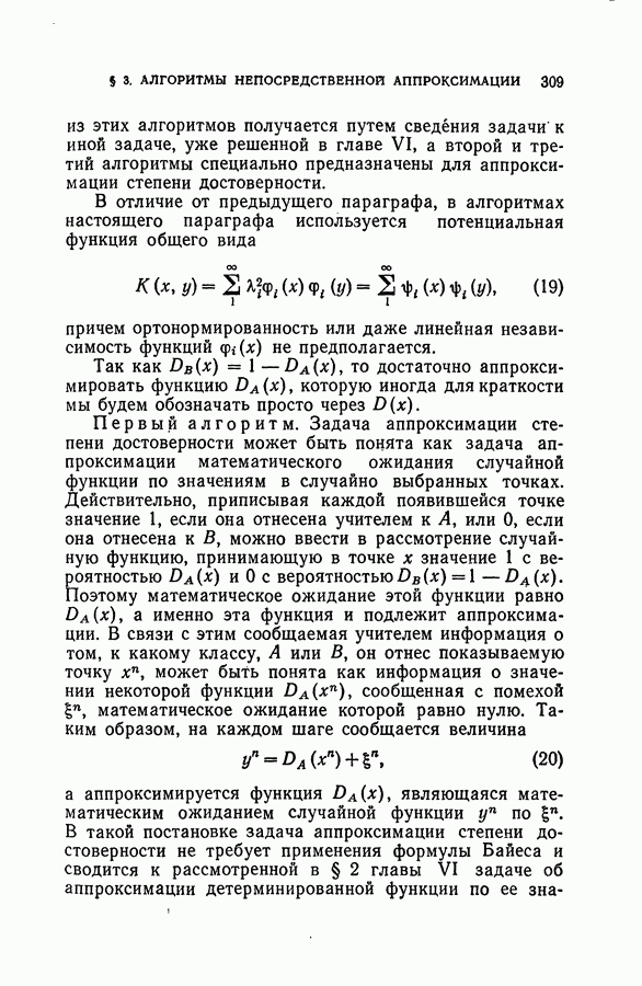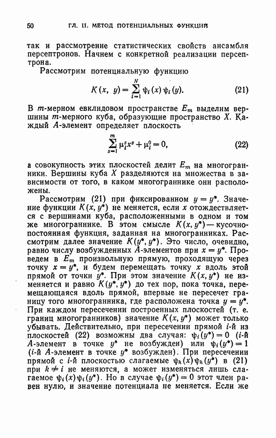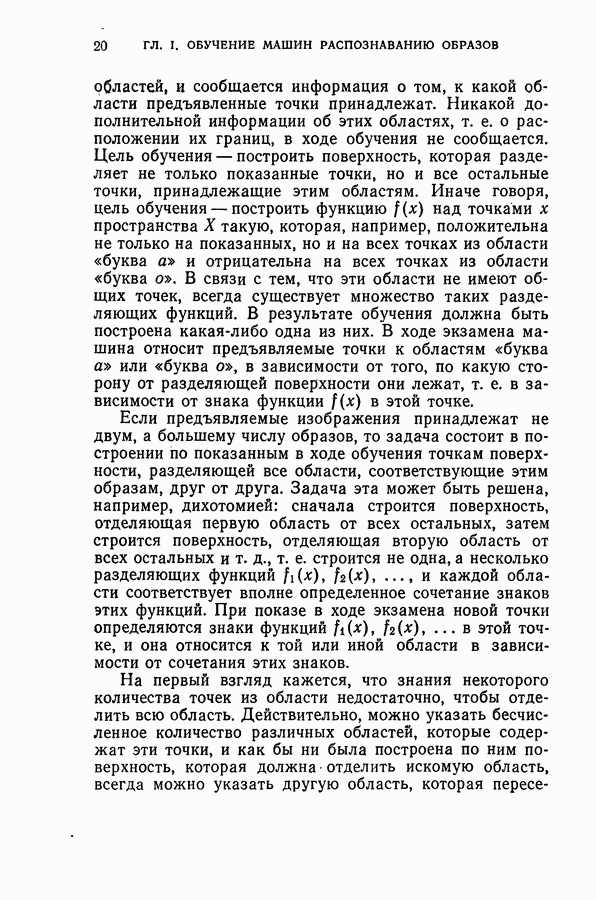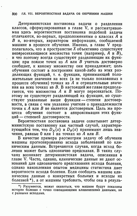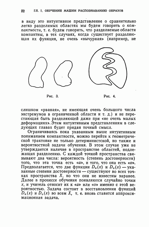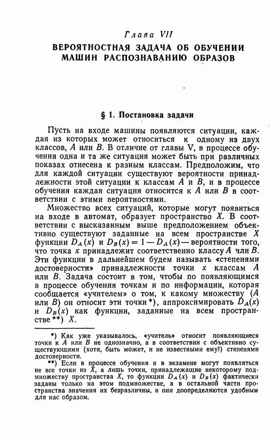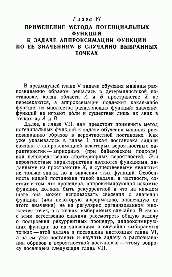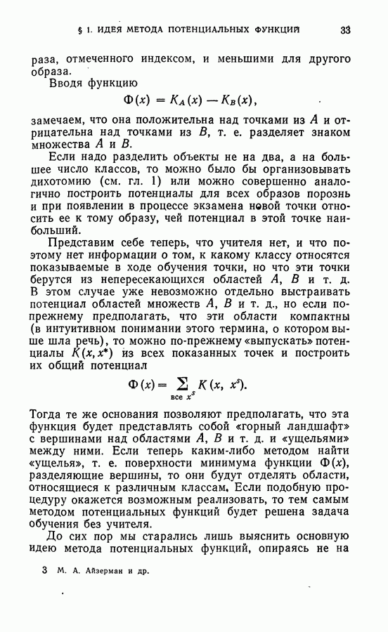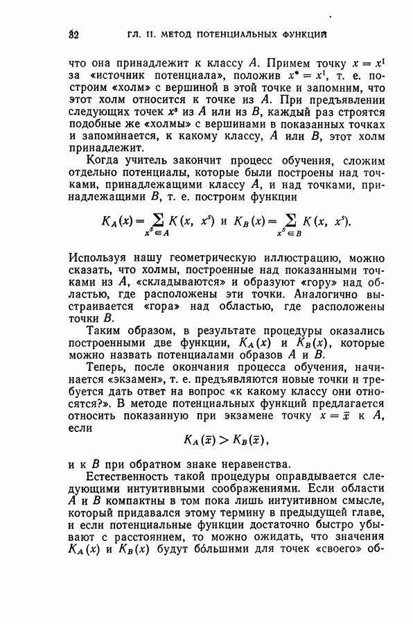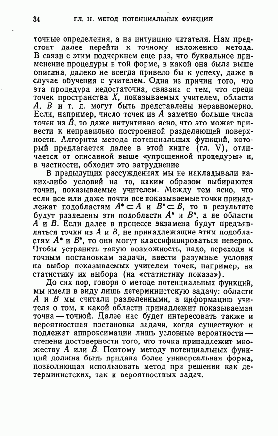 Тогда те же основания позволяют предполагать, что эта функция будет представлять собой «горный ландшафт» с вершинами над областями До сих пор мы старались лишь выяснить основную идею метода потенциальных функций, опираясь не на точные определения, а на интуицию читателя. Нам предстоит далее перейти к точному изложению метода. В связи с этим подчеркнем еще раз, что буквальное применение процедуры в той форме, в какой она была выше описана, далеко не всегда привело бы к успеху, даже в случае обучения с учителем. Одна из причин того, что эта процедура недостаточна, связана с тем, что среди точек пространства X, показываемых учителем, области А, В и т. д. могут быть представлены неравномерно. Если, например, число точек из А заметно больше числа точек из В, то даже интуитивно ясно, что это может привести к неправильно построенной разделяющей поверхности. Алгоритм метода потенциальных функций, который предлагается далее в этой книге (гл. V), отличается от описанной выше «упрощенной процедуры» и, в частности, обходит это затруднение. В предыдущих рассуждениях мы не накладывали каких-либо условий на то, каким образом выбираются точки, показываемые учителем. Между тем ясно, что если все или даже почти все показываемые точки принадлежат подобластям А а До сих пор, говоря о методе потенциальных функций, мы имели в виду лишь детерминистскую задачу: области