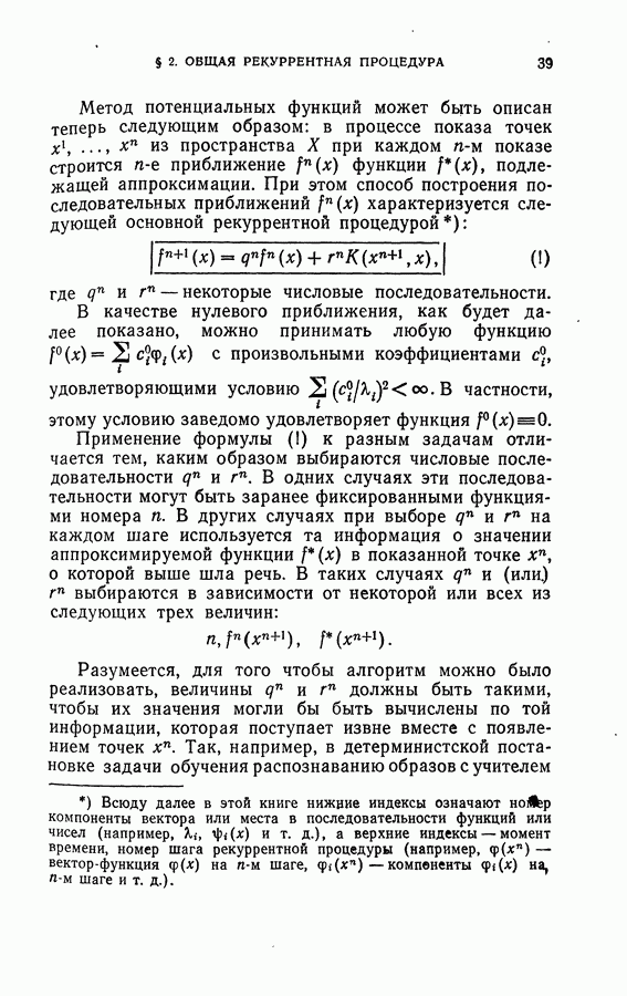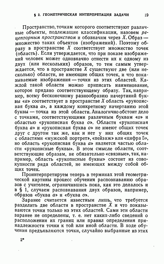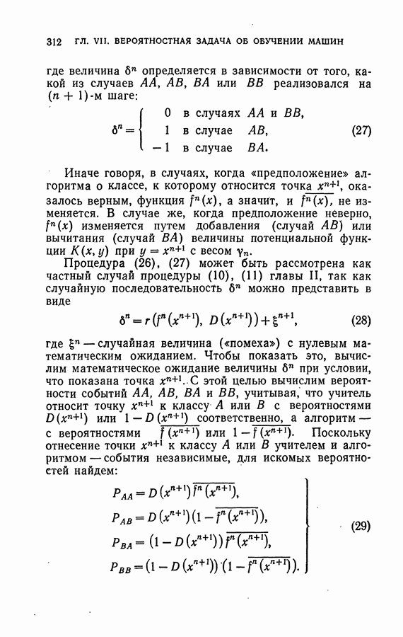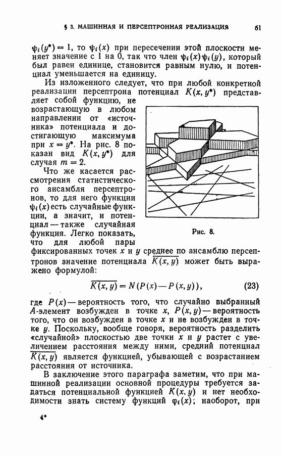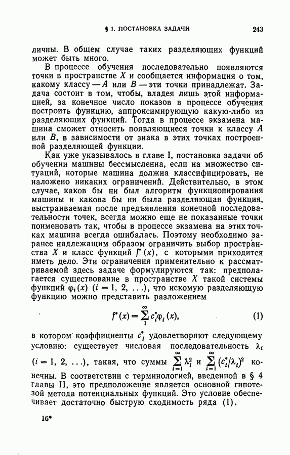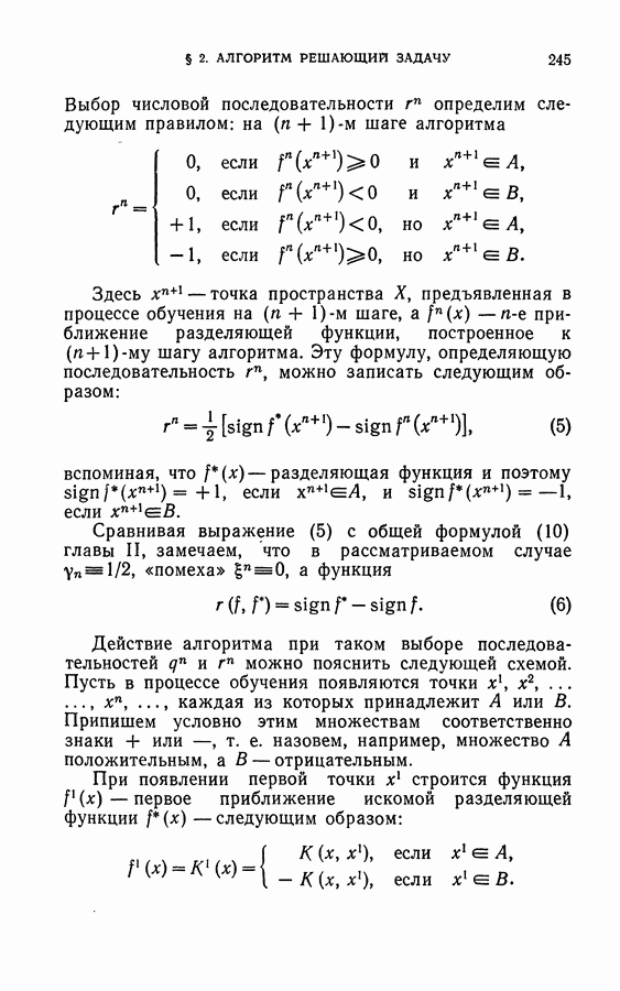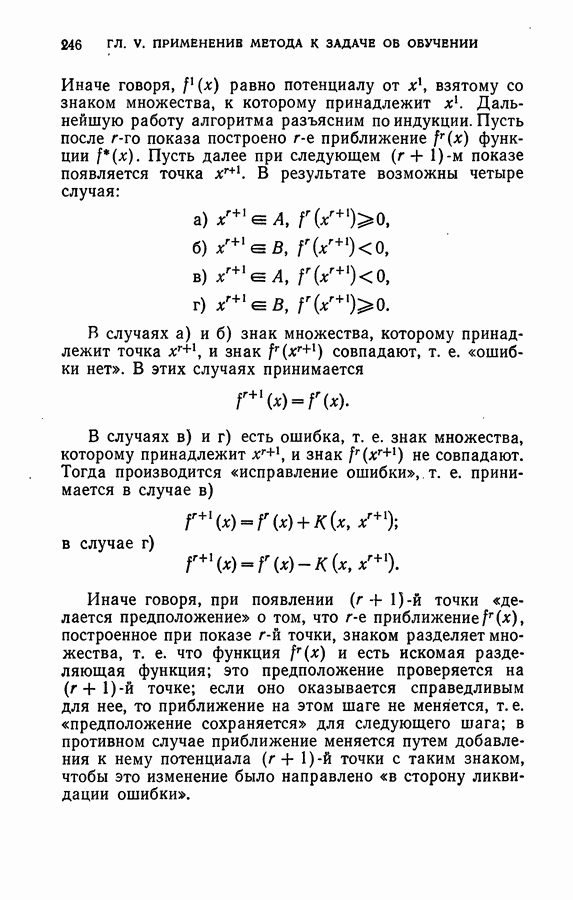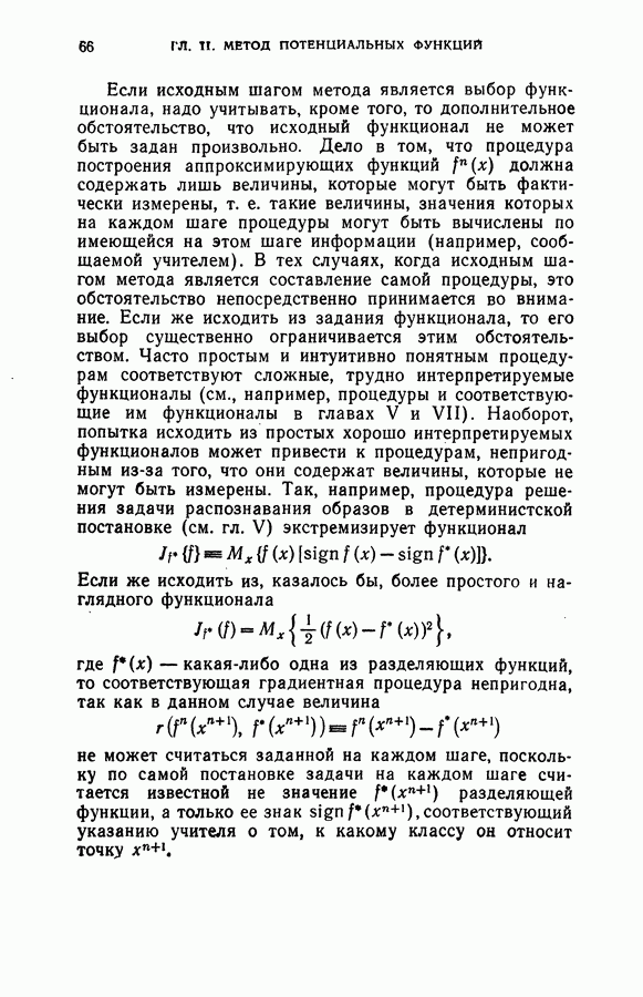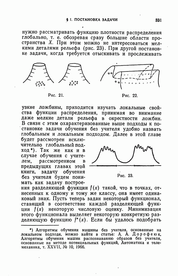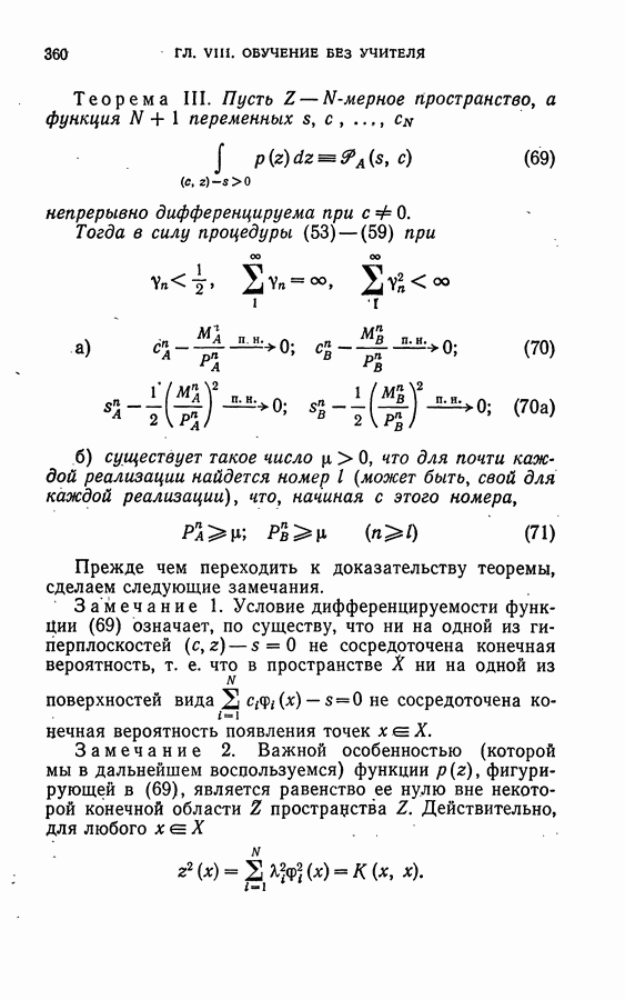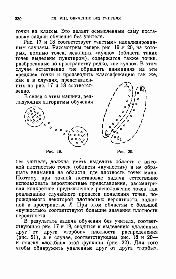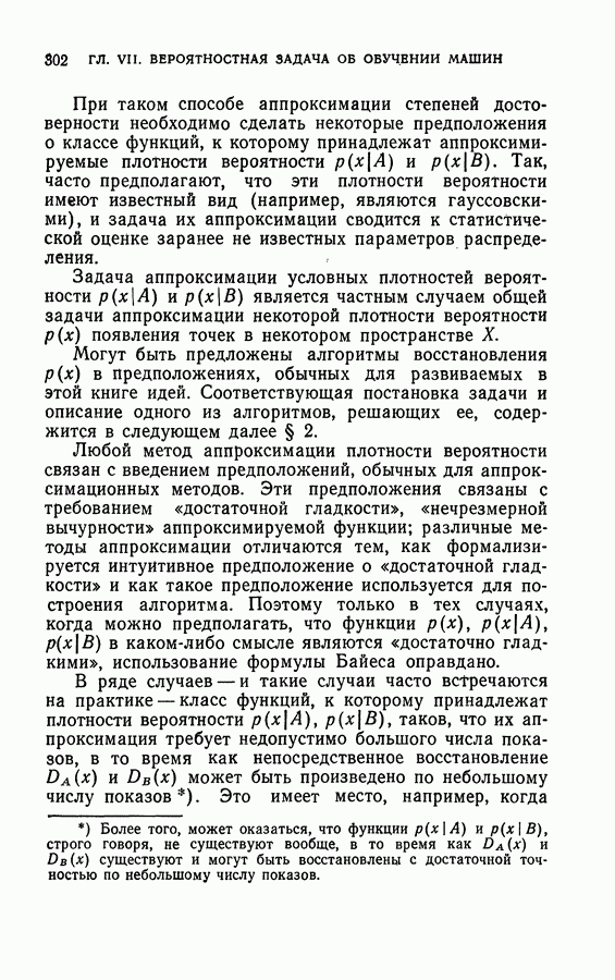 Тогда те же основания позволяют предполагать, что эта функция будет представлять собой «горный ландшафт» с вершинами над областями До сих пор мы старались лишь выяснить основную идею метода потенциальных функций, опираясь не на точные определения, а на интуицию читателя. Нам предстоит далее перейти к точному изложению метода. В связи с этим подчеркнем еще раз, что буквальное применение процедуры в той форме, в какой она была выше описана, далеко не всегда привело бы к успеху, даже в случае обучения с учителем. Одна из причин того, что эта процедура недостаточна, связана с тем, что среди точек пространства X, показываемых учителем, области А, В и т. д. могут быть представлены неравномерно. Если, например, число точек из А заметно больше числа точек из В, то даже интуитивно ясно, что это может привести к неправильно построенной разделяющей поверхности. Алгоритм метода потенциальных функций, который предлагается далее в этой книге (гл. V), отличается от описанной выше «упрощенной процедуры» и, в частности, обходит это затруднение. В предыдущих рассуждениях мы не накладывали каких-либо условий на то, каким образом выбираются точки, показываемые учителем. Между тем ясно, что если все или даже почти все показываемые точки принадлежат подобластям А а До сих пор, говоря о методе потенциальных функций, мы имели в виду лишь детерминистскую задачу: области