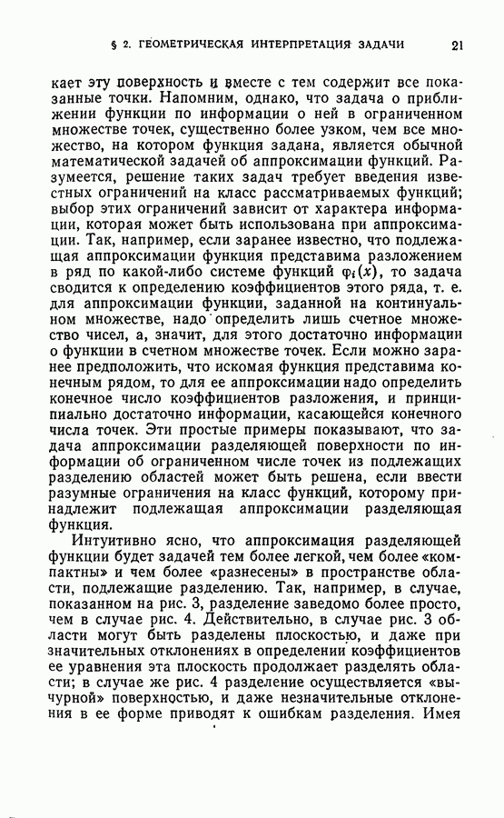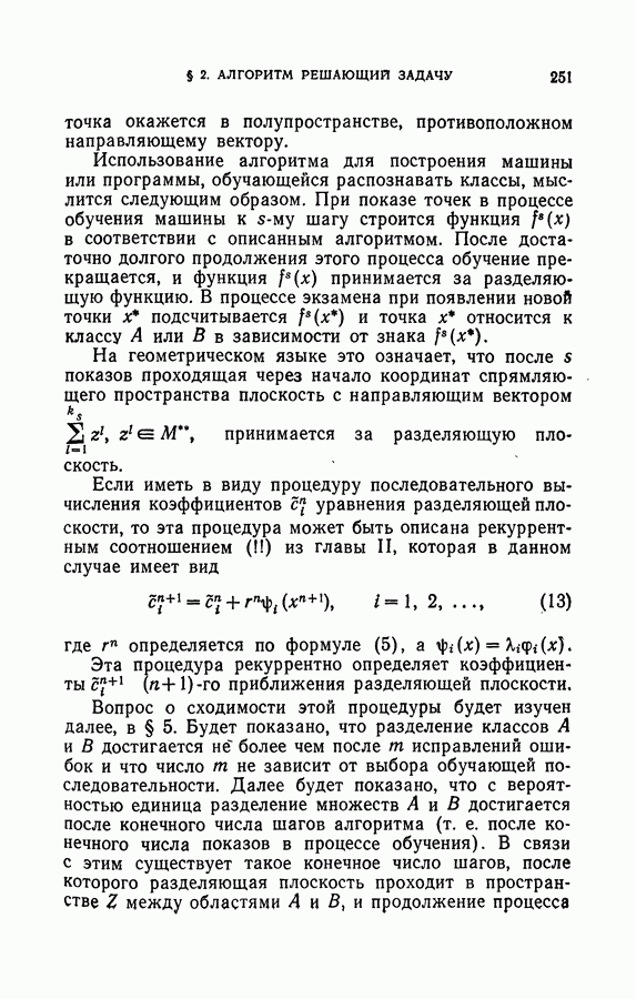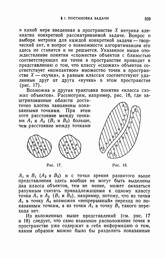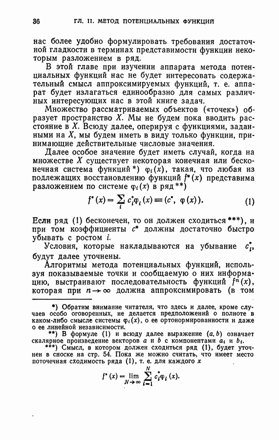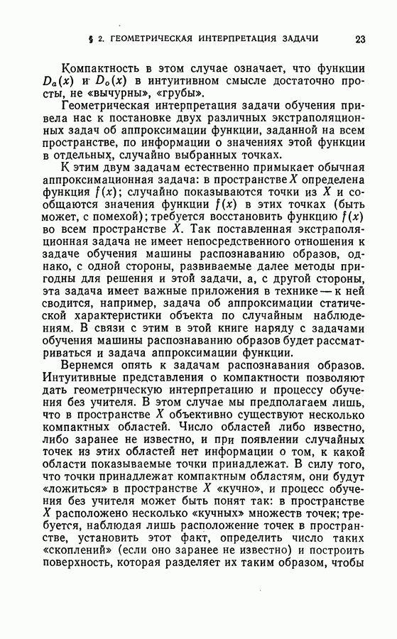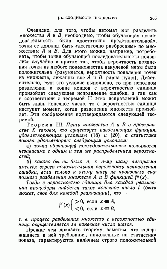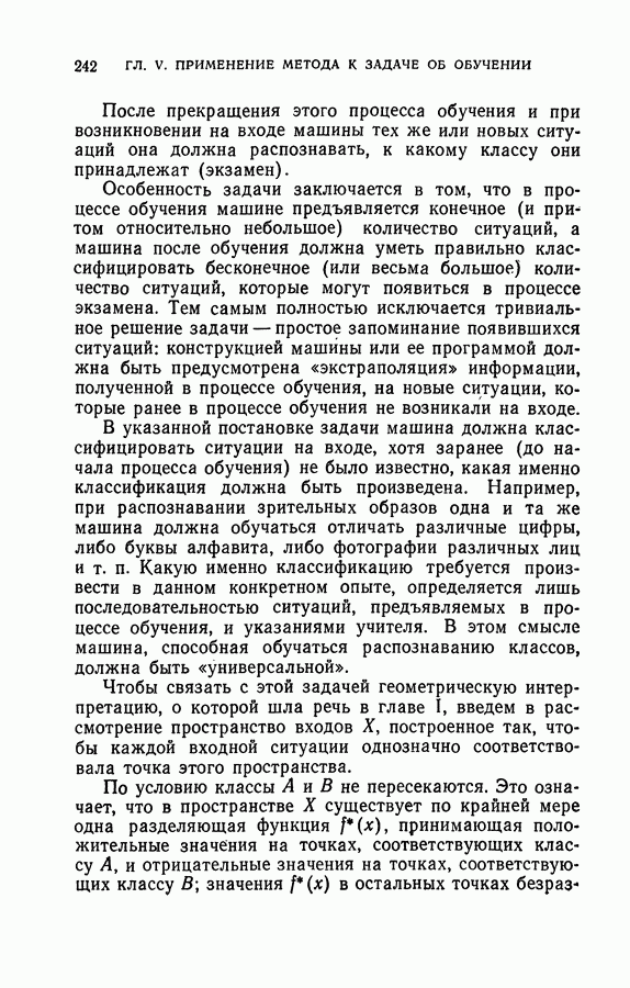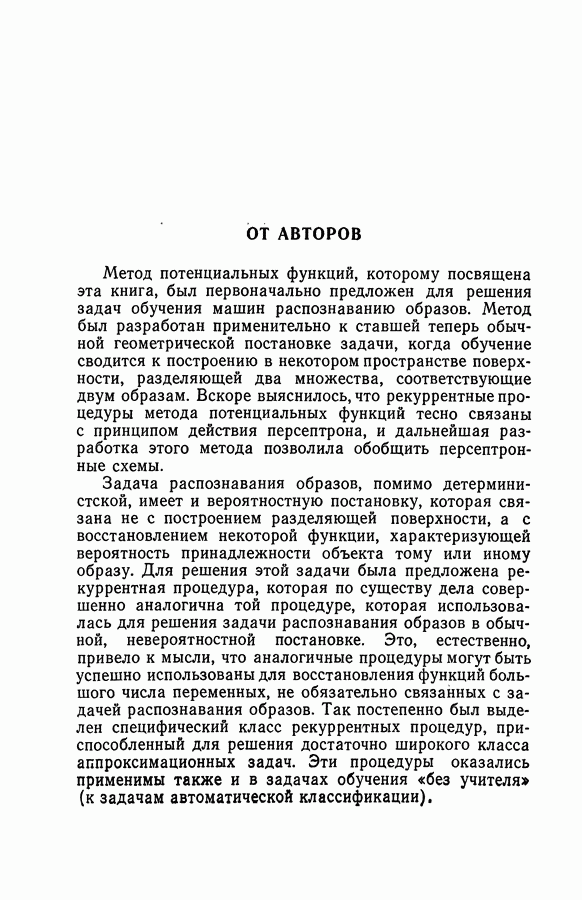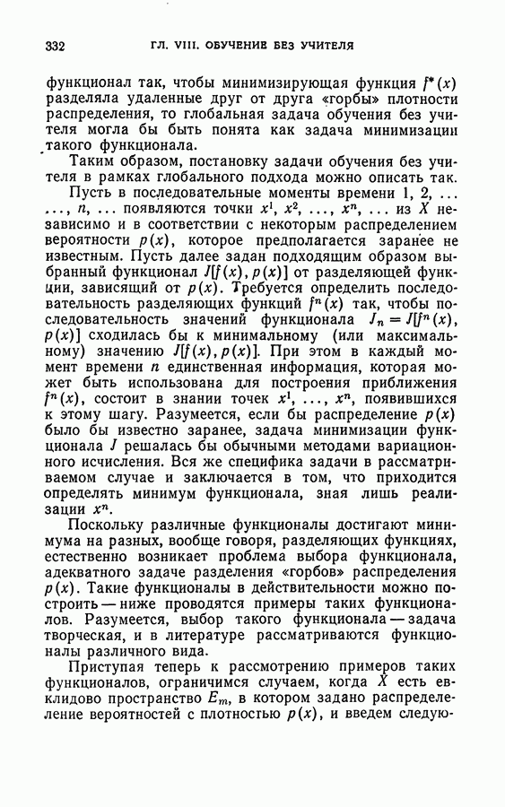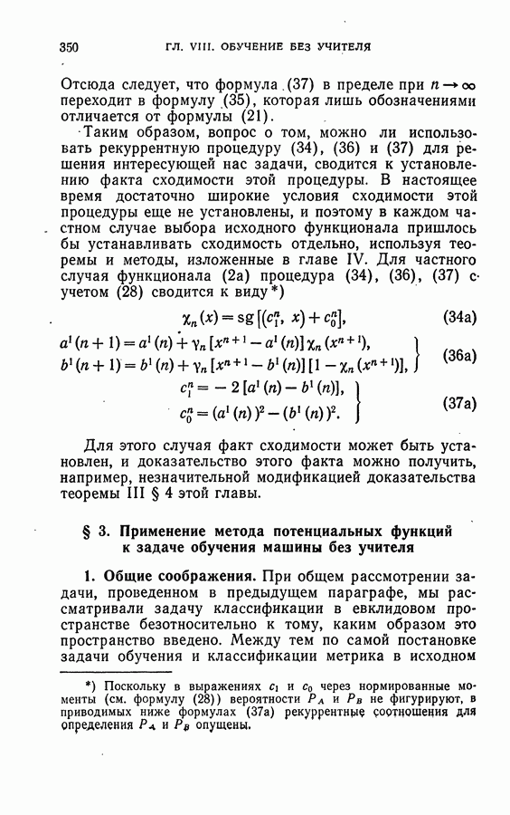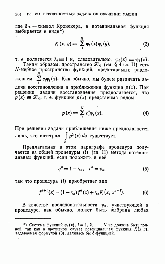 Тогда те же основания позволяют предполагать, что эта функция будет представлять собой «горный ландшафт» с вершинами над областями До сих пор мы старались лишь выяснить основную идею метода потенциальных функций, опираясь не на точные определения, а на интуицию читателя. Нам предстоит далее перейти к точному изложению метода. В связи с этим подчеркнем еще раз, что буквальное применение процедуры в той форме, в какой она была выше описана, далеко не всегда привело бы к успеху, даже в случае обучения с учителем. Одна из причин того, что эта процедура недостаточна, связана с тем, что среди точек пространства X, показываемых учителем, области А, В и т. д. могут быть представлены неравномерно. Если, например, число точек из А заметно больше числа точек из В, то даже интуитивно ясно, что это может привести к неправильно построенной разделяющей поверхности. Алгоритм метода потенциальных функций, который предлагается далее в этой книге (гл. V), отличается от описанной выше «упрощенной процедуры» и, в частности, обходит это затруднение. В предыдущих рассуждениях мы не накладывали каких-либо условий на то, каким образом выбираются точки, показываемые учителем. Между тем ясно, что если все или даже почти все показываемые точки принадлежат подобластям А а До сих пор, говоря о методе потенциальных функций, мы имели в виду лишь детерминистскую задачу: области