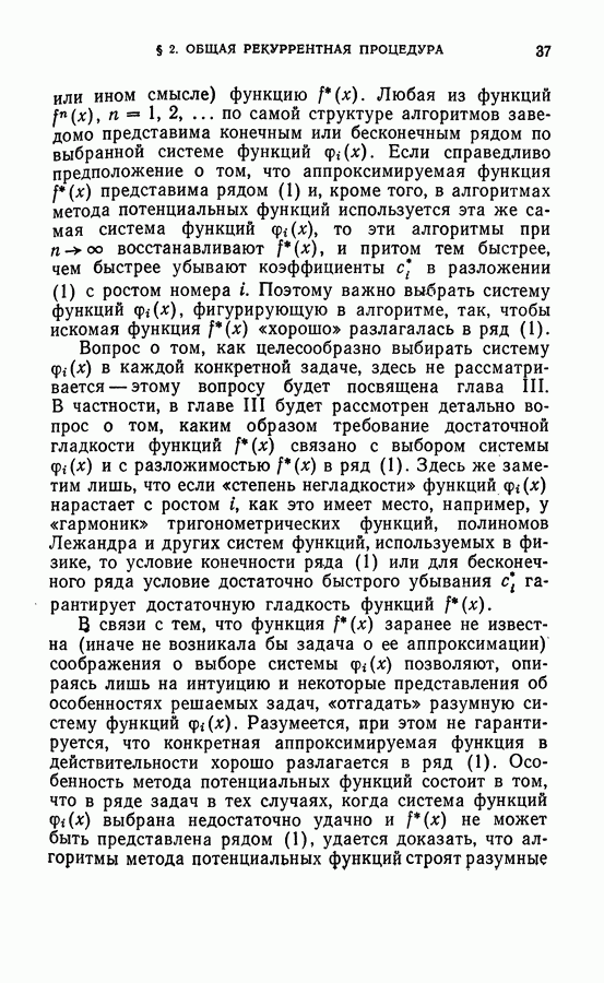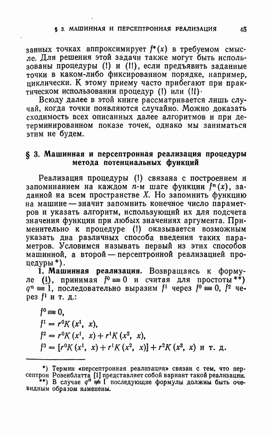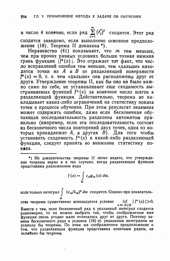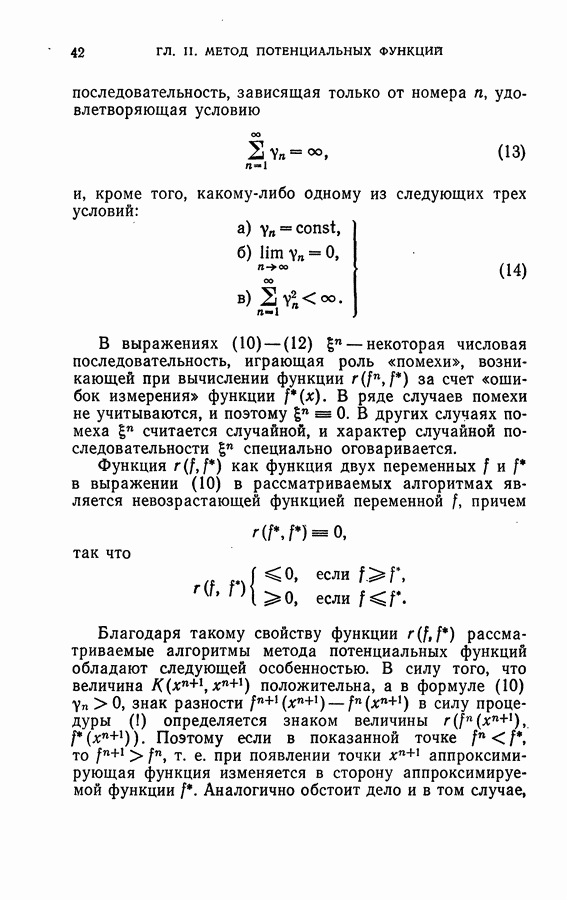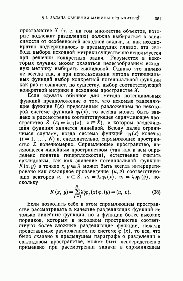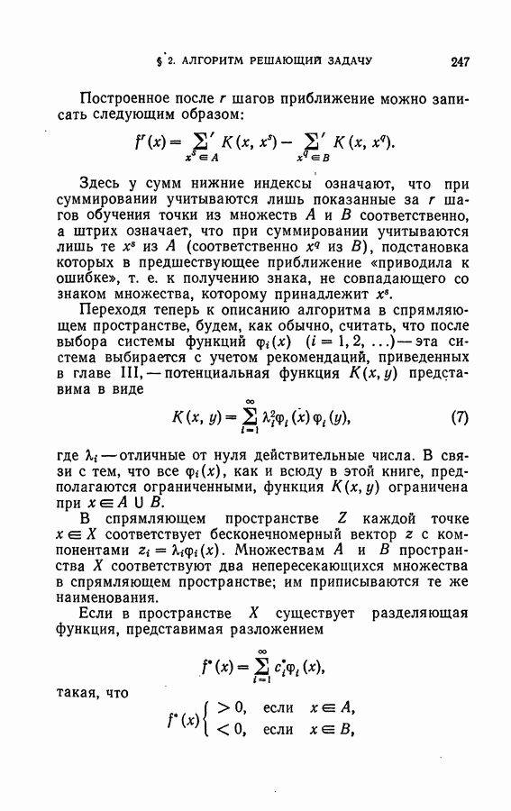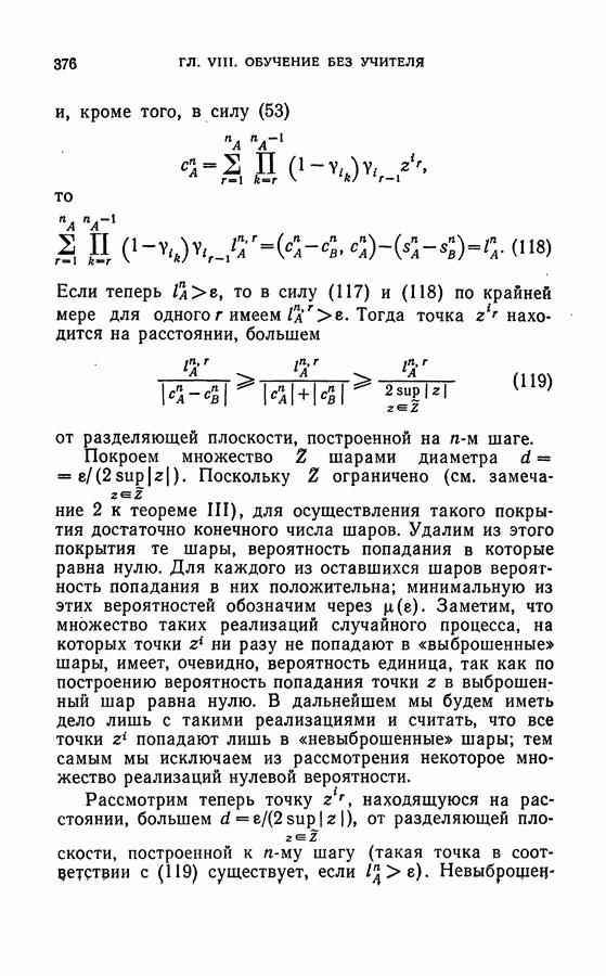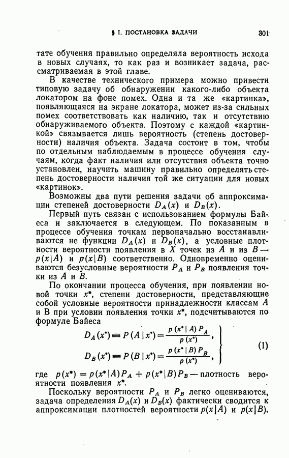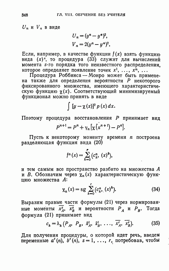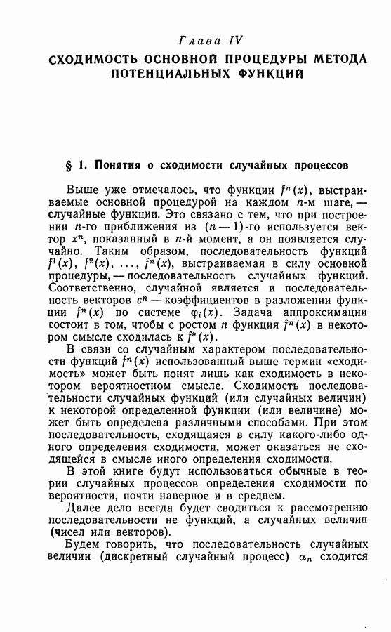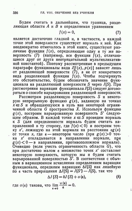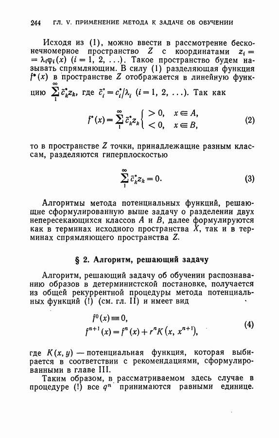 Тогда те же основания позволяют предполагать, что эта функция будет представлять собой «горный ландшафт» с вершинами над областями До сих пор мы старались лишь выяснить основную идею метода потенциальных функций, опираясь не на точные определения, а на интуицию читателя. Нам предстоит далее перейти к точному изложению метода. В связи с этим подчеркнем еще раз, что буквальное применение процедуры в той форме, в какой она была выше описана, далеко не всегда привело бы к успеху, даже в случае обучения с учителем. Одна из причин того, что эта процедура недостаточна, связана с тем, что среди точек пространства X, показываемых учителем, области А, В и т. д. могут быть представлены неравномерно. Если, например, число точек из А заметно больше числа точек из В, то даже интуитивно ясно, что это может привести к неправильно построенной разделяющей поверхности. Алгоритм метода потенциальных функций, который предлагается далее в этой книге (гл. V), отличается от описанной выше «упрощенной процедуры» и, в частности, обходит это затруднение. В предыдущих рассуждениях мы не накладывали каких-либо условий на то, каким образом выбираются точки, показываемые учителем. Между тем ясно, что если все или даже почти все показываемые точки принадлежат подобластям А а До сих пор, говоря о методе потенциальных функций, мы имели в виду лишь детерминистскую задачу: области