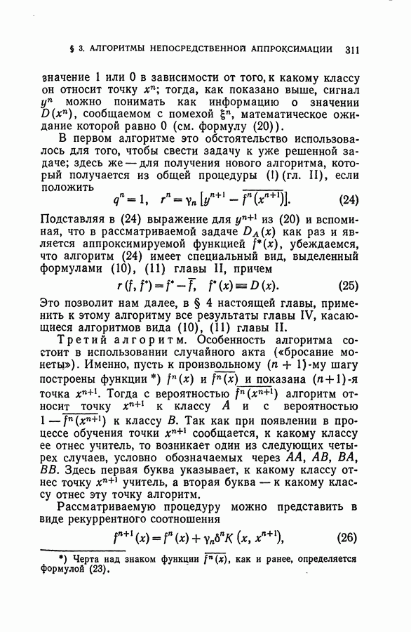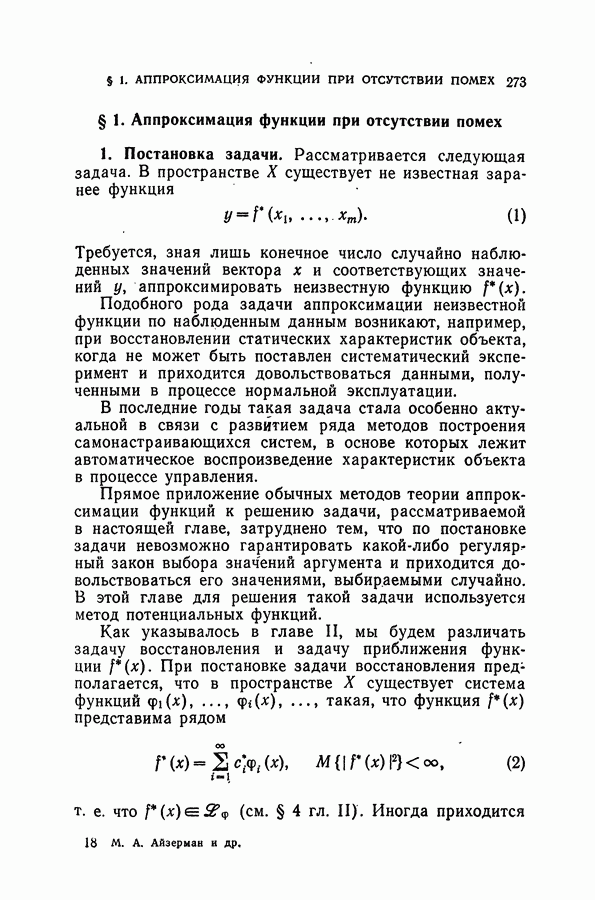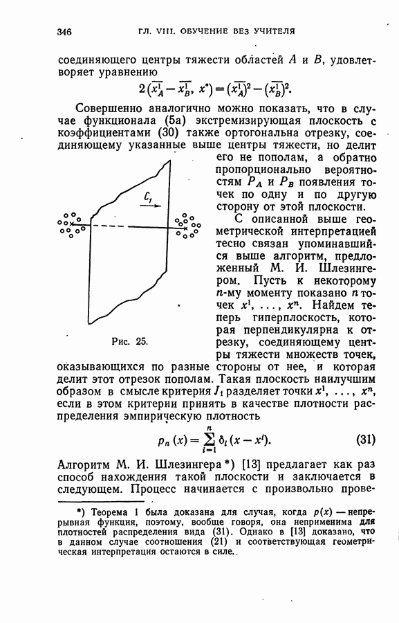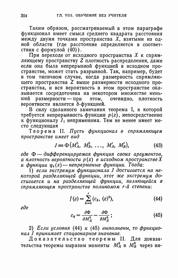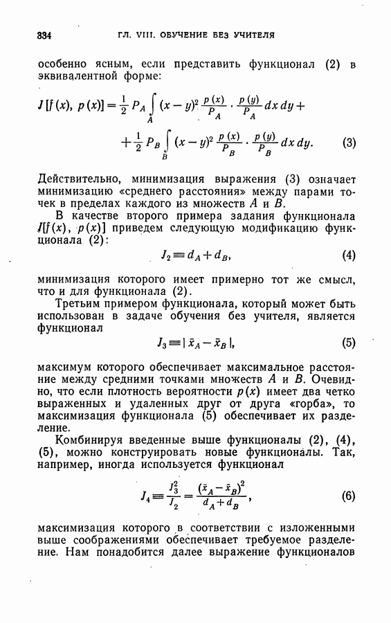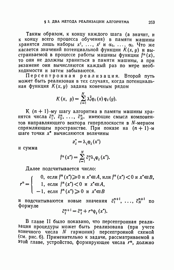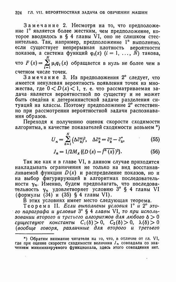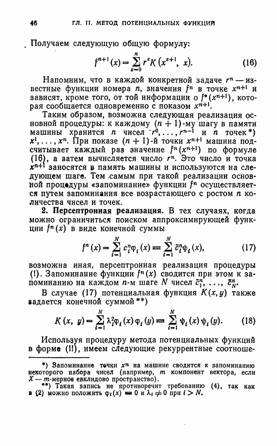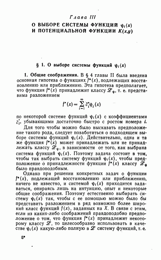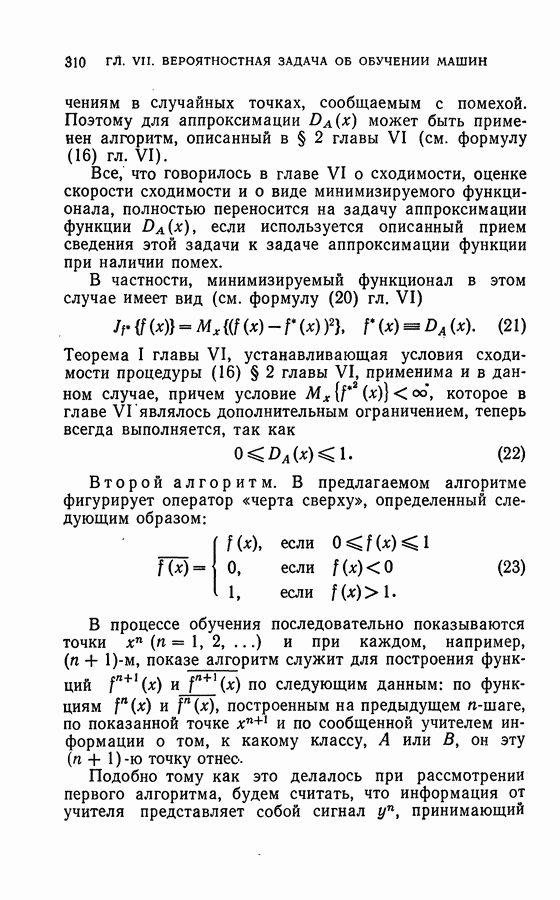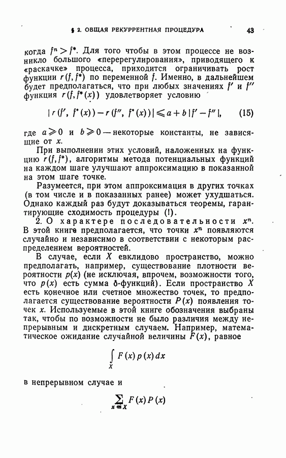 Тогда те же основания позволяют предполагать, что эта функция будет представлять собой «горный ландшафт» с вершинами над областями До сих пор мы старались лишь выяснить основную идею метода потенциальных функций, опираясь не на точные определения, а на интуицию читателя. Нам предстоит далее перейти к точному изложению метода. В связи с этим подчеркнем еще раз, что буквальное применение процедуры в той форме, в какой она была выше описана, далеко не всегда привело бы к успеху, даже в случае обучения с учителем. Одна из причин того, что эта процедура недостаточна, связана с тем, что среди точек пространства X, показываемых учителем, области А, В и т. д. могут быть представлены неравномерно. Если, например, число точек из А заметно больше числа точек из В, то даже интуитивно ясно, что это может привести к неправильно построенной разделяющей поверхности. Алгоритм метода потенциальных функций, который предлагается далее в этой книге (гл. V), отличается от описанной выше «упрощенной процедуры» и, в частности, обходит это затруднение. В предыдущих рассуждениях мы не накладывали каких-либо условий на то, каким образом выбираются точки, показываемые учителем. Между тем ясно, что если все или даже почти все показываемые точки принадлежат подобластям А а До сих пор, говоря о методе потенциальных функций, мы имели в виду лишь детерминистскую задачу: области