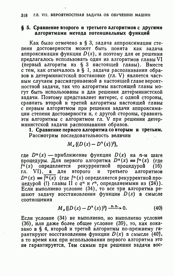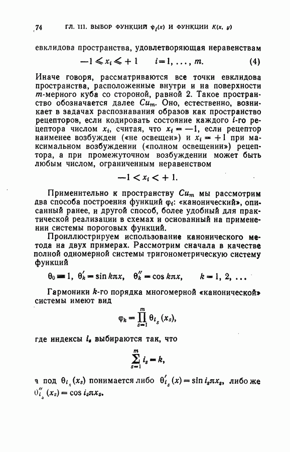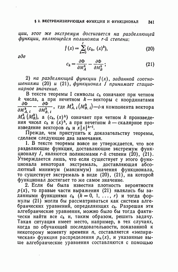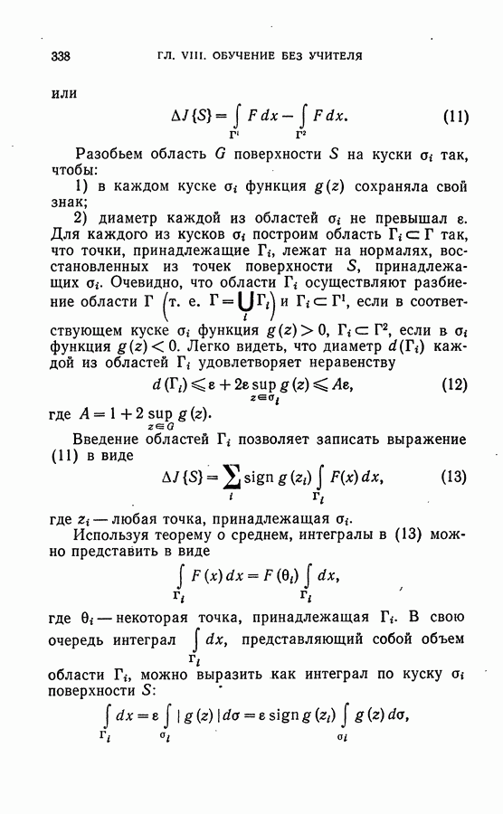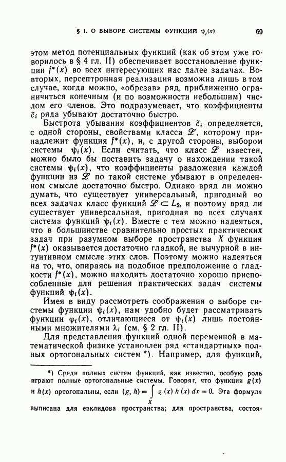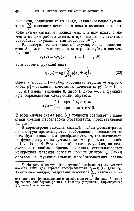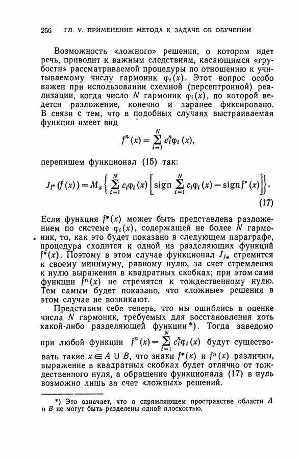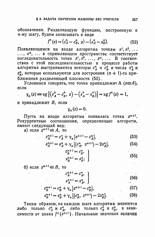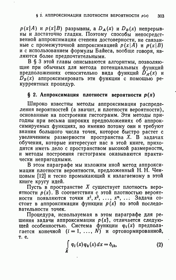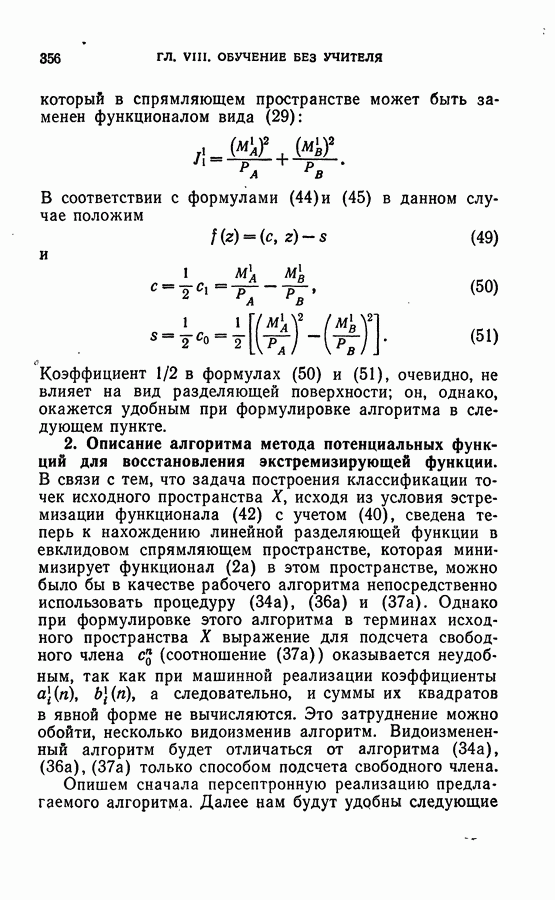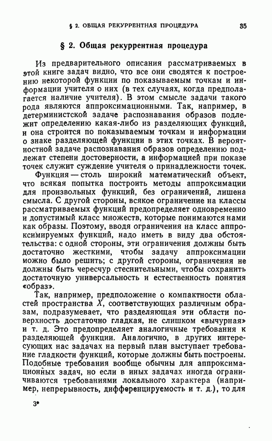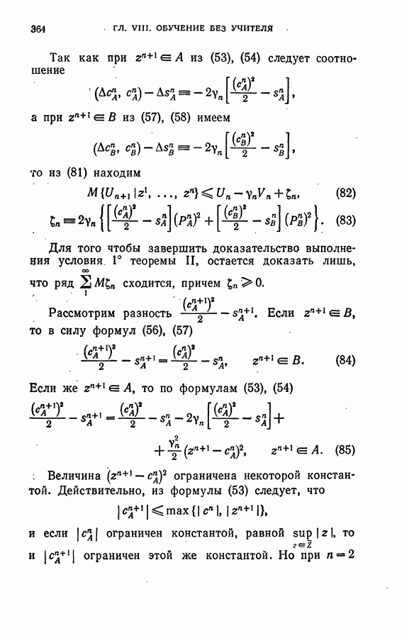 Тогда те же основания позволяют предполагать, что эта функция будет представлять собой «горный ландшафт» с вершинами над областями До сих пор мы старались лишь выяснить основную идею метода потенциальных функций, опираясь не на точные определения, а на интуицию читателя. Нам предстоит далее перейти к точному изложению метода. В связи с этим подчеркнем еще раз, что буквальное применение процедуры в той форме, в какой она была выше описана, далеко не всегда привело бы к успеху, даже в случае обучения с учителем. Одна из причин того, что эта процедура недостаточна, связана с тем, что среди точек пространства X, показываемых учителем, области А, В и т. д. могут быть представлены неравномерно. Если, например, число точек из А заметно больше числа точек из В, то даже интуитивно ясно, что это может привести к неправильно построенной разделяющей поверхности. Алгоритм метода потенциальных функций, который предлагается далее в этой книге (гл. V), отличается от описанной выше «упрощенной процедуры» и, в частности, обходит это затруднение. В предыдущих рассуждениях мы не накладывали каких-либо условий на то, каким образом выбираются точки, показываемые учителем. Между тем ясно, что если все или даже почти все показываемые точки принадлежат подобластям А а До сих пор, говоря о методе потенциальных функций, мы имели в виду лишь детерминистскую задачу: области
