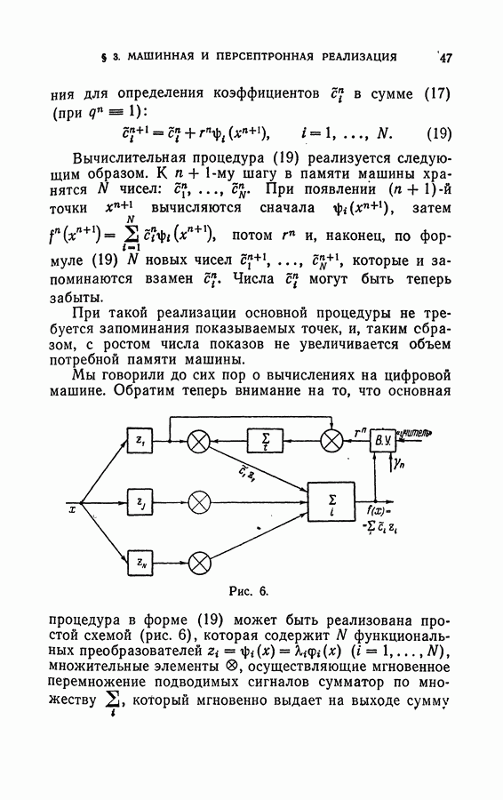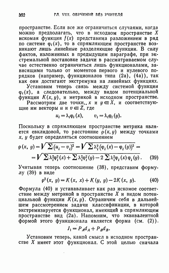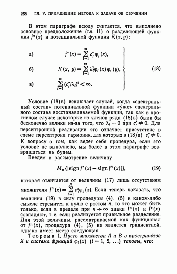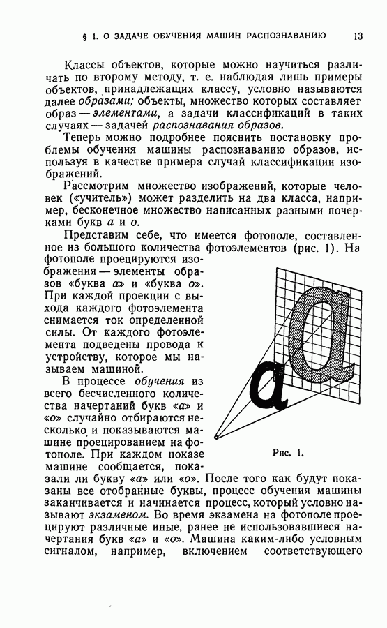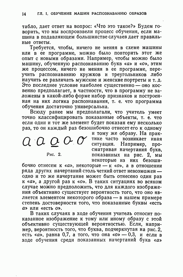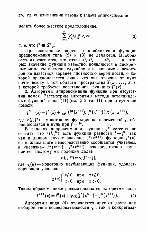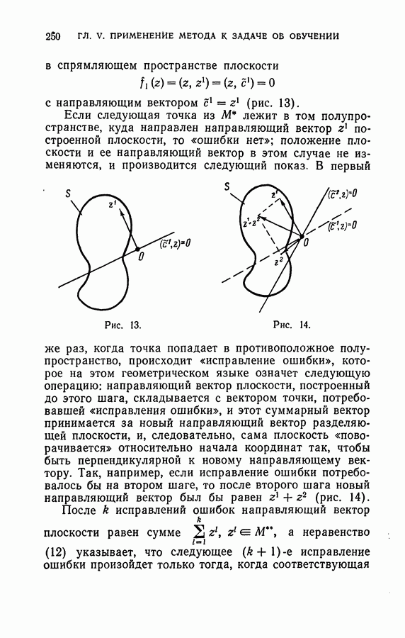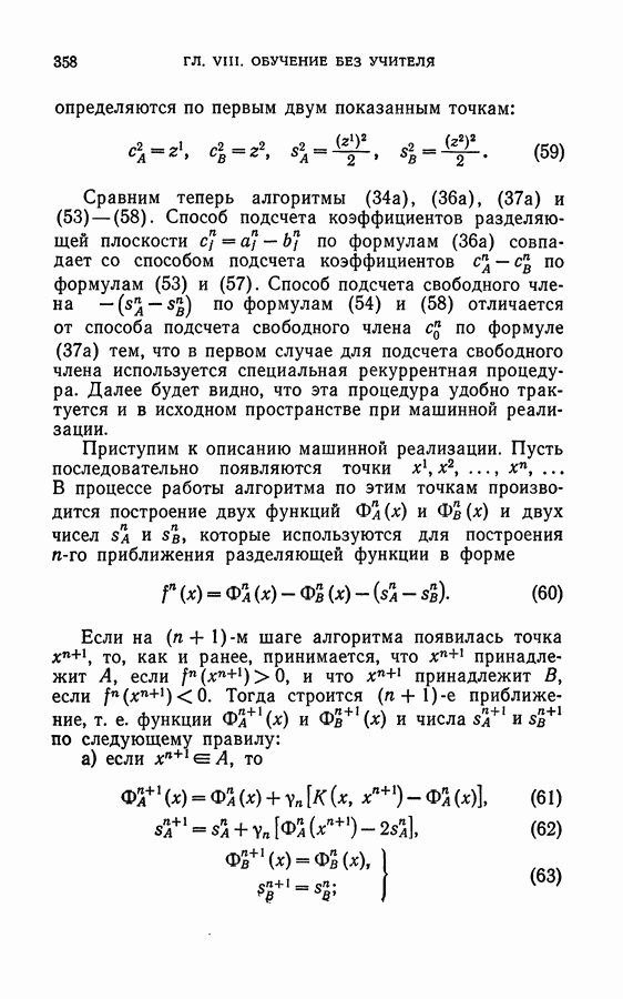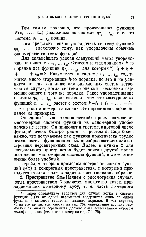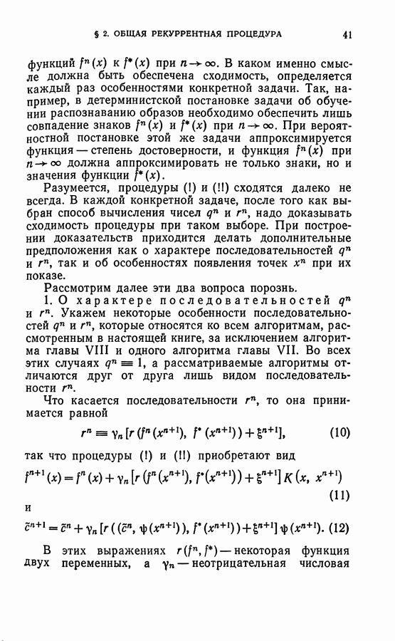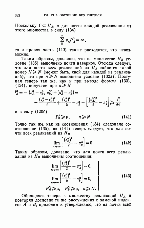 Тогда те же основания позволяют предполагать, что эта функция будет представлять собой «горный ландшафт» с вершинами над областями До сих пор мы старались лишь выяснить основную идею метода потенциальных функций, опираясь не на точные определения, а на интуицию читателя. Нам предстоит далее перейти к точному изложению метода. В связи с этим подчеркнем еще раз, что буквальное применение процедуры в той форме, в какой она была выше описана, далеко не всегда привело бы к успеху, даже в случае обучения с учителем. Одна из причин того, что эта процедура недостаточна, связана с тем, что среди точек пространства X, показываемых учителем, области А, В и т. д. могут быть представлены неравномерно. Если, например, число точек из А заметно больше числа точек из В, то даже интуитивно ясно, что это может привести к неправильно построенной разделяющей поверхности. Алгоритм метода потенциальных функций, который предлагается далее в этой книге (гл. V), отличается от описанной выше «упрощенной процедуры» и, в частности, обходит это затруднение. В предыдущих рассуждениях мы не накладывали каких-либо условий на то, каким образом выбираются точки, показываемые учителем. Между тем ясно, что если все или даже почти все показываемые точки принадлежат подобластям А а До сих пор, говоря о методе потенциальных функций, мы имели в виду лишь детерминистскую задачу: области