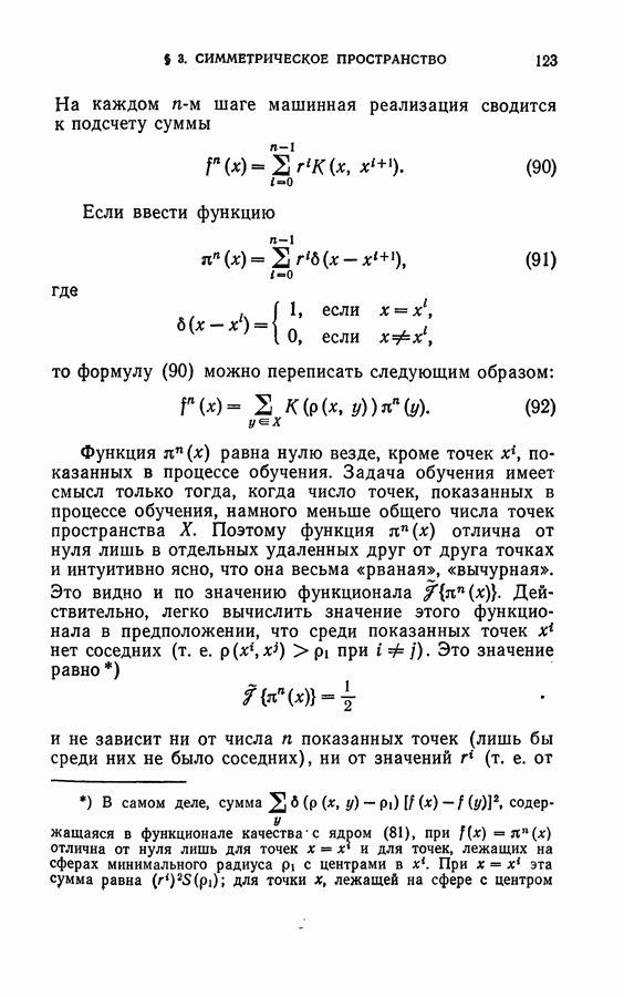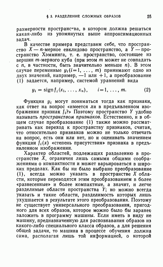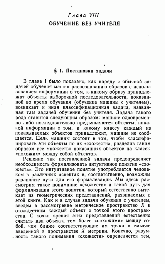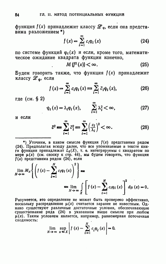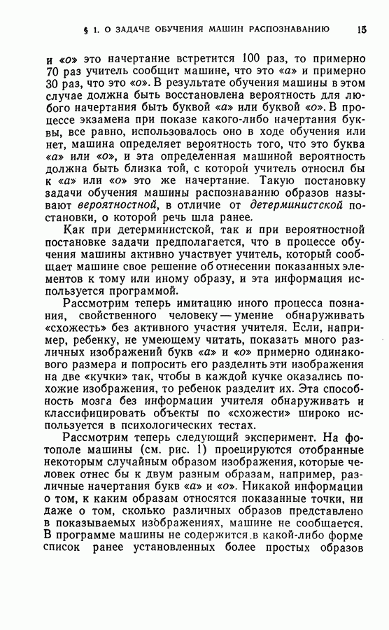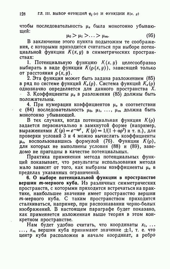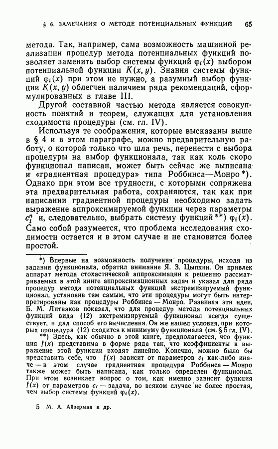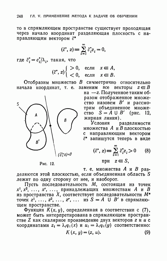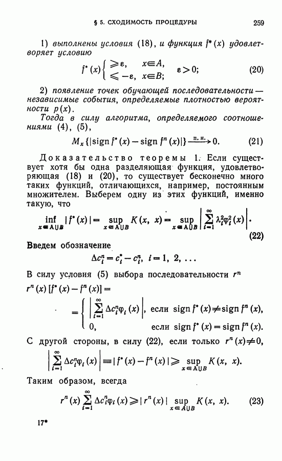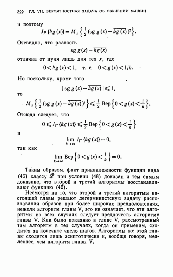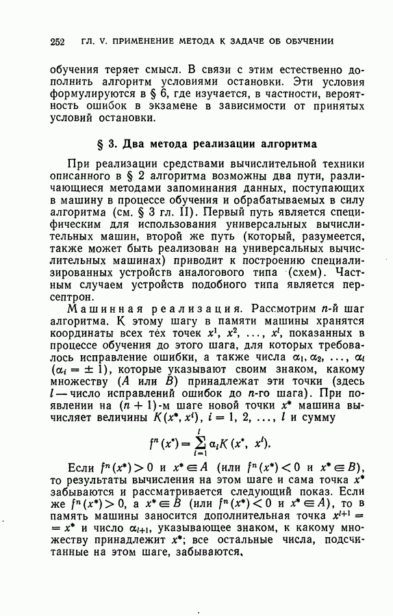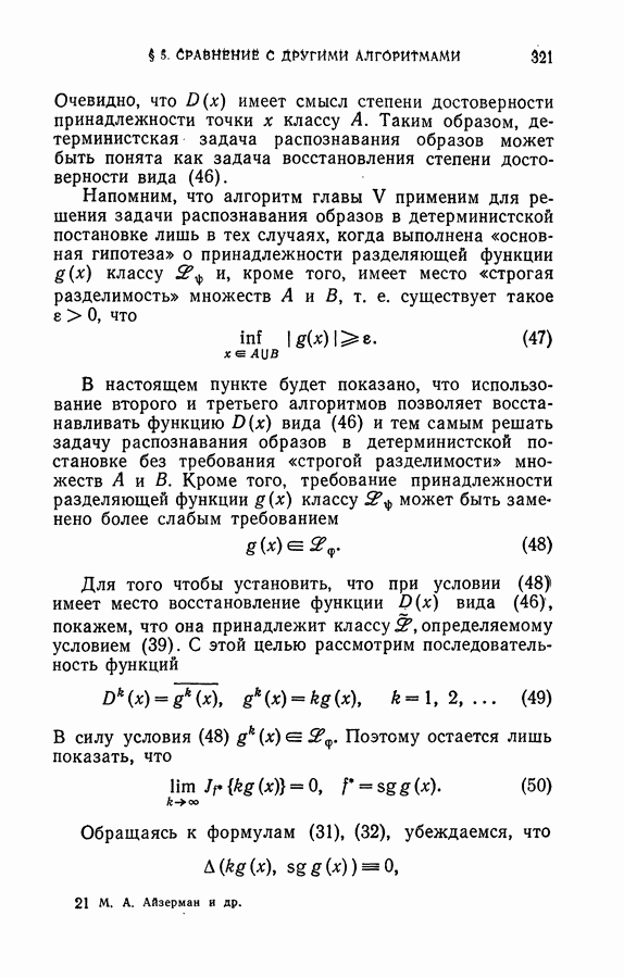 Тогда те же основания позволяют предполагать, что эта функция будет представлять собой «горный ландшафт» с вершинами над областями До сих пор мы старались лишь выяснить основную идею метода потенциальных функций, опираясь не на точные определения, а на интуицию читателя. Нам предстоит далее перейти к точному изложению метода. В связи с этим подчеркнем еще раз, что буквальное применение процедуры в той форме, в какой она была выше описана, далеко не всегда привело бы к успеху, даже в случае обучения с учителем. Одна из причин того, что эта процедура недостаточна, связана с тем, что среди точек пространства X, показываемых учителем, области А, В и т. д. могут быть представлены неравномерно. Если, например, число точек из А заметно больше числа точек из В, то даже интуитивно ясно, что это может привести к неправильно построенной разделяющей поверхности. Алгоритм метода потенциальных функций, который предлагается далее в этой книге (гл. V), отличается от описанной выше «упрощенной процедуры» и, в частности, обходит это затруднение. В предыдущих рассуждениях мы не накладывали каких-либо условий на то, каким образом выбираются точки, показываемые учителем. Между тем ясно, что если все или даже почти все показываемые точки принадлежат подобластям А а До сих пор, говоря о методе потенциальных функций, мы имели в виду лишь детерминистскую задачу: области