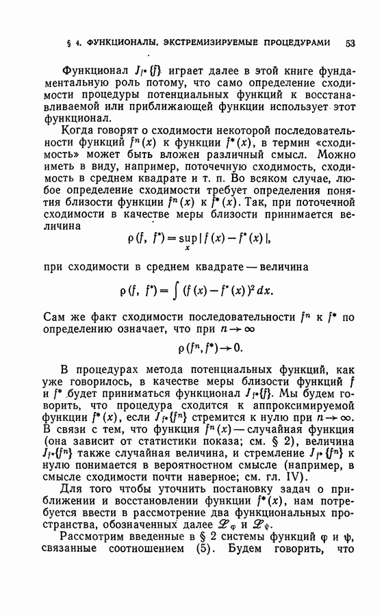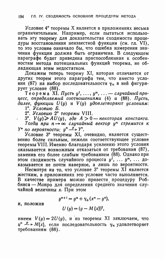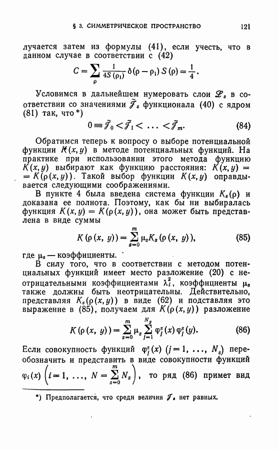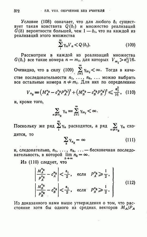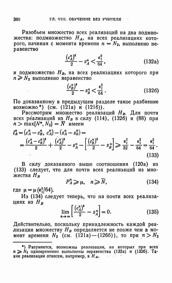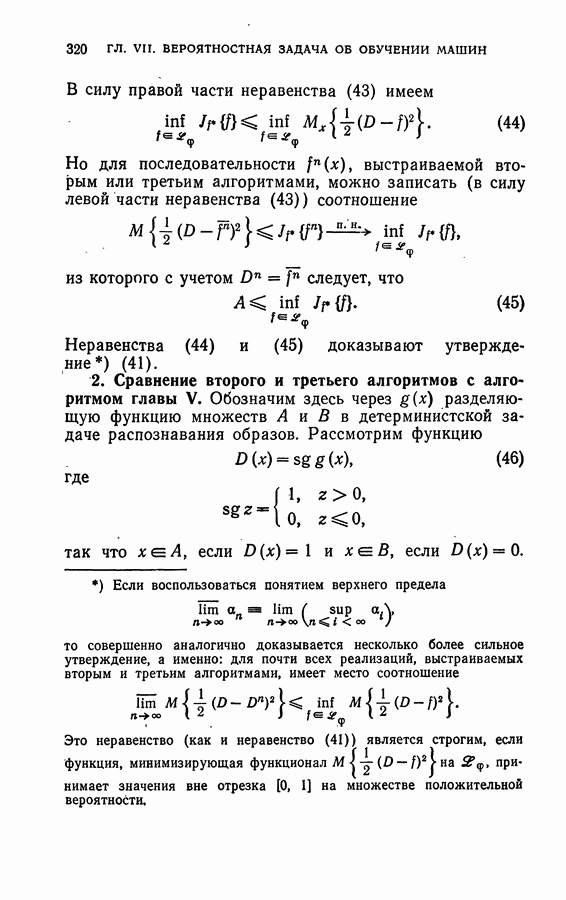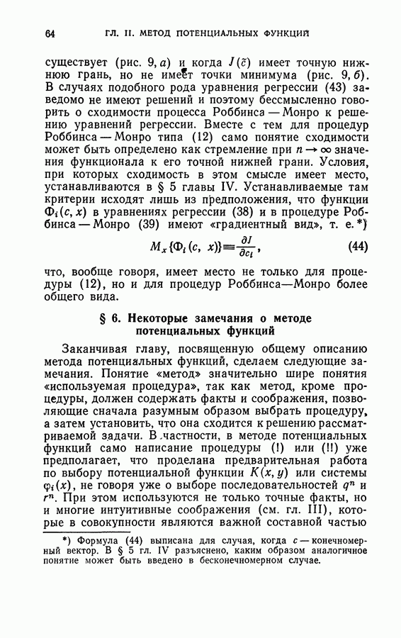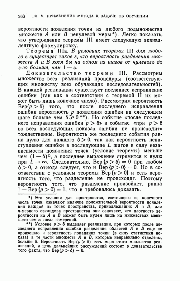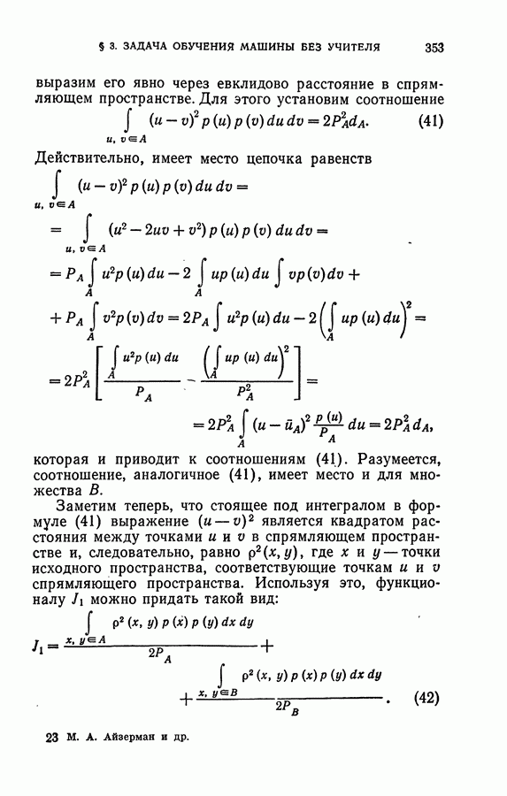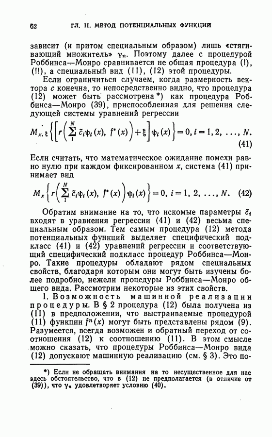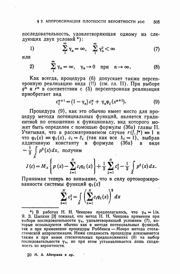 Тогда те же основания позволяют предполагать, что эта функция будет представлять собой «горный ландшафт» с вершинами над областями До сих пор мы старались лишь выяснить основную идею метода потенциальных функций, опираясь не на точные определения, а на интуицию читателя. Нам предстоит далее перейти к точному изложению метода. В связи с этим подчеркнем еще раз, что буквальное применение процедуры в той форме, в какой она была выше описана, далеко не всегда привело бы к успеху, даже в случае обучения с учителем. Одна из причин того, что эта процедура недостаточна, связана с тем, что среди точек пространства X, показываемых учителем, области А, В и т. д. могут быть представлены неравномерно. Если, например, число точек из А заметно больше числа точек из В, то даже интуитивно ясно, что это может привести к неправильно построенной разделяющей поверхности. Алгоритм метода потенциальных функций, который предлагается далее в этой книге (гл. V), отличается от описанной выше «упрощенной процедуры» и, в частности, обходит это затруднение. В предыдущих рассуждениях мы не накладывали каких-либо условий на то, каким образом выбираются точки, показываемые учителем. Между тем ясно, что если все или даже почти все показываемые точки принадлежат подобластям А а До сих пор, говоря о методе потенциальных функций, мы имели в виду лишь детерминистскую задачу: области