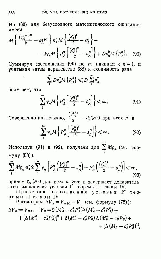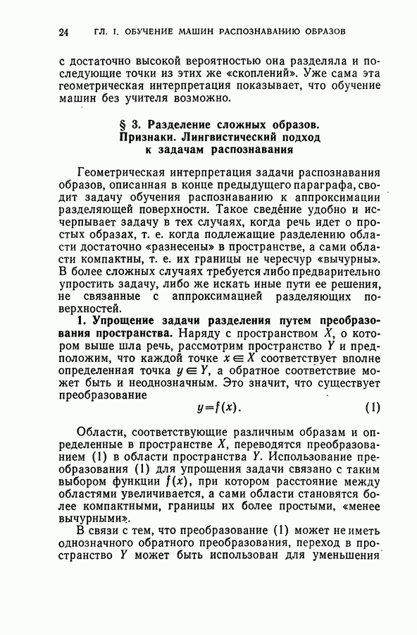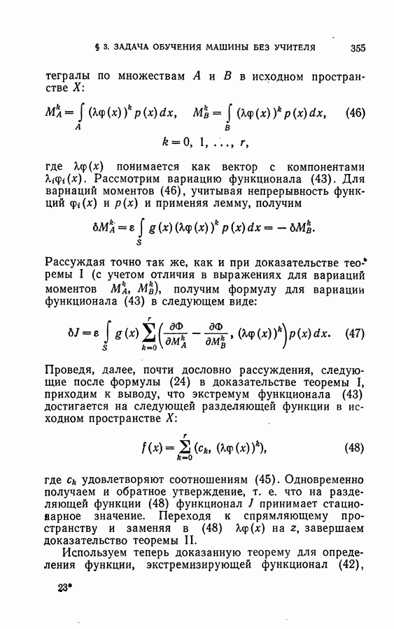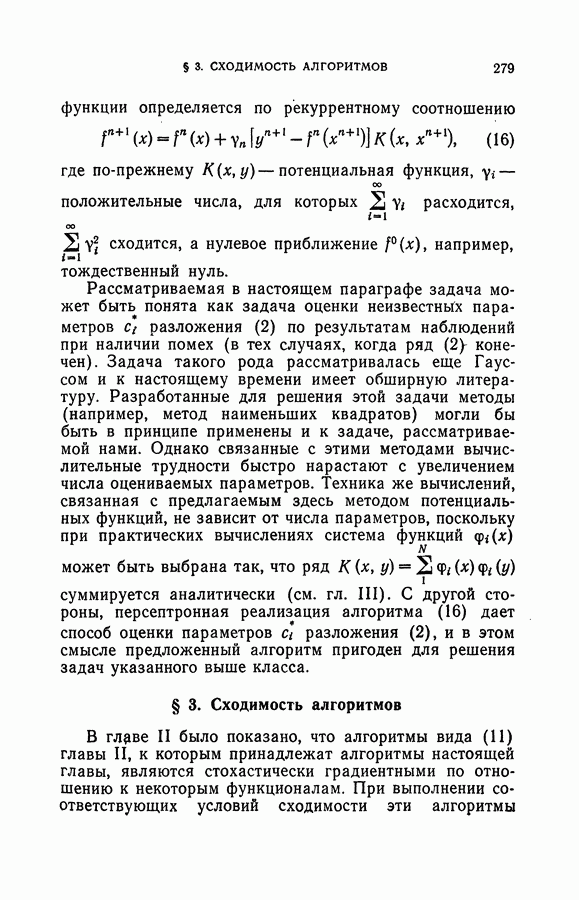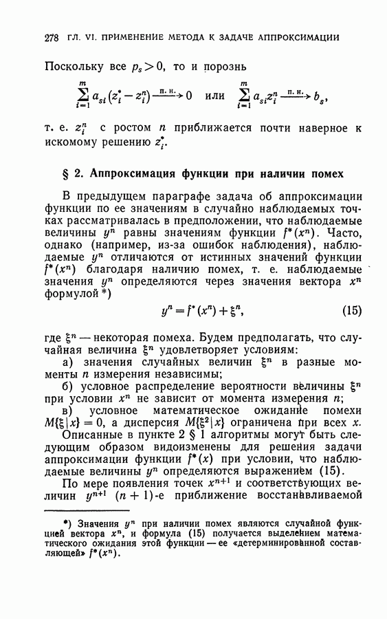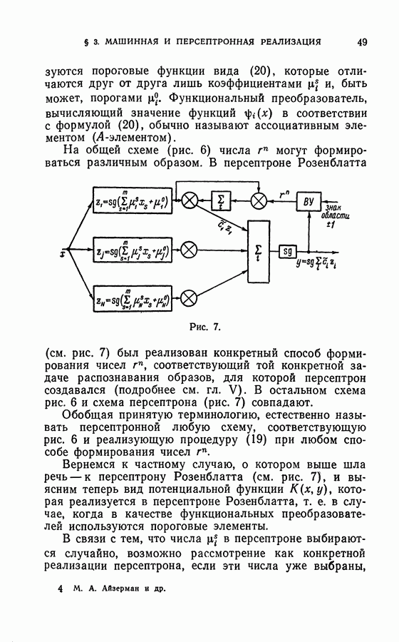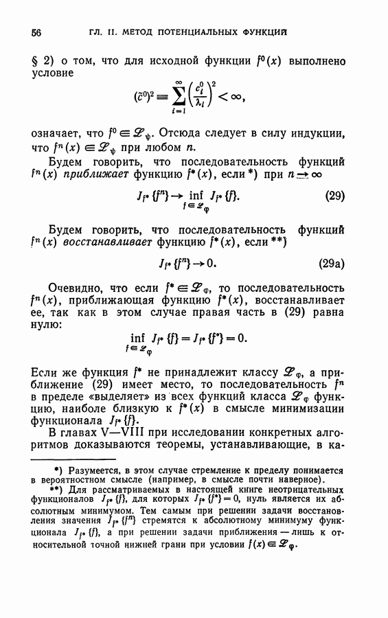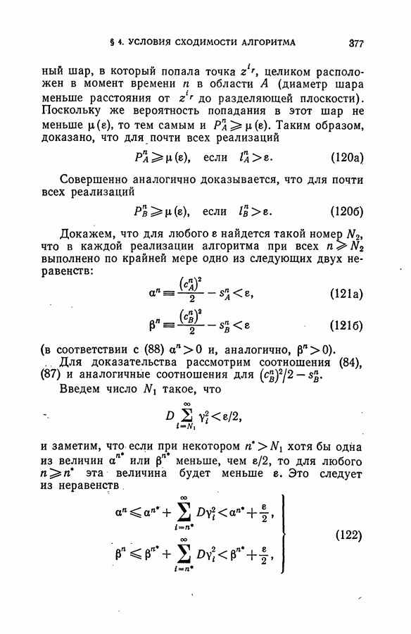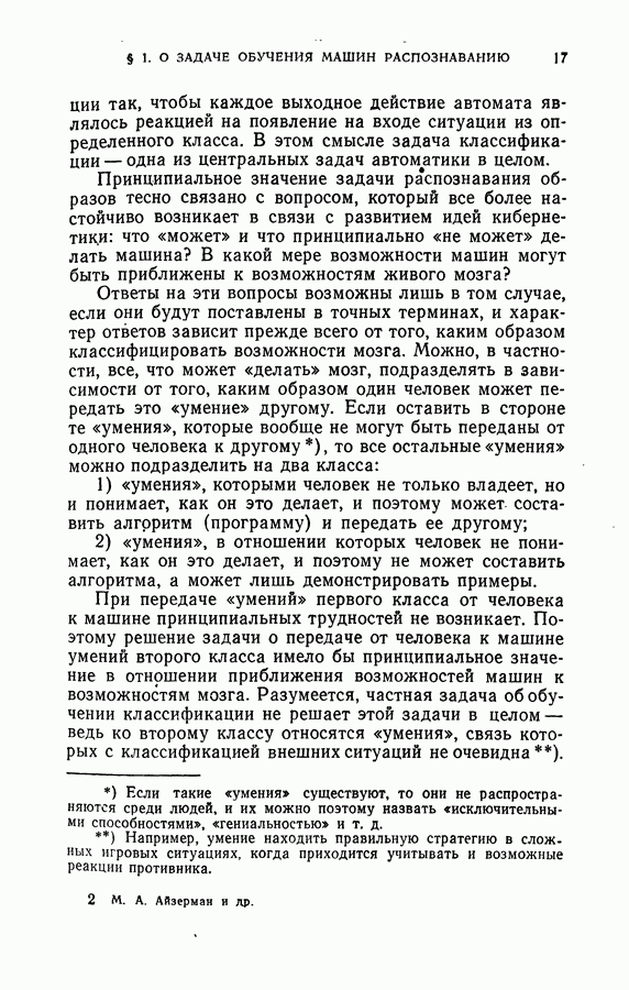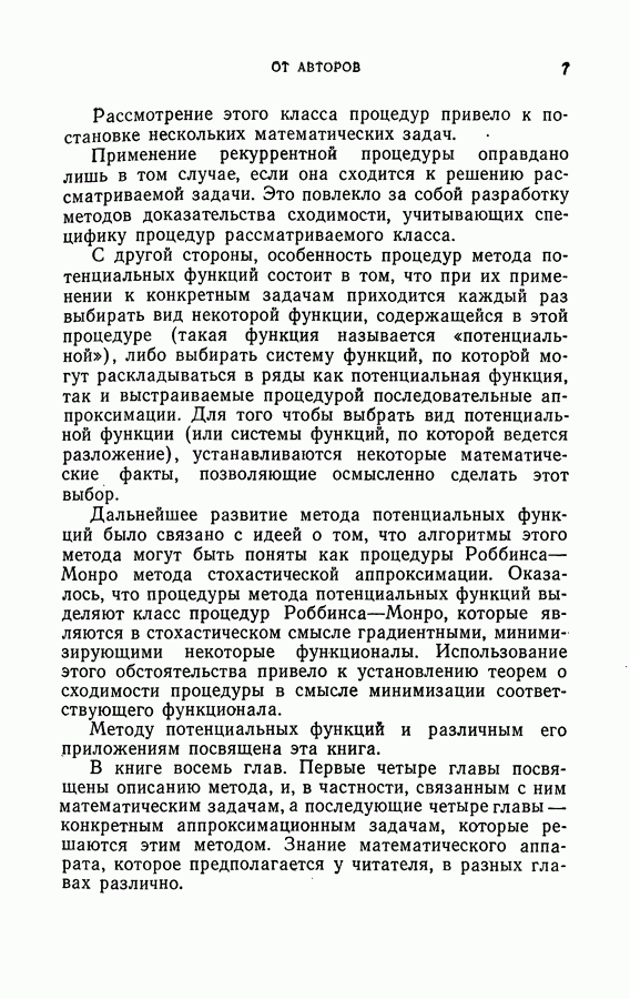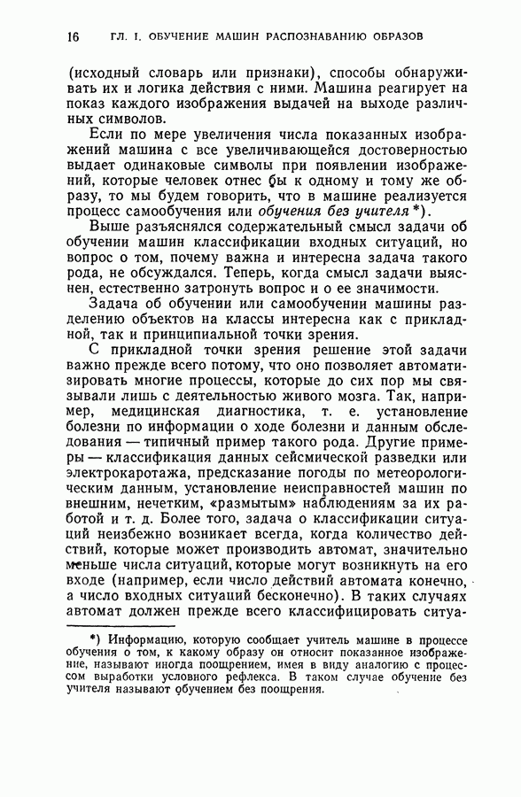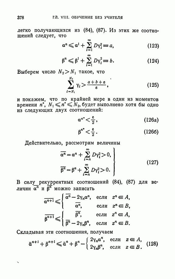 Тогда те же основания позволяют предполагать, что эта функция будет представлять собой «горный ландшафт» с вершинами над областями До сих пор мы старались лишь выяснить основную идею метода потенциальных функций, опираясь не на точные определения, а на интуицию читателя. Нам предстоит далее перейти к точному изложению метода. В связи с этим подчеркнем еще раз, что буквальное применение процедуры в той форме, в какой она была выше описана, далеко не всегда привело бы к успеху, даже в случае обучения с учителем. Одна из причин того, что эта процедура недостаточна, связана с тем, что среди точек пространства X, показываемых учителем, области А, В и т. д. могут быть представлены неравномерно. Если, например, число точек из А заметно больше числа точек из В, то даже интуитивно ясно, что это может привести к неправильно построенной разделяющей поверхности. Алгоритм метода потенциальных функций, который предлагается далее в этой книге (гл. V), отличается от описанной выше «упрощенной процедуры» и, в частности, обходит это затруднение. В предыдущих рассуждениях мы не накладывали каких-либо условий на то, каким образом выбираются точки, показываемые учителем. Между тем ясно, что если все или даже почти все показываемые точки принадлежат подобластям А а До сих пор, говоря о методе потенциальных функций, мы имели в виду лишь детерминистскую задачу: области