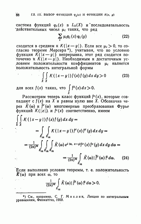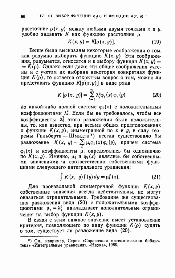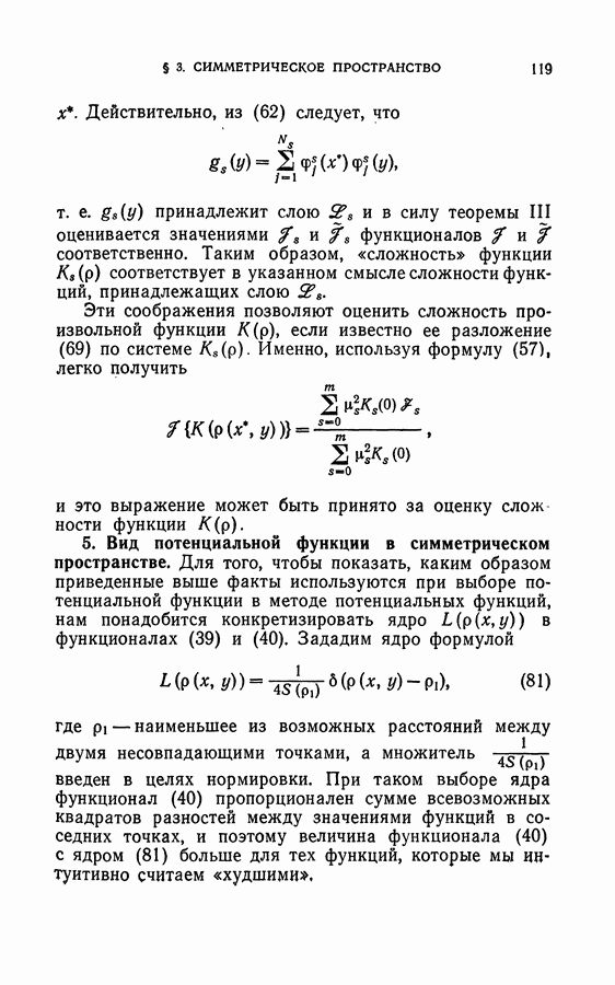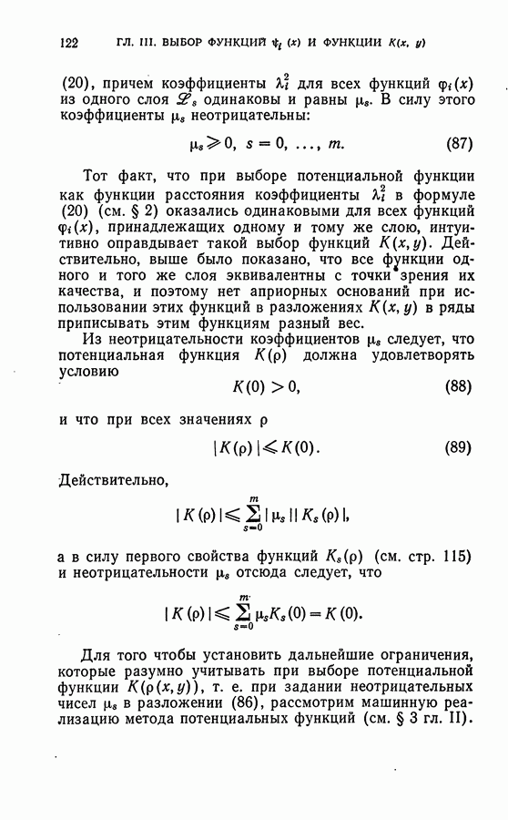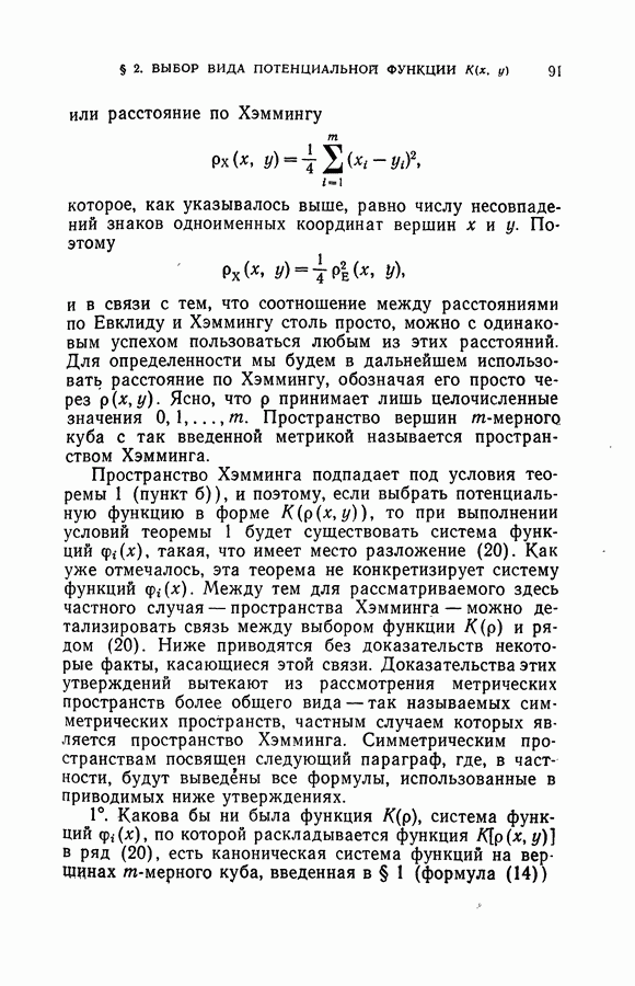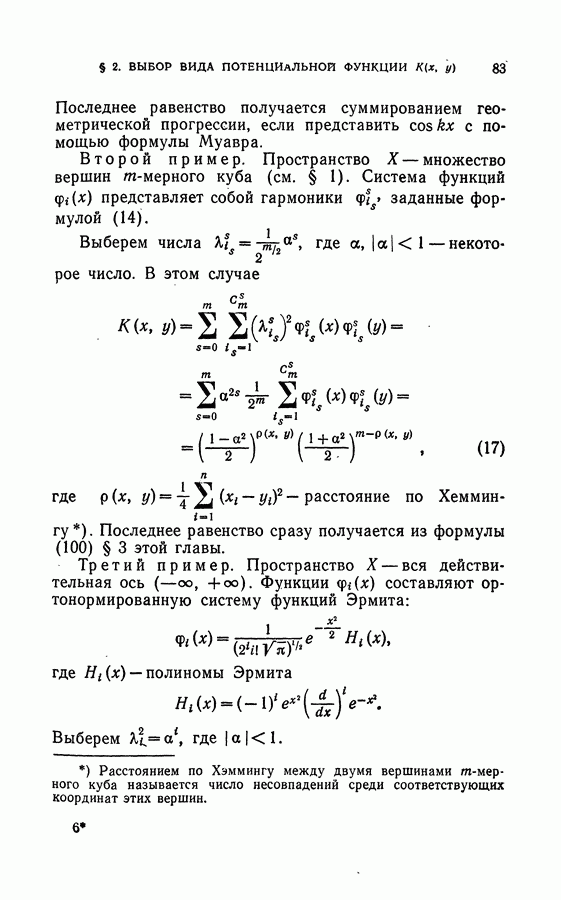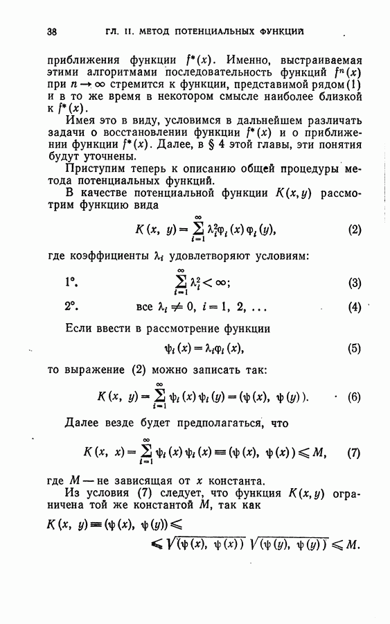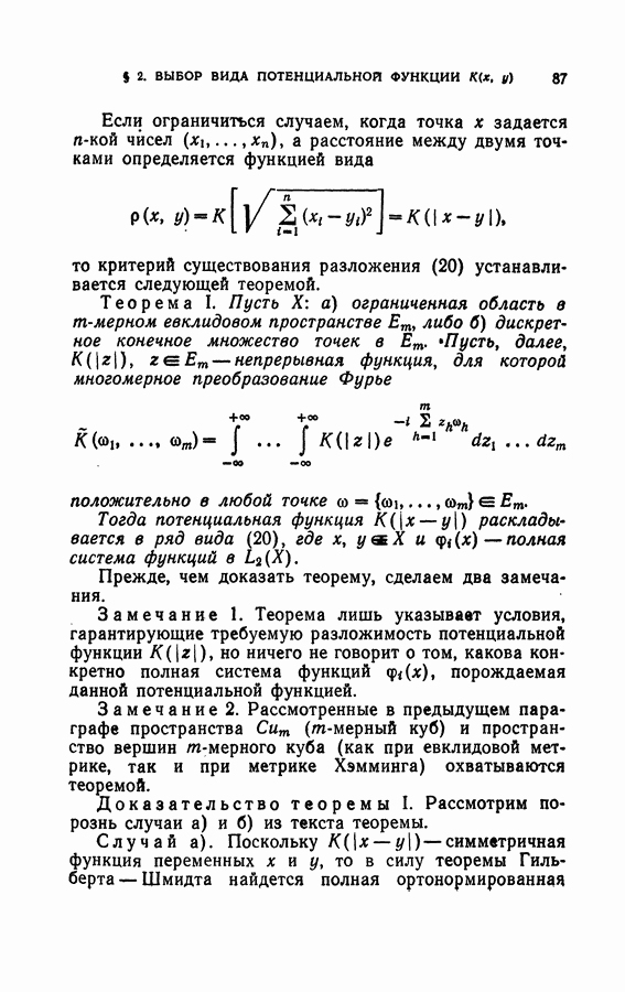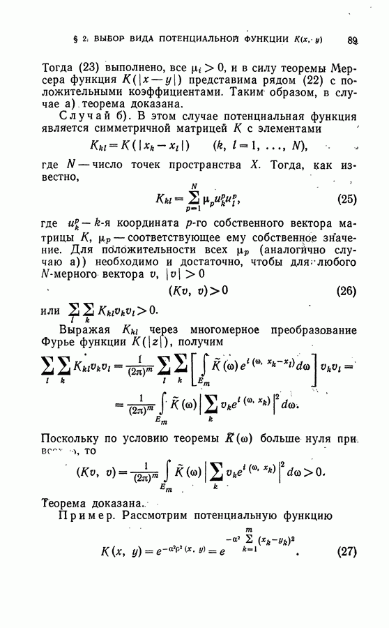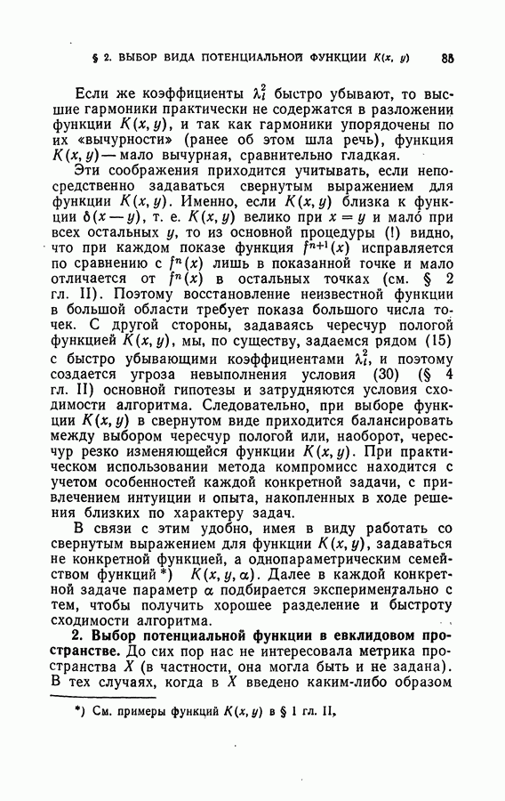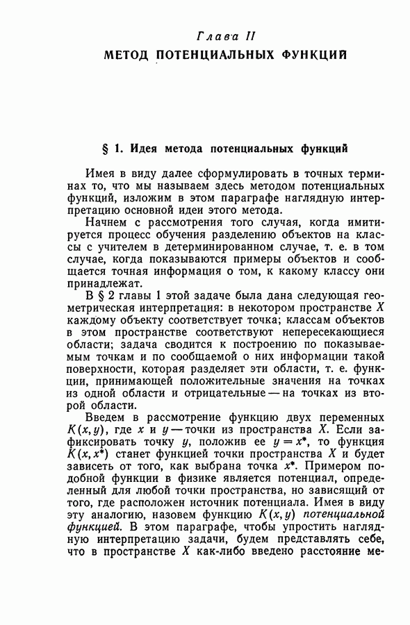 Глава II. МЕТОД ПОТЕНЦИАЛЬНЫХ ФУНКЦИЙ§ 1. Идея метода потенциальных функцийИмея в виду далее сформулировать в точных терминах то, что мы называем здесь методом потенциальных функций, изложим в этом параграфе наглядную интерпретацию основной идеи этого метода. Начнем с рассмотрения того случая, когда имитируется процесс обучения разделению объектов на классы с учителем в детерминированном случае, т. е. в том случае, когда показываются примеры объектов и сообщается точная информация о том, к какому классу они принадлежат. В § 2 главы 1 этой задаче была дана следующая геометрическая интерпретация: в некотором пространстве X каждому объекту соответствует точка; классам объектов в этом пространстве соответствуют непересекающиеся области; задача сводится к построению по показываемым точкам и по сообщаемой о них информации такой поверхности, которая разделяет эти области, т. е. функции, принимающей положительные значения на точках из одной области и отрицательные — на точках из второй области. Введем в рассмотрение функцию двух переменных между точками и что в качестве потенциальной функции а) функция б) она убывает при удалении точки х от точки