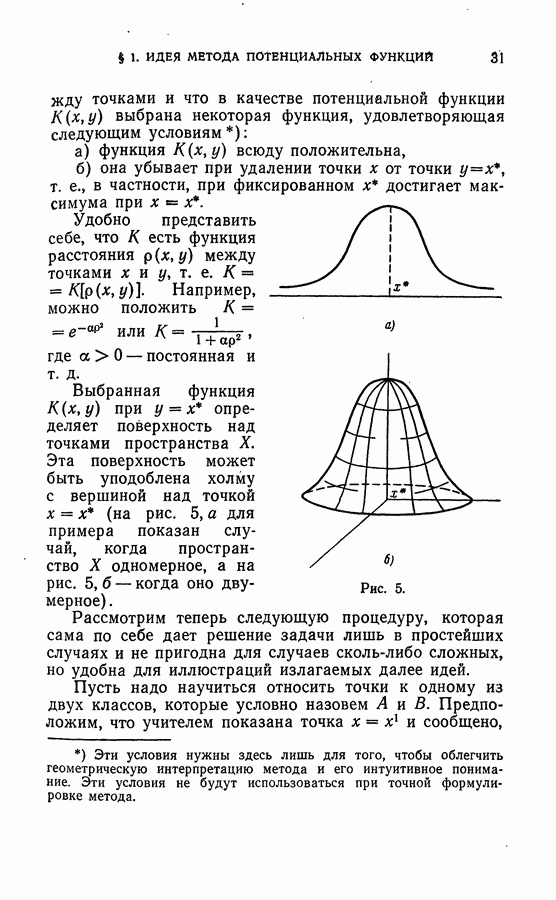 Рис. 5. Удобно представить себе, что К есть функция расстояния Например, можно положить Выбранная функция Эта поверхность может быть уподоблена холму с вершиной над точкой Рассмотрим теперь следующую процедуру, которая сама по себе дает решение задачи лишь в простейших случаях и не пригодна для случаев сколь-либо сложных, но удобна для иллюстраций излагаемых далее идей. Пусть надо научиться относить точки к одному из двух классов, которые условно назовем что она принадлежит к классу А. Примем точку Когда учитель закончит процесс обучения, сложим отдельно потенциалы, которые были построены над точками, принадлежащими классу А, и над точками, принадлежащими В, т. е. построим функции