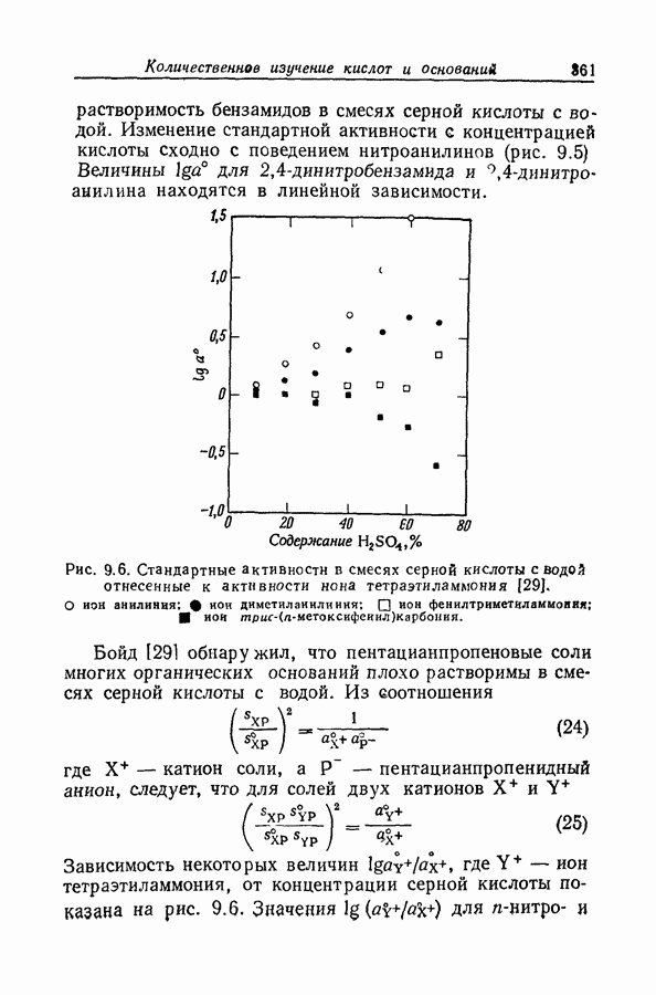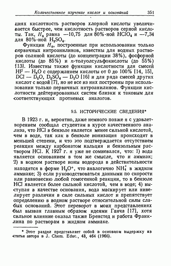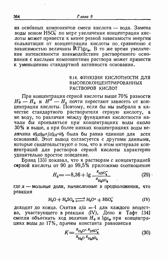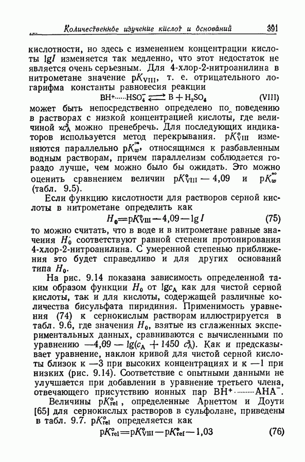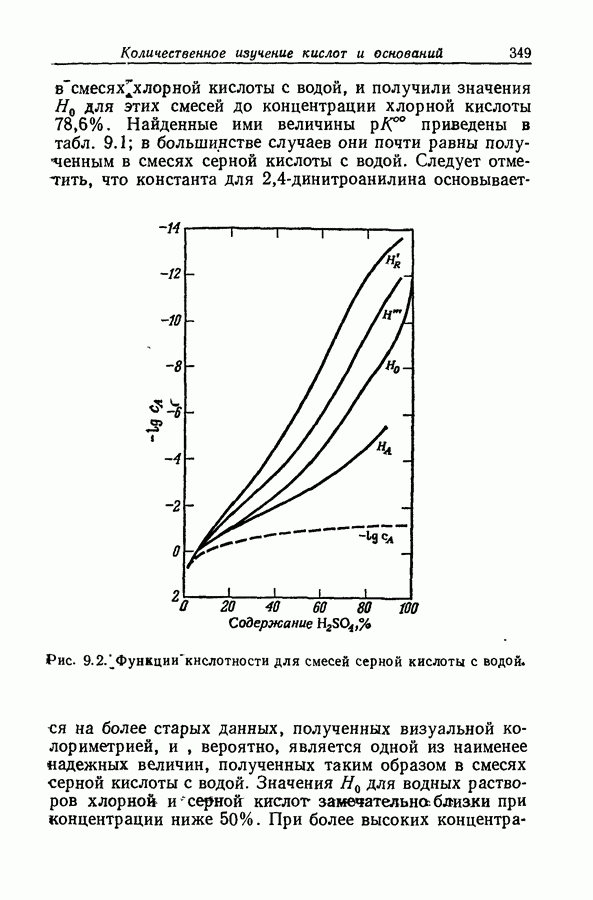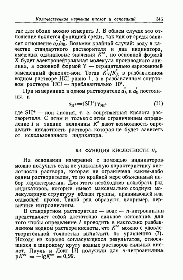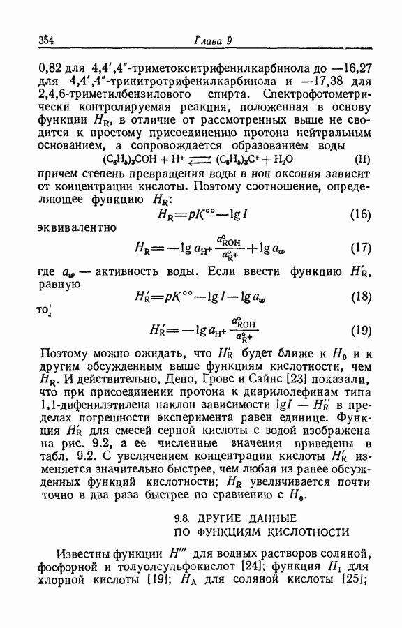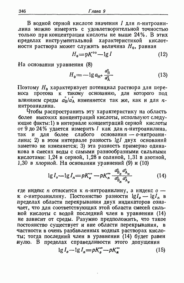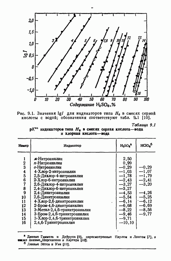 от процентного содержания серной кислоты, полученные Гаммет ом, Чепменсм [28] и Бойдом 129]. В пределах использованных концентраций кислоты ни одно из изученных веществ не подвергается заметному превращению в сопряженную кислоту. Свитинг и Эйтс [30] исследовали