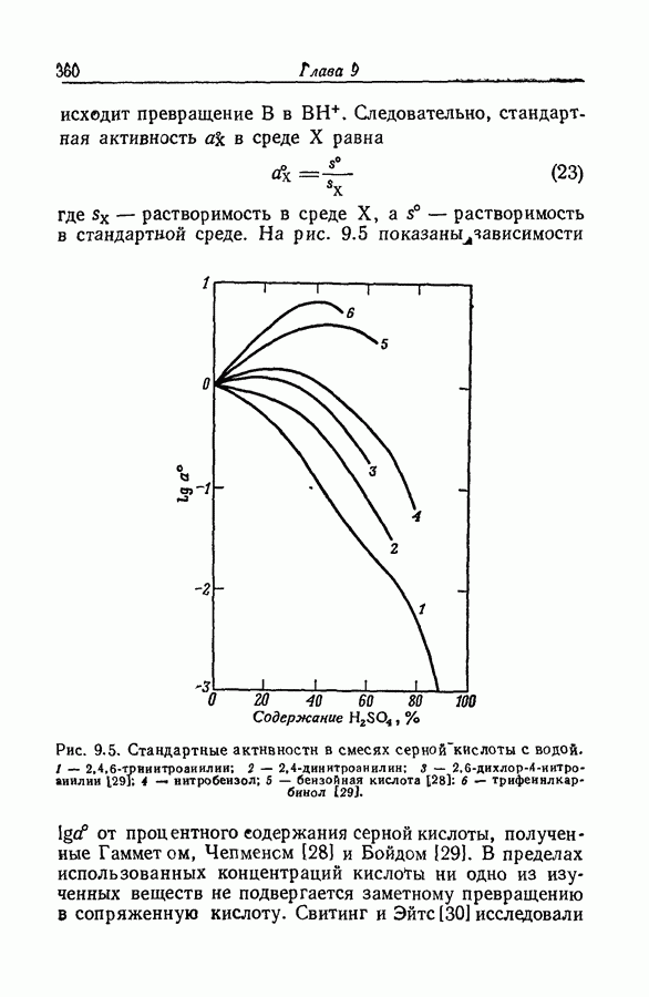 Рис. 9.5. Стандартные активности в смесях сернойкнслоты с водой. 1 — 2,4,6-трииитроаиилии; 2 — 2,4-динитроанилин: 3 — 2,6-дихлор-4-иитро-аиилии [29]; 4 - нитробензол; 5 — бензойная кислота [28]: 5 — трифеинлкарбинол [29].