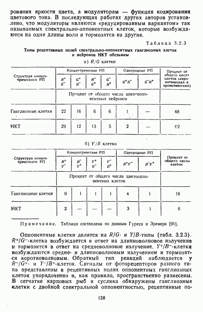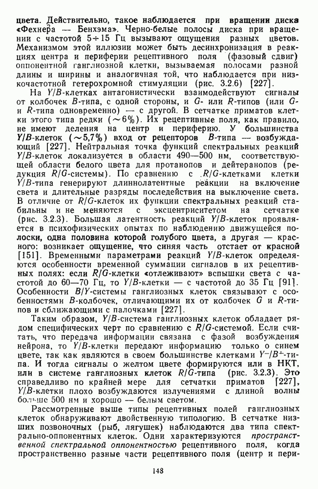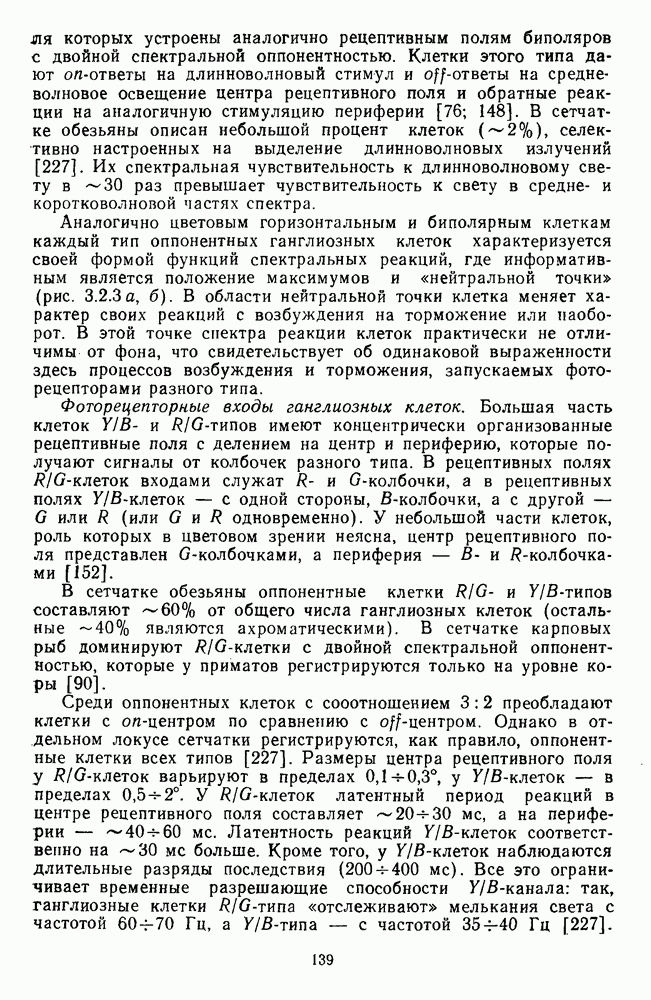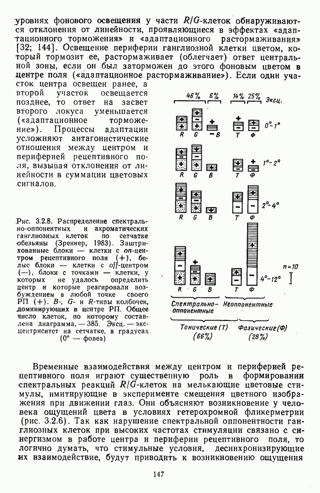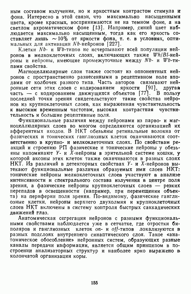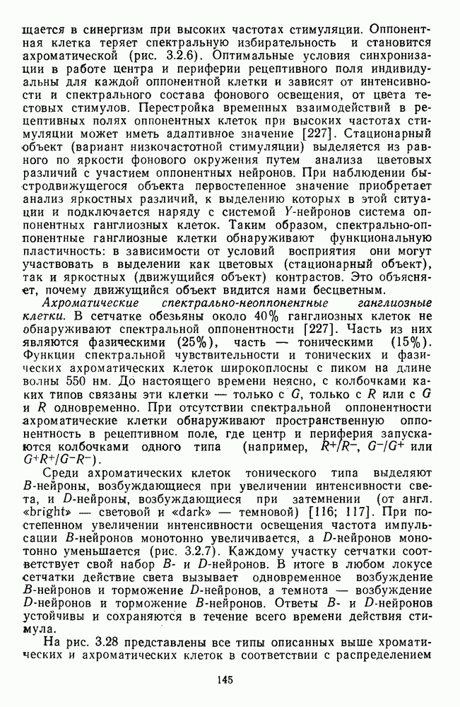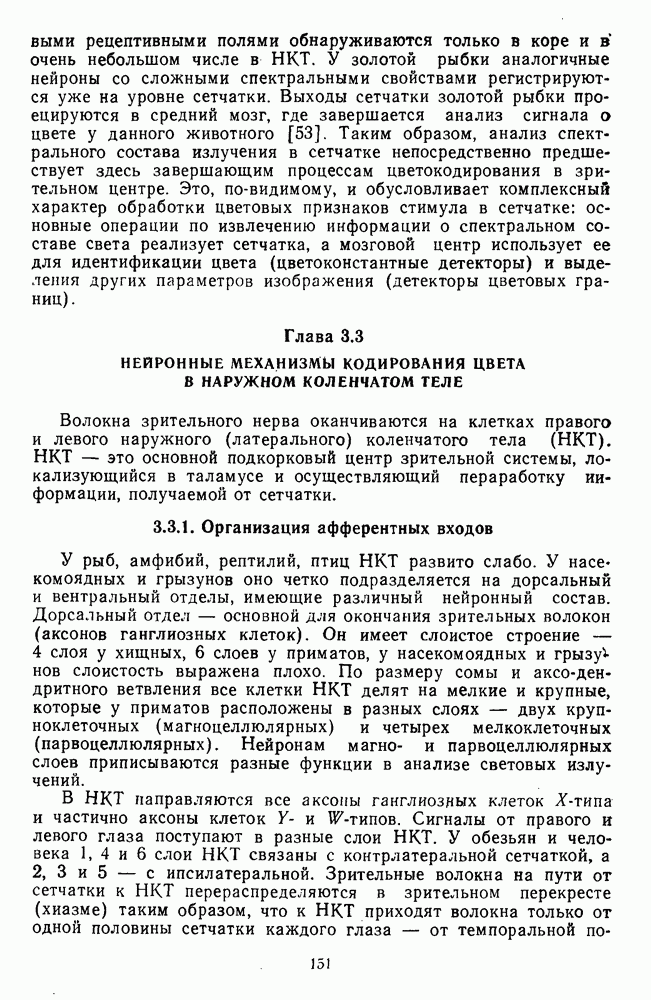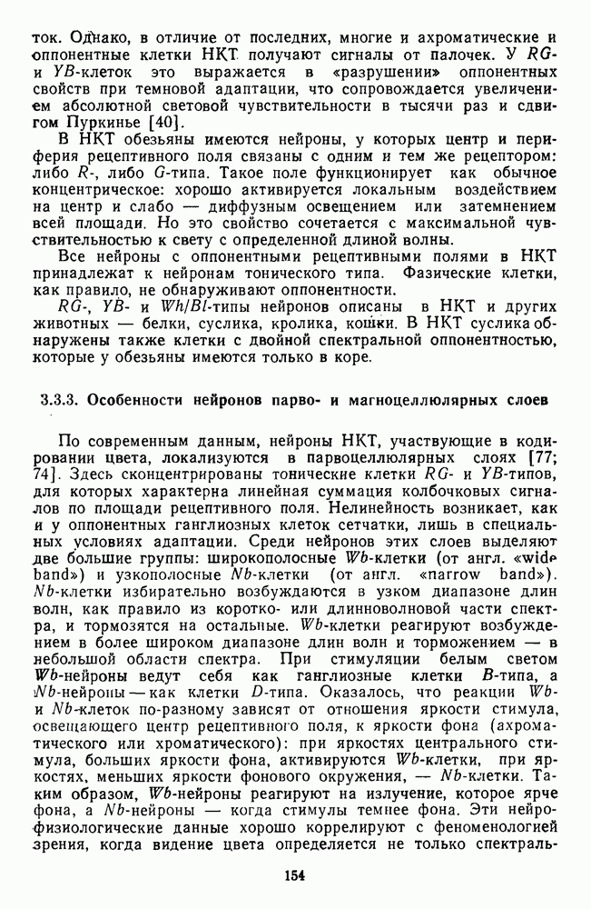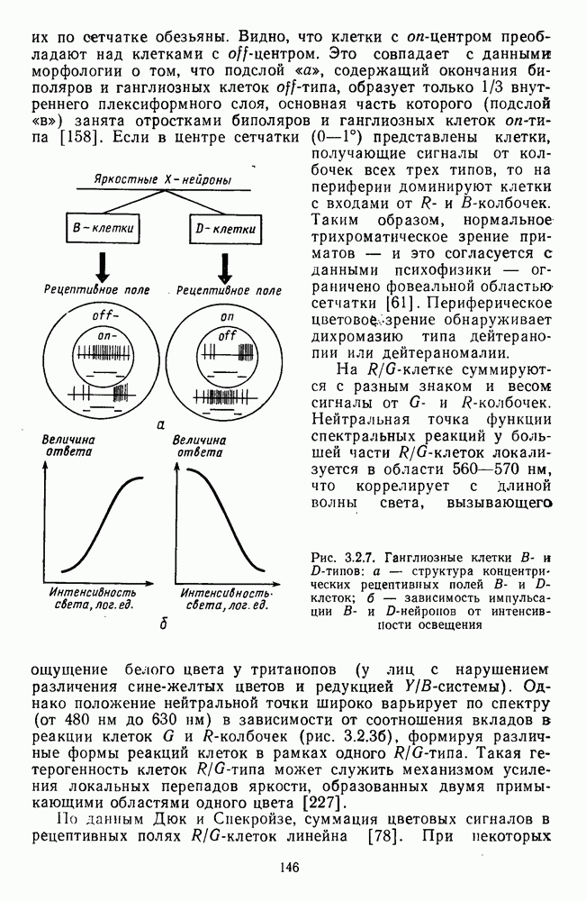 3.3.3. Особенности нейронов парво- и магноцеллюлярных слоевПо современным данным, нейроны НКТ, участвующие в кодировании цвета, локализуются в парвоцеллюлярных слоях [77; 74]. Здесь сконцентрированы тонические клетки спектральным составом излучения, но и яркостным контрастом стимула и фона. Интересно в этой связи, что максимально насыщенными цвета, кроме красных, воспринимаются не на темном фоне, а на светлом ахроматическом фоне [13]. Например, синий цвет наблюдается максимально насыщенным, тогда как его яркость составляет лишь Клетки Магноцеллюлярные слои также состоят из оппонентных нейронов с пространственно разнесенными в рецептивном поле входами от колбочек разного типа. Часть авторов связывают нейронные сети этих слоев с кодированием яркости [93], другая часть — с кодированием движущихся объектов [77]. В пользу последней точки зрения свидетельствуют такие свойства нейронов из крупноклеточных слоев, как выраженная чувствительность к высоким временным частотам, высокая контрастная чувствительность и большие рецептивные поля. Функциональные различия между нейронами из парво- и магноцеллюлярных слоев во многом определяются организацией их афферентных входов. В НКТ обезьяны ретинальные волокна от фазических и тонических ганглиозных клеток оканчиваются соответственно в крупно- и мелкоклеточных слоях. По свойствам реакций и строению РП фазические и тонические нейроны у обезьяны напоминают У- и Х-нейроны в зрительной системе кошки, у которой аксоны этих клеток также оканчиваются в разных слоях НКТ. Из различий в детекторных свойствах Анатомическая сегрегация нейронов с разными функциональными свойствами наблюдается уже в сетчатке, где отростки биполяров и ганглиозных клеток