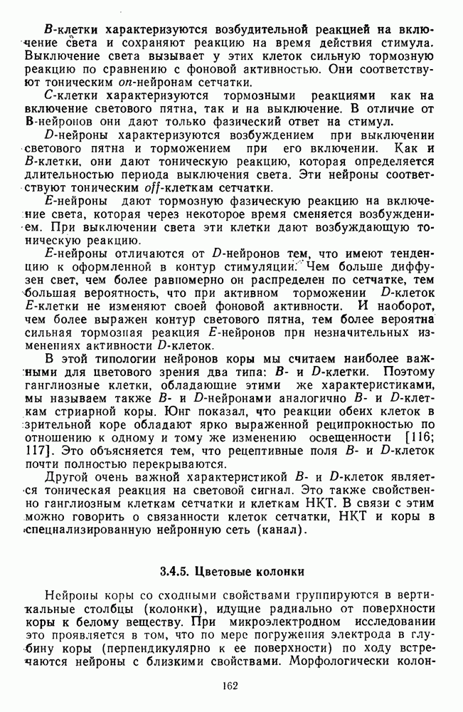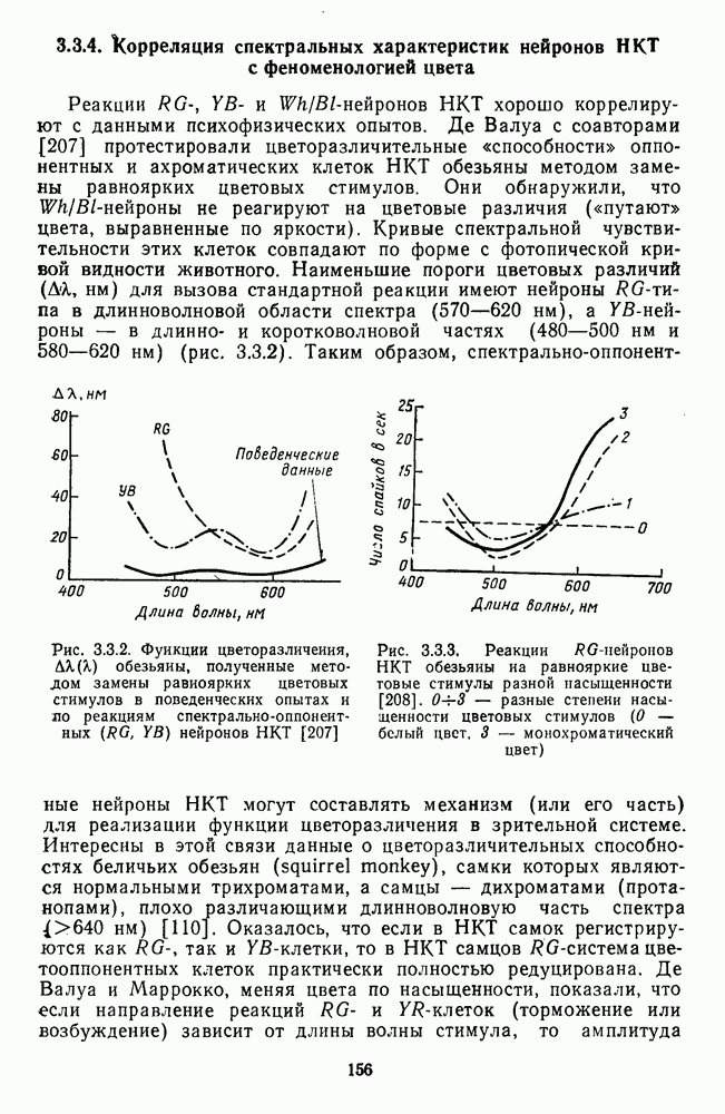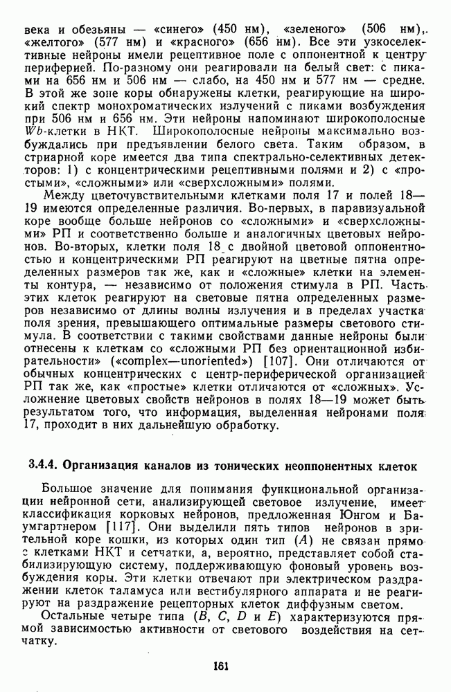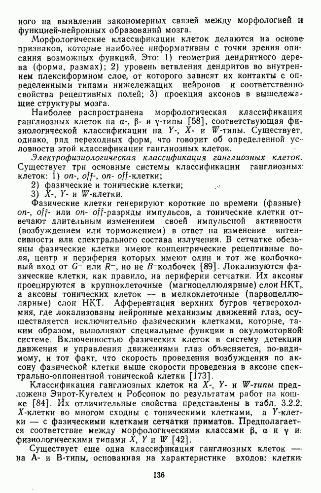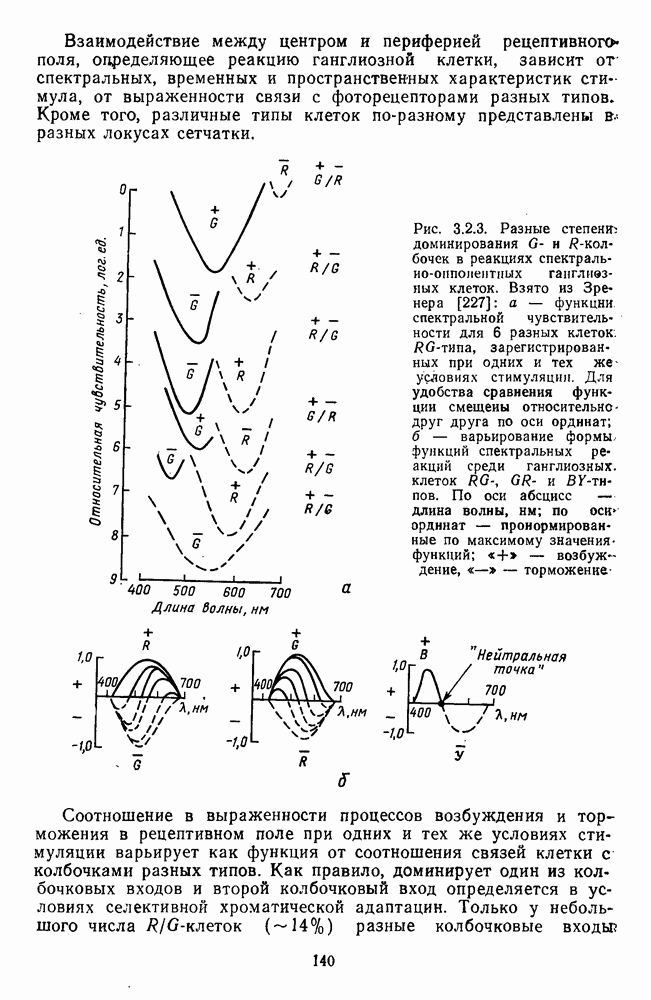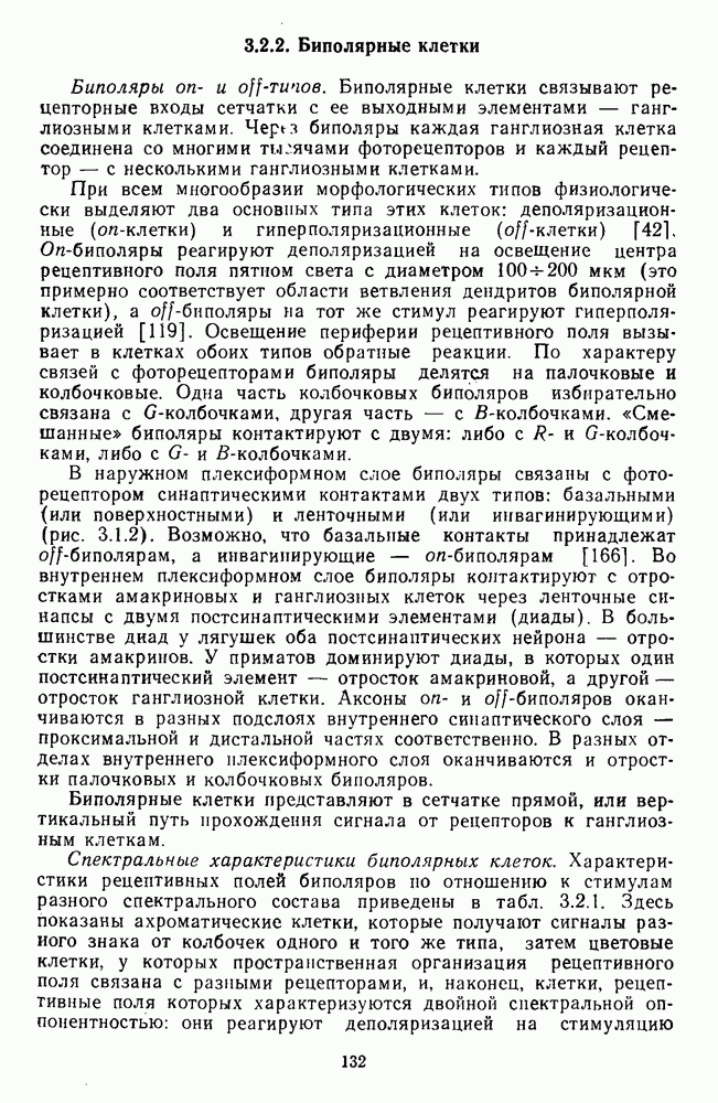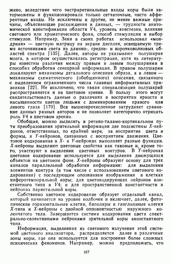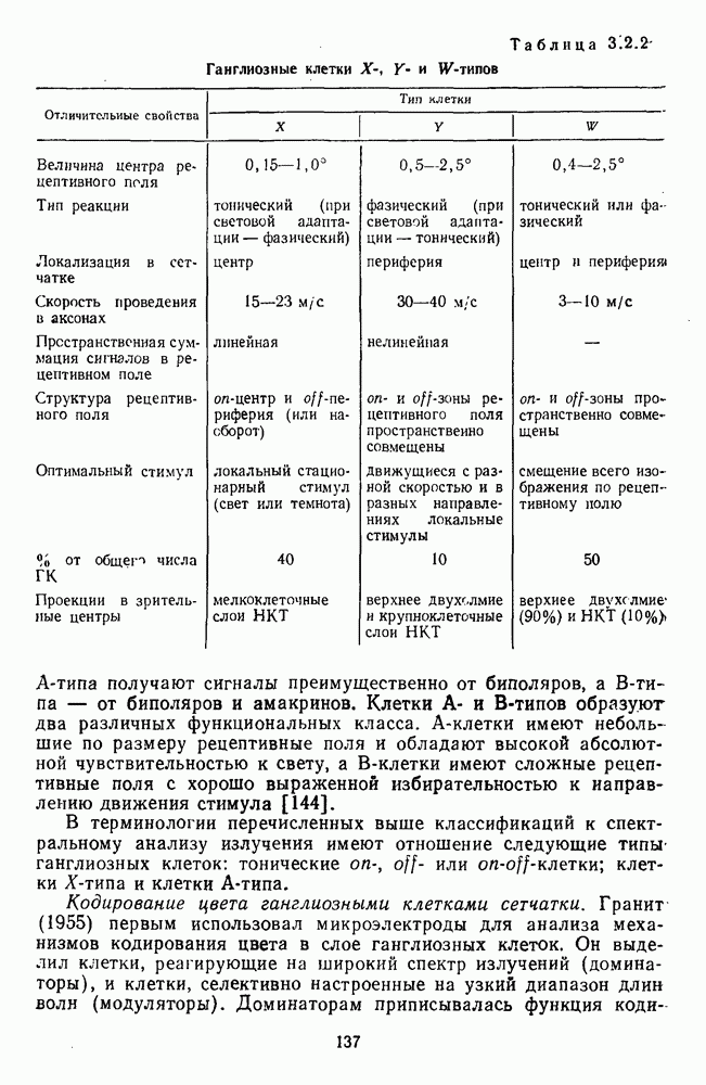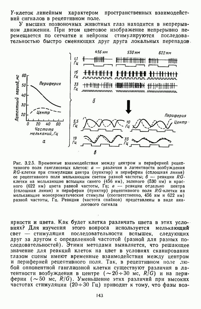 3.3.3. Особенности нейронов парво- и магноцеллюлярных слоевПо современным данным, нейроны НКТ, участвующие в кодировании цвета, локализуются в парвоцеллюлярных слоях [77; 74]. Здесь сконцентрированы тонические клетки спектральным составом излучения, но и яркостным контрастом стимула и фона. Интересно в этой связи, что максимально насыщенными цвета, кроме красных, воспринимаются не на темном фоне, а на светлом ахроматическом фоне [13]. Например, синий цвет наблюдается максимально насыщенным, тогда как его яркость составляет лишь Клетки Магноцеллюлярные слои также состоят из оппонентных нейронов с пространственно разнесенными в рецептивном поле входами от колбочек разного типа. Часть авторов связывают нейронные сети этих слоев с кодированием яркости [93], другая часть — с кодированием движущихся объектов [77]. В пользу последней точки зрения свидетельствуют такие свойства нейронов из крупноклеточных слоев, как выраженная чувствительность к высоким временным частотам, высокая контрастная чувствительность и большие рецептивные поля. Функциональные различия между нейронами из парво- и магноцеллюлярных слоев во многом определяются организацией их афферентных входов. В НКТ обезьяны ретинальные волокна от фазических и тонических ганглиозных клеток оканчиваются соответственно в крупно- и мелкоклеточных слоях. По свойствам реакций и строению РП фазические и тонические нейроны у обезьяны напоминают У- и Х-нейроны в зрительной системе кошки, у которой аксоны этих клеток также оканчиваются в разных слоях НКТ. Из различий в детекторных свойствах Анатомическая сегрегация нейронов с разными функциональными свойствами наблюдается уже в сетчатке, где отростки биполяров и ганглиозных клеток