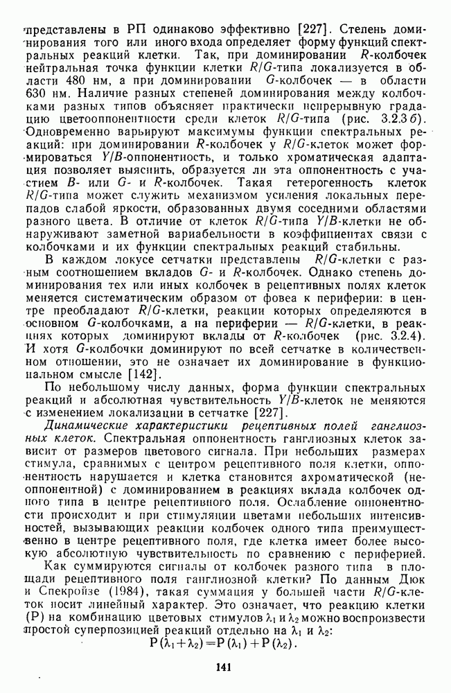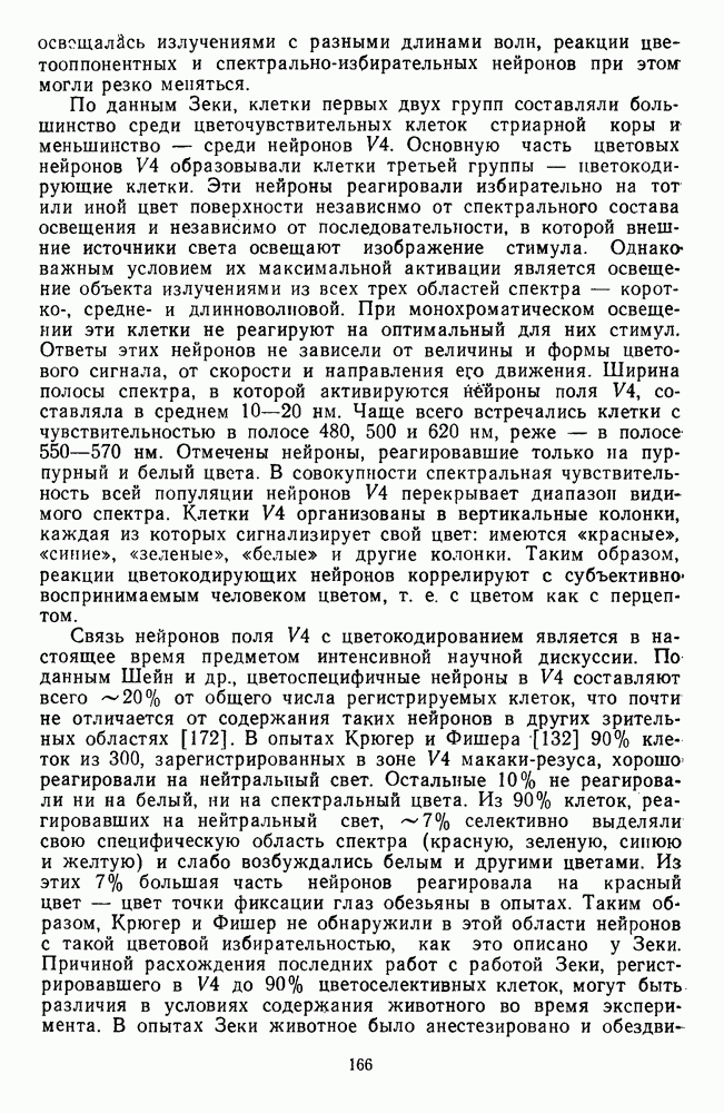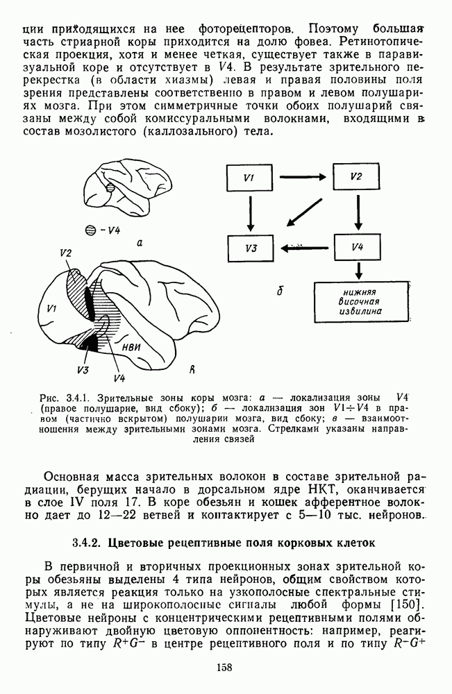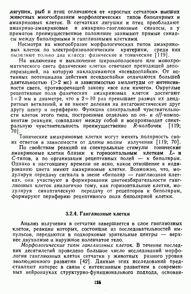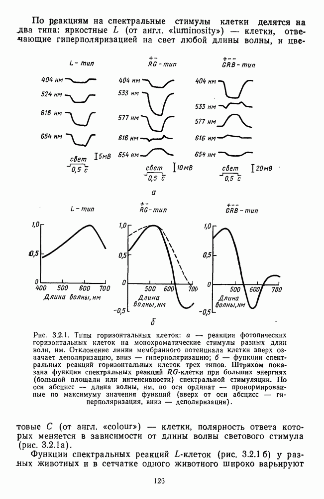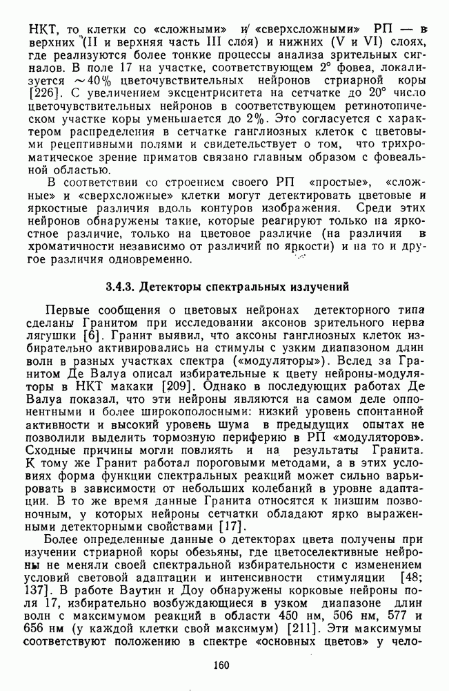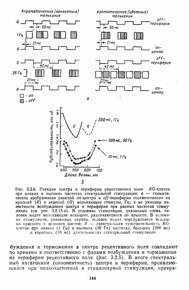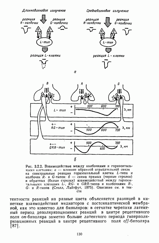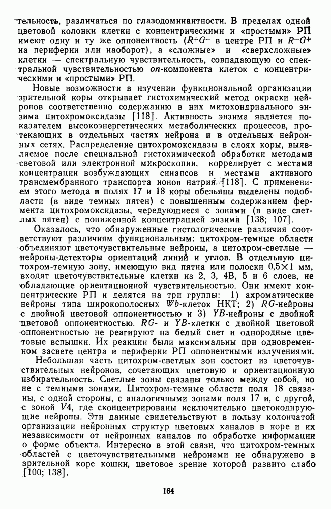 3.3.3. Особенности нейронов парво- и магноцеллюлярных слоевПо современным данным, нейроны НКТ, участвующие в кодировании цвета, локализуются в парвоцеллюлярных слоях [77; 74]. Здесь сконцентрированы тонические клетки спектральным составом излучения, но и яркостным контрастом стимула и фона. Интересно в этой связи, что максимально насыщенными цвета, кроме красных, воспринимаются не на темном фоне, а на светлом ахроматическом фоне [13]. Например, синий цвет наблюдается максимально насыщенным, тогда как его яркость составляет лишь Клетки Магноцеллюлярные слои также состоят из оппонентных нейронов с пространственно разнесенными в рецептивном поле входами от колбочек разного типа. Часть авторов связывают нейронные сети этих слоев с кодированием яркости [93], другая часть — с кодированием движущихся объектов [77]. В пользу последней точки зрения свидетельствуют такие свойства нейронов из крупноклеточных слоев, как выраженная чувствительность к высоким временным частотам, высокая контрастная чувствительность и большие рецептивные поля. Функциональные различия между нейронами из парво- и магноцеллюлярных слоев во многом определяются организацией их афферентных входов. В НКТ обезьяны ретинальные волокна от фазических и тонических ганглиозных клеток оканчиваются соответственно в крупно- и мелкоклеточных слоях. По свойствам реакций и строению РП фазические и тонические нейроны у обезьяны напоминают У- и Х-нейроны в зрительной системе кошки, у которой аксоны этих клеток также оканчиваются в разных слоях НКТ. Из различий в детекторных свойствах Анатомическая сегрегация нейронов с разными функциональными свойствами наблюдается уже в сетчатке, где отростки биполяров и ганглиозных клеток