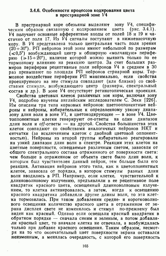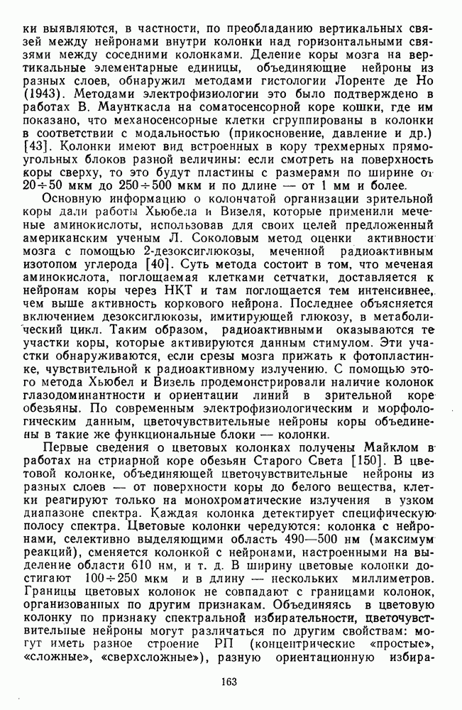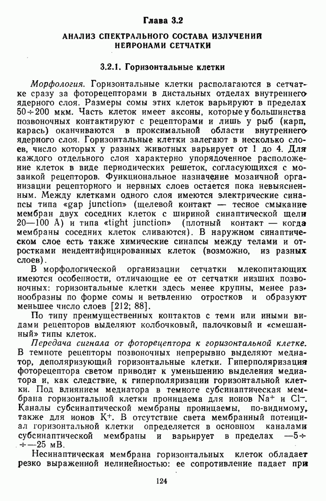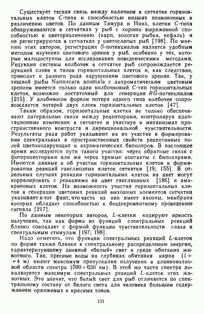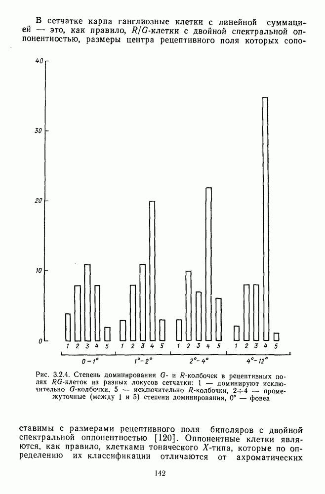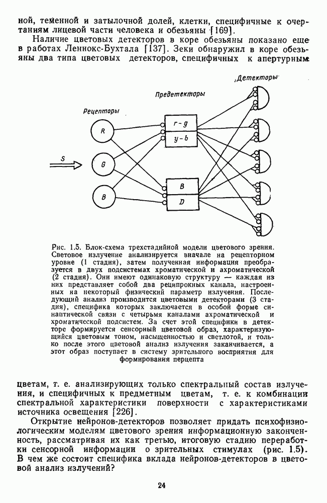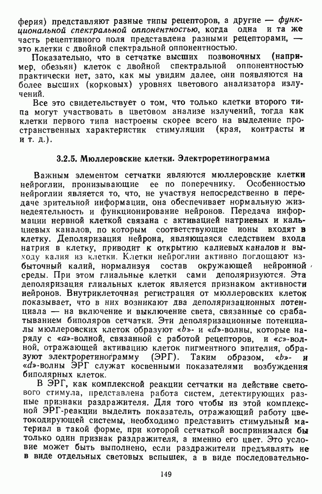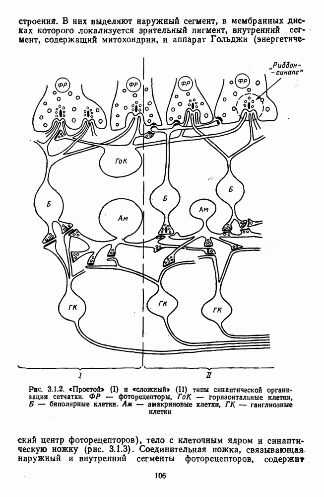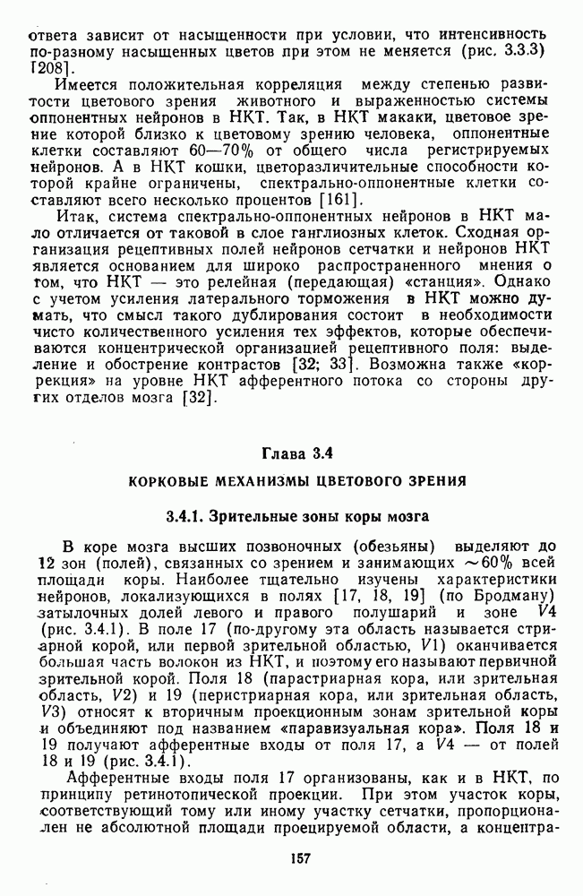 3.3.3. Особенности нейронов парво- и магноцеллюлярных слоевПо современным данным, нейроны НКТ, участвующие в кодировании цвета, локализуются в парвоцеллюлярных слоях [77; 74]. Здесь сконцентрированы тонические клетки спектральным составом излучения, но и яркостным контрастом стимула и фона. Интересно в этой связи, что максимально насыщенными цвета, кроме красных, воспринимаются не на темном фоне, а на светлом ахроматическом фоне [13]. Например, синий цвет наблюдается максимально насыщенным, тогда как его яркость составляет лишь Клетки Магноцеллюлярные слои также состоят из оппонентных нейронов с пространственно разнесенными в рецептивном поле входами от колбочек разного типа. Часть авторов связывают нейронные сети этих слоев с кодированием яркости [93], другая часть — с кодированием движущихся объектов [77]. В пользу последней точки зрения свидетельствуют такие свойства нейронов из крупноклеточных слоев, как выраженная чувствительность к высоким временным частотам, высокая контрастная чувствительность и большие рецептивные поля. Функциональные различия между нейронами из парво- и магноцеллюлярных слоев во многом определяются организацией их афферентных входов. В НКТ обезьяны ретинальные волокна от фазических и тонических ганглиозных клеток оканчиваются соответственно в крупно- и мелкоклеточных слоях. По свойствам реакций и строению РП фазические и тонические нейроны у обезьяны напоминают У- и Х-нейроны в зрительной системе кошки, у которой аксоны этих клеток также оканчиваются в разных слоях НКТ. Из различий в детекторных свойствах Анатомическая сегрегация нейронов с разными функциональными свойствами наблюдается уже в сетчатке, где отростки биполяров и ганглиозных клеток
