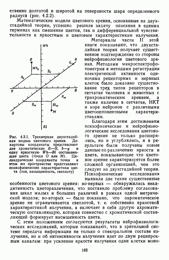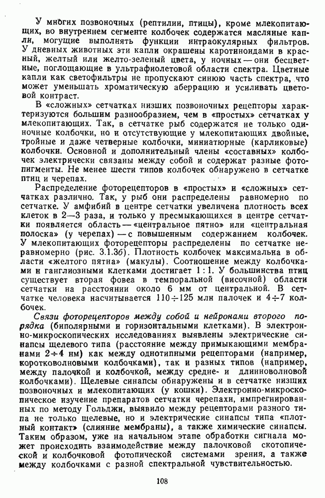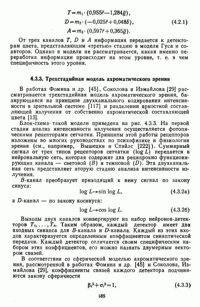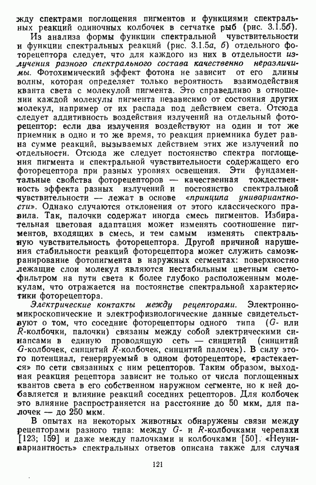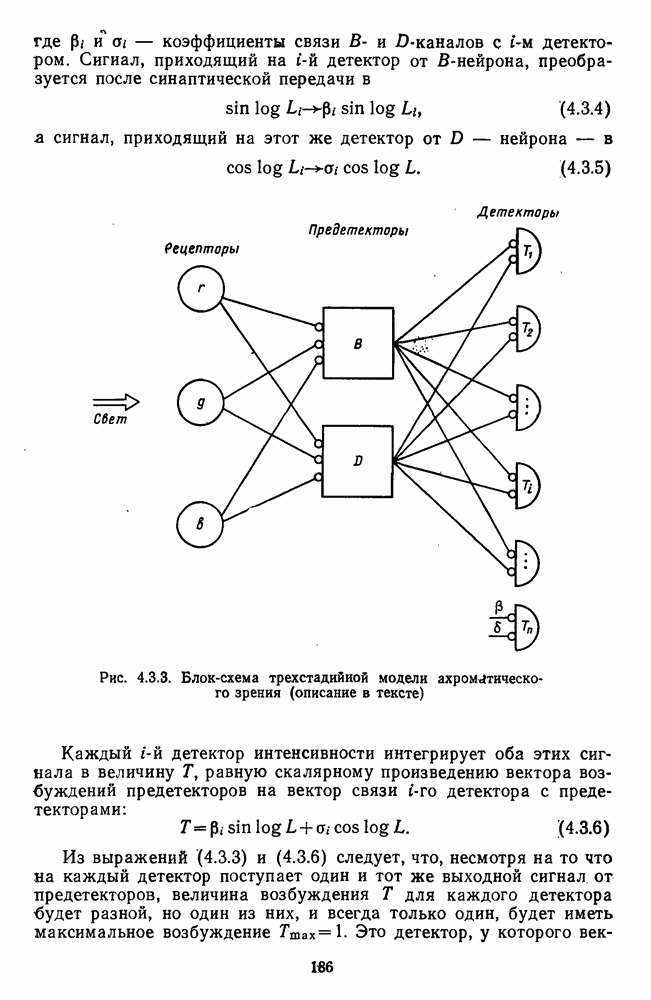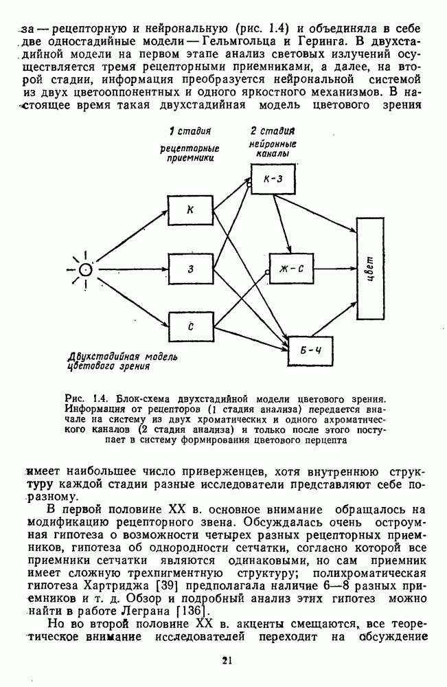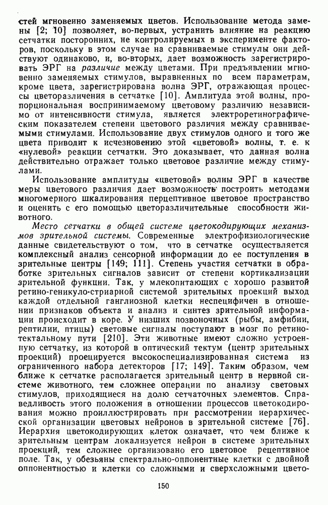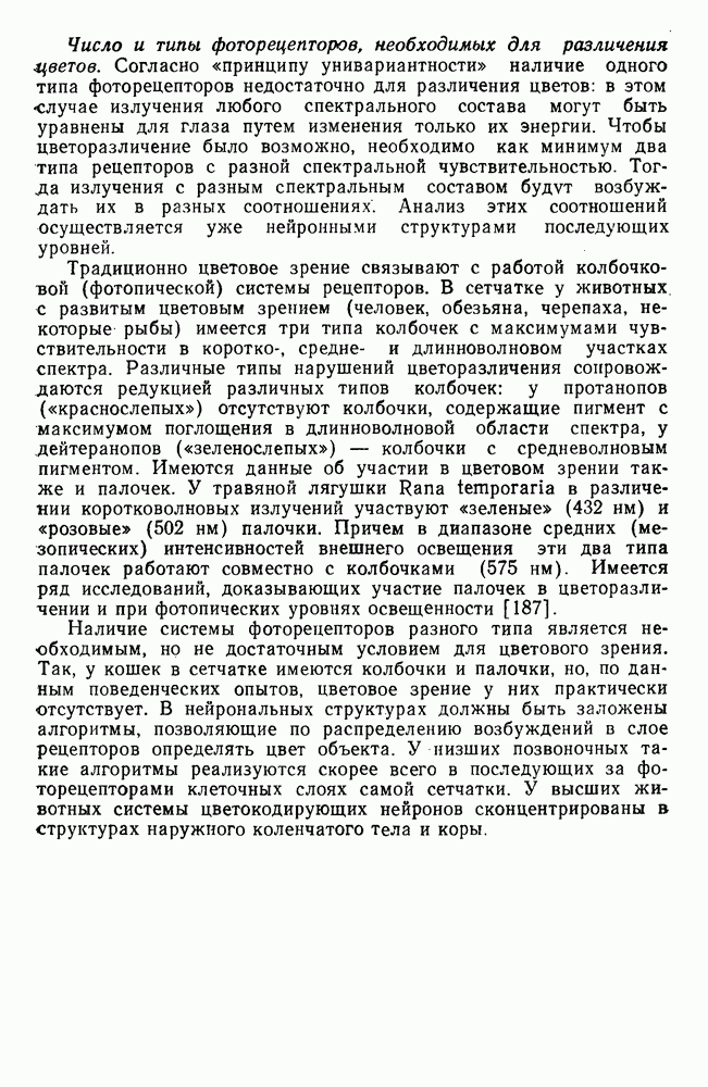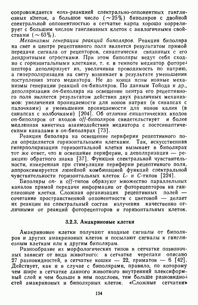 3.3.3. Особенности нейронов парво- и магноцеллюлярных слоевПо современным данным, нейроны НКТ, участвующие в кодировании цвета, локализуются в парвоцеллюлярных слоях [77; 74]. Здесь сконцентрированы тонические клетки спектральным составом излучения, но и яркостным контрастом стимула и фона. Интересно в этой связи, что максимально насыщенными цвета, кроме красных, воспринимаются не на темном фоне, а на светлом ахроматическом фоне [13]. Например, синий цвет наблюдается максимально насыщенным, тогда как его яркость составляет лишь Клетки Магноцеллюлярные слои также состоят из оппонентных нейронов с пространственно разнесенными в рецептивном поле входами от колбочек разного типа. Часть авторов связывают нейронные сети этих слоев с кодированием яркости [93], другая часть — с кодированием движущихся объектов [77]. В пользу последней точки зрения свидетельствуют такие свойства нейронов из крупноклеточных слоев, как выраженная чувствительность к высоким временным частотам, высокая контрастная чувствительность и большие рецептивные поля. Функциональные различия между нейронами из парво- и магноцеллюлярных слоев во многом определяются организацией их афферентных входов. В НКТ обезьяны ретинальные волокна от фазических и тонических ганглиозных клеток оканчиваются соответственно в крупно- и мелкоклеточных слоях. По свойствам реакций и строению РП фазические и тонические нейроны у обезьяны напоминают У- и Х-нейроны в зрительной системе кошки, у которой аксоны этих клеток также оканчиваются в разных слоях НКТ. Из различий в детекторных свойствах Анатомическая сегрегация нейронов с разными функциональными свойствами наблюдается уже в сетчатке, где отростки биполяров и ганглиозных клеток