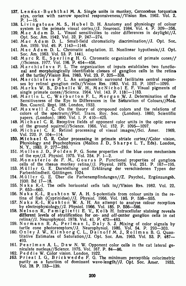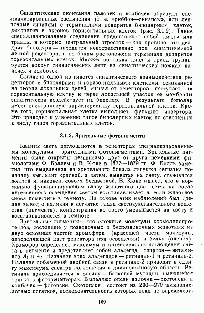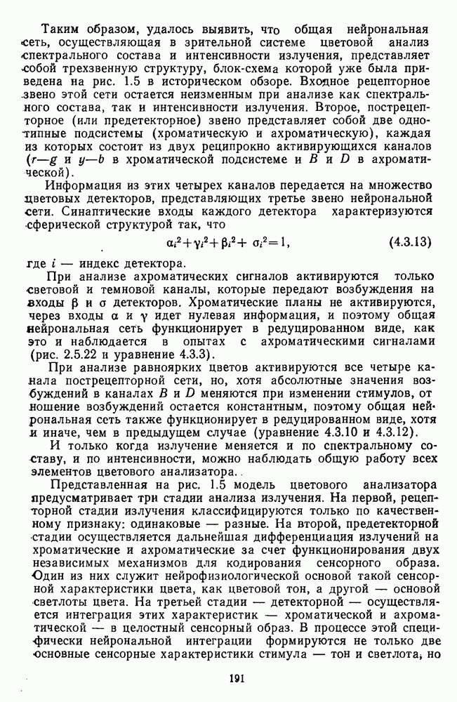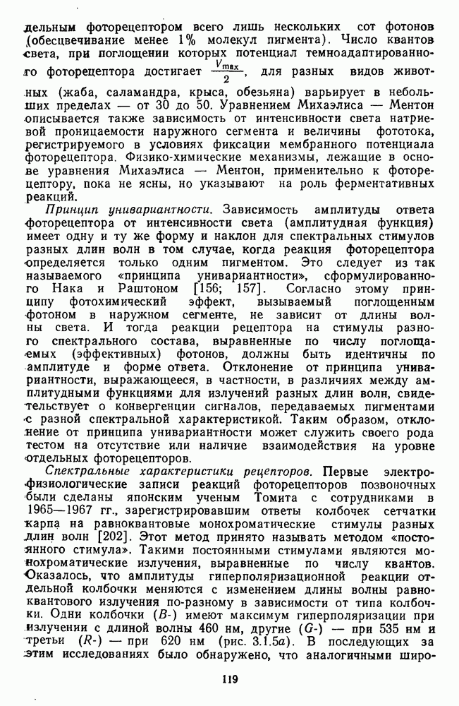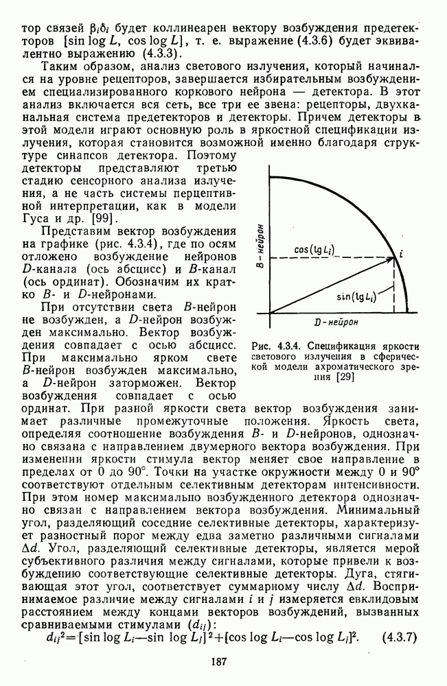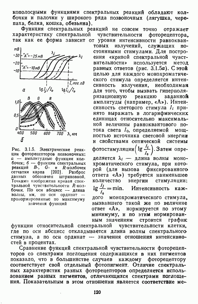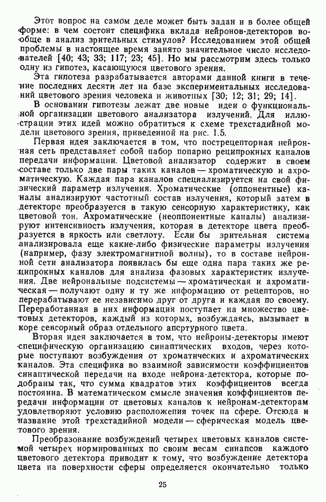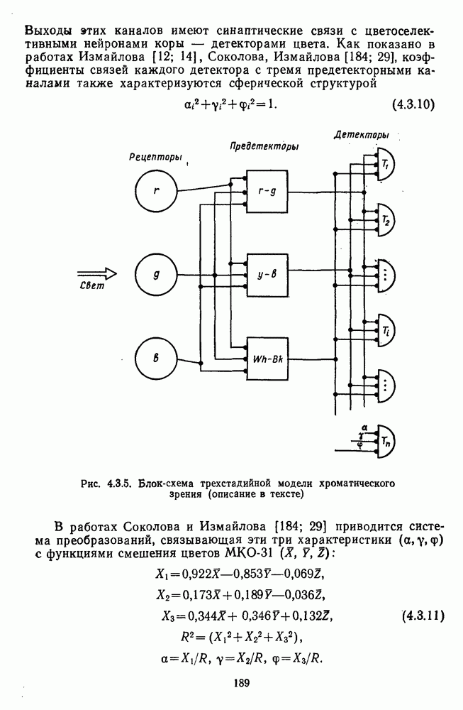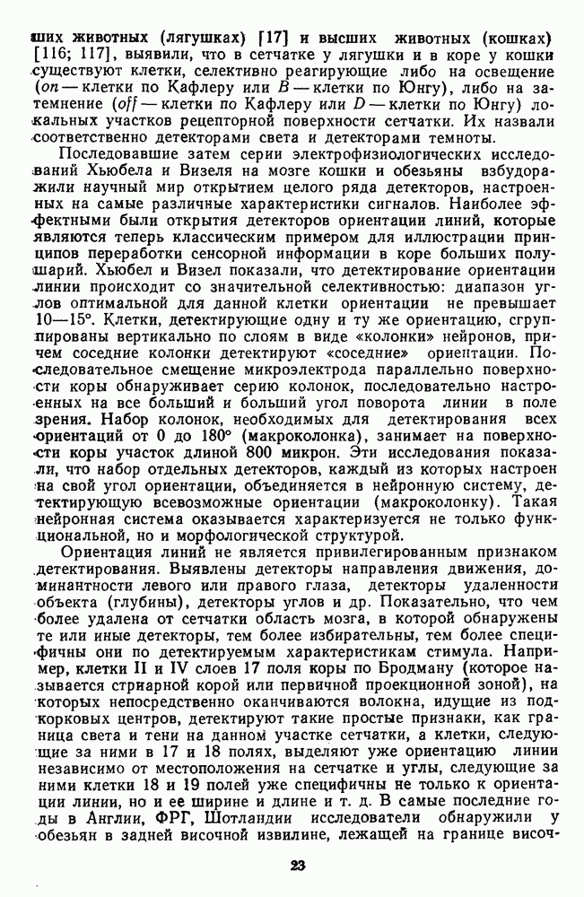 3.3.3. Особенности нейронов парво- и магноцеллюлярных слоевПо современным данным, нейроны НКТ, участвующие в кодировании цвета, локализуются в парвоцеллюлярных слоях [77; 74]. Здесь сконцентрированы тонические клетки спектральным составом излучения, но и яркостным контрастом стимула и фона. Интересно в этой связи, что максимально насыщенными цвета, кроме красных, воспринимаются не на темном фоне, а на светлом ахроматическом фоне [13]. Например, синий цвет наблюдается максимально насыщенным, тогда как его яркость составляет лишь Клетки Магноцеллюлярные слои также состоят из оппонентных нейронов с пространственно разнесенными в рецептивном поле входами от колбочек разного типа. Часть авторов связывают нейронные сети этих слоев с кодированием яркости [93], другая часть — с кодированием движущихся объектов [77]. В пользу последней точки зрения свидетельствуют такие свойства нейронов из крупноклеточных слоев, как выраженная чувствительность к высоким временным частотам, высокая контрастная чувствительность и большие рецептивные поля. Функциональные различия между нейронами из парво- и магноцеллюлярных слоев во многом определяются организацией их афферентных входов. В НКТ обезьяны ретинальные волокна от фазических и тонических ганглиозных клеток оканчиваются соответственно в крупно- и мелкоклеточных слоях. По свойствам реакций и строению РП фазические и тонические нейроны у обезьяны напоминают У- и Х-нейроны в зрительной системе кошки, у которой аксоны этих клеток также оканчиваются в разных слоях НКТ. Из различий в детекторных свойствах Анатомическая сегрегация нейронов с разными функциональными свойствами наблюдается уже в сетчатке, где отростки биполяров и ганглиозных клеток