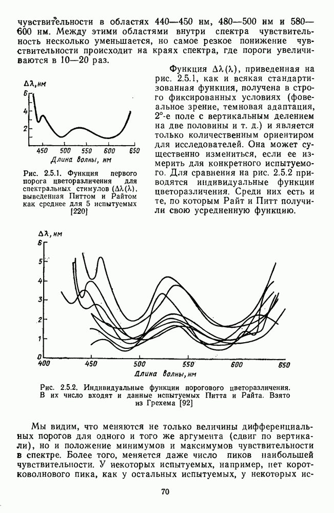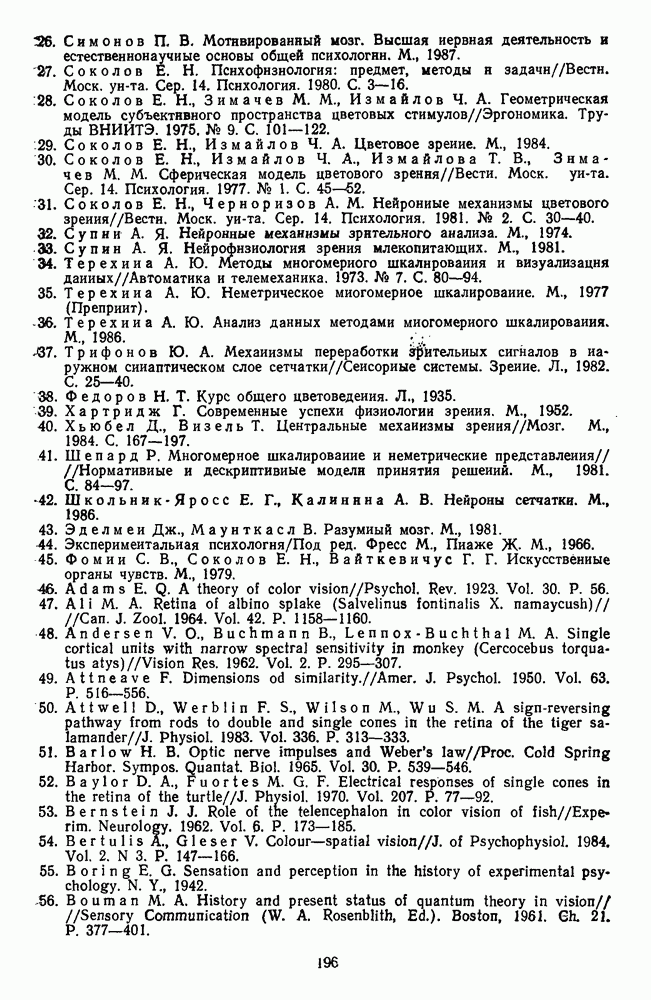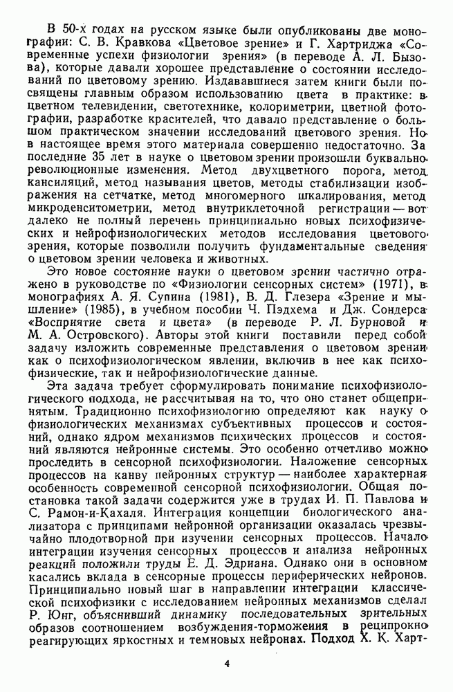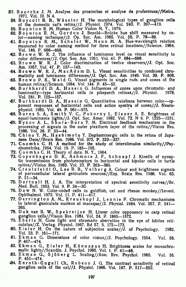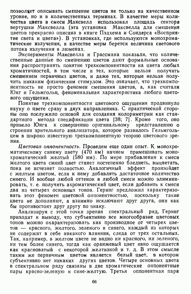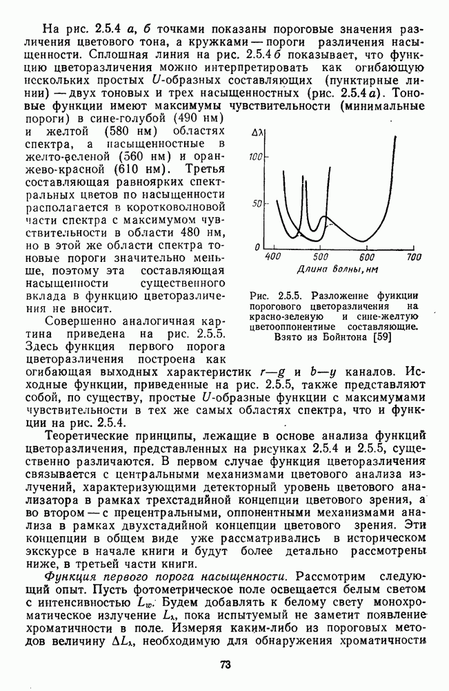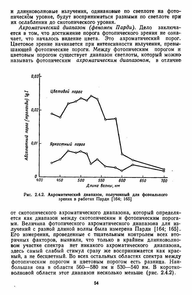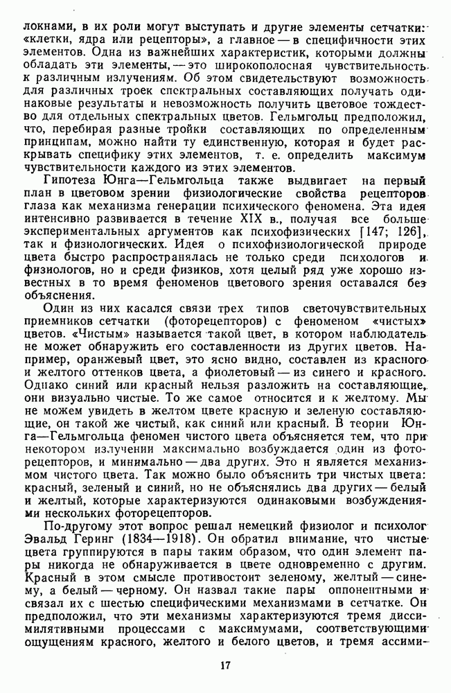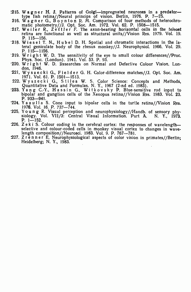 3.3.3. Особенности нейронов парво- и магноцеллюлярных слоевПо современным данным, нейроны НКТ, участвующие в кодировании цвета, локализуются в парвоцеллюлярных слоях [77; 74]. Здесь сконцентрированы тонические клетки спектральным составом излучения, но и яркостным контрастом стимула и фона. Интересно в этой связи, что максимально насыщенными цвета, кроме красных, воспринимаются не на темном фоне, а на светлом ахроматическом фоне [13]. Например, синий цвет наблюдается максимально насыщенным, тогда как его яркость составляет лишь Клетки Магноцеллюлярные слои также состоят из оппонентных нейронов с пространственно разнесенными в рецептивном поле входами от колбочек разного типа. Часть авторов связывают нейронные сети этих слоев с кодированием яркости [93], другая часть — с кодированием движущихся объектов [77]. В пользу последней точки зрения свидетельствуют такие свойства нейронов из крупноклеточных слоев, как выраженная чувствительность к высоким временным частотам, высокая контрастная чувствительность и большие рецептивные поля. Функциональные различия между нейронами из парво- и магноцеллюлярных слоев во многом определяются организацией их афферентных входов. В НКТ обезьяны ретинальные волокна от фазических и тонических ганглиозных клеток оканчиваются соответственно в крупно- и мелкоклеточных слоях. По свойствам реакций и строению РП фазические и тонические нейроны у обезьяны напоминают У- и Х-нейроны в зрительной системе кошки, у которой аксоны этих клеток также оканчиваются в разных слоях НКТ. Из различий в детекторных свойствах Анатомическая сегрегация нейронов с разными функциональными свойствами наблюдается уже в сетчатке, где отростки биполяров и ганглиозных клеток
