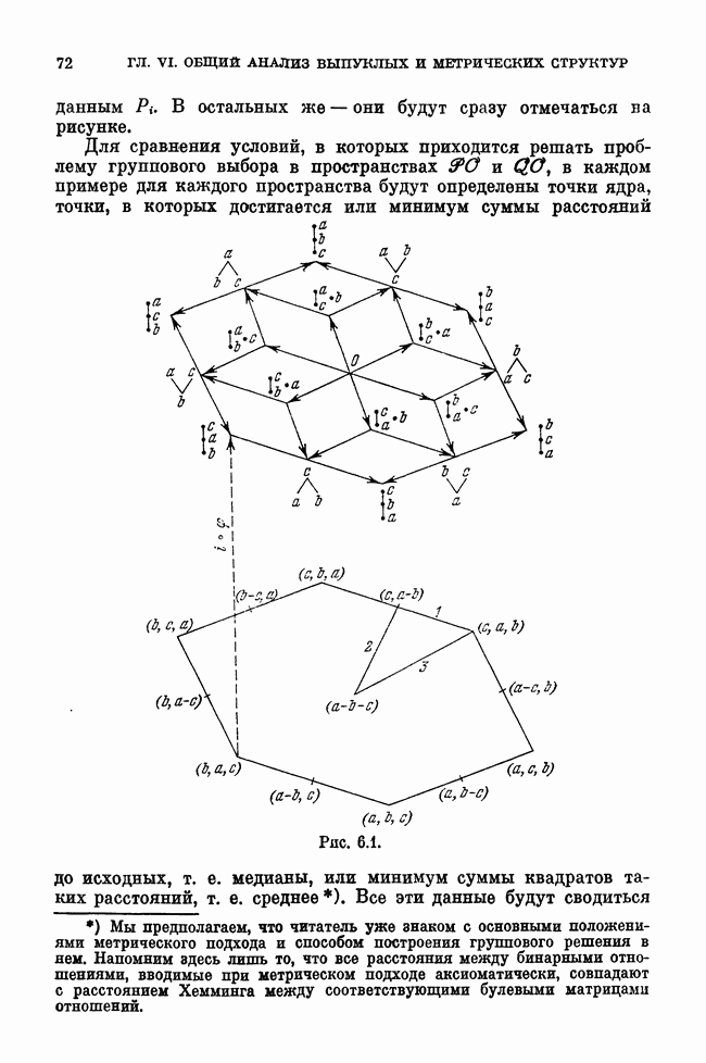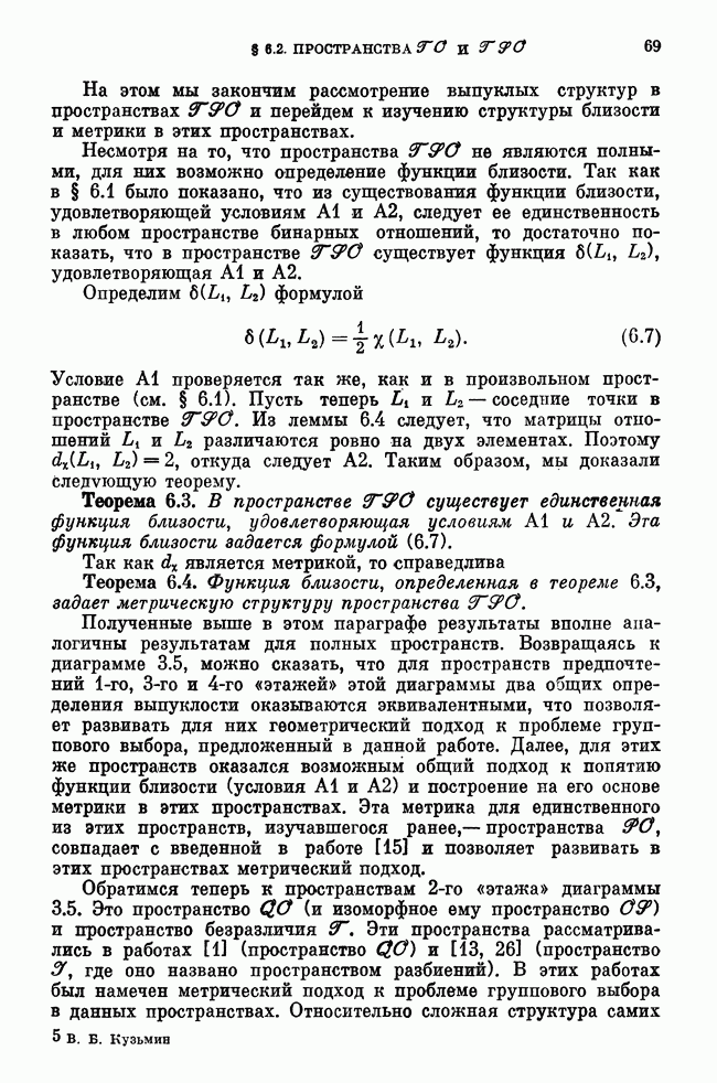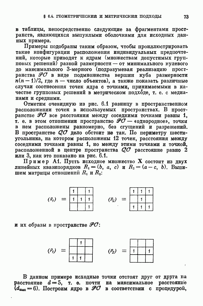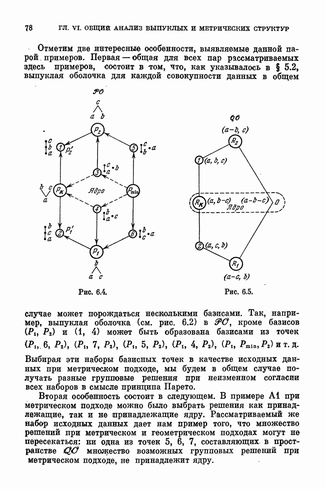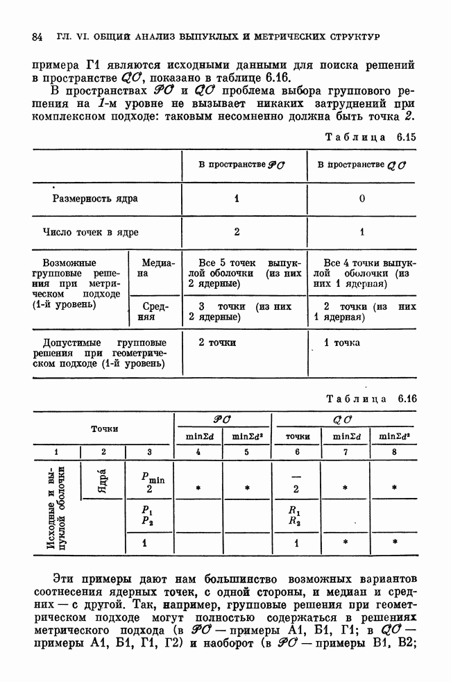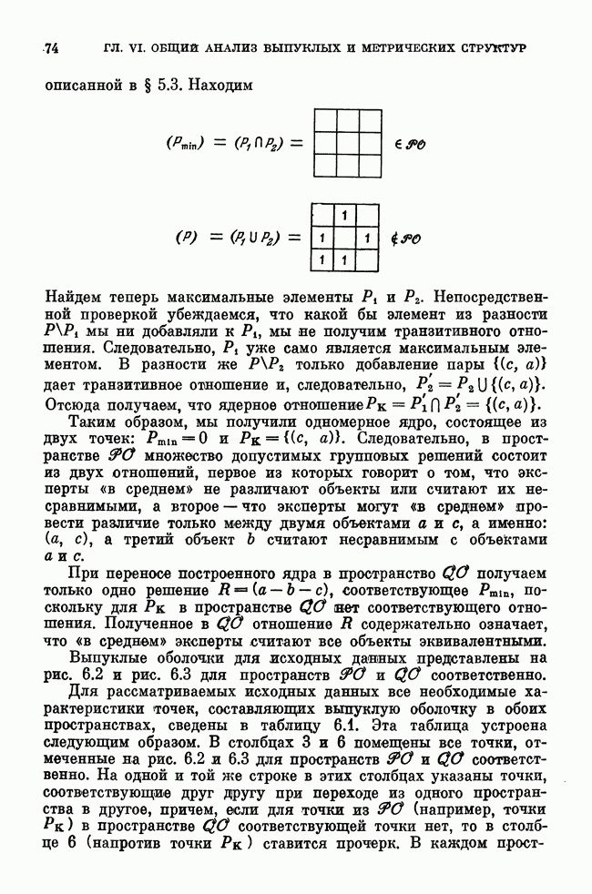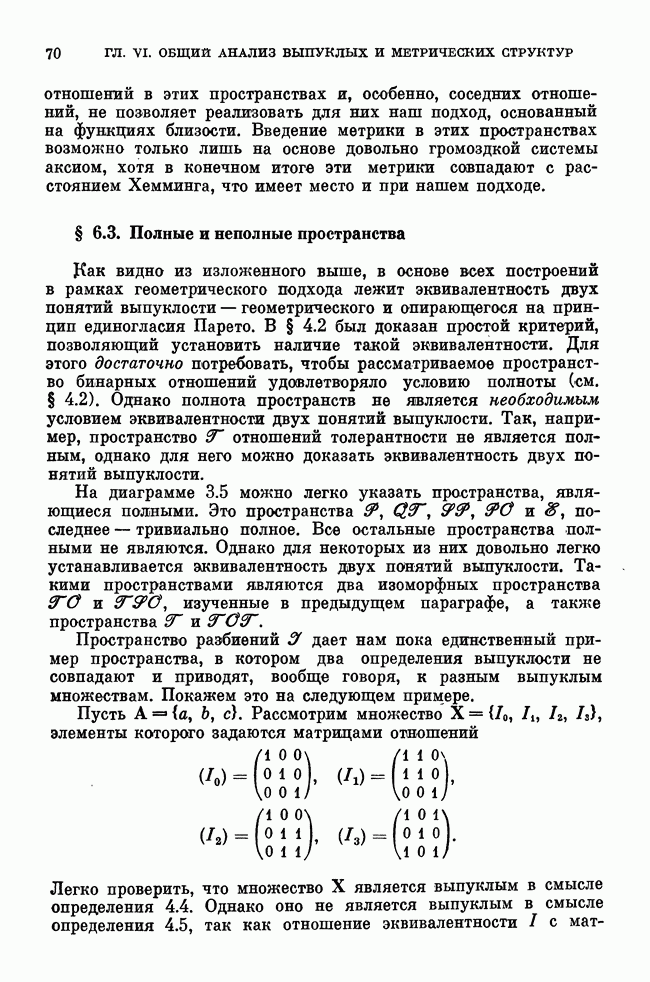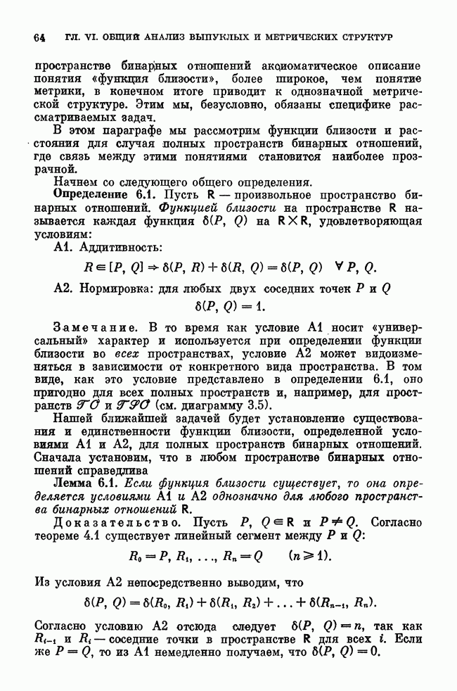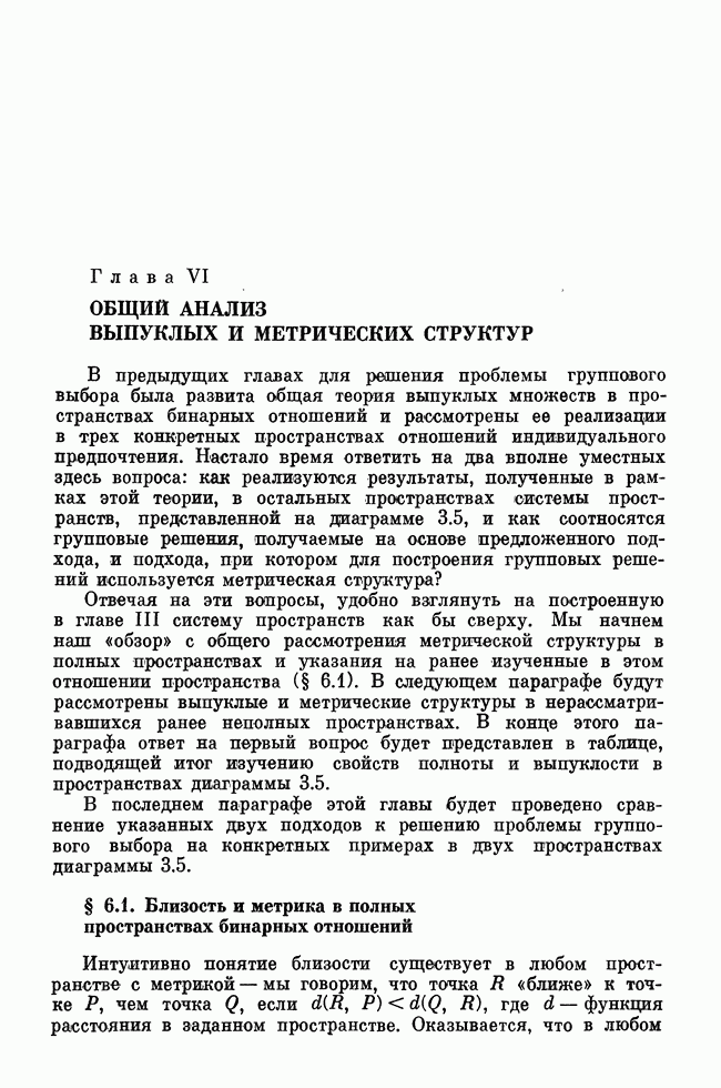Глава VI. ОБЩИЙ АНАЛИЗ ВЫПУКЛЫХ И МЕТРИЧЕСКИХ СТРУКТУРВ предыдущих главах для решения проблемы группового выбора была развита общая теория выпуклых множеств в пространствах бинарных отношений и рассмотрены ее реализации в трех конкретных пространствах отношений индивидуального предпочтения. Настало время ответить на два вполне уместных здесь вопроса: как реализуются результаты, полученные в рамках этой теории, в остальных пространствах системы пространств, представленной на диаграмме 3.5, и как соотносятся групповые решения, получаемые на основе предложенного подхода, и подхода, при котором для построения групповых решений используется метрическая структура? Отвечая на эти вопросы, удобно взглянуть на построенную в главе III систему пространств как бы сверху. Мы начнем наш «обзор» с общего рассмотрения метрической структуры в полных пространствах и указания на ранее изученные в этом отношении пространства (§ 6.1). В следующем параграфе будут рассмотрены выпуклые и метрические структуры в рассматривавшихся ранее неполных пространствах. В конце этого параграфа ответ на первый вопрос будет представлен в таблице, подводящей итог изучению свойств полноты и выпуклости в пространствах диаграммы 3.5. В последнем параграфе этой главы будет проведено сравнение указанных двух подходов к решению проблемы группового выбора на конкретных примерах в двух пространствах диаграммы 3.5. § 6.1. Близость и метрика в полных пространствах бинарных отношенийИнтуитивно понятие близости существует в любом пространстве с метрикой — мы говорим, что точка пространстве бинарных отношений аксиоматическое описание понятия «функция близости», более широкое, чем понятие метрики, в конечном итоге приводит к однозначной метрической структуре. Этим мы, безусловно, обязаны специфике рассматриваемых задач. В этом параграфе мы рассмотрим функции близости и расстояния для случая полных пространств бинарных отношений, где связь между этими понятиями становится наиболее прозрачной. Начнем со следующего общего определения. Определение 6.1. Пусть А1. Аддитивность: