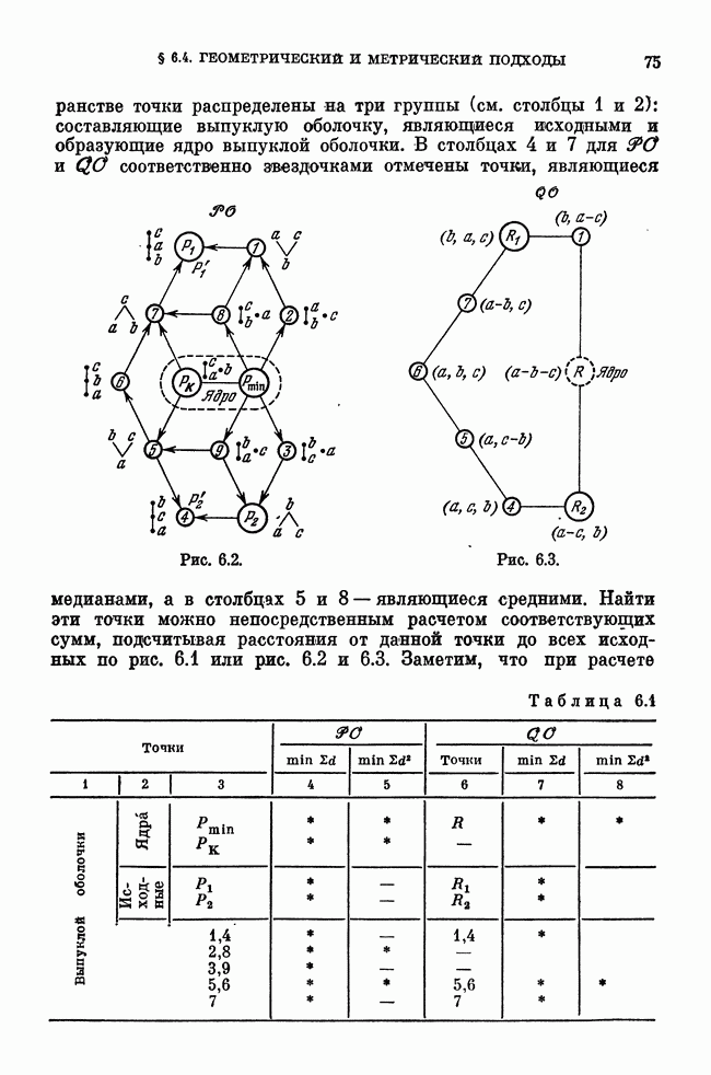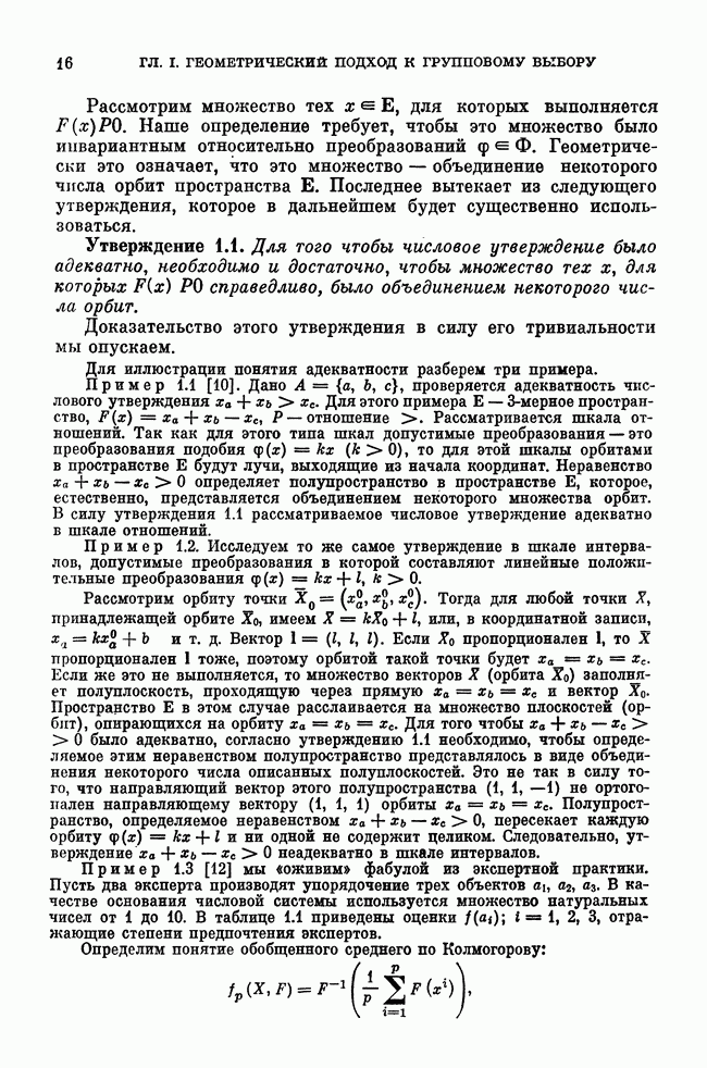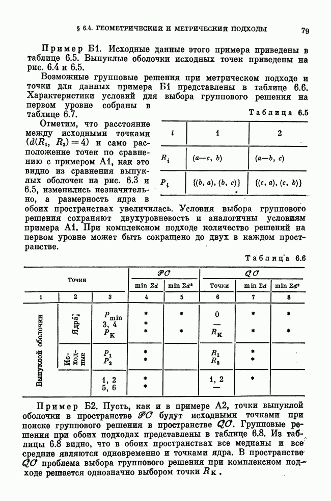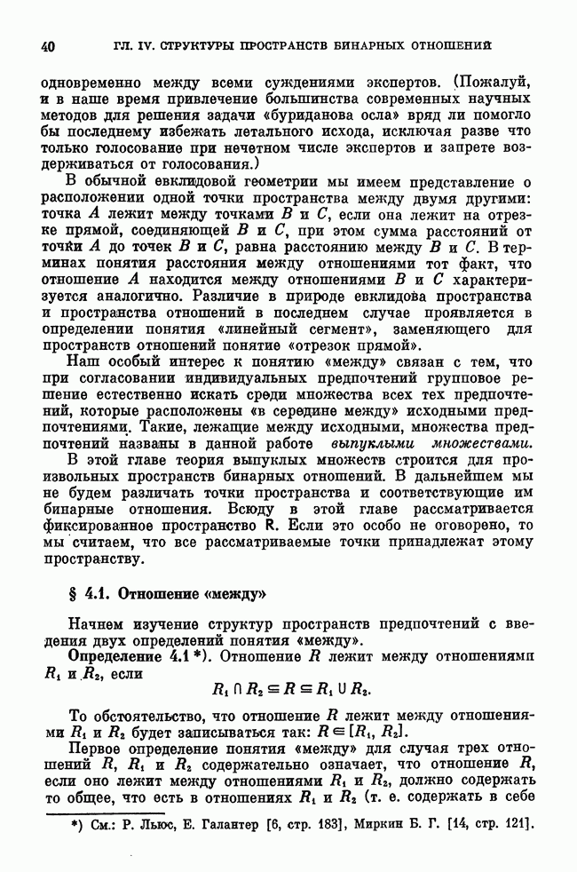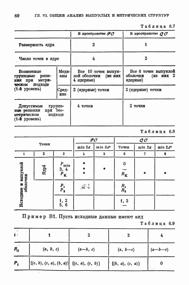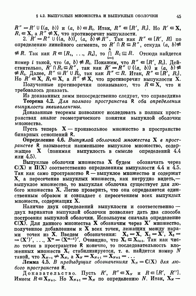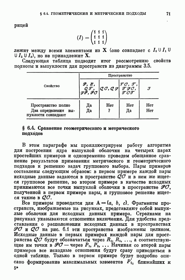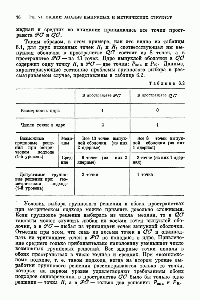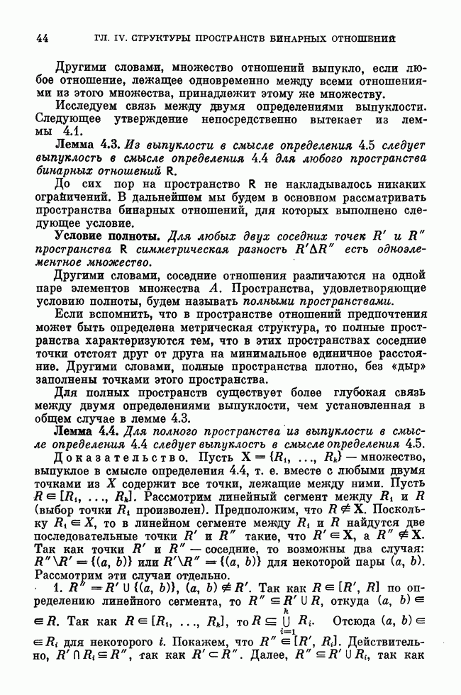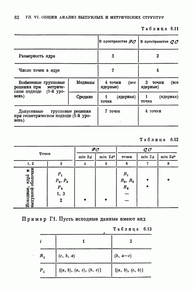 Глава VI. ОБЩИЙ АНАЛИЗ ВЫПУКЛЫХ И МЕТРИЧЕСКИХ СТРУКТУРВ предыдущих главах для решения проблемы группового выбора была развита общая теория выпуклых множеств в пространствах бинарных отношений и рассмотрены ее реализации в трех конкретных пространствах отношений индивидуального предпочтения. Настало время ответить на два вполне уместных здесь вопроса: как реализуются результаты, полученные в рамках этой теории, в остальных пространствах системы пространств, представленной на диаграмме 3.5, и как соотносятся групповые решения, получаемые на основе предложенного подхода, и подхода, при котором для построения групповых решений используется метрическая структура? Отвечая на эти вопросы, удобно взглянуть на построенную в главе III систему пространств как бы сверху. Мы начнем наш «обзор» с общего рассмотрения метрической структуры в полных пространствах и указания на ранее изученные в этом отношении пространства (§ 6.1). В следующем параграфе будут рассмотрены выпуклые и метрические структуры в рассматривавшихся ранее неполных пространствах. В конце этого параграфа ответ на первый вопрос будет представлен в таблице, подводящей итог изучению свойств полноты и выпуклости в пространствах диаграммы 3.5. В последнем параграфе этой главы будет проведено сравнение указанных двух подходов к решению проблемы группового выбора на конкретных примерах в двух пространствах диаграммы 3.5. § 6.1. Близость и метрика в полных пространствах бинарных отношенийИнтуитивно понятие близости существует в любом пространстве с метрикой — мы говорим, что точка пространстве бинарных отношений аксиоматическое описание понятия «функция близости», более широкое, чем понятие метрики, в конечном итоге приводит к однозначной метрической структуре. Этим мы, безусловно, обязаны специфике рассматриваемых задач. В этом параграфе мы рассмотрим функции близости и расстояния для случая полных пространств бинарных отношений, где связь между этими понятиями становится наиболее прозрачной. Начнем со следующего общего определения. Определение 6.1. Пусть А1. Аддитивность: