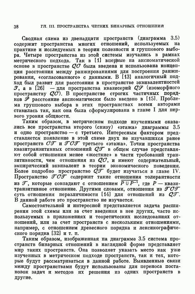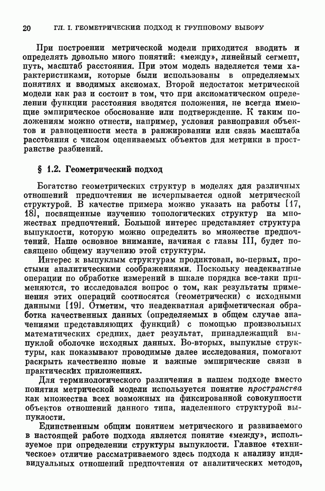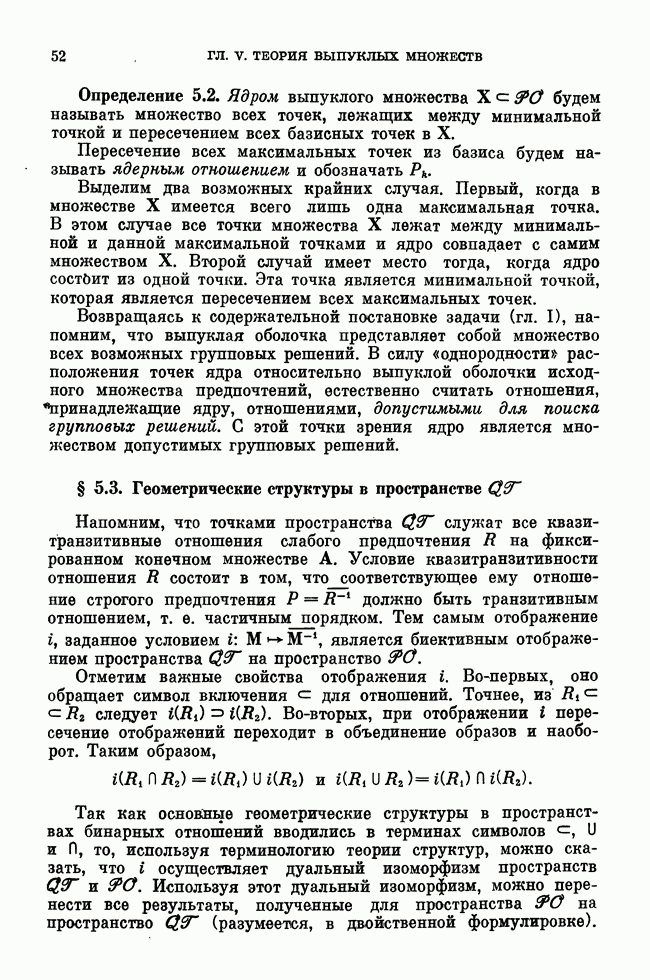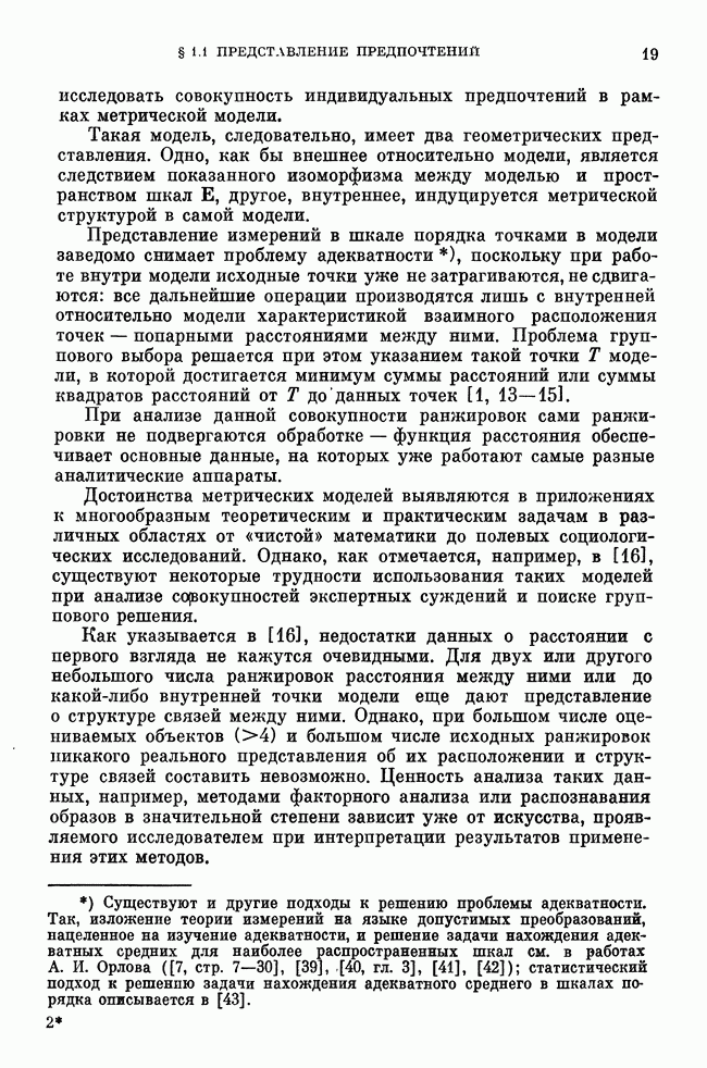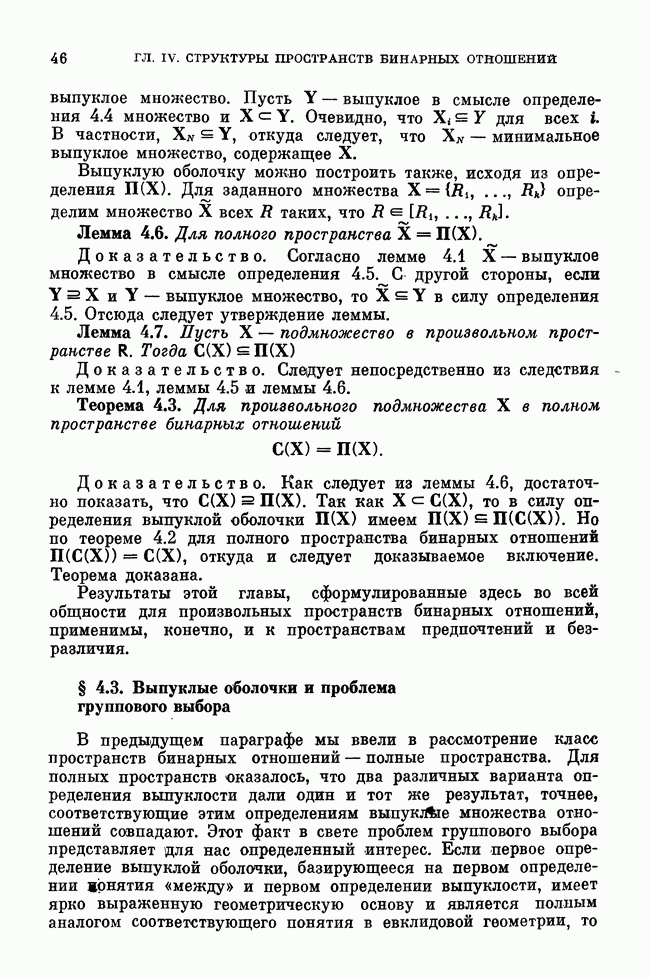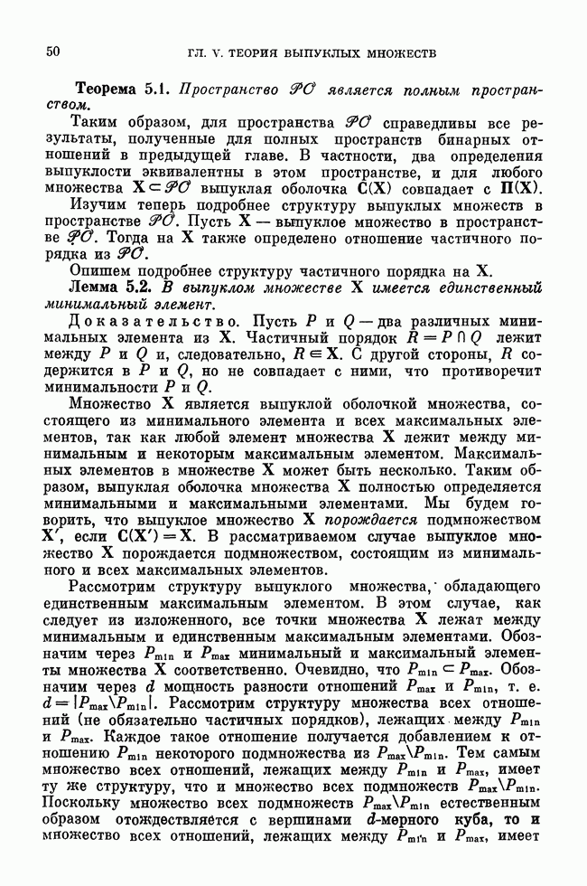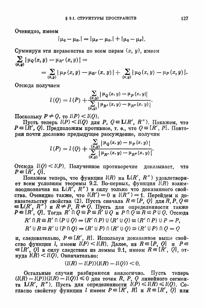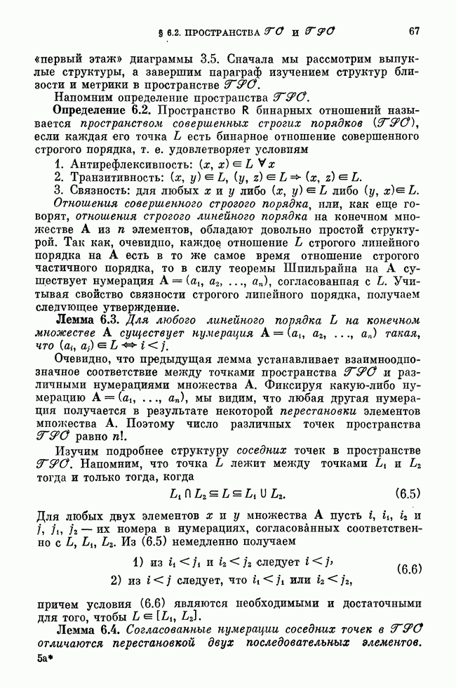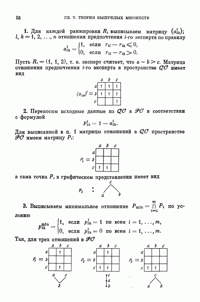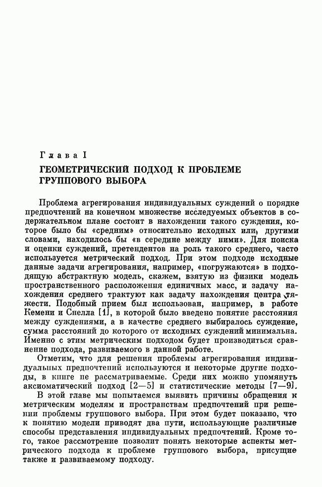 Глава VI. ОБЩИЙ АНАЛИЗ ВЫПУКЛЫХ И МЕТРИЧЕСКИХ СТРУКТУРВ предыдущих главах для решения проблемы группового выбора была развита общая теория выпуклых множеств в пространствах бинарных отношений и рассмотрены ее реализации в трех конкретных пространствах отношений индивидуального предпочтения. Настало время ответить на два вполне уместных здесь вопроса: как реализуются результаты, полученные в рамках этой теории, в остальных пространствах системы пространств, представленной на диаграмме 3.5, и как соотносятся групповые решения, получаемые на основе предложенного подхода, и подхода, при котором для построения групповых решений используется метрическая структура? Отвечая на эти вопросы, удобно взглянуть на построенную в главе III систему пространств как бы сверху. Мы начнем наш «обзор» с общего рассмотрения метрической структуры в полных пространствах и указания на ранее изученные в этом отношении пространства (§ 6.1). В следующем параграфе будут рассмотрены выпуклые и метрические структуры в рассматривавшихся ранее неполных пространствах. В конце этого параграфа ответ на первый вопрос будет представлен в таблице, подводящей итог изучению свойств полноты и выпуклости в пространствах диаграммы 3.5. В последнем параграфе этой главы будет проведено сравнение указанных двух подходов к решению проблемы группового выбора на конкретных примерах в двух пространствах диаграммы 3.5. § 6.1. Близость и метрика в полных пространствах бинарных отношенийИнтуитивно понятие близости существует в любом пространстве с метрикой — мы говорим, что точка пространстве бинарных отношений аксиоматическое описание понятия «функция близости», более широкое, чем понятие метрики, в конечном итоге приводит к однозначной метрической структуре. Этим мы, безусловно, обязаны специфике рассматриваемых задач. В этом параграфе мы рассмотрим функции близости и расстояния для случая полных пространств бинарных отношений, где связь между этими понятиями становится наиболее прозрачной. Начнем со следующего общего определения. Определение 6.1. Пусть А1. Аддитивность: