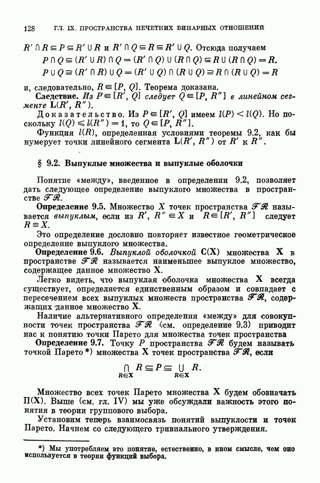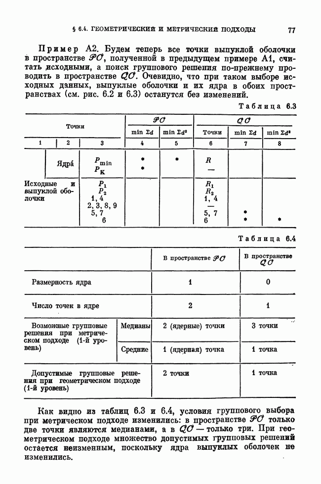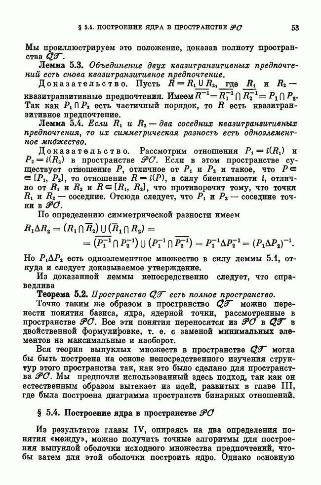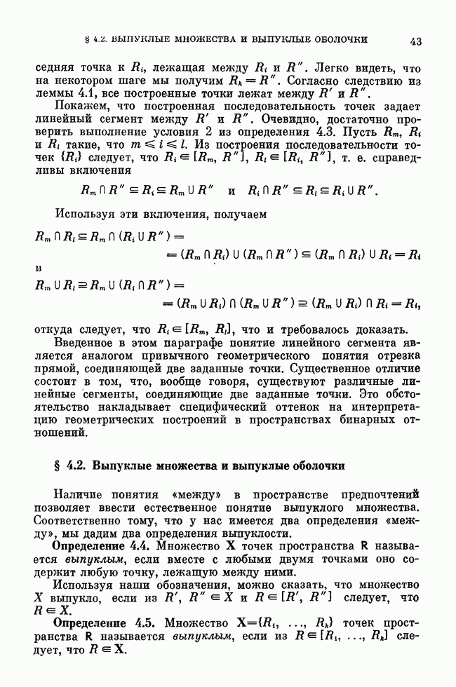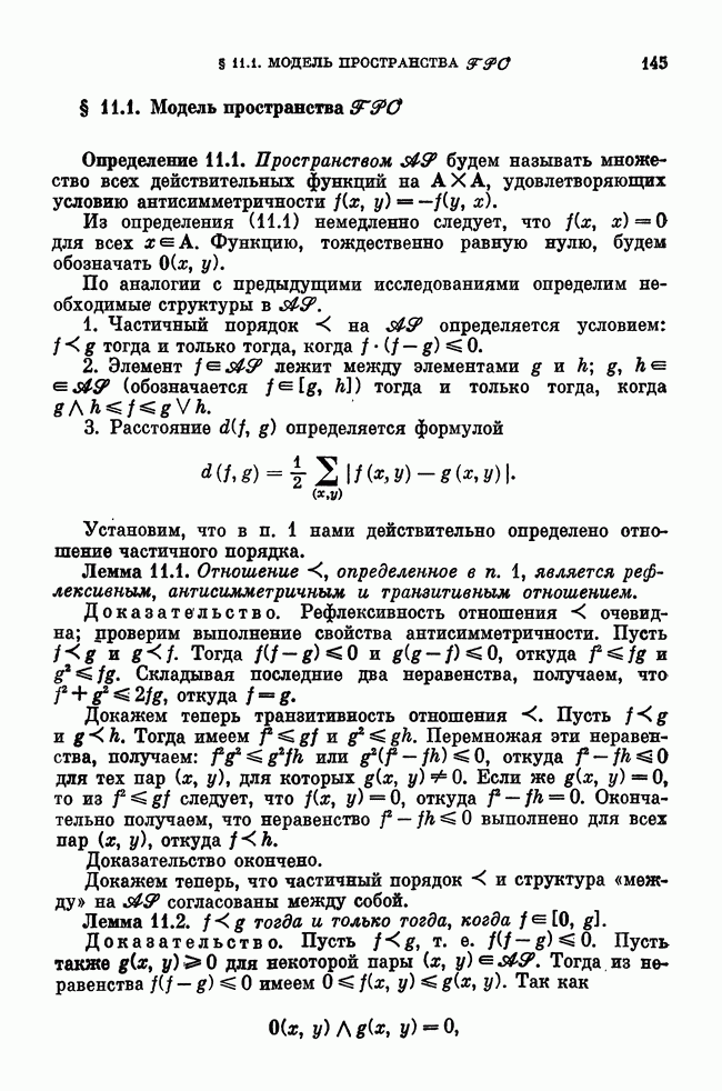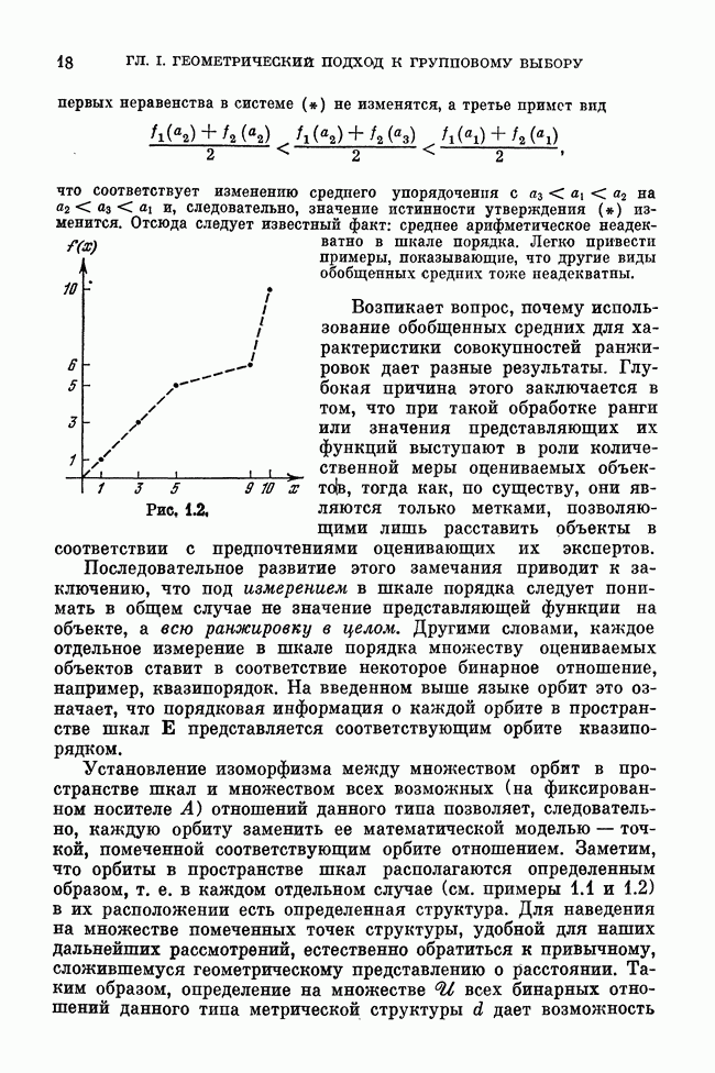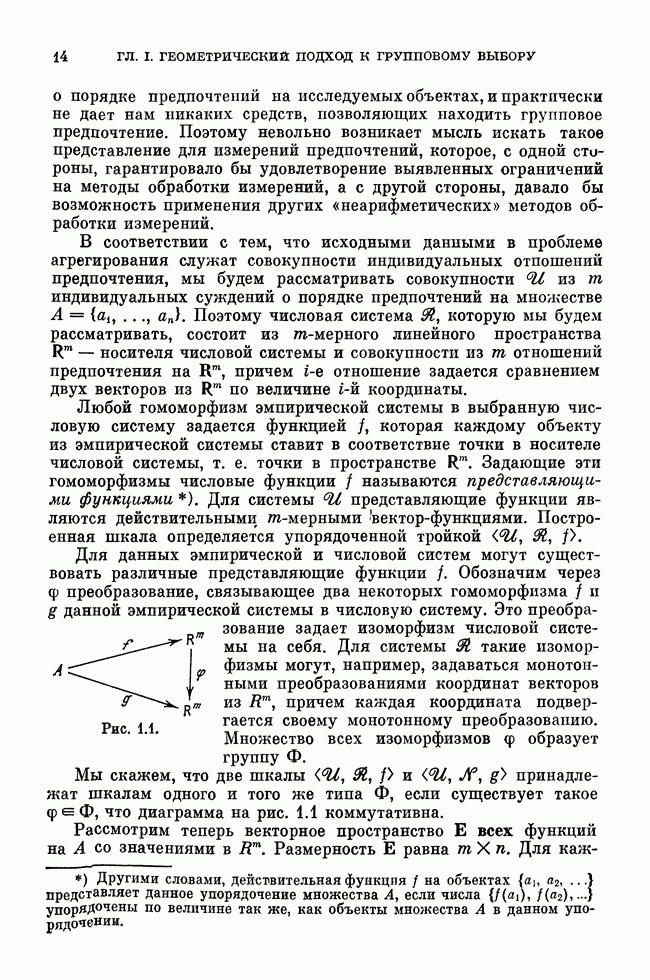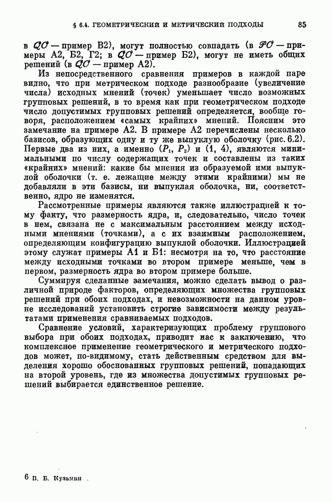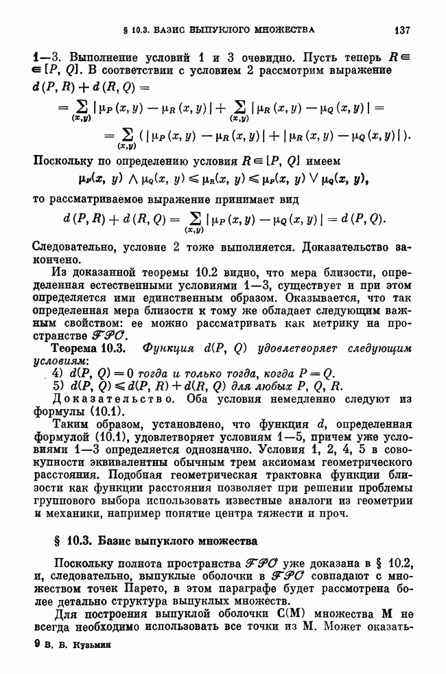 Глава VI. ОБЩИЙ АНАЛИЗ ВЫПУКЛЫХ И МЕТРИЧЕСКИХ СТРУКТУРВ предыдущих главах для решения проблемы группового выбора была развита общая теория выпуклых множеств в пространствах бинарных отношений и рассмотрены ее реализации в трех конкретных пространствах отношений индивидуального предпочтения. Настало время ответить на два вполне уместных здесь вопроса: как реализуются результаты, полученные в рамках этой теории, в остальных пространствах системы пространств, представленной на диаграмме 3.5, и как соотносятся групповые решения, получаемые на основе предложенного подхода, и подхода, при котором для построения групповых решений используется метрическая структура? Отвечая на эти вопросы, удобно взглянуть на построенную в главе III систему пространств как бы сверху. Мы начнем наш «обзор» с общего рассмотрения метрической структуры в полных пространствах и указания на ранее изученные в этом отношении пространства (§ 6.1). В следующем параграфе будут рассмотрены выпуклые и метрические структуры в рассматривавшихся ранее неполных пространствах. В конце этого параграфа ответ на первый вопрос будет представлен в таблице, подводящей итог изучению свойств полноты и выпуклости в пространствах диаграммы 3.5. В последнем параграфе этой главы будет проведено сравнение указанных двух подходов к решению проблемы группового выбора на конкретных примерах в двух пространствах диаграммы 3.5. § 6.1. Близость и метрика в полных пространствах бинарных отношенийИнтуитивно понятие близости существует в любом пространстве с метрикой — мы говорим, что точка пространстве бинарных отношений аксиоматическое описание понятия «функция близости», более широкое, чем понятие метрики, в конечном итоге приводит к однозначной метрической структуре. Этим мы, безусловно, обязаны специфике рассматриваемых задач. В этом параграфе мы рассмотрим функции близости и расстояния для случая полных пространств бинарных отношений, где связь между этими понятиями становится наиболее прозрачной. Начнем со следующего общего определения. Определение 6.1. Пусть А1. Аддитивность: