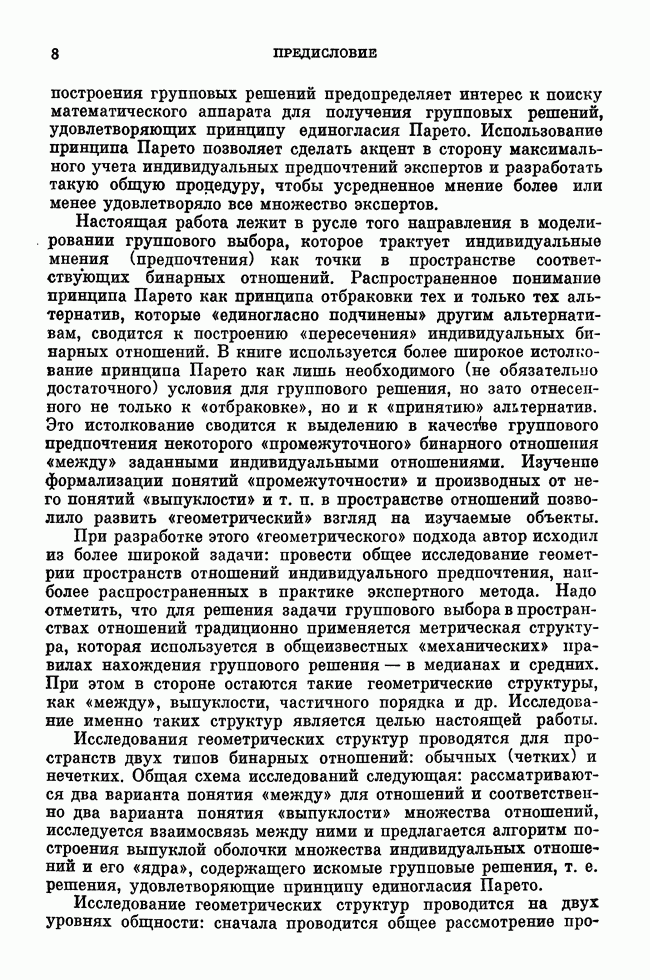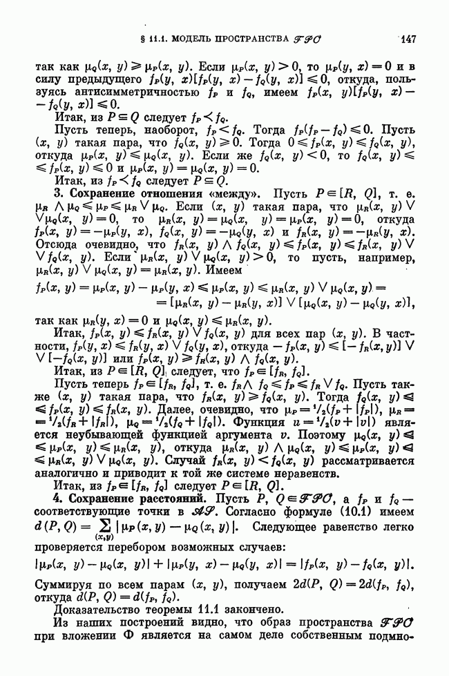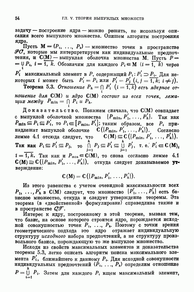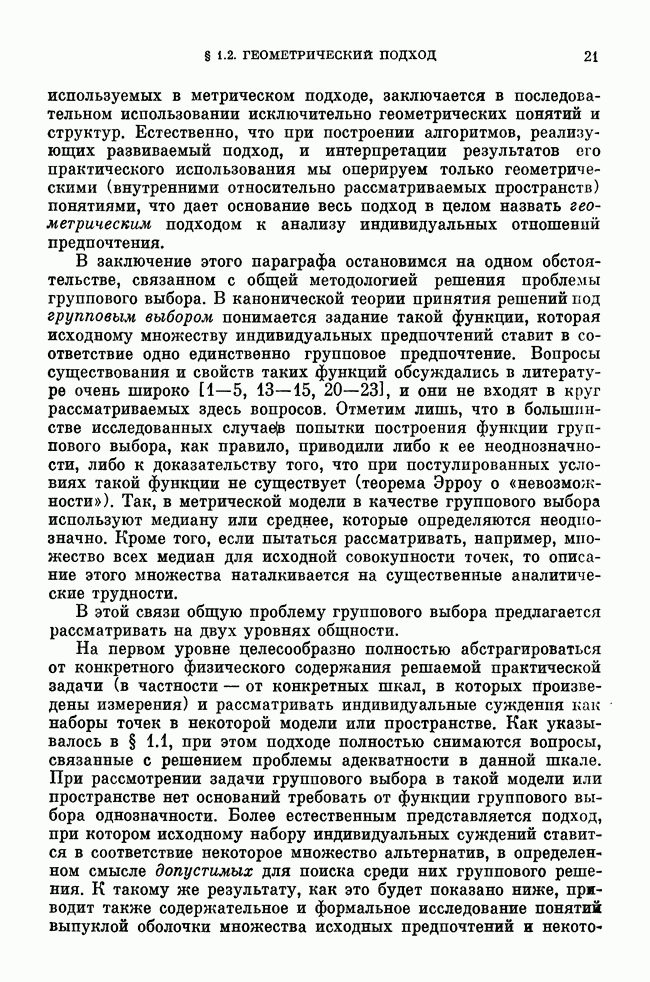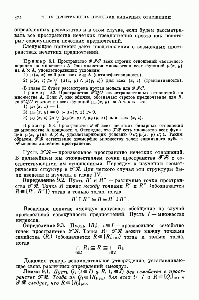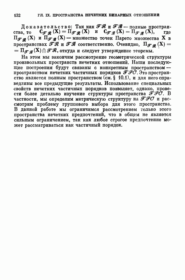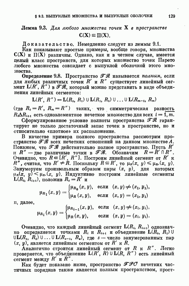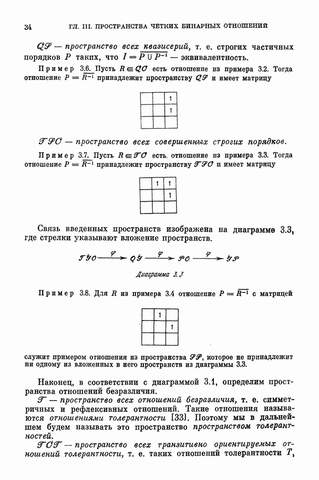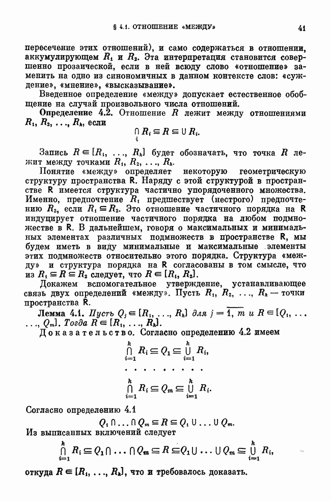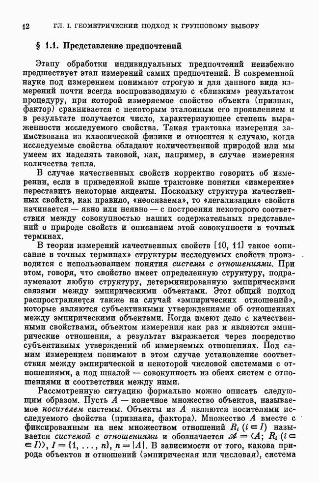Глава VI. ОБЩИЙ АНАЛИЗ ВЫПУКЛЫХ И МЕТРИЧЕСКИХ СТРУКТУРВ предыдущих главах для решения проблемы группового выбора была развита общая теория выпуклых множеств в пространствах бинарных отношений и рассмотрены ее реализации в трех конкретных пространствах отношений индивидуального предпочтения. Настало время ответить на два вполне уместных здесь вопроса: как реализуются результаты, полученные в рамках этой теории, в остальных пространствах системы пространств, представленной на диаграмме 3.5, и как соотносятся групповые решения, получаемые на основе предложенного подхода, и подхода, при котором для построения групповых решений используется метрическая структура? Отвечая на эти вопросы, удобно взглянуть на построенную в главе III систему пространств как бы сверху. Мы начнем наш «обзор» с общего рассмотрения метрической структуры в полных пространствах и указания на ранее изученные в этом отношении пространства (§ 6.1). В следующем параграфе будут рассмотрены выпуклые и метрические структуры в рассматривавшихся ранее неполных пространствах. В конце этого параграфа ответ на первый вопрос будет представлен в таблице, подводящей итог изучению свойств полноты и выпуклости в пространствах диаграммы 3.5. В последнем параграфе этой главы будет проведено сравнение указанных двух подходов к решению проблемы группового выбора на конкретных примерах в двух пространствах диаграммы 3.5. § 6.1. Близость и метрика в полных пространствах бинарных отношенийИнтуитивно понятие близости существует в любом пространстве с метрикой — мы говорим, что точка пространстве бинарных отношений аксиоматическое описание понятия «функция близости», более широкое, чем понятие метрики, в конечном итоге приводит к однозначной метрической структуре. Этим мы, безусловно, обязаны специфике рассматриваемых задач. В этом параграфе мы рассмотрим функции близости и расстояния для случая полных пространств бинарных отношений, где связь между этими понятиями становится наиболее прозрачной. Начнем со следующего общего определения. Определение 6.1. Пусть А1. Аддитивность: