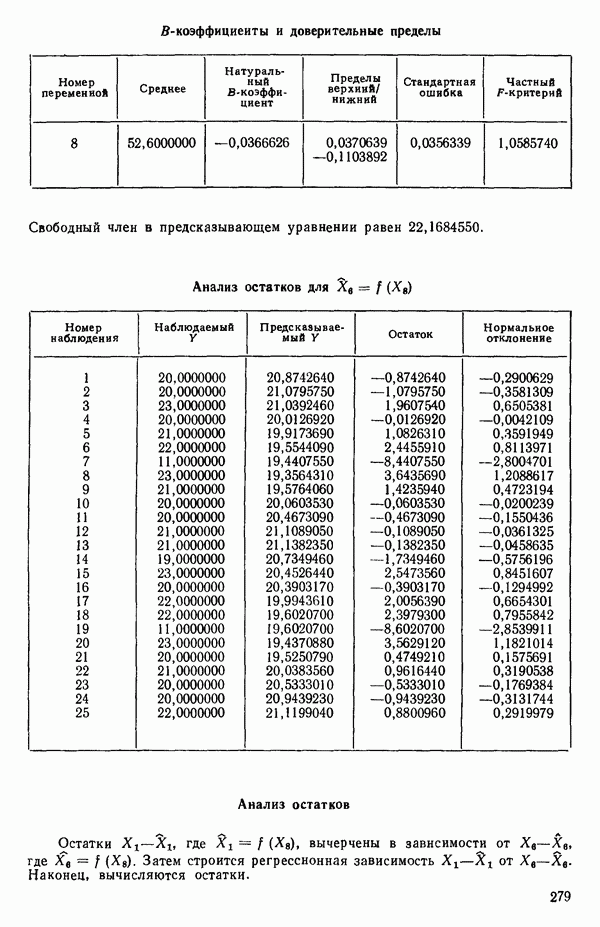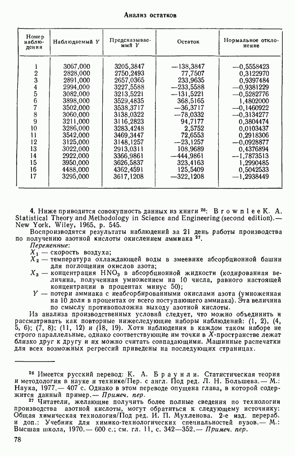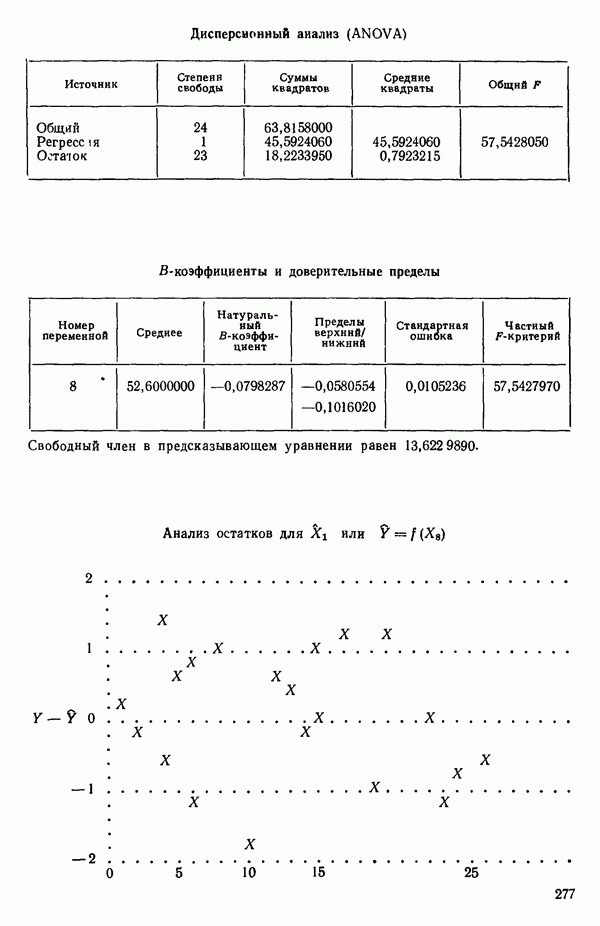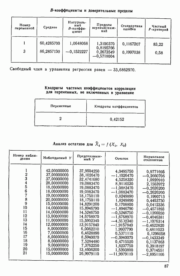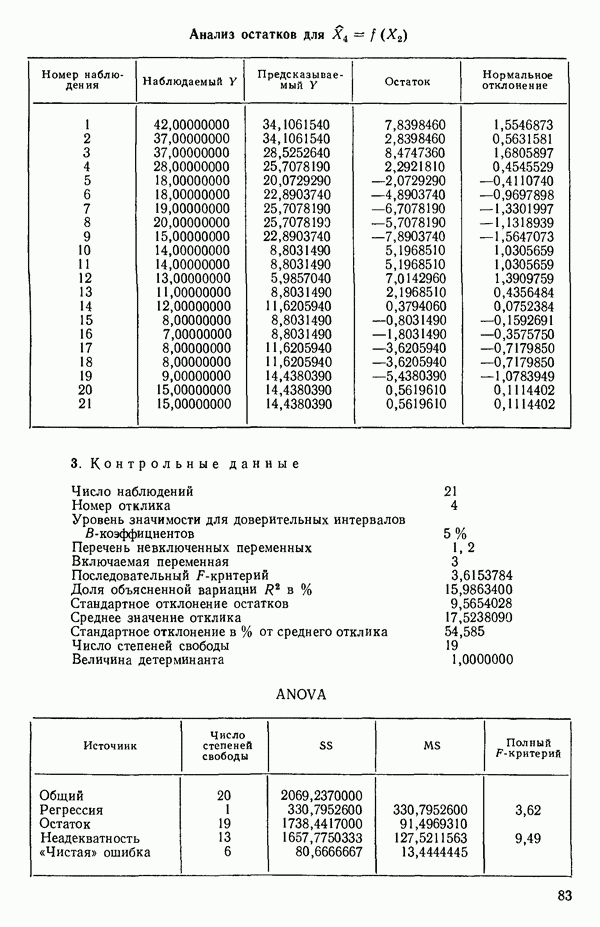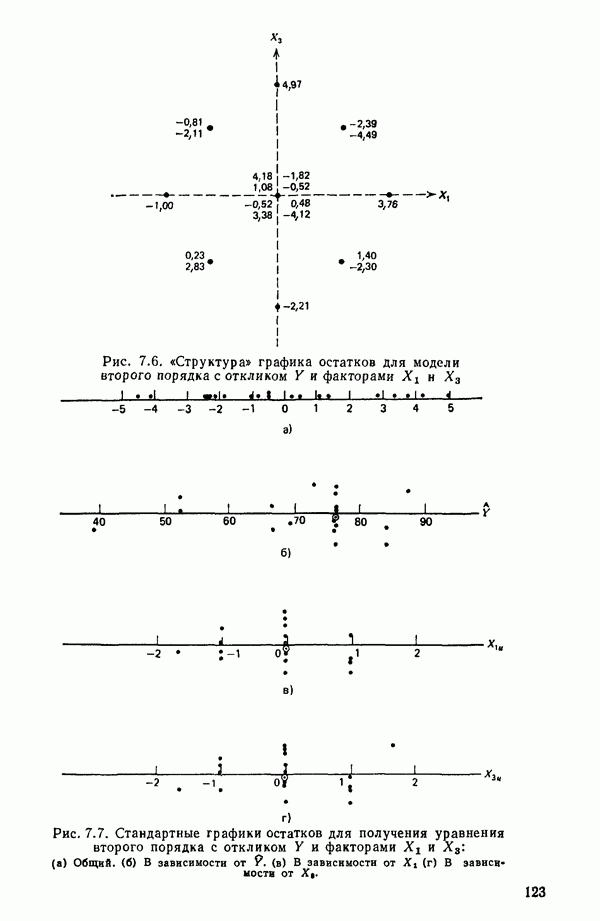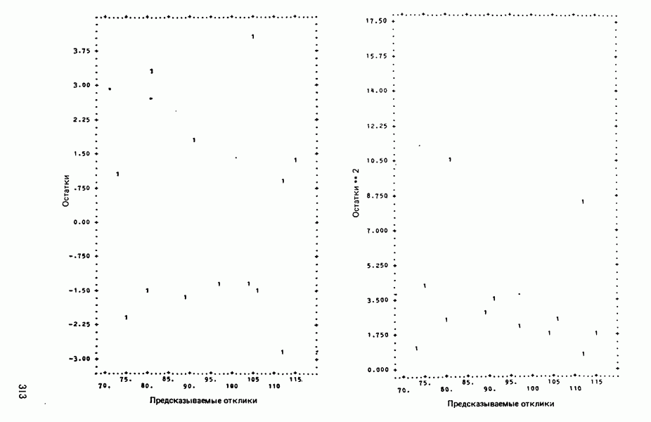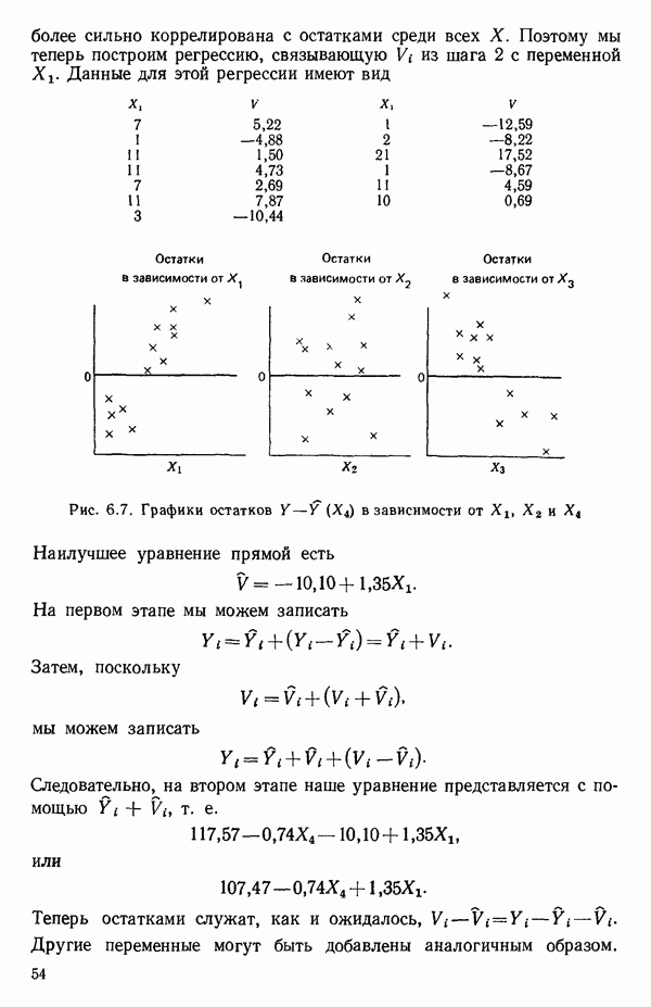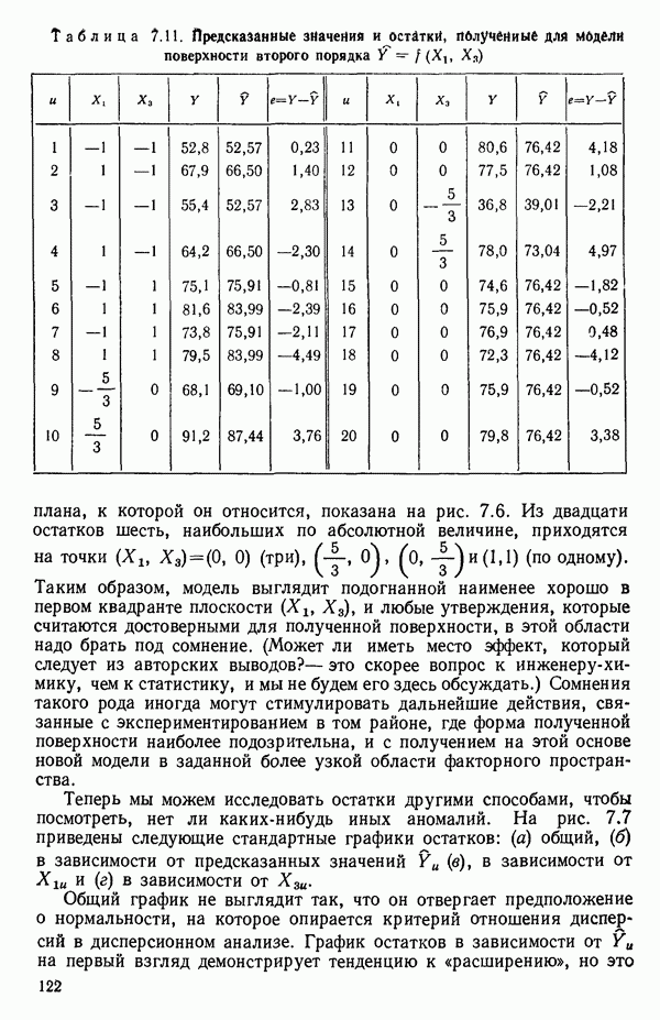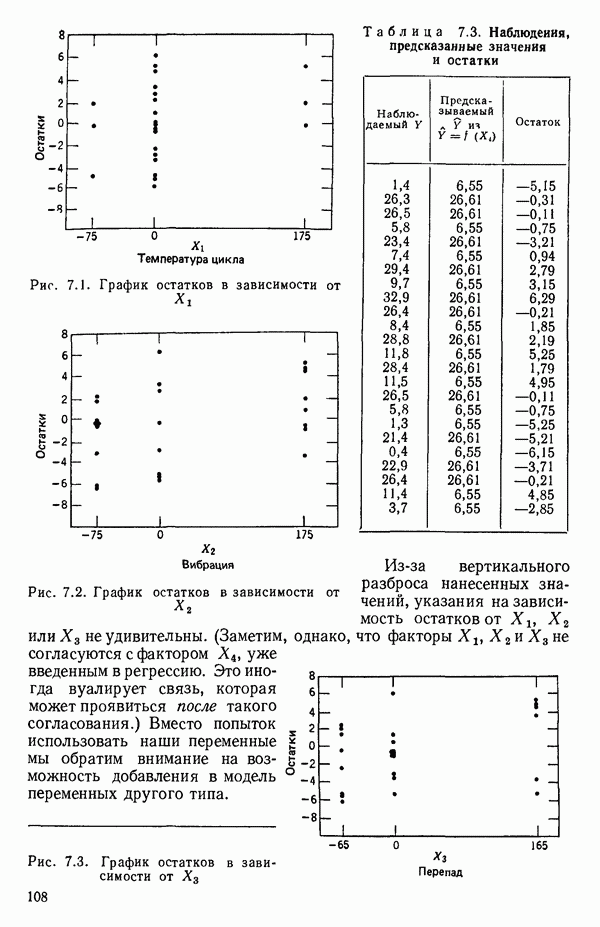 , т. е. модель должна считаться неадекватной. Чтобы разобраться в этом, мы можем исследовать остатки, вычерчивая, в частности, их графики в зависимости от «кандидатов» в новые факторы. Исходные наблюдения, предсказанные значения и остатки приведены в табл. 7.3. На рис. 7.1, 7.2 и 7.3 показаны графики остатков в зависимости от