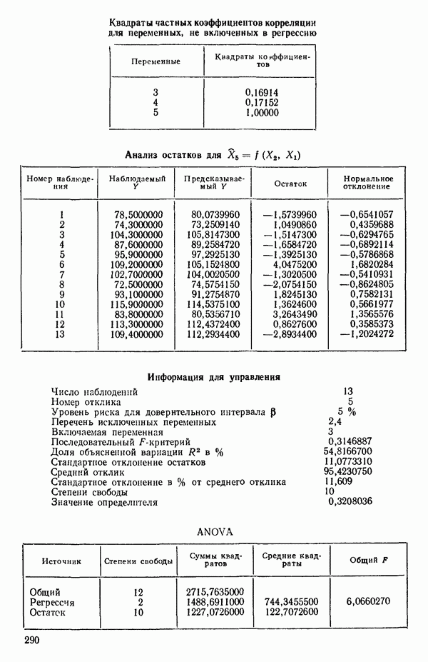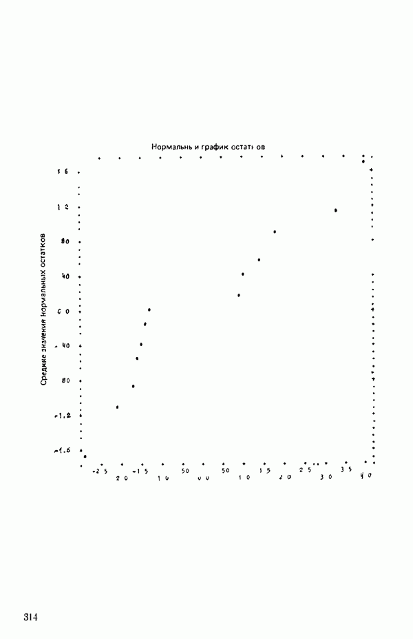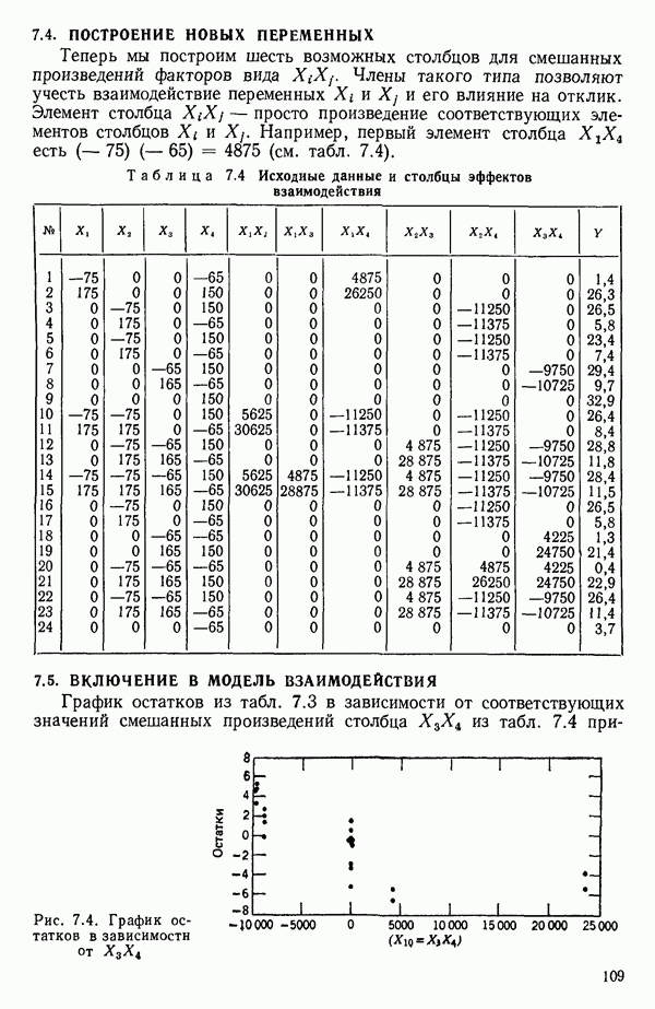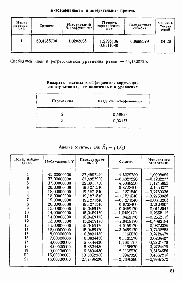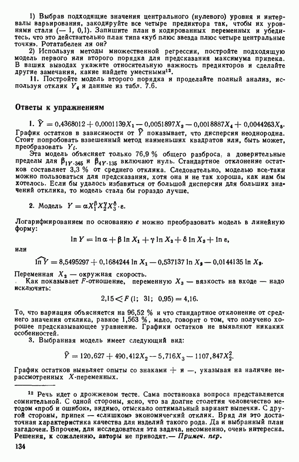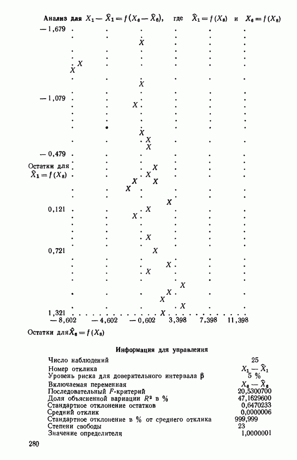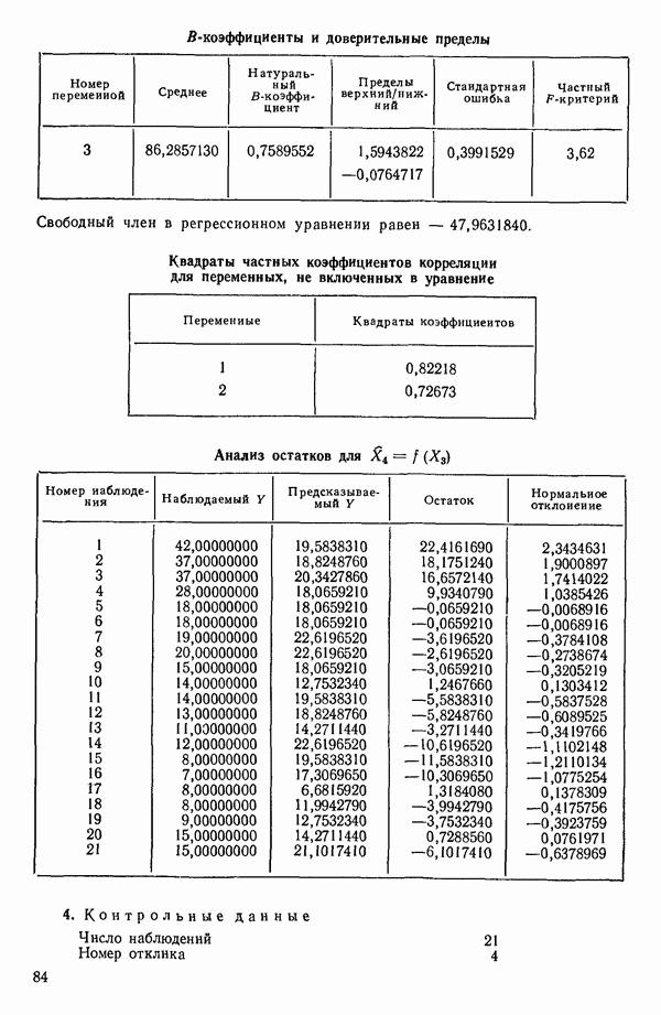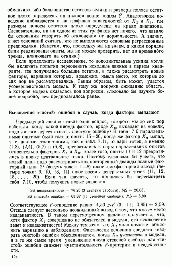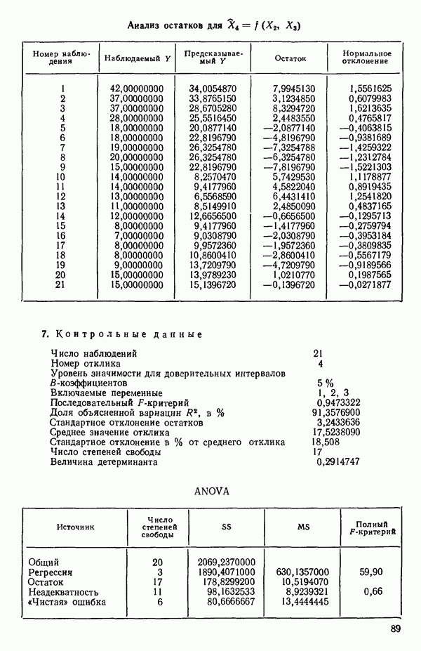 , т. е. модель должна считаться неадекватной. Чтобы разобраться в этом, мы можем исследовать остатки, вычерчивая, в частности, их графики в зависимости от «кандидатов» в новые факторы. Исходные наблюдения, предсказанные значения и остатки приведены в табл. 7.3. На рис. 7.1, 7.2 и 7.3 показаны графики остатков в зависимости от