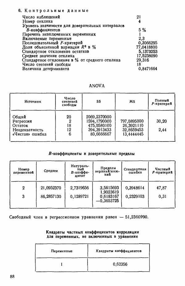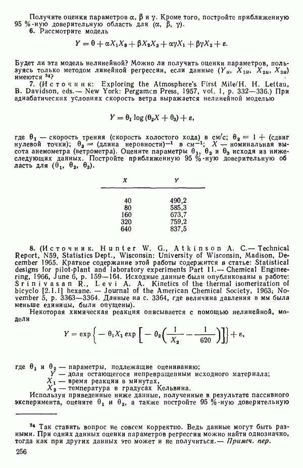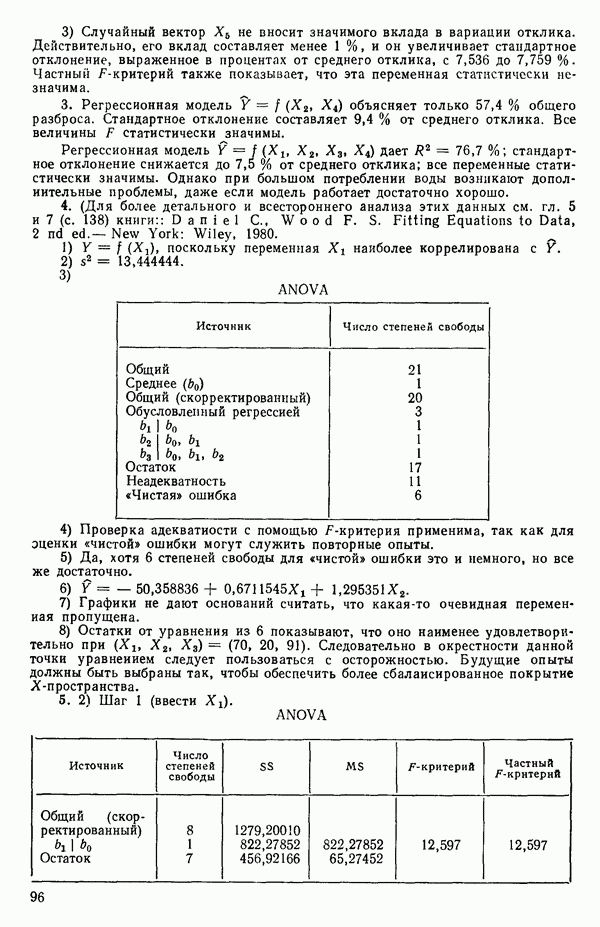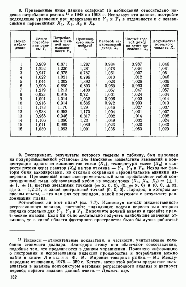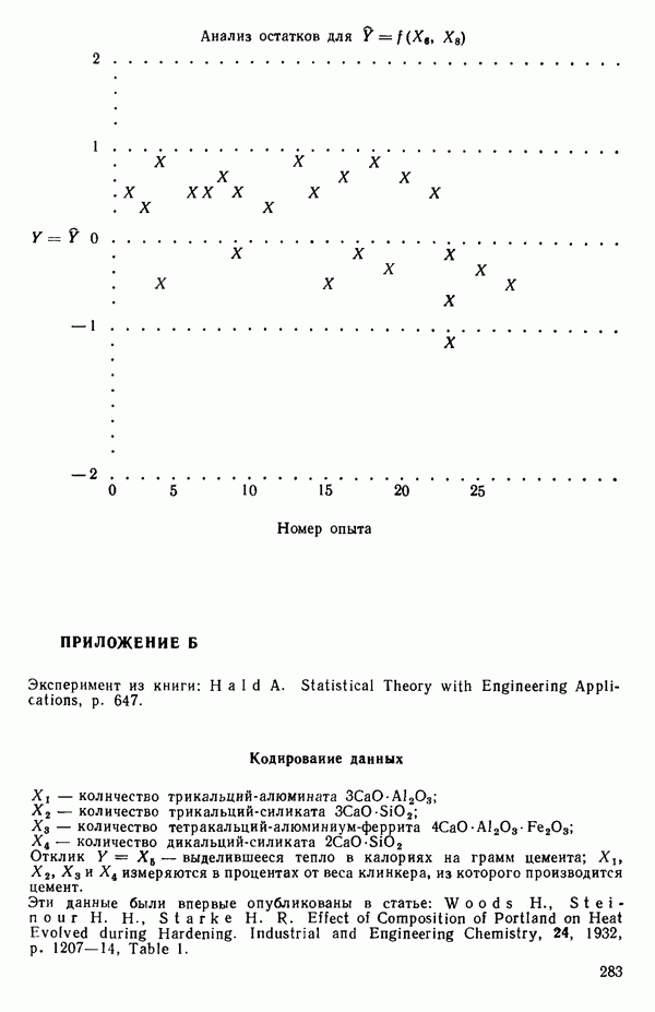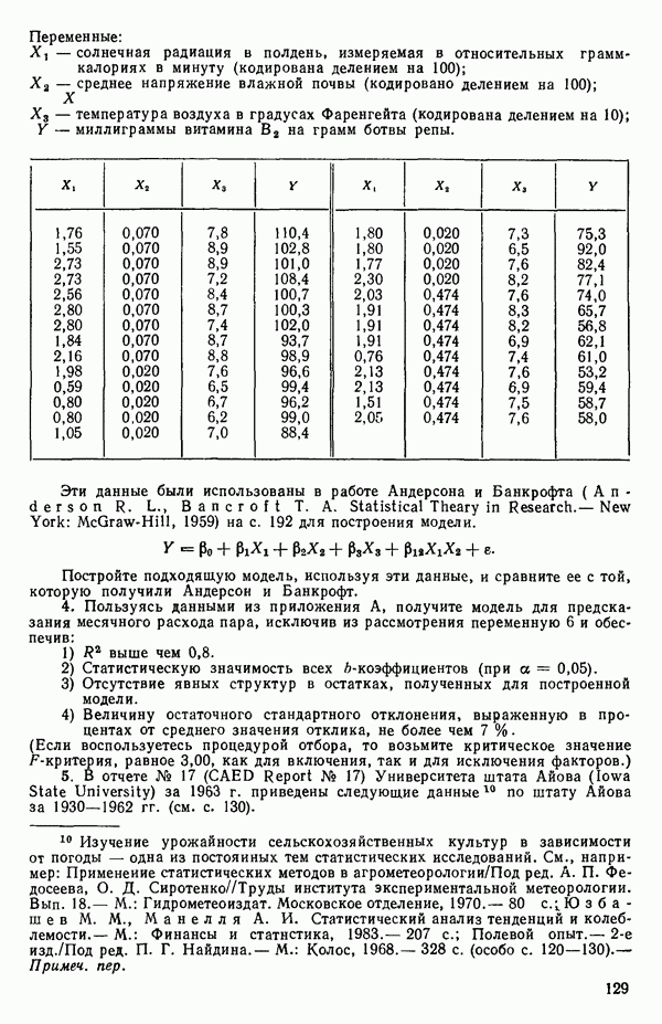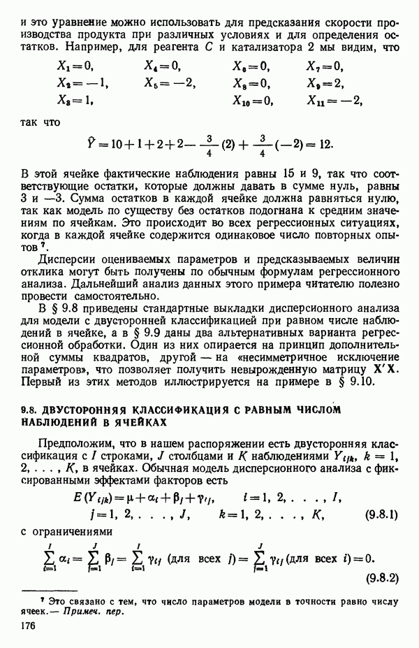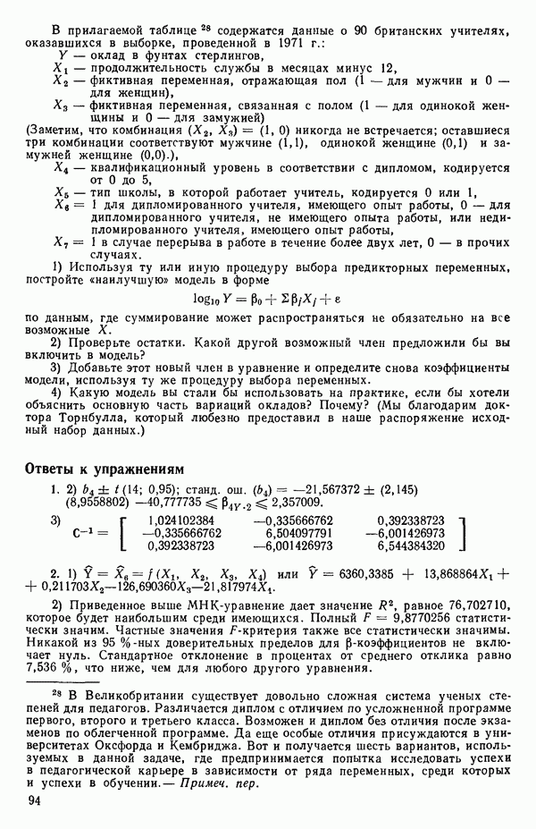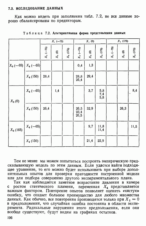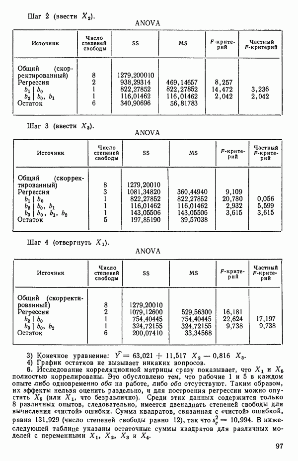 , т. е. модель должна считаться неадекватной. Чтобы разобраться в этом, мы можем исследовать остатки, вычерчивая, в частности, их графики в зависимости от «кандидатов» в новые факторы. Исходные наблюдения, предсказанные значения и остатки приведены в табл. 7.3. На рис. 7.1, 7.2 и 7.3 показаны графики остатков в зависимости от